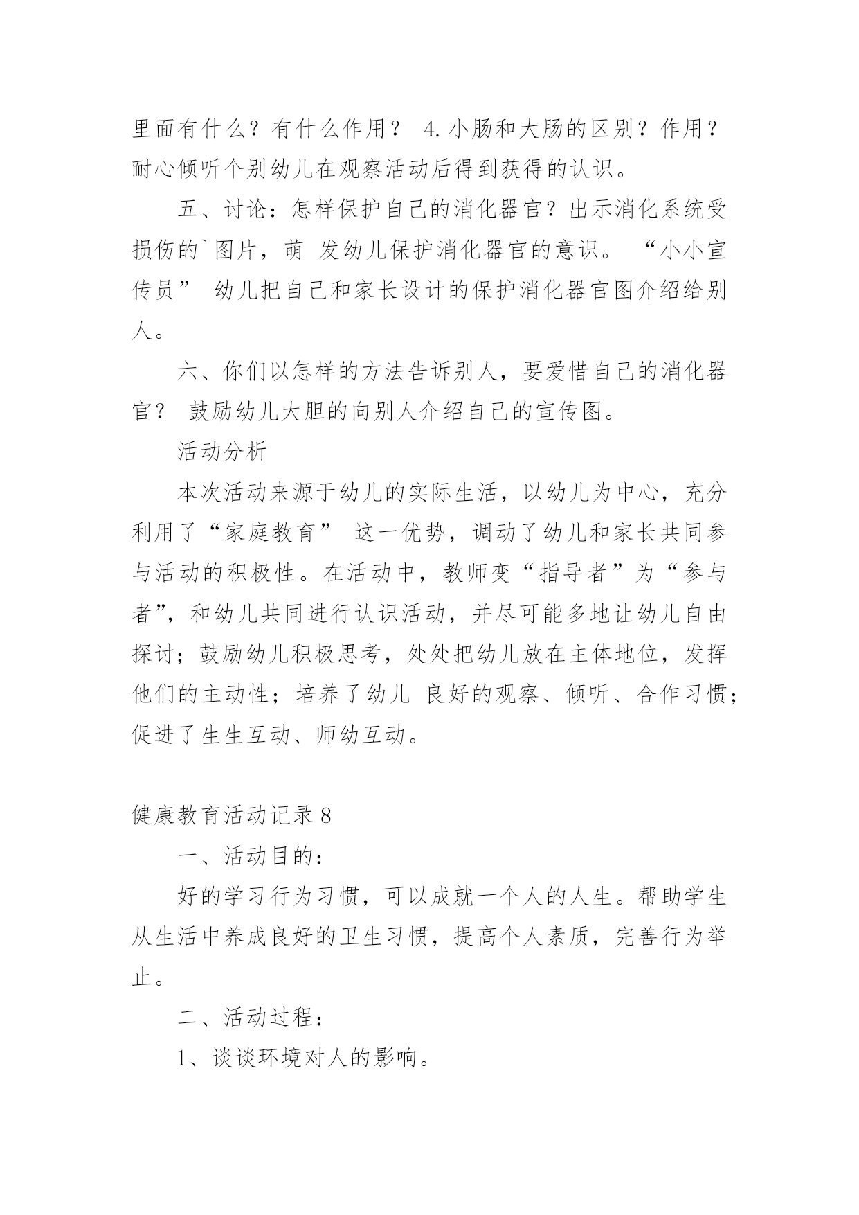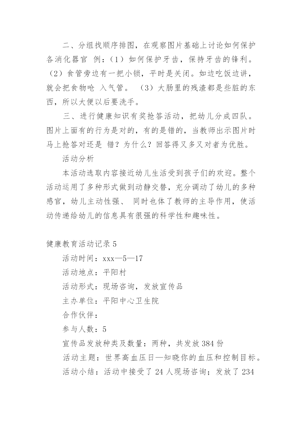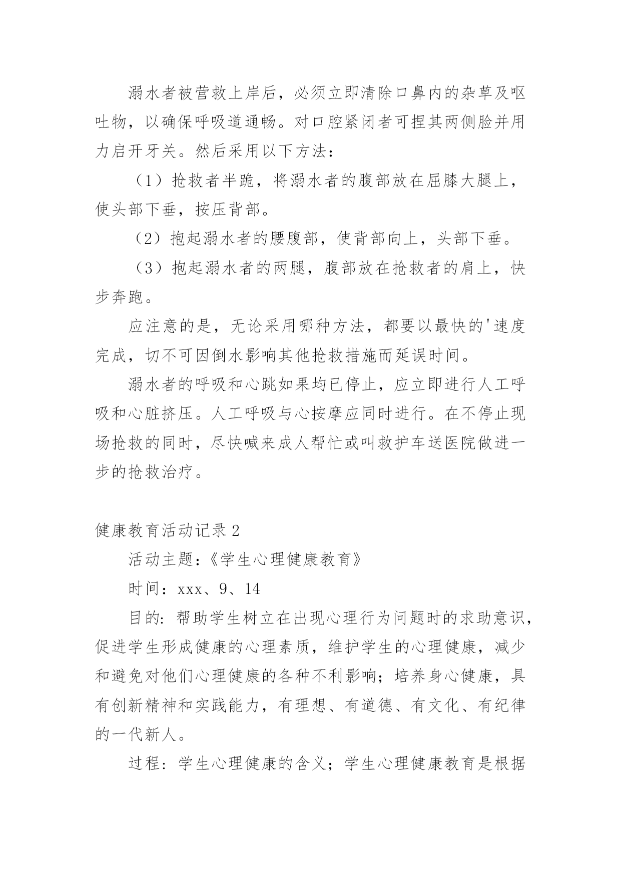 健康教育活动记录(精选)健康教育活动记录15篇健康教育活动记录1活动时间:4月8日活动地点:三楼多媒体教室参加人员:各班老师教育内容:中暑的急救处理到了盛夏季节,在烈日下和高温环境里学习和劳动时,由于高温不断作用于人体,使体内散热困难,很容易引起头痛、头晕、体温升高、恶心和呕吐等中暑症状,严重的甚至可发生虚脱晕倒。发现有人中暑时,首先将病人搬到阴凉通风的地方,让病人躺下,但头部不要垫高。然后解开病人衣领,同时用浸湿的冷毛巾敷在头部。轻者一般经过上述处理会逐渐好转,再服一些仁丹或十滴水。对中暑较严重者,除上述降温方法外,还可用冰块或冰棒敷其头部、腋下和大腿腹股处,同时用井水或凉水反复擦身、扇风进行降温,然后应立即送医院救治。二、溺水的急救处理。溺水是儿童少年最常发生的意外事故。中小学生自己下河游泳而又不熟悉水性是发生溺水的最主要原因。还可因在河边、井边玩时失足而落水。溺水者被营救上岸后,必须立即清除口鼻内的杂草及呕吐物,以确保呼吸道通畅。对口腔紧闭者可捏其两侧脸并用力启开牙关。然后采用以下方法:(1)抢救者半跪,将溺水者的腹部放在屈膝大腿上,使头部下垂,按压背部。(2)抱起溺水者的腰腹部,使背部向上,头部下垂。(3)抱起溺水者的两腿,腹部放在抢救者的肩上,快步奔跑。应注意的是,无论采用哪种方法,都要以最快的'速度完成,切不可因倒水影响其他抢救措施而延误时间。溺水者的呼吸和心跳如果均已停止,应立即进行人工呼吸和心脏挤压。人工呼吸与心按摩应同时进行。在不停止现场抢救的同时,尽快喊来成人帮忙或叫救护车送医院做进一步的抢救治疗。健康教育活动记录2活动主题:《学生心理健康教育》时间:xxx、9、14目的:帮助学生树立在出现心理行为问题时的求助意识,促进学生形成健康的心理素质,维护学生的心理健康,减少和避免对他们心理健康的各种不利影响;培养身心健康,具有创新精神和实践能力,有理想、有道德、有文化、有纪律的一代新人。过程:学生心理健康的含义;学生心理健康教育是根据小学生生理、心理发展的规律和特点,运用心理学的教育方法和手段,培养小学生良好的心理素质,促进学生身心全面和谐地发展和整体素质全面提高的'教育。学生心理健康教育是素质教育的重要组成部分,是实施“面向21世纪教育振兴行动计划”、落实“跨世纪素质教育工程”、培养跨世纪高质量人才的重要环节。同时,切实有效地对小学生进行心理健康教育也是现代教育的必然要求和广大小学教育工作者所面临的一项共同的紧迫任务。学生心理健康教育的目的:学生心理健康教育的根本目的,说到底就是要促进学生个性心理的全面发展。学生心理健康教育不是孤立进行的,而是服从于学生素质教育的总目标,即以提高国民素质和民族创新能力为根本宗旨,以培养适应我国经济与社会发展所需要的、数以亿万计全面发展的人才为目的。具体来说主要包括以下三点:(1)要促使小学生形成健康的心理素质;(2)要维护小学生的心理健康,亦即减少和消除各种不良因素对其心理健康的影响;(3)要增进学生的心理健康,即根据学生成长发育的规律、特点和需要,采取各种形式和方法,提高小学生的心理健康水平,促使其人格即个性心理得到全面和谐的发展。学生心理健康教育的任务;为达到心理健康教育之目的,xxx年教育部在《中小学心理健康教育指导纲要》中,对心理健康教育的主要任务做了明确规定:全面推进素质教育,增强学校德育工作的针对性、实效性和主动性,帮助学生树立在出现心理行为问题时的求助意识,促进学生形成健康的心理素质,维护学生的心理健康,减少和避免对他们心理健康的各种不利影响;培养身心健康,具有创新精神和实践能力,有理想、有道德、有文化、有纪律的一代新人。健康教育活动记录3活动地点:前进社区卫生服务站活动形式:健康讲座活动主题:老年人保健组织者:前进社区卫生服务站活动内容:为了增强老年人的健康意识,提高老年人的生活质量,减少影响健康的危险因素,从而达到减少疾病发生的作用,我社区卫生服务站与xxx年6月10日下午三点在前进社区卫生服务站内进行了老年人保健健康知识讲座。活动内容:1、在**家苑小区、法庭家属院、粮店家属院、理工学校家属院粘贴健康宣教通知。2、对老年人的基本健康知识、老年人的生理特征、心理特征、老年人的饮食、老年人的`运动与休息进行了讲解。3、记录、总结活动总结评价:此次健康讲座活动准备充分,对老年人的生活起居带来了很大的帮助,得到了居民的好评,也达到了预期的效果。健康教育活动记录4活动名称:食物的旅行活动目标:让幼儿了解各消化器官的功能和食物在人体内消化吸收过程2.学习简单的自我保护方法3.培养幼儿良好的饮食和卫生习惯活动准备:(1)课件:小豆子的旅行(2)健康知识卡片、消化图、自制健康行为棋活动过程:一、观看“小豆子的旅行”,了解各器官的功能今天,有颗小豆子要到淘淘的消化器官中去