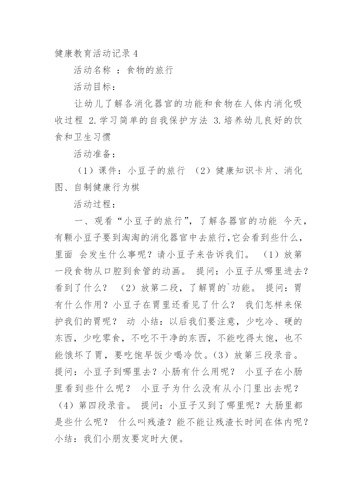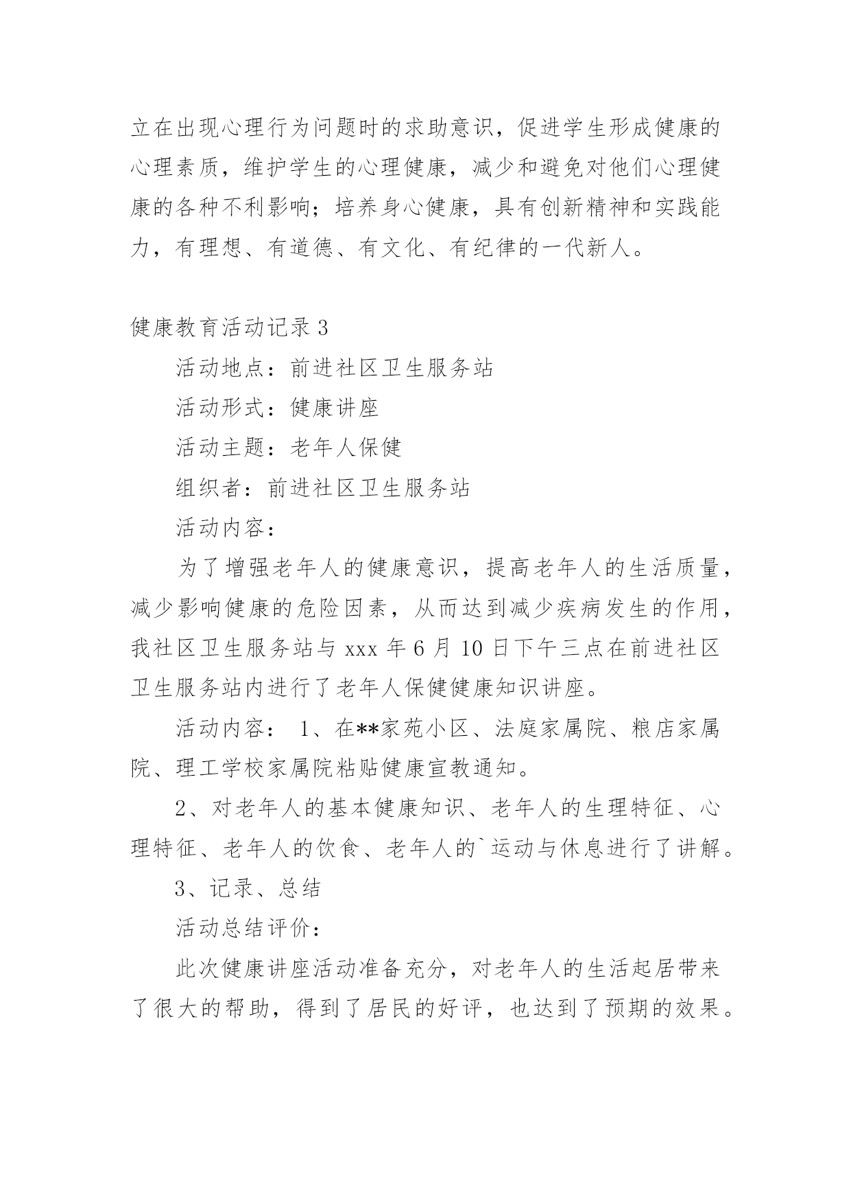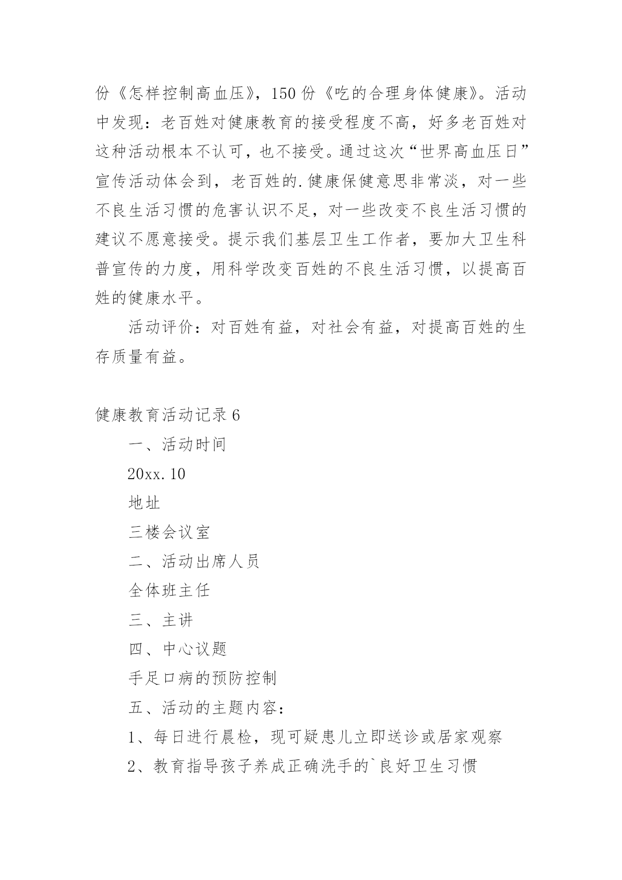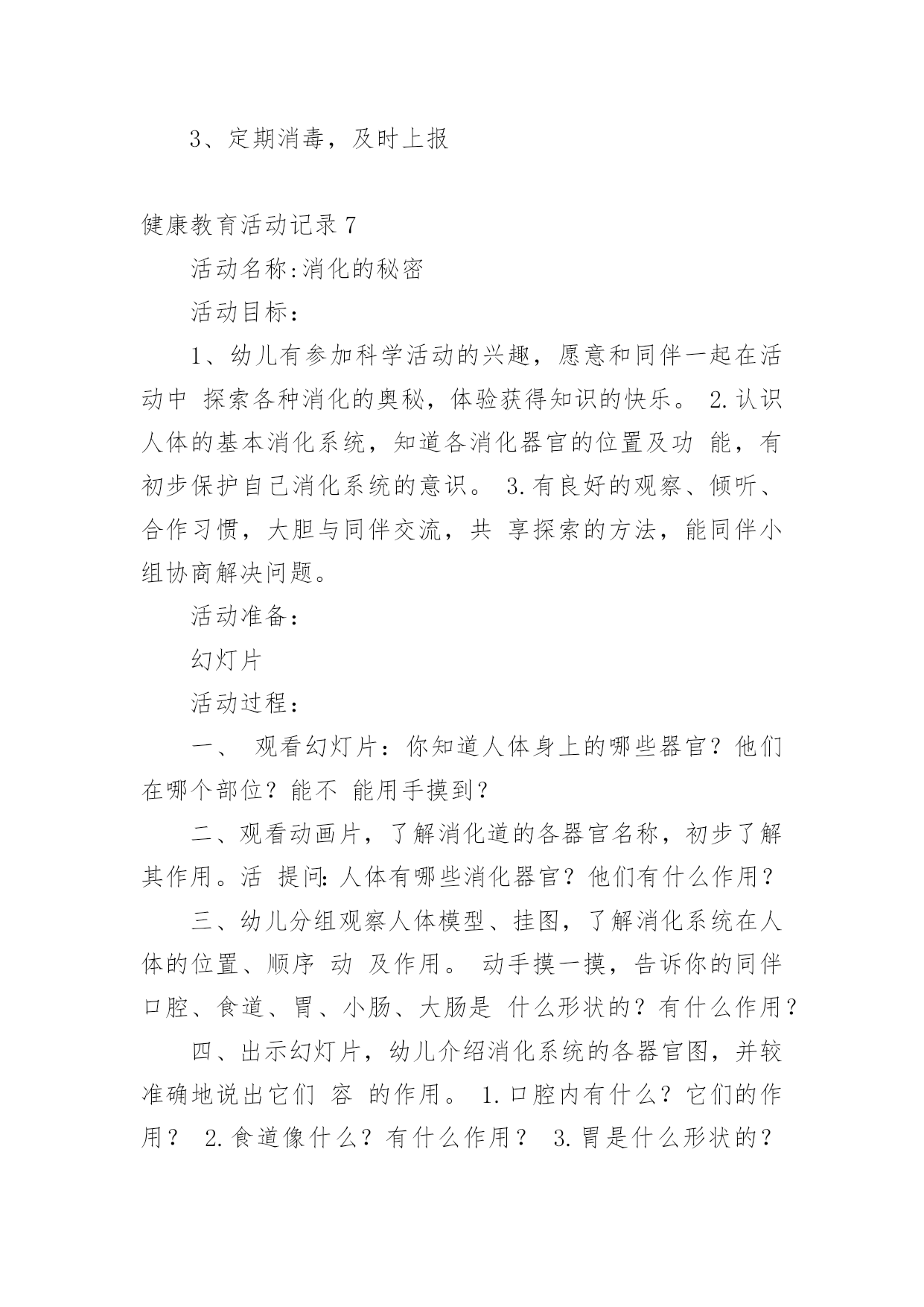 健康教育活动记录(精选)健康教育活动记录15篇健康教育活动记录1活动时间:4月8日活动地点:三楼多媒体教室参加人员:各班老师教育内容:中暑的急救处理到了盛夏季节,在烈日下和高温环境里学习和劳动时,由于高温不断作用于人体,使体内散热困难,很容易引起头痛、头晕、体温升高、恶心和呕吐等中暑症状,严重的甚至可发生虚脱晕倒。发现有人中暑时,首先将病人搬到阴凉通风的地方,让病人躺下,但头部不要垫高。然后解开病人衣领,同时用浸湿的冷毛巾敷在头部。轻者一般经过上述处理会逐渐好转,再服一些仁丹或十滴水。对中暑较严重者,除上述降温方法外,还可用冰块或冰棒敷其头部、腋下和大腿腹股处,同时用井水或凉水反复擦身、扇风进行降温,然后应立即送医院救治。二、溺水的急救处理。溺水是儿童少年最常发生的意外事故。中小学生自己下河游泳而又不熟悉水性是发生溺水的最主要原因。还可因在河边、井边玩时失足而落水。溺水者被营救上岸后,必须立即清除口鼻内的杂草及呕吐物,以确保呼吸道通畅。对口腔紧闭者可捏其两侧脸并用力启开牙关。然后采用以下方法:(1)抢救者半跪,将溺水者的腹部放在屈膝大腿上,使头部下垂,按压背部。(2)抱起溺水者的腰腹部,使背部向上,头部下垂。(3)抱起溺水者的两腿,腹部放在抢救者的肩上,快步奔跑。应注意的是,无论采用哪种方法,都要以最快的'速度完成,切不可因倒水影响其他抢救措施而延误时间。溺水者的呼吸和心跳如果均已停止,应立即进行人工呼吸和心脏挤压。人工呼吸与心按摩应同时进行。在不停止现场抢救的同时,尽快喊来成人帮忙或叫救护车送医院做进一步的抢救治疗。健康教育活动记录2活动主题:《学生心理健康教育》时间:xxx、9、14目的:帮助学生树立在出现心理行为问题时的求助意识,促进学生形成健康的心理素质,维护学生的心理健康,减少和避免对他们心理健康的各种不利影响;培养身心健康,具有创新精神和实践能力,有理想、有道德、有文化、有纪律的一代新人。过程:学生心理健康的含义;学生心理健康教育是根据小学生生理、心理发展的规律和特点,运用心理学的教育方法和手段,培养小学生良好的心理素质,促进学生身心全面和谐地发展和整体素质全面提高的'教育。学生心理健康教育是素质教育的重要组成部分,是实施“面向21世纪教育振兴行动计划”、落实“跨世纪素质教育工程”、培养跨世纪高质量人才的重要环节。同时,切实有效地对小学生进行心理健康教育也是现代教育的必然要求和广大小学教育工作者所面临的一项共同的紧迫任务。学生心理健康教育的目的:学生心理健康教育的根本目的,说到底就是要促进学生个性心理的全面发展。学生心理健康教育不是孤立进行的,而是服从于学生素质教育的总目标,即以提高国民素质和民族创新能力为根本宗旨,以培养适应我国经济与社会发展所需要的、数以亿万计全面发展的人才为目的。具体来说主要包括以下三点:(1)要促使小学生形成健康的心理素质;(2)要维护小学生的心理健康,亦即减少和消除各种不良因素对其心理健康的影响;(3)要增进学生的心理健康,即根据学生成长发育的规律、特点和需要,采取各种形式和方法,提高小学生的心理健康水平,促使其人格即个性心理得到全面和谐的发展。学生心理健康教育的任务;为达到心理健康教育之目的,xxx年教育部在《中小学心理健康教育指导纲要》中,对心理健康教育的主要任务做了明确规定:全面推进素质教育,增强学校德育工作的针对性、实效性和主动性,帮助学生树立在出现心理行为问题时的求助意识,促进学生形成健康的心理素质,维护学生的心理健康,减少和避免对他们心理健康的各种不利影响;培养身心健康,具有创新精神和实践能力,有理想、有道德、有文化、有纪律的一代新人。健康教育活动记录3活动地点:前进社区卫生服务站活动形式:健康讲座活动主题:老年人保健组织者:前进社区卫生服务站活动内容:为了增强老年人的健康意识,提高老年人的生活质量,减少影响健康的危险因素,从而达到减少疾病发生的作用,我社区卫生服务站与xxx年6月10日下午三点在前进社区卫生服务站内进行了老年人保健健康知识讲座。活动内容:1、在**家苑小区、法庭家属院、粮店家属院、理工学校家属院粘贴健康宣教通知。2、对老年人的基本健康知识、老年人的生理特征、心理特征、老年人的饮食、老年人的`运动与休息进行了讲解。3、记录、总结活动总结评价:此次健康讲座活动准备充分,对老年人的生活起居带来了很大的帮助,得到了居民的好评,也达到了预期的效果。健康教育活动记录4活动名称:食物的旅行活动目标:让幼儿了解各消化器官的功能和食物在人体内消化吸收过程2.学习简单的自我保护方法3.培养幼儿良好的饮食和卫生习惯活动准备:(1)课件:小豆子的旅行(2)健康知识卡片、消化图、自制健康行为棋活动过程:一、观看“小豆子的旅行”,了解各器官的功能今天,有颗小豆子要到淘淘的消化器官中去