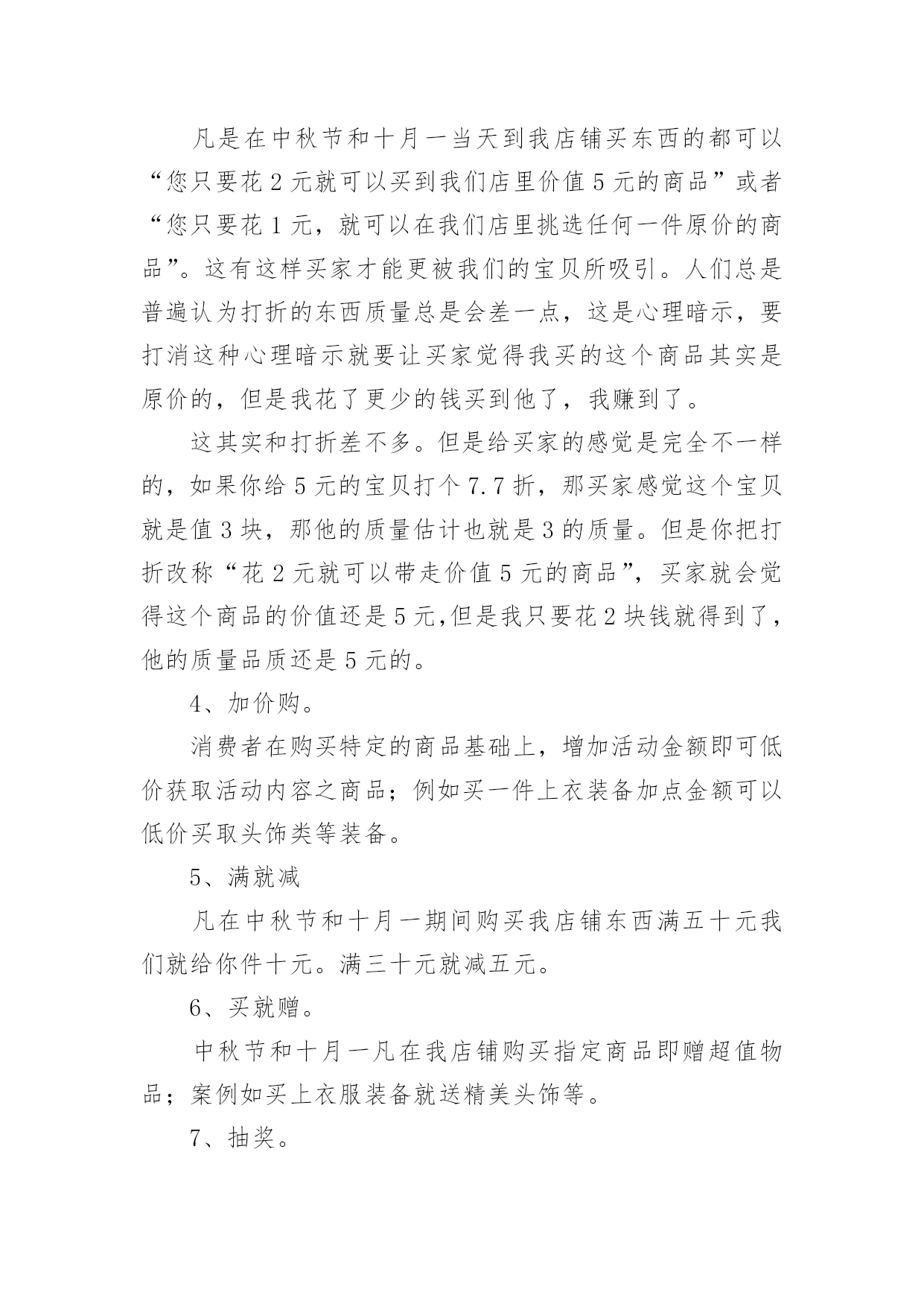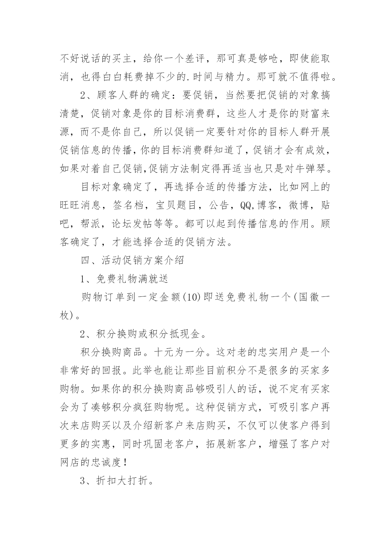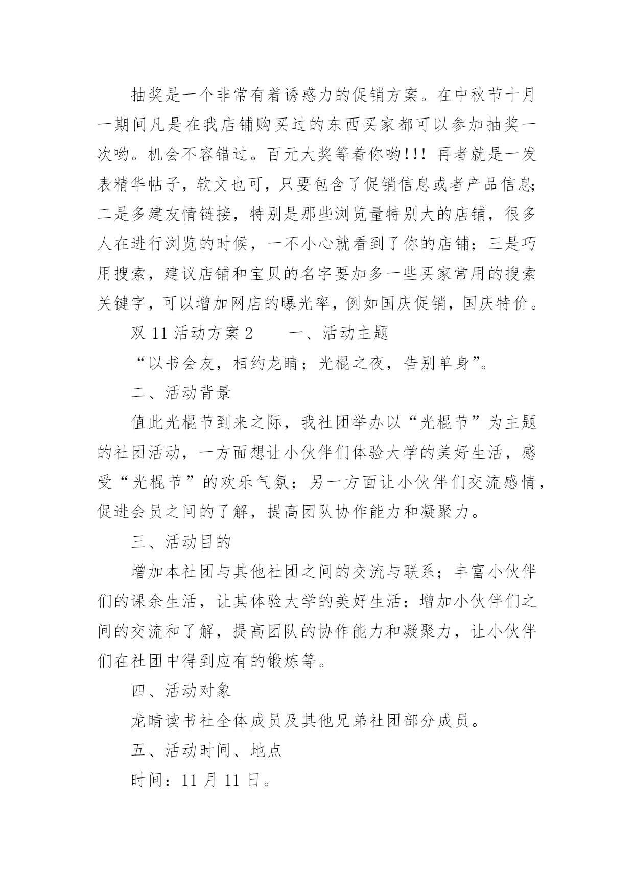 双11活动方案双11活动方案(精选9篇)为确保活动顺利开展,我们需要事先制定活动方案,活动方案是对具体将要进行的活动进行书面的计划。那么优秀的活动方案是什么样的呢?以下是小编收集整理的双11活动方案(精选9篇),希望能够帮助到大家。双11活动方案1一、促销方法:1、利用打折进行促销。2、免费礼物满就送。3、积分换购或积分抵现金。4、加价购。5、满就减。6、买就赠这些促销活动都有自身的优势,也有自身的缺点。二、促销的目的:节双利用中秋节、国庆节客户流量大的优势进行促销。目的就是留住大客户量。从而赚更多的信用、钱。三、促销前工作:1、货源问题:确定促销的商品、并备好充足的货。不同的`商品采取不同的促销方式,再者就是关于打折的物品要选择例如大的商品作为促销品。促销期间,货品销售会比平时快,因此,充足的备货就是保障,如果经常发生缺货现象,不仅影响销售,也会影响买主对咱们的好评,如果遇到不好说话的买主,给你一个差评,那可真是够呛,即使能取消,也得白白耗费掉不少的.时间与精力。那可就不值得啦。2、顾客人群的确定:要促销,当然要把促销的对象搞清楚,促销对象是你的目标消费群,这些人才是你的财富来源,而不是你自己,所以促销一定要针对你的目标人群开展促销信息的传播,你的目标消费群知道了,促销才会有成效,如果对着自己促销,促销方法制定得再适当也只是对牛弹琴。目标对象确定了,再选择合适的传播方法,比如网上的旺旺消息,签名档,宝贝题目,公告,QQ,博客,微博,贴吧,帮派,论坛发帖等等。都可以起到传播信息的作用。顾客确定了,才能选择合适的促销方法。四、活动促销方案介绍1、免费礼物满就送购物订单到一定金额(10)即送免费礼物一个(国徽一枚)。2、积分换购或积分抵现金。积分换购商品。十元为一分。这对老的忠实用户是一个非常好的回报。此举也能让那些目前积分不是很多的买家多购物。如果你的积分换购商品够吸引人的话,说不定有买家会为了凑够积分疯狂购物呢。这种促销方式,可吸引客户再次来店购买以及介绍新客户来店购买,不仅可以使客户得到更多的实惠,同时巩固老客户,拓展新客户,增强了客户对网店的忠诚度!3、折扣大打折。凡是在中秋节和十月一当天到我店铺买东西的都可以“您只要花2元就可以买到我们店里价值5元的商品”或者“您只要花1元,就可以在我们店里挑选任何一件原价的商品”。这有这样买家才能更被我们的宝贝所吸引。人们总是普遍认为打折的东西质量总是会差一点,这是心理暗示,要打消这种心理暗示就要让买家觉得我买的这个商品其实是原价的,但是我花了更少的钱买到他了,我赚到了。这其实和打折差不多。但是给买家的感觉是完全不一样的,如果你给5元的宝贝打个7.7折,那买家感觉这个宝贝就是值3块,那他的质量估计也就是3的质量。但是你把打折改称“花2元就可以带走价值5元的商品”,买家就会觉得这个商品的价值还是5元,但是我只要花2块钱就得到了,他的质量品质还是5元的。4、加价购。消费者在购买特定的商品基础上,增加活动金额即可低价获取活动内容之商品;例如买一件上衣装备加点金额可以低价买取头饰类等装备。5、满就减凡在中秋节和十月一期间购买我店铺东西满五十元我们就给你件十元。满三十元就减五元。6、买就赠。中秋节和十月一凡在我店铺购买指定商品即赠超值物品;案例如买上衣服装备就送精美头饰等。7、抽奖。抽奖是一个非常有着诱惑力的促销方案。在中秋节十月一期间凡是在我店铺购买过的东西买家都可以参加抽奖一次哟。机会不容错过。百元大奖等着你哟!!!再者就是一发表精华帖子,软文也可,只要包含了促销信息或者产品信息;二是多建友情链接,特别是那些浏览量特别大的店铺,很多人在进行浏览的时候,一不小心就看到了你的店铺;三是巧用搜索,建议店铺和宝贝的名字要加多一些买家常用的搜索关键字,可以增加网店的曝光率,例如国庆促销,国庆特价。双11活动方案2一、活动主题“以书会友,相约龙睛;光棍之夜,告别单身”。二、活动背景值此光棍节到来之际,我社团举办以“光棍节”为主题的社团活动,一方面想让小伙伴们体验大学的美好生活,感受“光棍节”的欢乐气氛;另一方面让小伙伴们交流感情,促进会员之间的了解,提高团队协作能力和凝聚力。三、活动目的增加本社团与其他社团之间的交流与联系;丰富小伙伴们的课余生活,让其体验大学的美好生活;增加小伙伴们之间的交流和了解,提高团队的协作能力和凝聚力,让小伙伴们在社团中得到应有的锻炼等。四、活动对象龙睛读书社全体成员及其他兄弟社团部分成员。五、活动时间、地点时间:11月11日。地点:教学楼A楼。六、活动前期准备1、社团内部做好宣传工作,向会员们征求活动意见及建议。2、会长、部长合理分配任务。3、做好活动之前的材料、设备及道具的准备工作。4、做好预案,确保活动的有序开展。5、携手共度难关。6、情牵龙睛。7、同一个龙睛,同一个