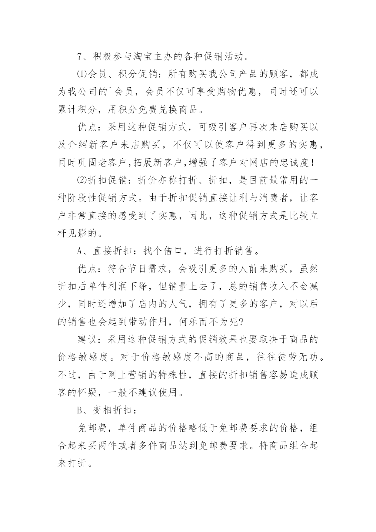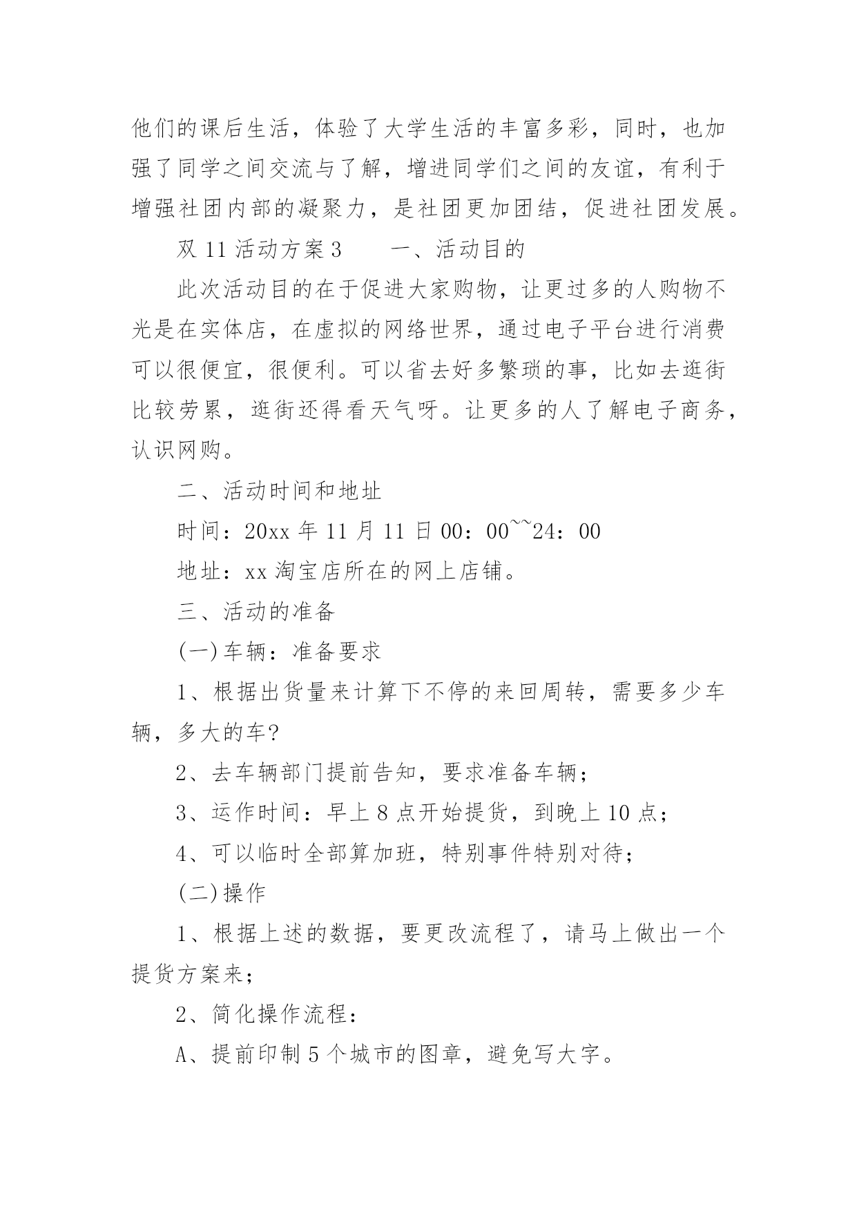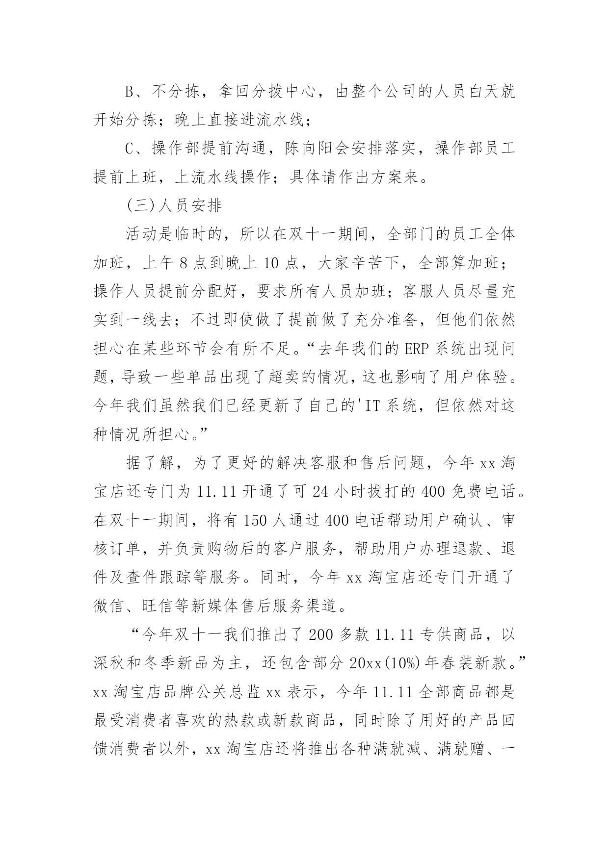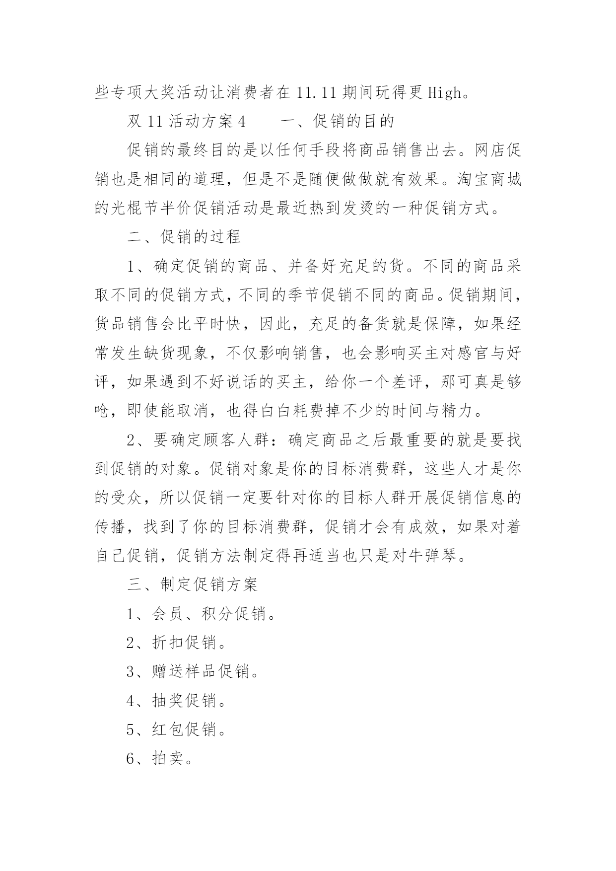 双11活动方案双11活动方案(精选9篇)为确保活动顺利开展,我们需要事先制定活动方案,活动方案是对具体将要进行的活动进行书面的计划。那么优秀的活动方案是什么样的呢?以下是小编收集整理的双11活动方案(精选9篇),希望能够帮助到大家。双11活动方案1一、促销方法:1、利用打折进行促销。2、免费礼物满就送。3、积分换购或积分抵现金。4、加价购。5、满就减。6、买就赠这些促销活动都有自身的优势,也有自身的缺点。二、促销的目的:节双利用中秋节、国庆节客户流量大的优势进行促销。目的就是留住大客户量。从而赚更多的信用、钱。三、促销前工作:1、货源问题:确定促销的商品、并备好充足的货。不同的`商品采取不同的促销方式,再者就是关于打折的物品要选择例如大的商品作为促销品。促销期间,货品销售会比平时快,因此,充足的备货就是保障,如果经常发生缺货现象,不仅影响销售,也会影响买主对咱们的好评,如果遇到不好说话的买主,给你一个差评,那可真是够呛,即使能取消,也得白白耗费掉不少的.时间与精力。那可就不值得啦。2、顾客人群的确定:要促销,当然要把促销的对象搞清楚,促销对象是你的目标消费群,这些人才是你的财富来源,而不是你自己,所以促销一定要针对你的目标人群开展促销信息的传播,你的目标消费群知道了,促销才会有成效,如果对着自己促销,促销方法制定得再适当也只是对牛弹琴。目标对象确定了,再选择合适的传播方法,比如网上的旺旺消息,签名档,宝贝题目,公告,QQ,博客,微博,贴吧,帮派,论坛发帖等等。都可以起到传播信息的作用。顾客确定了,才能选择合适的促销方法。四、活动促销方案介绍1、免费礼物满就送购物订单到一定金额(10)即送免费礼物一个(国徽一枚)。2、积分换购或积分抵现金。积分换购商品。十元为一分。这对老的忠实用户是一个非常好的回报。此举也能让那些目前积分不是很多的买家多购物。如果你的积分换购商品够吸引人的话,说不定有买家会为了凑够积分疯狂购物呢。这种促销方式,可吸引客户再次来店购买以及介绍新客户来店购买,不仅可以使客户得到更多的实惠,同时巩固老客户,拓展新客户,增强了客户对网店的忠诚度!3、折扣大打折。凡是在中秋节和十月一当天到我店铺买东西的都可以“您只要花2元就可以买到我们店里价值5元的商品”或者“您只要花1元,就可以在我们店里挑选任何一件原价的商品”。这有这样买家才能更被我们的宝贝所吸引。人们总是普遍认为打折的东西质量总是会差一点,这是心理暗示,要打消这种心理暗示就要让买家觉得我买的这个商品其实是原价的,但是我花了更少的钱买到他了,我赚到了。这其实和打折差不多。但是给买家的感觉是完全不一样的,如果你给5元的宝贝打个7.7折,那买家感觉这个宝贝就是值3块,那他的质量估计也就是3的质量。但是你把打折改称“花2元就可以带走价值5元的商品”,买家就会觉得这个商品的价值还是5元,但是我只要花2块钱就得到了,他的质量品质还是5元的。4、加价购。消费者在购买特定的商品基础上,增加活动金额即可低价获取活动内容之商品;例如买一件上衣装备加点金额可以低价买取头饰类等装备。5、满就减凡在中秋节和十月一期间购买我店铺东西满五十元我们就给你件十元。满三十元就减五元。6、买就赠。中秋节和十月一凡在我店铺购买指定商品即赠超值物品;案例如买上衣服装备就送精美头饰等。7、抽奖。抽奖是一个非常有着诱惑力的促销方案。在中秋节十月一期间凡是在我店铺购买过的东西买家都可以参加抽奖一次哟。机会不容错过。百元大奖等着你哟!!!再者就是一发表精华帖子,软文也可,只要包含了促销信息或者产品信息;二是多建友情链接,特别是那些浏览量特别大的店铺,很多人在进行浏览的时候,一不小心就看到了你的店铺;三是巧用搜索,建议店铺和宝贝的名字要加多一些买家常用的搜索关键字,可以增加网店的曝光率,例如国庆促销,国庆特价。双11活动方案2一、活动主题“以书会友,相约龙睛;光棍之夜,告别单身”。二、活动背景值此光棍节到来之际,我社团举办以“光棍节”为主题的社团活动,一方面想让小伙伴们体验大学的美好生活,感受“光棍节”的欢乐气氛;另一方面让小伙伴们交流感情,促进会员之间的了解,提高团队协作能力和凝聚力。三、活动目的增加本社团与其他社团之间的交流与联系;丰富小伙伴们的课余生活,让其体验大学的美好生活;增加小伙伴们之间的交流和了解,提高团队的协作能力和凝聚力,让小伙伴们在社团中得到应有的锻炼等。四、活动对象龙睛读书社全体成员及其他兄弟社团部分成员。五、活动时间、地点时间:11月11日。地点:教学楼A楼。六、活动前期准备1、社团内部做好宣传工作,向会员们征求活动意见及建议。2、会长、部长合理分配任务。3、做好活动之前的材料、设备及道具的准备工作。4、做好预案,确保活动的有序开展。5、携手共度难关。6、情牵龙睛。7、同一个龙睛,同一个