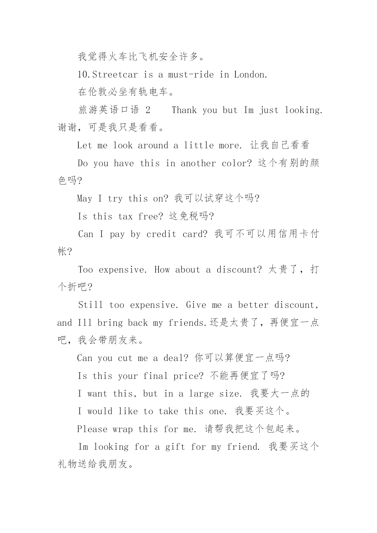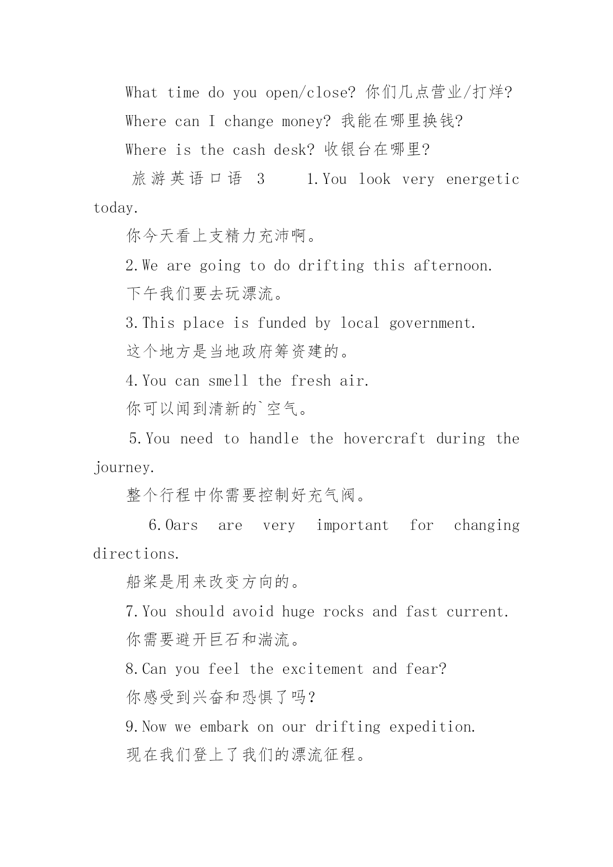 旅游英语口语旅游英语口语高考结束后,想必不少考生会外出旅游,放松心情,但是那些旅游中要用到的英语口语你已经学会了吗?下面应届毕业生考试网小编为大家送上一些旅游英语口语,以供参考。旅游英语口语11.Hereismyclaimtag.这是我的行李托运卡。2.HowsoonwillIfindoutmylostbaggage?多久才能找回我的`行李?3.Whereisthetouristservicecenter?请问旅游服务中心在哪里?4.Isthereanairportbustothecity?这里有去市中吣的机场巴士吗?5.Youcangetataxiatthepick-uppoint.您可以在乘车点打车。6.Takemetothisaddress,please.请拉我去这个地址。7.IsthereChinesecuisineinthediningcar?餐车上提供中国菜吗?8.Whatisthegatenumber?登机门是几号?9.Ithinkthetrainismuchsaferthantheairplane.我觉得火车比飞机安全许多。10.Streetcarisamust-rideinLondon.在伦敦必坐有轨电车。旅游英语口语2ThankyoubutImjustlooking.谢谢,可是我只是看看。Letmelookaroundalittlemore.让我自己看看Doyouhavethisinanothercolor?这个有别的颜色吗?MayItrythison?我可以试穿这个吗?Isthistaxfree?这免税吗?CanIpaybycreditcard?我可不可以用信用卡付帐?Tooexpensive.Howaboutadiscount?太贵了,打个折吧?Stilltooexpensive.Givemeabetterdiscount,andIllbringbackmyfriends.还是太贵了,再便宜一点吧,我会带朋友来。Canyoucutmeadeal?你可以算便宜一点吗?Isthisyourfinalprice?不能再便宜了吗?Iwantthis,butinalargesize.我要大一点的Iwouldliketotakethisone.我要买这个。Pleasewrapthisforme.请帮我把这个包起来。Imlookingforagiftformyfriend.我要买这个礼物送给我朋友。Whattimedoyouopen/close?你们几点营业/打烊?WherecanIchangemoney?我能在哪里换钱?Whereisthecashdesk?收银台在哪里?旅游英语口语31.Youlookveryenergetictoday.你今天看上支精力充沛啊。2.Wearegoingtododriftingthisafternoon.下午我们要去玩漂流。3.Thisplaceisfundedbylocalgovernment.这个地方是当地政府筹资建的。4.Youcansmellthefreshair.你可以闻到清新的`空气。5.Youneedtohandlethehovercraftduringthejourney.整个行程中你需要控制好充气阀。6.Oarsareveryimportantforchangingdirections.船桨是用来改变方向的。7.Youshouldavoidhugerocksandfastcurrent.你需要避开巨石和湍流。8.Canyoufeeltheexcitementandfear?你感受到兴奋和恐惧了吗?9.Nowweembarkonourdriftingexpedition.现在我们登上了我们的漂流征程。10.Thisisaman-maderiver.这条河是人工河。11.Holdtightoryouwillbejoltedaround.抓紧了,否则你会被颠来倒去的。12.Weneedtokeeppollutionawayfromthisforest.我们需要保护这片森林免受污染。