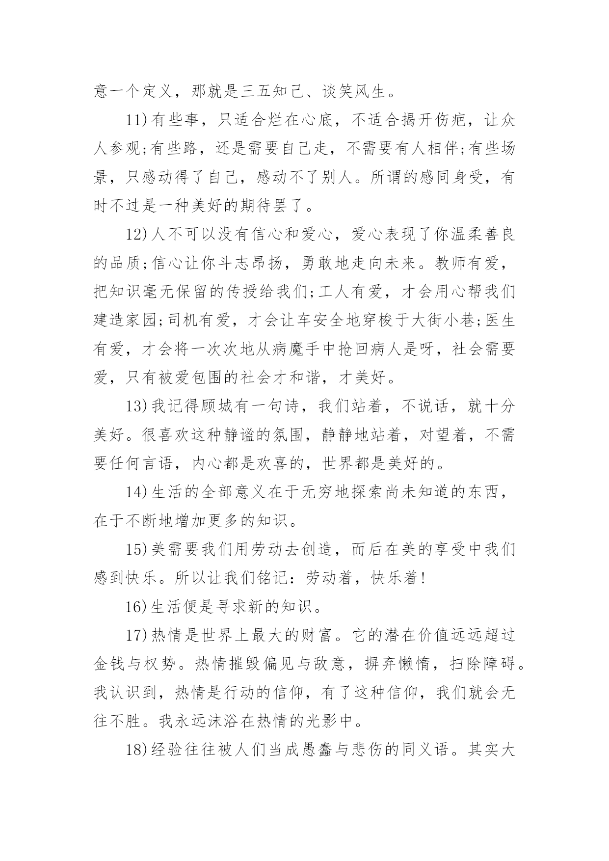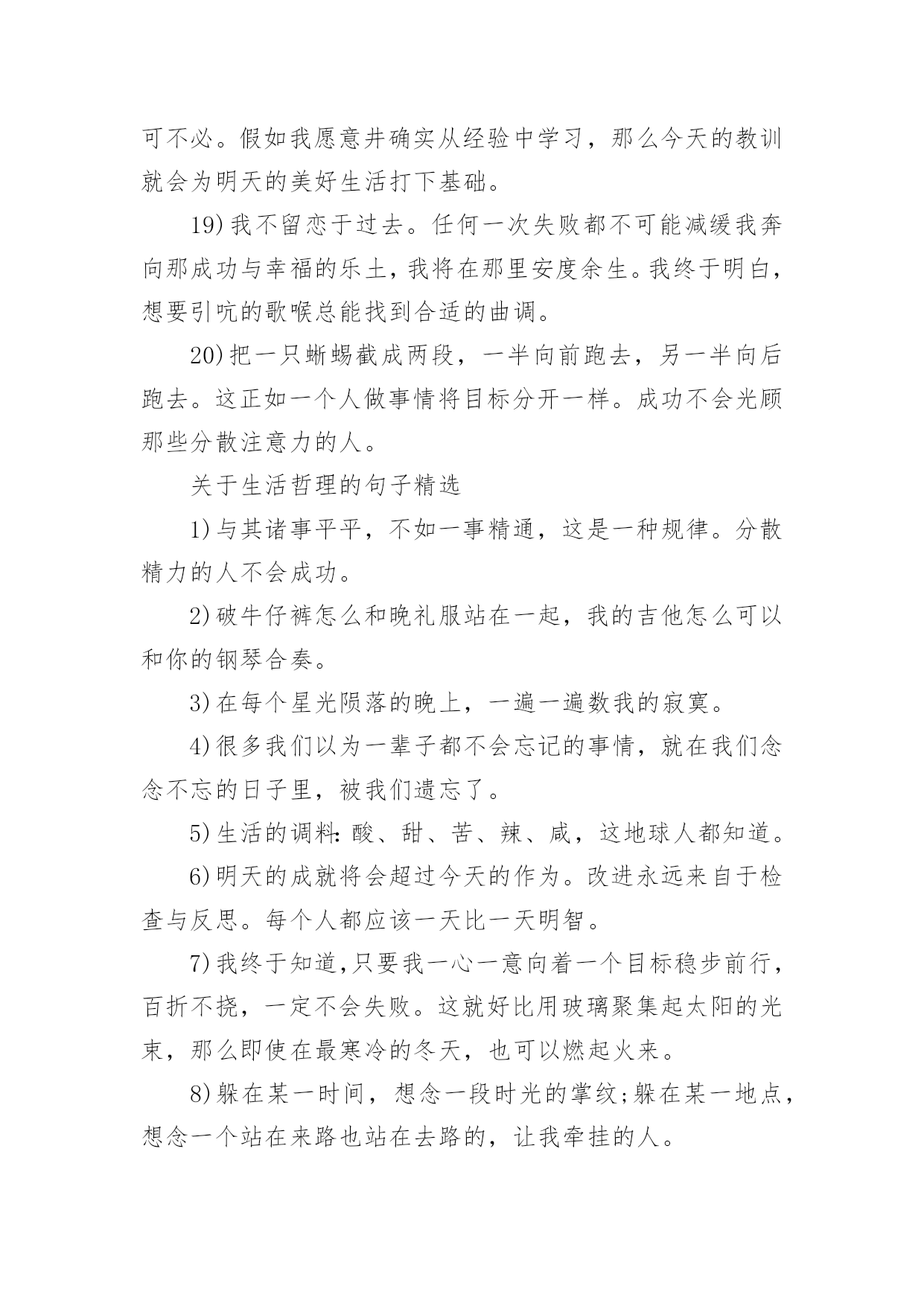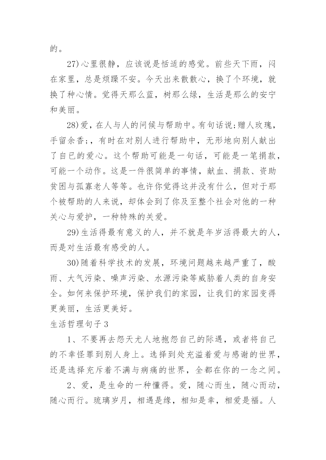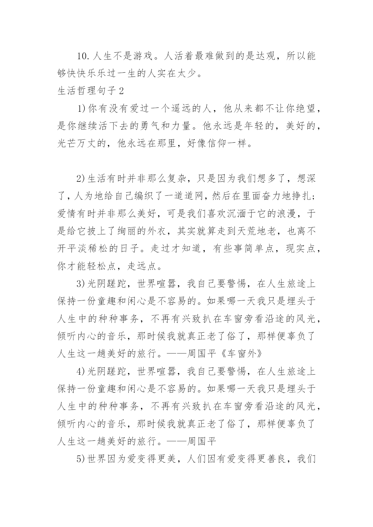 生活哲理句子生活哲理句子无论是在学校还是在社会中,大家对句子都再熟悉不过了吧,在不同类型的文章里,不同位置的句子的作用也是不同的。什么样的句子才经典呢?以下是小编收集整理的生活哲理句子,欢迎阅读与收藏。生活哲理句子11.对老人重在生前厚养,身后事量力而行。2.人生必须尝试。只有试水的鱼儿才知道哪儿清,哪儿浊,哪一片水域适合自己。3.人生就像一支笛子,只要用心吹奏,生命的乐曲一定会悦耳动听。4.人生之路从来就是弯弯曲曲的,就像大地上没有一条江河会是笔直的一样。5.人生是一架纺织幻想的织机。6.人生如歌,尽可以来去从容。7.人生有不如意的事在所难免,对人生有透彻了解的人,是决不会在逆境中自甘沉沦的。8.人生就是奋斗,它有着事业的追求和生活的磨炼。9.青年人看到人生路上全是鲜花,老年人看到的只有坟墓。实际上既有鲜花,也有坟墓,坟墓上开着鲜花,鲜花下覆盖着坟墓。10.人生不是游戏。人活着最难做到的是达观,所以能够快快乐乐过一生的人实在太少。生活哲理句子21)你有没有爱过一个遥远的人,他从来都不让你绝望,是你继续活下去的勇气和力量。他永远是年轻的,美好的,光芒万丈的,他永远在那里,好像信仰一样。2)生活有时并非那么复杂,只是因为我们想多了,想深了,人为地给自己编织了一道道网,然后在里面奋力地挣扎;爱情有时并非那么美好,可是我们喜欢沉湎于它的浪漫,于是给它披上了绚丽的外衣,其实就算走到天荒地老,也离不开平淡稀松的日子。走过才知道,有些事简单点,现实点,你才能轻松点,走远点。3)光阴蹉跎,世界喧嚣,我自己要警惕,在人生旅途上保持一份童趣和闲心是不容易的。如果哪一天我只是埋头于人生中的种种事务,不再有兴致扒在车窗旁看沿途的风光,倾听内心的音乐,那时候我就真正老了俗了,那样便辜负了人生这一趟美好的旅行。——周国平《车窗外》4)光阴蹉跎,世界喧嚣,我自己要警惕,在人生旅途上保持一份童趣和闲心是不容易的。如果哪一天我只是埋头于人生中的种种事务,不再有兴致扒在车窗旁看沿途的风光,倾听内心的音乐,那时候我就真正老了俗了,那样便辜负了人生这一趟美好的旅行。——周国平5)世界因为爱变得更美,人们因有爱变得更善良,我们更要善待生活,感恩生活,人间才会处处有爱,生活才会更美好。6)我的家乡坐落在太行山脚下,一条小溪从村旁流过。从远处看,那条小溪像一条银丝带,缓缓向东流去;走近一看,小溪清澈见底,小鱼小虾在水中自由自在地游来游去。两岸山上的翠柏四季常青。我的家乡就像是一个大公园,一年四季都有数不完的美景。7)随着科学技术的发展,环境问题越来越严重了,酸雨、大气污染、噪声污染、水源污染等威胁着人类的自身安全。如何来保护环境,保护我们的家园,让我们的家园变得更美丽,生活更美好。唯美的句子8)人不可以没有信心和爱心,爱心表现了你温柔善良的品质;信心让你斗志昂扬,勇敢地走向未来。教师有爱,把知识毫无保留的传授给我们;工人有爱,才会用心帮我们建造家园;司机有爱,才会让车安全地穿梭于大街小巷;医生有爱,才会将一次次地从病魔手中抢回病人……是呀,社会需要爱,只有被爱包围的社会才和谐,才美好。形容美好生活的句子9)时光越老,人心越淡。曾经说好了生死与共的人,到最后老死不相往来。岁月是贼,总是不经意地偷去许多,美好的容颜,真实的情感,幸福的生活。也许我们无法做到视若无睹,但也不必干戈相向。毕竟谁都拥有过花好月圆的时光,那时候,就要做好有一天被洗劫一空的准备。10)若要给美好人生一个定义,那就是惬意。若要给惬意一个定义,那就是三五知己、谈笑风生。11)有些事,只适合烂在心底,不适合揭开伤疤,让众人参观;有些路,还是需要自己走,不需要有人相伴;有些场景,只感动得了自己,感动不了别人。所谓的感同身受,有时不过是一种美好的期待罢了。12)人不可以没有信心和爱心,爱心表现了你温柔善良的品质;信心让你斗志昂扬,勇敢地走向未来。教师有爱,把知识毫无保留的传授给我们;工人有爱,才会用心帮我们建造家园;司机有爱,才会让车安全地穿梭于大街小巷;医生有爱,才会将一次次地从病魔手中抢回病人是呀,社会需要爱,只有被爱包围的社会才和谐,才美好。13)我记得顾城有一句诗,我们站着,不说话,就十分美好。很喜欢这种静谧的氛围,静静地站着,对望着,不需要任何言语,内心都是欢喜的,世界都是美好的。14)生活的全部意义在于无穷地探索尚未知道的东西,在于不断地增加更多的知识。15)美需要我们用劳动去创造,而后在美的享受中我们感到快乐。所以让我们铭记:劳动着,快乐着!16)生活便是寻求新的知识。17)热情是世界上最大的财富。它的潜在价值远远超过金钱与权势。热情摧毁偏见与敌意,摒弃懒惰,扫除障碍。我认识到,热情是行动的信仰,有了这种信仰,我们就会无往不胜。我永远沫浴在热情的光影中。18)经验往往被人们当成愚蠢与悲伤的同义