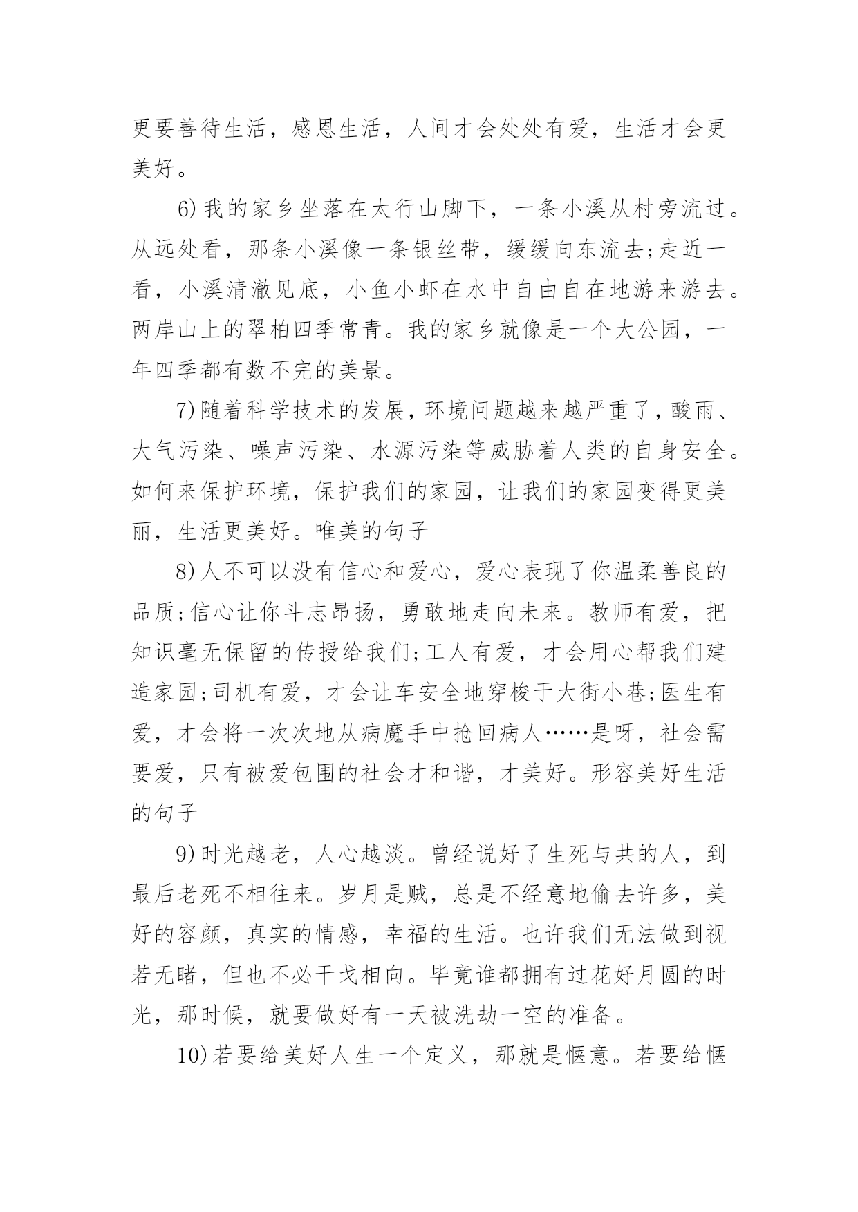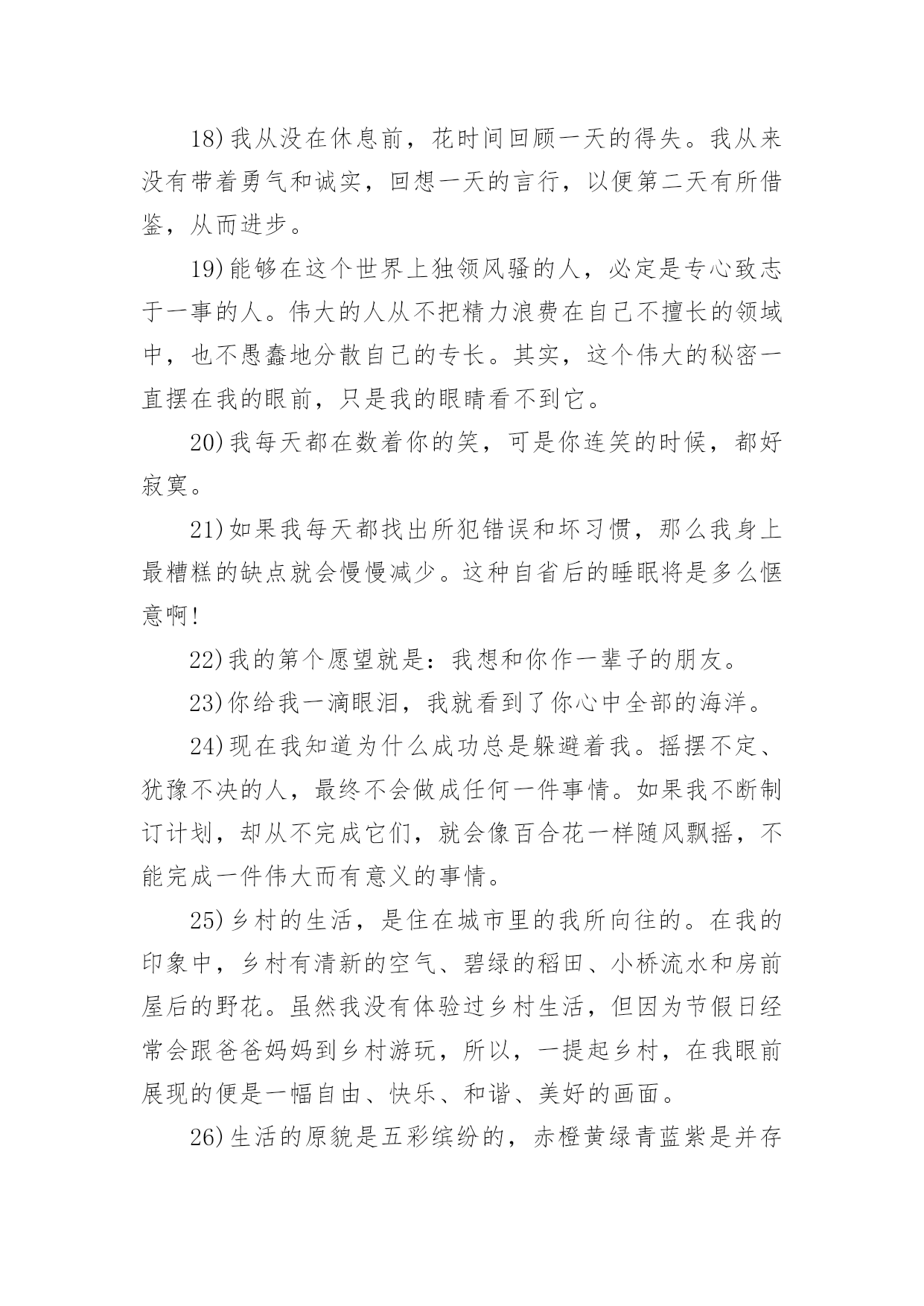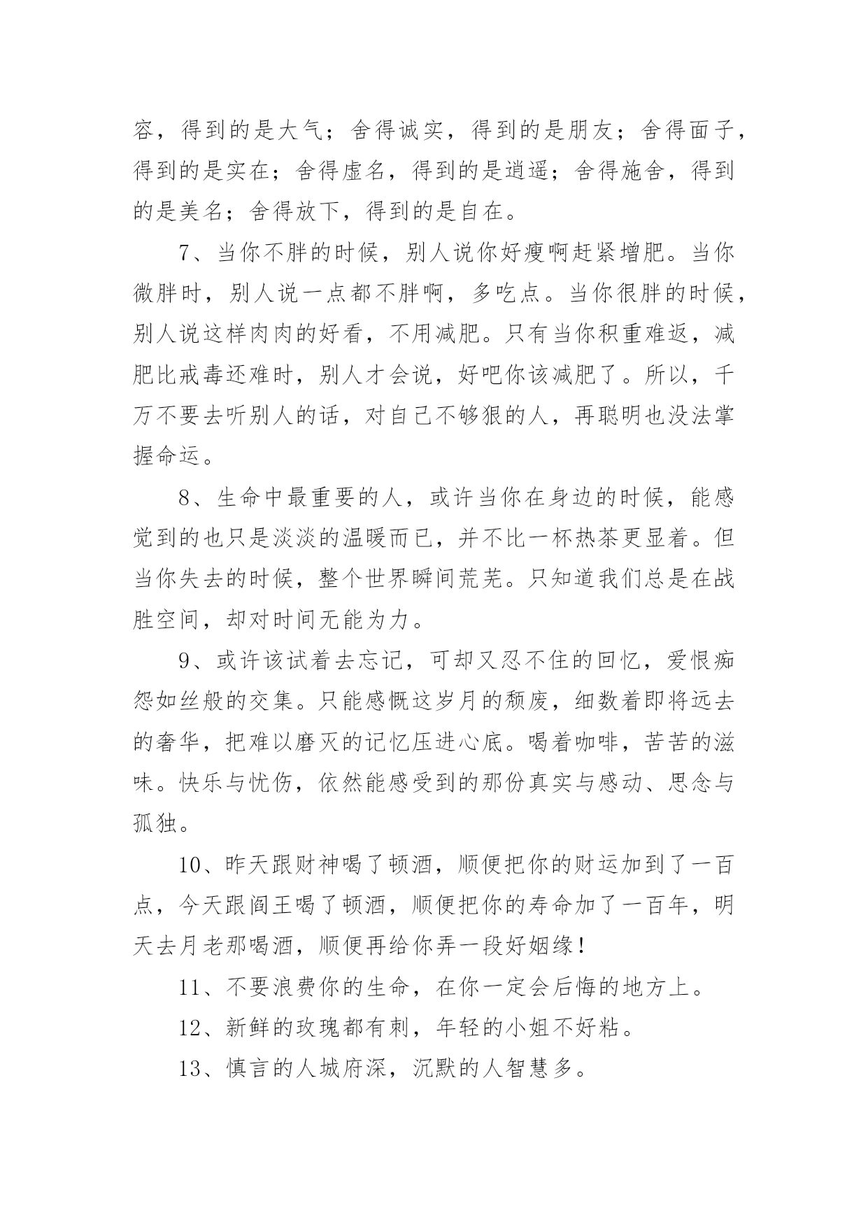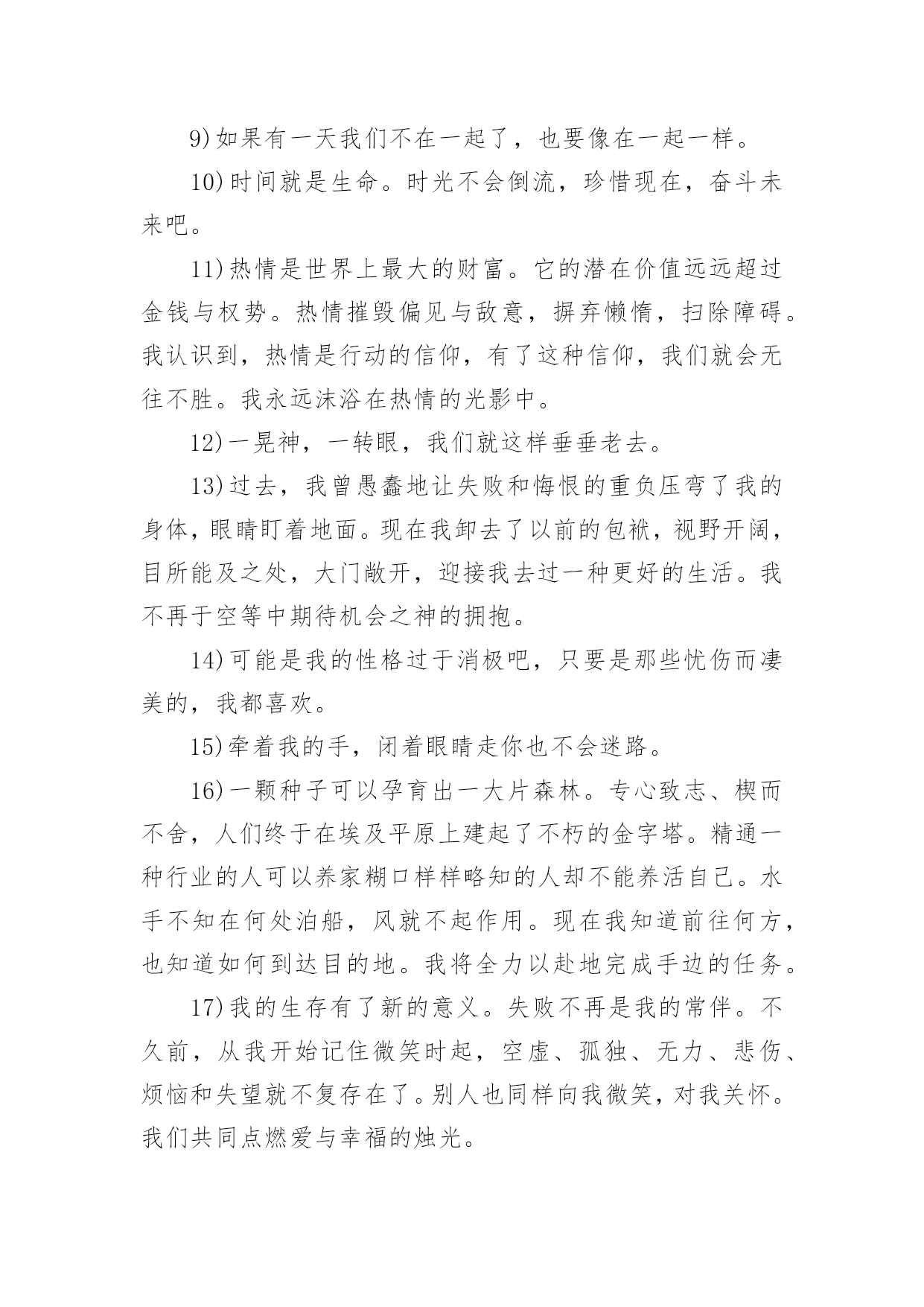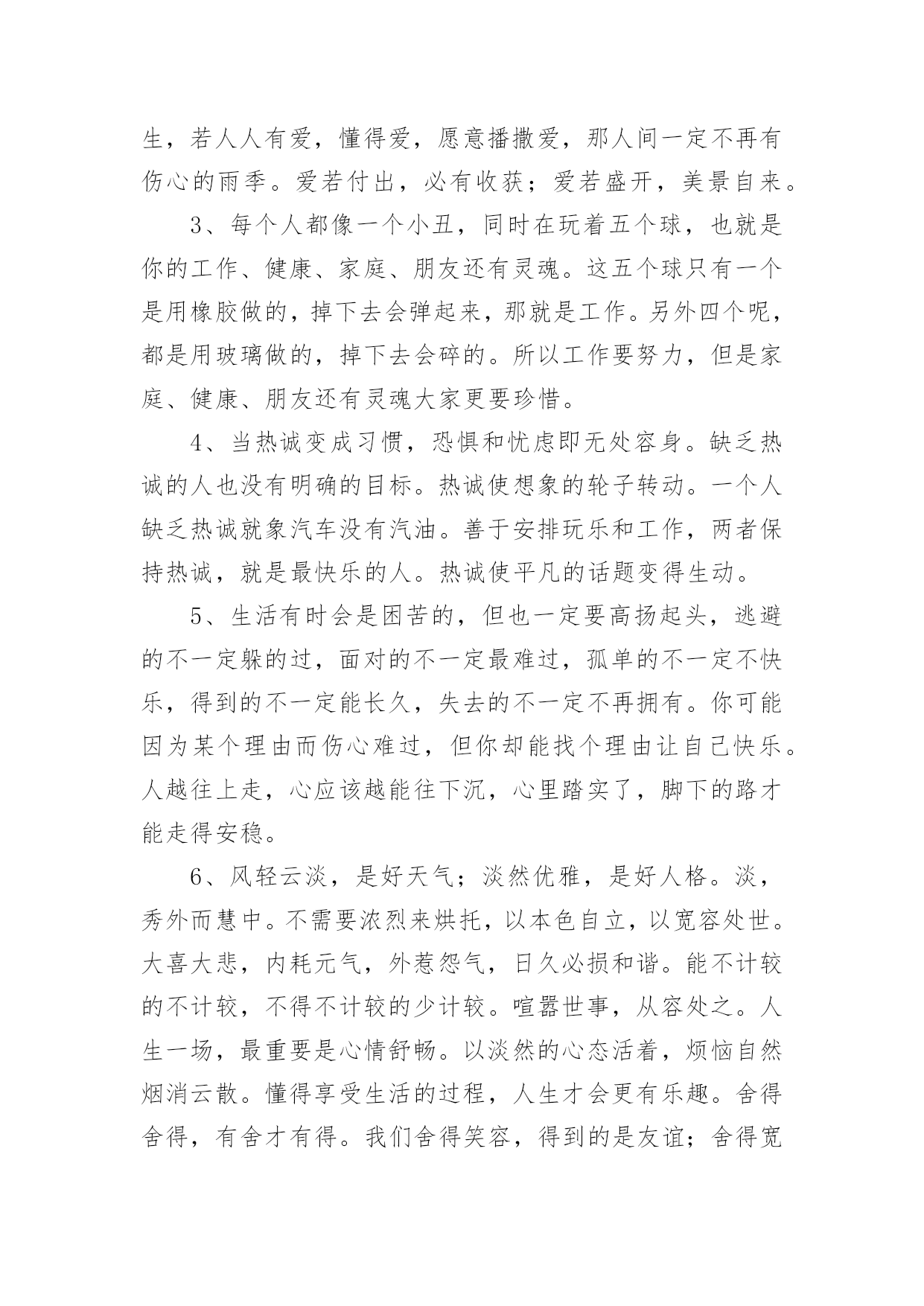 生活哲理句子生活哲理句子无论是在学校还是在社会中,大家对句子都再熟悉不过了吧,在不同类型的文章里,不同位置的句子的作用也是不同的。什么样的句子才经典呢?以下是小编收集整理的生活哲理句子,欢迎阅读与收藏。生活哲理句子11.对老人重在生前厚养,身后事量力而行。2.人生必须尝试。只有试水的鱼儿才知道哪儿清,哪儿浊,哪一片水域适合自己。3.人生就像一支笛子,只要用心吹奏,生命的乐曲一定会悦耳动听。4.人生之路从来就是弯弯曲曲的,就像大地上没有一条江河会是笔直的一样。5.人生是一架纺织幻想的织机。6.人生如歌,尽可以来去从容。7.人生有不如意的事在所难免,对人生有透彻了解的人,是决不会在逆境中自甘沉沦的。8.人生就是奋斗,它有着事业的追求和生活的磨炼。9.青年人看到人生路上全是鲜花,老年人看到的只有坟墓。实际上既有鲜花,也有坟墓,坟墓上开着鲜花,鲜花下覆盖着坟墓。10.人生不是游戏。人活着最难做到的是达观,所以能够快快乐乐过一生的人实在太少。生活哲理句子21)你有没有爱过一个遥远的人,他从来都不让你绝望,是你继续活下去的勇气和力量。他永远是年轻的,美好的,光芒万丈的,他永远在那里,好像信仰一样。2)生活有时并非那么复杂,只是因为我们想多了,想深了,人为地给自己编织了一道道网,然后在里面奋力地挣扎;爱情有时并非那么美好,可是我们喜欢沉湎于它的浪漫,于是给它披上了绚丽的外衣,其实就算走到天荒地老,也离不开平淡稀松的日子。走过才知道,有些事简单点,现实点,你才能轻松点,走远点。3)光阴蹉跎,世界喧嚣,我自己要警惕,在人生旅途上保持一份童趣和闲心是不容易的。如果哪一天我只是埋头于人生中的种种事务,不再有兴致扒在车窗旁看沿途的风光,倾听内心的音乐,那时候我就真正老了俗了,那样便辜负了人生这一趟美好的旅行。——周国平《车窗外》4)光阴蹉跎,世界喧嚣,我自己要警惕,在人生旅途上保持一份童趣和闲心是不容易的。如果哪一天我只是埋头于人生中的种种事务,不再有兴致扒在车窗旁看沿途的风光,倾听内心的音乐,那时候我就真正老了俗了,那样便辜负了人生这一趟美好的旅行。——周国平5)世界因为爱变得更美,人们因有爱变得更善良,我们更要善待生活,感恩生活,人间才会处处有爱,生活才会更美好。6)我的家乡坐落在太行山脚下,一条小溪从村旁流过。从远处看,那条小溪像一条银丝带,缓缓向东流去;走近一看,小溪清澈见底,小鱼小虾在水中自由自在地游来游去。两岸山上的翠柏四季常青。我的家乡就像是一个大公园,一年四季都有数不完的美景。7)随着科学技术的发展,环境问题越来越严重了,酸雨、大气污染、噪声污染、水源污染等威胁着人类的自身安全。如何来保护环境,保护我们的家园,让我们的家园变得更美丽,生活更美好。唯美的句子8)人不可以没有信心和爱心,爱心表现了你温柔善良的品质;信心让你斗志昂扬,勇敢地走向未来。教师有爱,把知识毫无保留的传授给我们;工人有爱,才会用心帮我们建造家园;司机有爱,才会让车安全地穿梭于大街小巷;医生有爱,才会将一次次地从病魔手中抢回病人……是呀,社会需要爱,只有被爱包围的社会才和谐,才美好。形容美好生活的句子9)时光越老,人心越淡。曾经说好了生死与共的人,到最后老死不相往来。岁月是贼,总是不经意地偷去许多,美好的容颜,真实的情感,幸福的生活。也许我们无法做到视若无睹,但也不必干戈相向。毕竟谁都拥有过花好月圆的时光,那时候,就要做好有一天被洗劫一空的准备。10)若要给美好人生一个定义,那就是惬意。若要给惬意一个定义,那就是三五知己、谈笑风生。11)有些事,只适合烂在心底,不适合揭开伤疤,让众人参观;有些路,还是需要自己走,不需要有人相伴;有些场景,只感动得了自己,感动不了别人。所谓的感同身受,有时不过是一种美好的期待罢了。12)人不可以没有信心和爱心,爱心表现了你温柔善良的品质;信心让你斗志昂扬,勇敢地走向未来。教师有爱,把知识毫无保留的传授给我们;工人有爱,才会用心帮我们建造家园;司机有爱,才会让车安全地穿梭于大街小巷;医生有爱,才会将一次次地从病魔手中抢回病人是呀,社会需要爱,只有被爱包围的社会才和谐,才美好。13)我记得顾城有一句诗,我们站着,不说话,就十分美好。很喜欢这种静谧的氛围,静静地站着,对望着,不需要任何言语,内心都是欢喜的,世界都是美好的。14)生活的全部意义在于无穷地探索尚未知道的东西,在于不断地增加更多的知识。15)美需要我们用劳动去创造,而后在美的享受中我们感到快乐。所以让我们铭记:劳动着,快乐着!16)生活便是寻求新的知识。17)热情是世界上最大的财富。它的潜在价值远远超过金钱与权势。热情摧毁偏见与敌意,摒弃懒惰,扫除障碍。我认识到,热情是行动的信仰,有了这种信仰,我们就会无往不胜。我永远沫浴在热情的光影中。18)经验往往被人们当成愚蠢与悲伤的同义