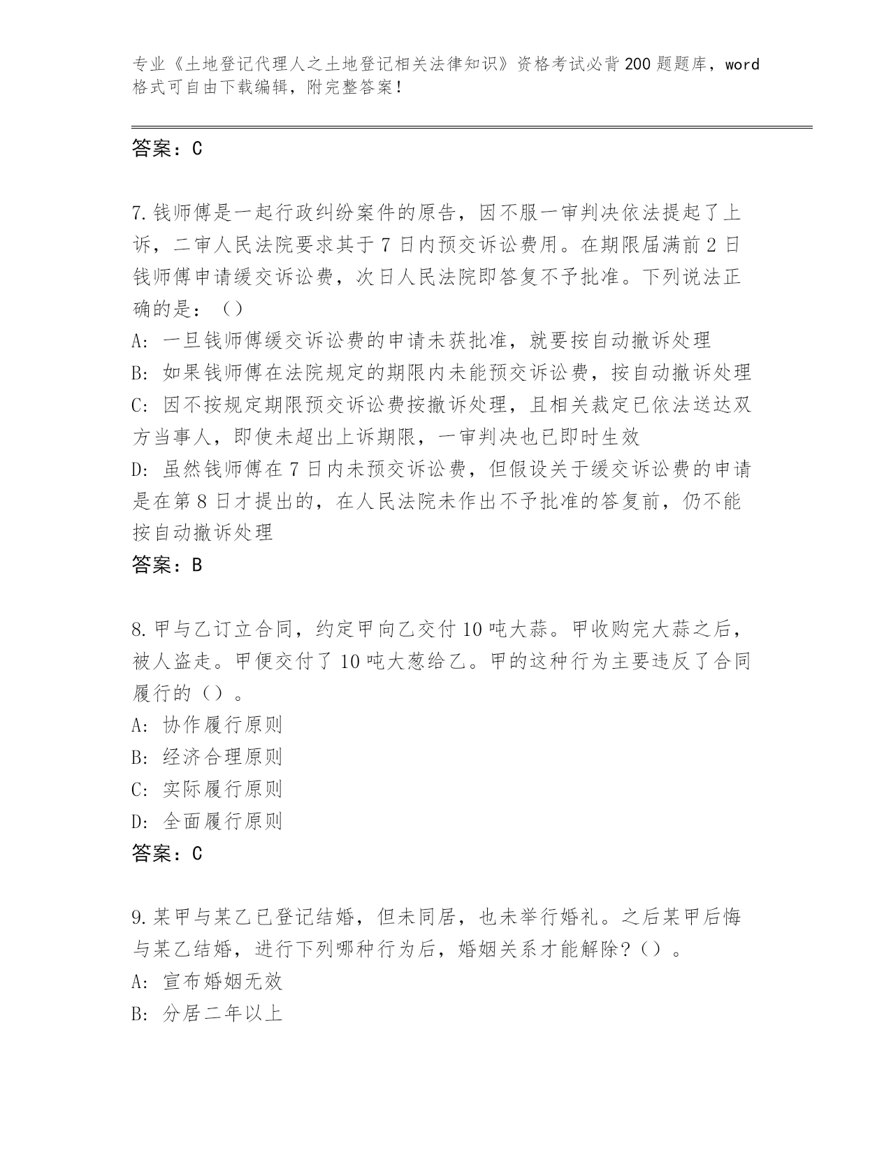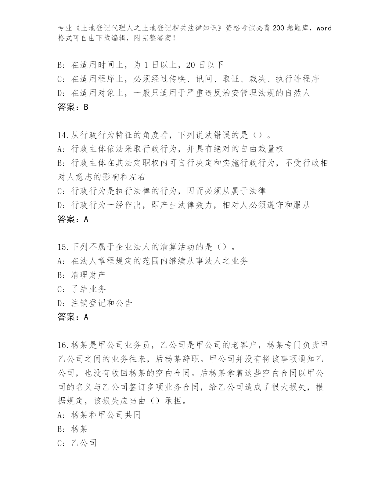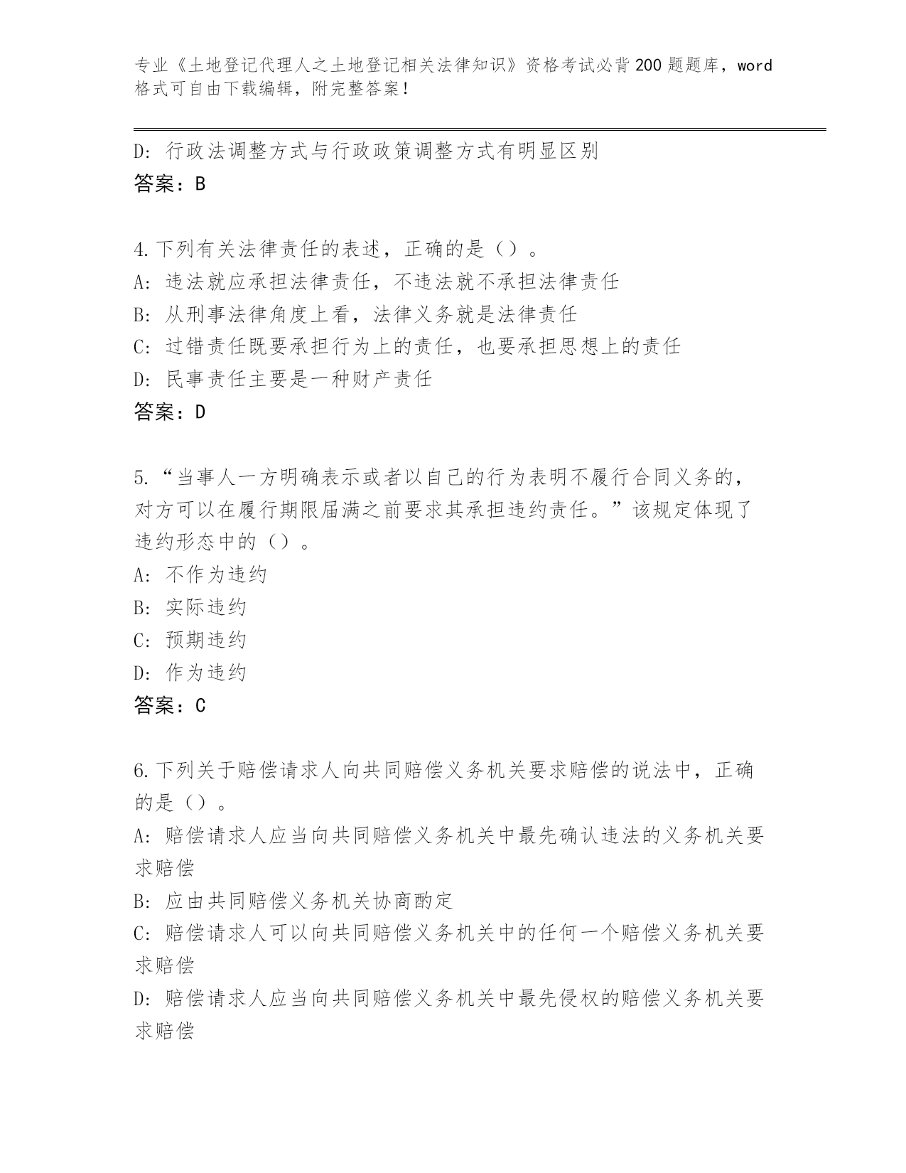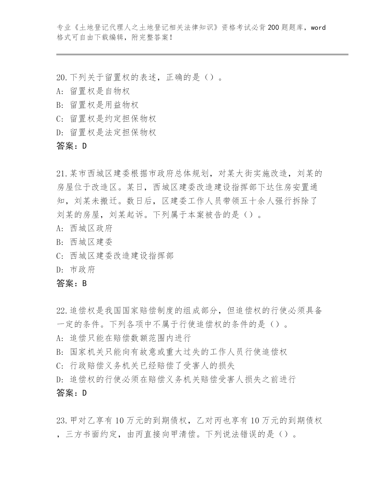 2024黑龙江省泰来县《土地登记代理人之土地登记相关法律知识》资格考试必刷200题真题(网校专用)