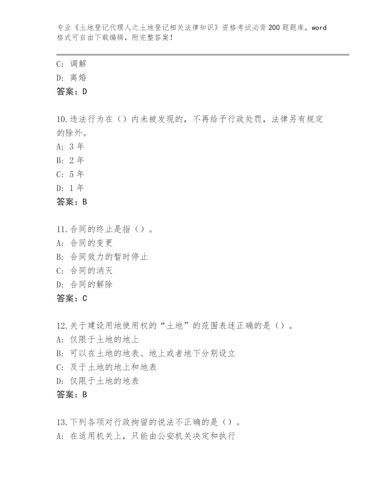 完整版河北省隆化县《土地登记代理人之土地登记相关法律知识》资格考试必背200题完整题库带解析答案
