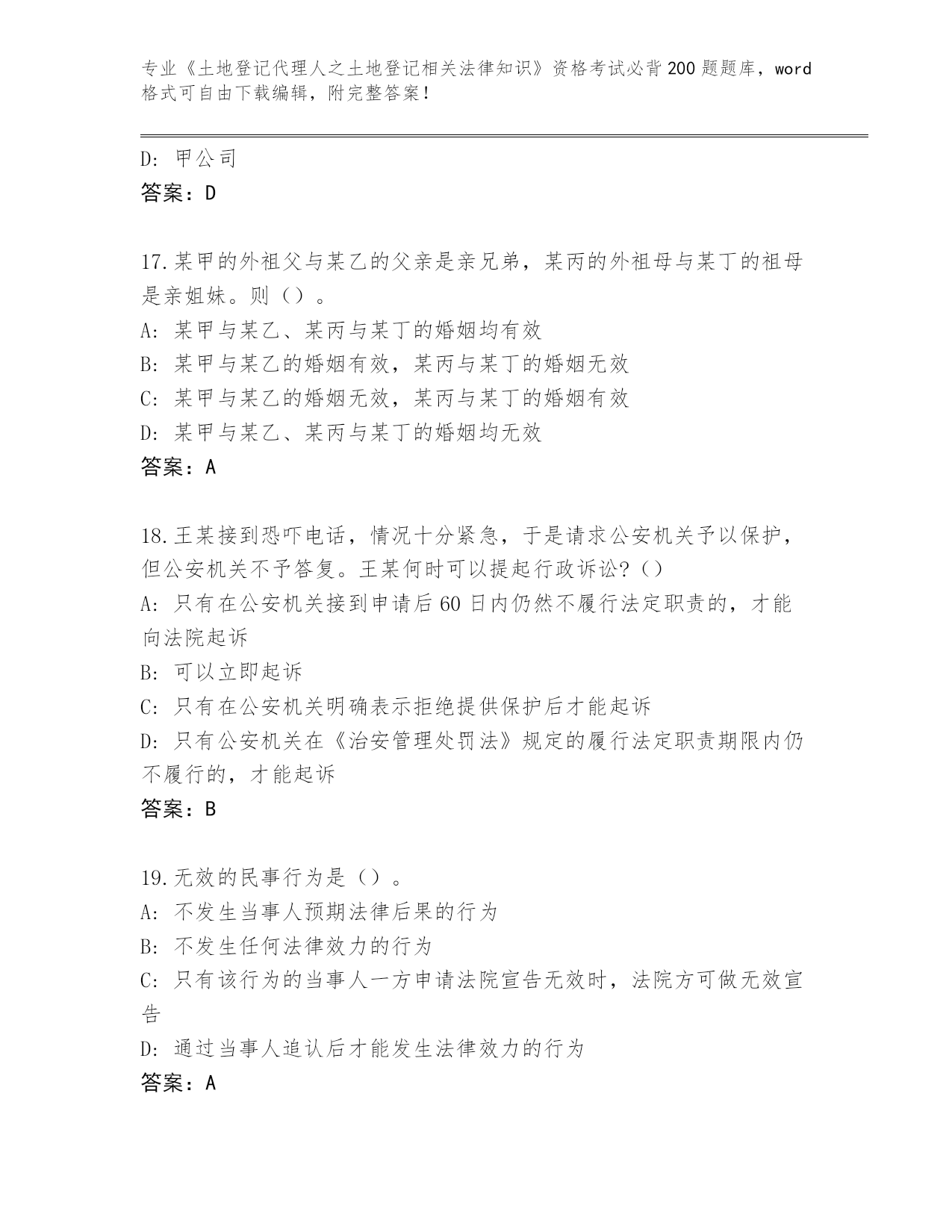 贵州省水城县2024年《土地登记代理人之土地登记相关法律知识》资格考试必刷200题真题题库含答案