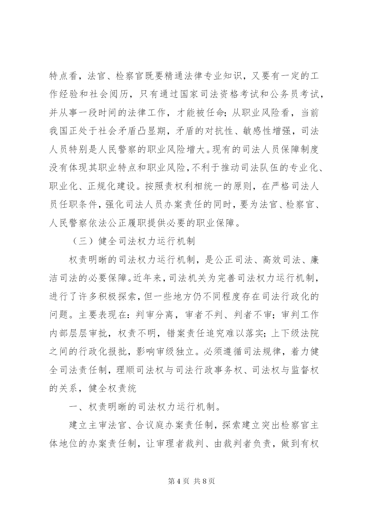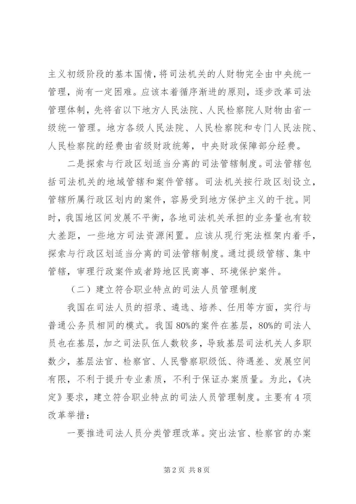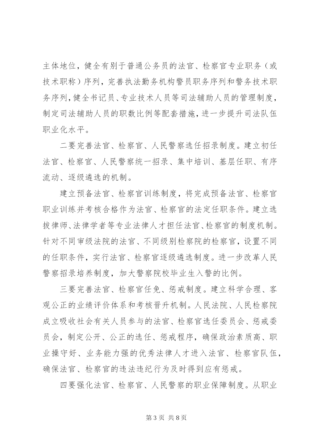 第PAGE\*Arabic\*MERGEFORMAT8页共NUMPAGES\*MERGEFORMAT8页聚焦司法体制改革[范文大全]深化司法体制改革孟建柱:准确把握深化司法体制改革的主要任务司法体制改革是一项长期而艰巨的任务。改革开放特别是党的十六大以来,我国稳步推进司法体制和工作机制改革,取得了阶段性重要成果,积累了宝贵经验。但是,与经济社会发展的形势相比,与民主法治的进步相比,与人民群众的司法需求相比,我国司法体制还存在一些不适应、不协调的问题。必须进一步深化司法体制改革,解决影响司法公正、制约司法能力的体制性、机制性、保障性障碍,立足现实,着眼长远,不断完善和发展中国特色社会主义司法制度,充分发挥社会主义司法制度的优越性。(一)确保人民法院、人民检察院依法独立公正行使审判权、检察权人民法院、人民检察院依法独立公正行使审判权、检察权,是宪法的明确规定,是保障国家法律统一正确实施的关键。近年来,社会上反映比较多的是司法机关的人财物受制于地方,司法活动易受地方保护主义的干扰,影响法制统一,损害司法权威。为此,《决定》特别指出,要确保审判机关、检察机关依法独立公正行使审判权、检察权。主要有两项内容:一是推动省以下地方法院、检察院人财物统一管理。我国是单一制国家,司法职权是中央事权。考虑到我国将长期处于社会主义初级阶段的基本国情,将司法机关的人财物完全由中央统一管理,尚有一定困难。应该本着循序渐进的原则,逐步改革司法管理体制,先将省以下地方人民法院、人民检察院人财物由省一级统一管理。地方各级人民法院、人民检察院和专门人民法院、人民检察院的经费由省级财政统筹,中央财政保障部分经费。二是探索与行政区划适当分离的司法管辖制度。司法管辖包括司法机关的地域管辖和案件管辖。司法机关按行政区划设立,管辖所属行政区划内的案件,容易受到地方保护主义的干扰。同时,我国地区间发展不平衡,各地司法机关承担的业务量也有较大差距,一些地方司法资源闲置。应该从现行宪法框架内着手,探索与行政区划适当分离的司法管辖制度。通过提级管辖、集中管辖,审理行政案件或者跨地区民商事、环境保护案件。(二)建立符合职业特点的司法人员管理制度我国在司法人员的招录、遴选、培养、任用等方面,实行与普通公务员相同的模式。我国80%的案件在基层,80%的司法人员也在基层,加之司法队伍人数较多,导致基层司法机关人多职数少,基层法官、检察官、人民警察职级低、待遇差、发展空间有限,不利于提升专业素质,不利于保证办案质量。为此,《决定》要求,建立符合职业特点的司法人员管理制度。主要有4项改革举措:一要推进司法人员分类管理改革。突出法官、检察官的办案主体地位,健全有别于普通公务员的法官、检察官专业职务(或技术职称)序列,完善执法勤务机构警员职务序列和警务技术职务序列,健全书记员、专业技术人员等司法辅助人员的管理制度,制定司法辅助人员的职数比例等配套措施,进一步提升司法队伍职业化水平。二要完善法官、检察官、人民警察选任招录制度。建立初任法官、检察官、人民警察统一招录、集中培训、基层任职、有序流动、逐级遴选的机制。建立预备法官、检察官训练制度,将完成预备法官、检察官职业训练并考核合格作为法官、检察官的法定任职条件。建立选拔律师、法律学者等专业法律人才担任法官、检察官的制度机制。针对不同审级法院的法官、不同级别检察院的检察官,设置不同的任职条件,实行法官、检察官逐级遴选制度。进一步改革人民警察招录培养制度,加大警察院校毕业生入警的比例。三要完善法官、检察官任免、惩戒制度。建立科学合理、客观公正的业绩评价体系和考核晋升机制。人民法院、人民检察院成立吸收社会有关人员参与的法官、检察官选任委员会、惩戒委员会,制定公开、公正的选任、惩戒程序,确保政治素质高、职业操守好、业务能力强的优秀法律人才进入法官、检察官队伍,确保法官、检察官的违法违纪行为及时得到应有惩戒。四要强化法官、检察官、人民警察的职业保障制度。从职业特点看,法官、检察官既要精通法律专业知识,又要有一定的工作经验和社会阅历,只有通过国家司法资格考试和公务员考试,并从事一段时间的法律工作,才能被任命;从职业风险看,当前我国正处于社会矛盾凸显期,矛盾的对抗性、敏感性增强,司法人员特别是人民警察的职业风险增大。现有的司法人员保障制度没有体现其职业特点和职业风险,不利于推动司法队伍的专业化、职业化、正规化建设。按照责权利相统一的原则,在严格司法人员任职条件,强化司法人员办案责任的同时,要为法官、检察官、人民警察依法公正履职提供必要的职业保障。(三)健全司法权力运行机制权责明晰的司法权力运行机制,是公正司法、高效司法、廉洁司法的必要保障。近年来,司法机关为完善司法权力运行机制,进行了许多积极探索,但一些地方仍不同程度存在司法行政化的问