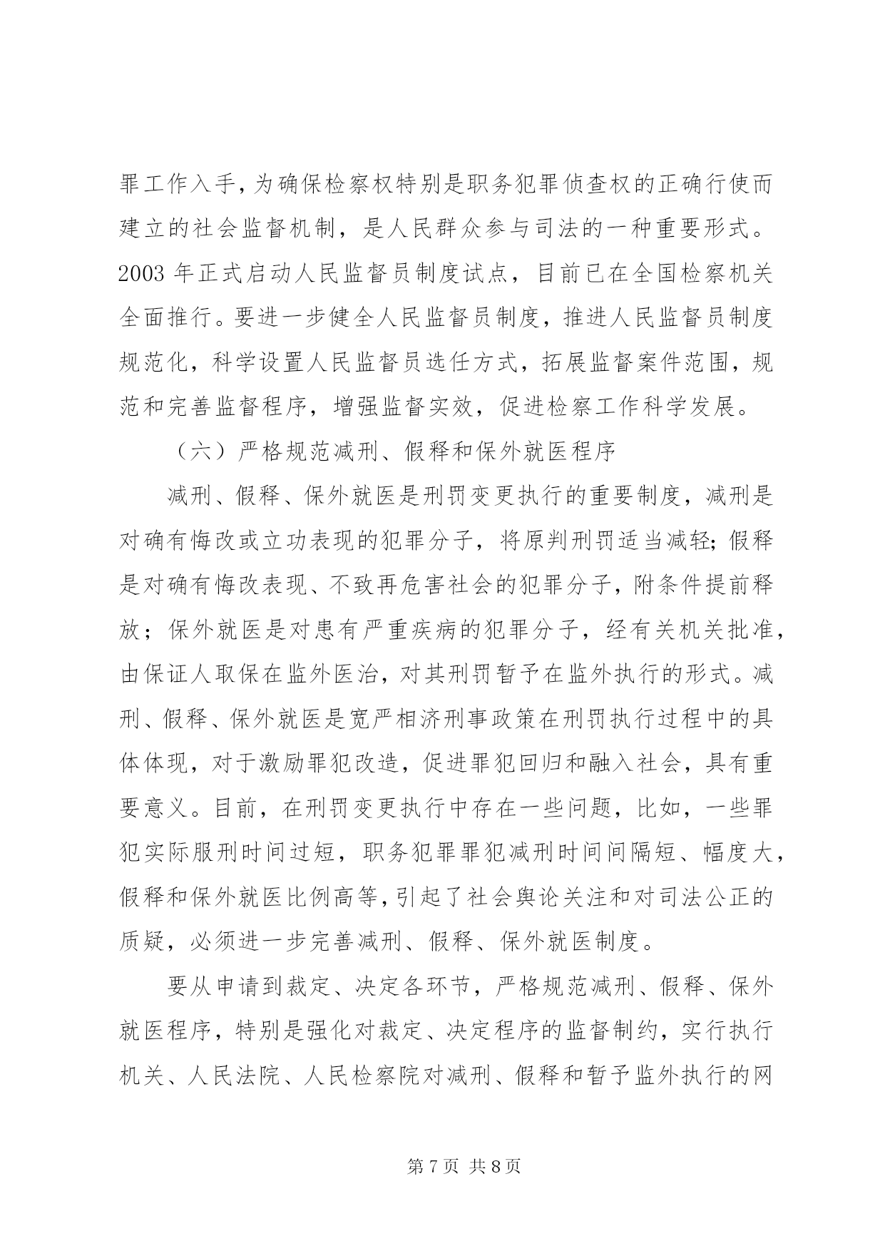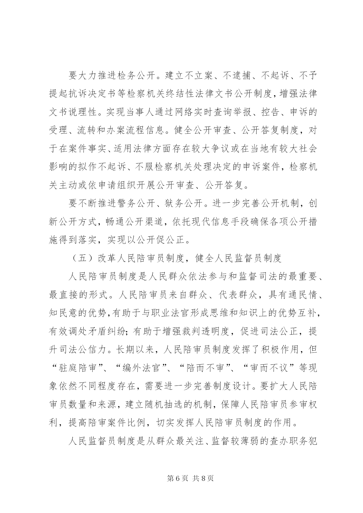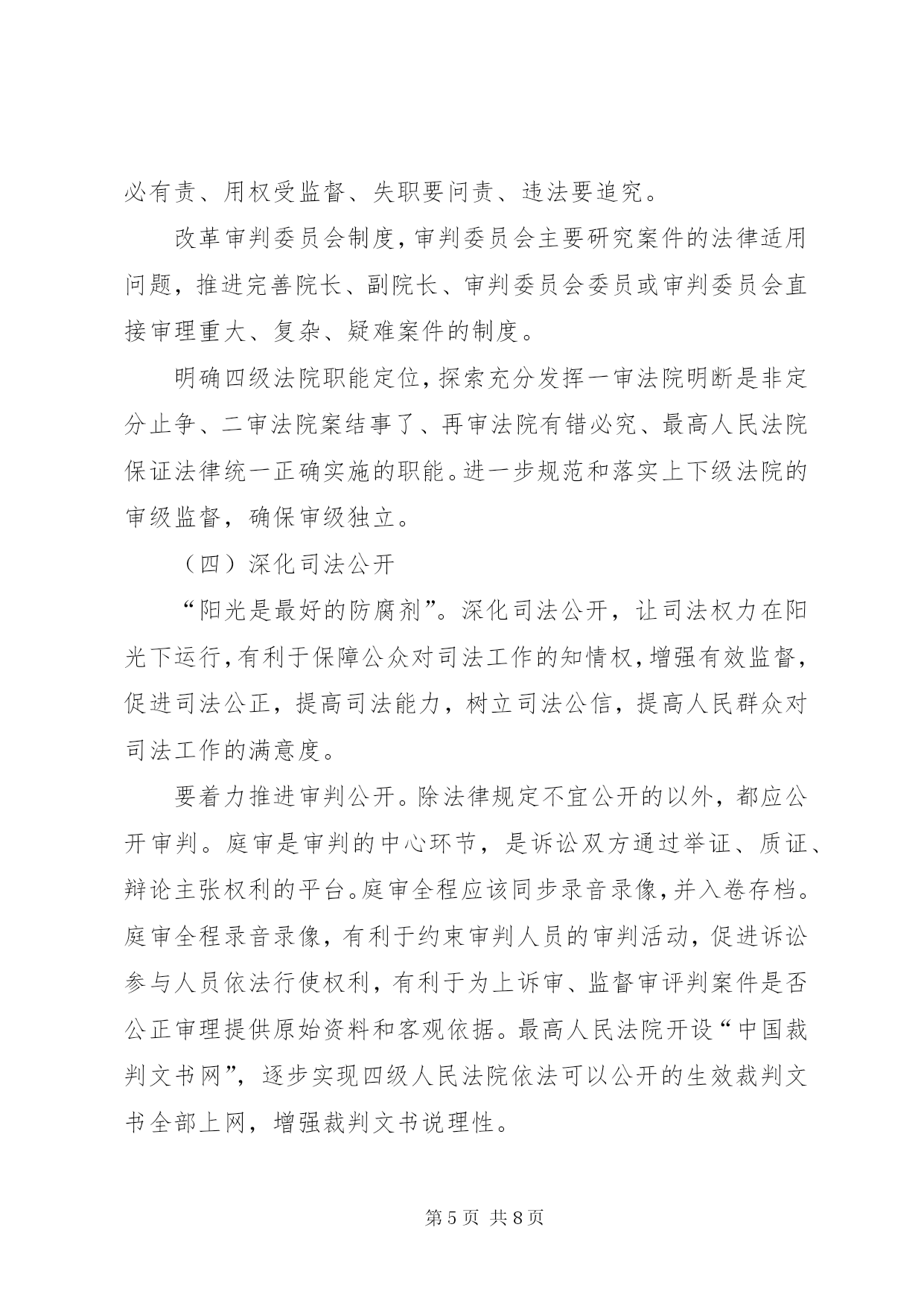 第PAGE\*Arabic\*MERGEFORMAT8页共NUMPAGES\*MERGEFORMAT8页聚焦司法体制改革[范文大全]深化司法体制改革孟建柱:准确把握深化司法体制改革的主要任务司法体制改革是一项长期而艰巨的任务。改革开放特别是党的十六大以来,我国稳步推进司法体制和工作机制改革,取得了阶段性重要成果,积累了宝贵经验。但是,与经济社会发展的形势相比,与民主法治的进步相比,与人民群众的司法需求相比,我国司法体制还存在一些不适应、不协调的问题。必须进一步深化司法体制改革,解决影响司法公正、制约司法能力的体制性、机制性、保障性障碍,立足现实,着眼长远,不断完善和发展中国特色社会主义司法制度,充分发挥社会主义司法制度的优越性。(一)确保人民法院、人民检察院依法独立公正行使审判权、检察权人民法院、人民检察院依法独立公正行使审判权、检察权,是宪法的明确规定,是保障国家法律统一正确实施的关键。近年来,社会上反映比较多的是司法机关的人财物受制于地方,司法活动易受地方保护主义的干扰,影响法制统一,损害司法权威。为此,《决定》特别指出,要确保审判机关、检察机关依法独立公正行使审判权、检察权。主要有两项内容:一是推动省以下地方法院、检察院人财物统一管理。我国是单一制国家,司法职权是中央事权。考虑到我国将长期处于社会主义初级阶段的基本国情,将司法机关的人财物完全由中央统一管理,尚有一定困难。应该本着循序渐进的原则,逐步改革司法管理体制,先将省以下地方人民法院、人民检察院人财物由省一级统一管理。地方各级人民法院、人民检察院和专门人民法院、人民检察院的经费由省级财政统筹,中央财政保障部分经费。二是探索与行政区划适当分离的司法管辖制度。司法管辖包括司法机关的地域管辖和案件管辖。司法机关按行政区划设立,管辖所属行政区划内的案件,容易受到地方保护主义的干扰。同时,我国地区间发展不平衡,各地司法机关承担的业务量也有较大差距,一些地方司法资源闲置。应该从现行宪法框架内着手,探索与行政区划适当分离的司法管辖制度。通过提级管辖、集中管辖,审理行政案件或者跨地区民商事、环境保护案件。(二)建立符合职业特点的司法人员管理制度我国在司法人员的招录、遴选、培养、任用等方面,实行与普通公务员相同的模式。我国80%的案件在基层,80%的司法人员也在基层,加之司法队伍人数较多,导致基层司法机关人多职数少,基层法官、检察官、人民警察职级低、待遇差、发展空间有限,不利于提升专业素质,不利于保证办案质量。为此,《决定》要求,建立符合职业特点的司法人员管理制度。主要有4项改革举措:一要推进司法人员分类管理改革。突出法官、检察官的办案主体地位,健全有别于普通公务员的法官、检察官专业职务(或技术职称)序列,完善执法勤务机构警员职务序列和警务技术职务序列,健全书记员、专业技术人员等司法辅助人员的管理制度,制定司法辅助人员的职数比例等配套措施,进一步提升司法队伍职业化水平。二要完善法官、检察官、人民警察选任招录制度。建立初任法官、检察官、人民警察统一招录、集中培训、基层任职、有序流动、逐级遴选的机制。建立预备法官、检察官训练制度,将完成预备法官、检察官职业训练并考核合格作为法官、检察官的法定任职条件。建立选拔律师、法律学者等专业法律人才担任法官、检察官的制度机制。针对不同审级法院的法官、不同级别检察院的检察官,设置不同的任职条件,实行法官、检察官逐级遴选制度。进一步改革人民警察招录培养制度,加大警察院校毕业生入警的比例。三要完善法官、检察官任免、惩戒制度。建立科学合理、客观公正的业绩评价体系和考核晋升机制。人民法院、人民检察院成立吸收社会有关人员参与的法官、检察官选任委员会、惩戒委员会,制定公开、公正的选任、惩戒程序,确保政治素质高、职业操守好、业务能力强的优秀法律人才进入法官、检察官队伍,确保法官、检察官的违法违纪行为及时得到应有惩戒。四要强化法官、检察官、人民警察的职业保障制度。从职业特点看,法官、检察官既要精通法律专业知识,又要有一定的工作经验和社会阅历,只有通过国家司法资格考试和公务员考试,并从事一段时间的法律工作,才能被任命;从职业风险看,当前我国正处于社会矛盾凸显期,矛盾的对抗性、敏感性增强,司法人员特别是人民警察的职业风险增大。现有的司法人员保障制度没有体现其职业特点和职业风险,不利于推动司法队伍的专业化、职业化、正规化建设。按照责权利相统一的原则,在严格司法人员任职条件,强化司法人员办案责任的同时,要为法官、检察官、人民警察依法公正履职提供必要的职业保障。(三)健全司法权力运行机制权责明晰的司法权力运行机制,是公正司法、高效司法、廉洁司法的必要保障。近年来,司法机关为完善司法权力运行机制,进行了许多积极探索,但一些地方仍不同程度存在司法行政化的问