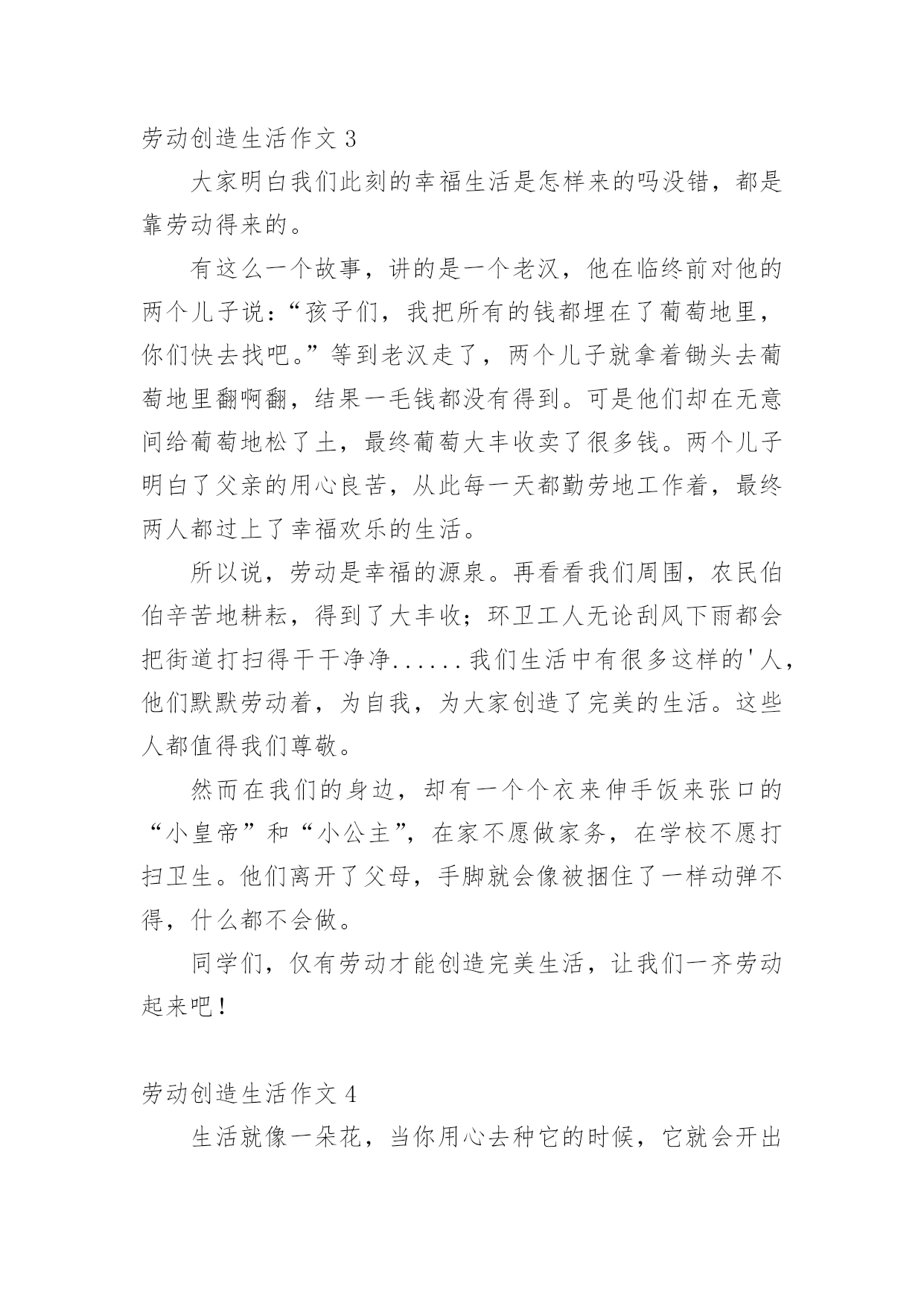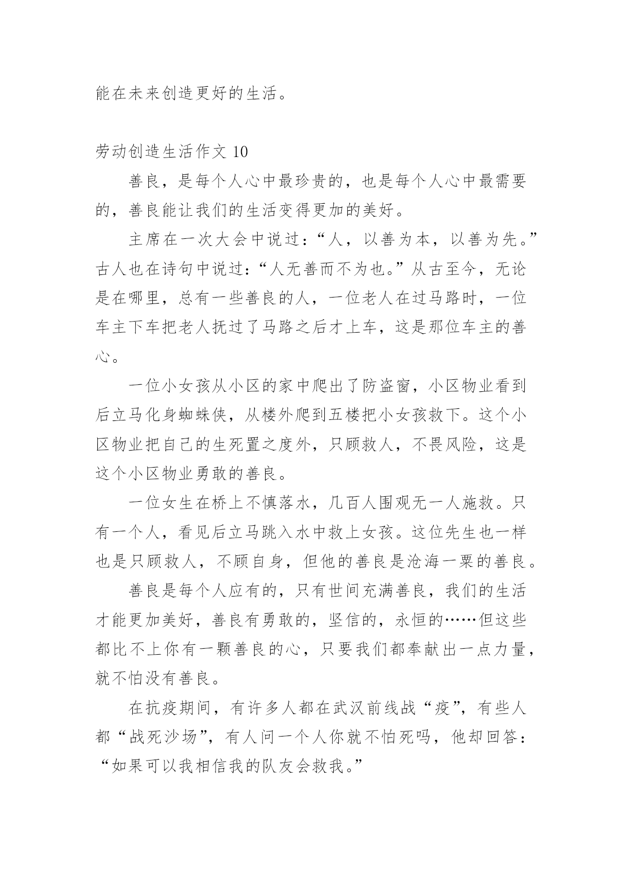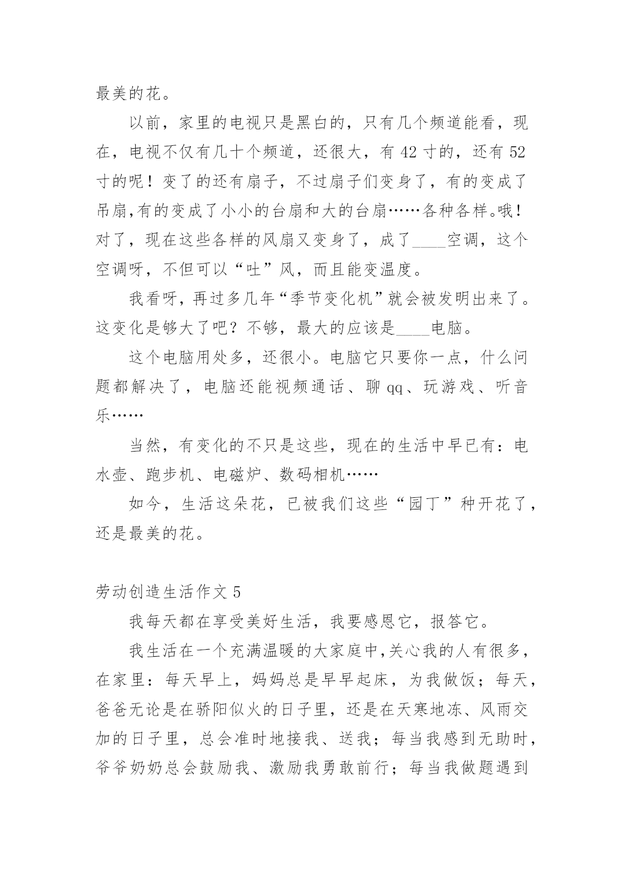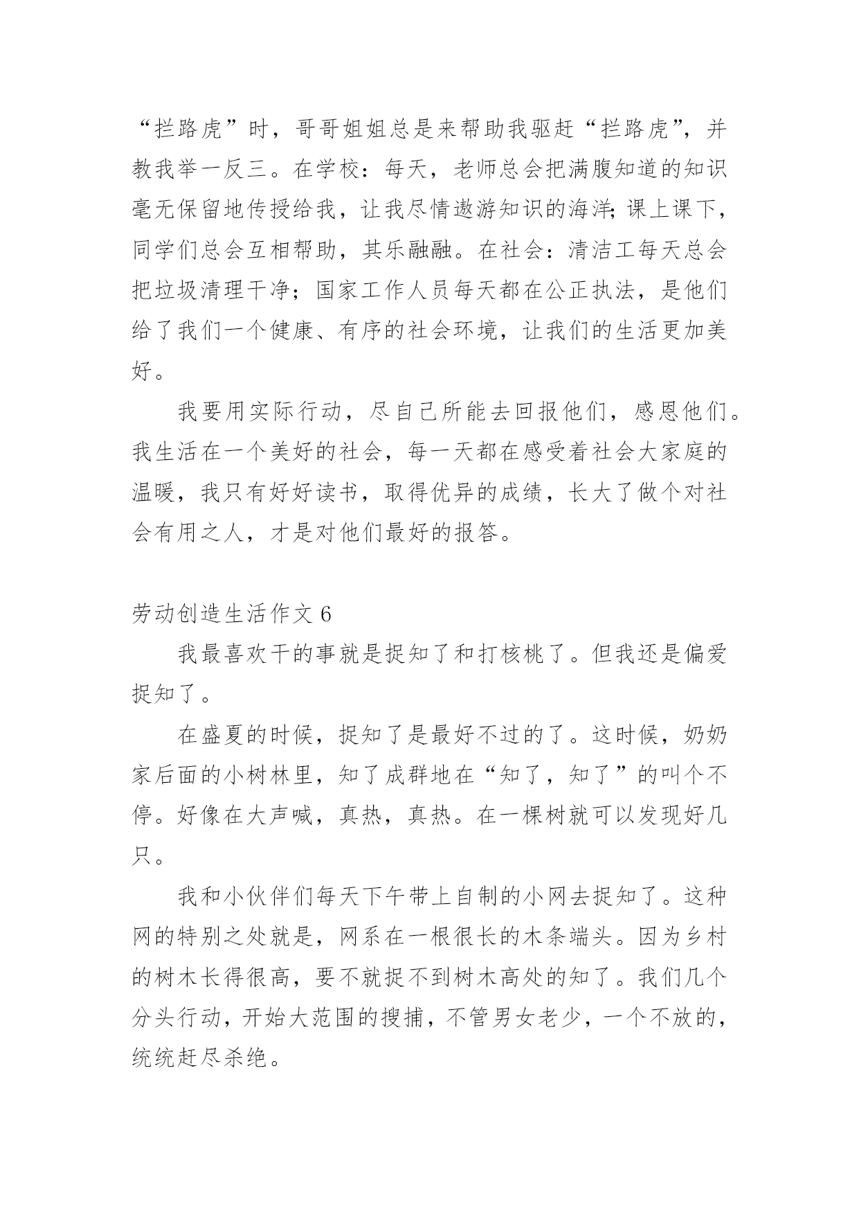 劳动创造生活作文劳动创造生活作文(汇编15篇)无论是身处学校还是步入社会,大家或多或少都会接触过作文吧,借助作文可以宣泄心中的情感,调节自己的心情。写起作文来就毫无头绪?以下是小编精心整理的劳动创造生活作文,欢迎大家借鉴与参考,希望对大家有所帮助。劳动创造生活作文1都说的生活是创造的,你也许会问为什么呢?你们肯定会想,为什么是劳动创造了美丽的生活呢?让我给大吧!现在,我每天一起床,透过玻璃窗往外一瞧,天气还阴沉沉的,有几个小点在动来动去,原来是正在劳动的老、老嘛,他们正在扫地呢,所以我们每天出门的时候,道路才会干干净净。还有我们的教室,每天早晨都有早来的值日生,等到全班都到齐了,教室已经被打扫得干干净净,当然,我也不例外,我是负责擦黑板的,我虽然不用早来,但是我也会把黑板擦得闪闪发光。劳动不仅创造了美丽生活,还创造了先进的。以前我们洗衣服都是用手洗,现在我们洗衣服用的却是快捷的洗衣机,以前我们学习都是靠自己,现在却有了网课,网络劳动了我们的生活,劳动创造了我们美丽的世界。我们再来看看农民伯伯的生活吧,农民伯伯每天很早的时候就要起床了,很晚才入睡,,他们忙着种田;他们忙着打理农田,不让野鸡祸害农田;,他们忙着收割各种菜、水稻等;,他们忙着把米、菜、水果等卖出去,农民伯伯们一直都很忙,所以,我们不能随意的浪费农民伯伯劳动的的成果,因为那是用心血换来的。我们的的生活是所有的劳动者用辛勤的劳动换来的,我们一定要好好。劳动创造生活作文2“幸福在哪里,他在辛勤的耕耘里……”,每次听到这句熟悉的歌曲,就让我想到劳动是幸福的种子,许多劳动场景纷纷浮现在我心中。记得一次学校大扫除,那一天同学们早早就到了学校如火如荼地干起来了。有的扫地,有的拖地,有的擦黑板……大家干的热火朝天。我们组负责擦东西,这可是个麻烦活,墙上,窗户上一群污渍。首先我准备了一些热水,把窗户打湿,然后把这些地方仔仔细细地擦了一遍。可有些总擦不掉,它们像是一张张嘲讽的脸,这就激起了我的斗志,在自己的努力下,终于把它们消灭了。科学家门捷列夫说过:“劳动创造一切,劳动者创造一切!”这干净整洁的教师就是我们劳动的结果。作为新一代的少先队员,我们要更加热爱劳动,为祖国美好的明天添光彩。劳动创造生活作文3大家明白我们此刻的幸福生活是怎样来的吗没错,都是靠劳动得来的。有这么一个故事,讲的是一个老汉,他在临终前对他的两个儿子说:“孩子们,我把所有的钱都埋在了葡萄地里,你们快去找吧。”等到老汉走了,两个儿子就拿着锄头去葡萄地里翻啊翻,结果一毛钱都没有得到。可是他们却在无意间给葡萄地松了土,最终葡萄大丰收卖了很多钱。两个儿子明白了父亲的用心良苦,从此每一天都勤劳地工作着,最终两人都过上了幸福欢乐的生活。所以说,劳动是幸福的源泉。再看看我们周围,农民伯伯辛苦地耕耘,得到了大丰收;环卫工人无论刮风下雨都会把街道打扫得干干净净......我们生活中有很多这样的'人,他们默默劳动着,为自我,为大家创造了完美的生活。这些人都值得我们尊敬。然而在我们的身边,却有一个个衣来伸手饭来张口的“小皇帝”和“小公主”,在家不愿做家务,在学校不愿打扫卫生。他们离开了父母,手脚就会像被捆住了一样动弹不得,什么都不会做。同学们,仅有劳动才能创造完美生活,让我们一齐劳动起来吧!劳动创造生活作文4生活就像一朵花,当你用心去种它的时候,它就会开出最美的花。以前,家里的电视只是黑白的,只有几个频道能看,现在,电视不仅有几十个频道,还很大,有42寸的,还有52寸的呢!变了的还有扇子,不过扇子们变身了,有的变成了吊扇,有的变成了小小的台扇和大的台扇……各种各样。哦!对了,现在这些各样的风扇又变身了,成了____空调,这个空调呀,不但可以“吐”风,而且能变温度。我看呀,再过多几年“季节变化机”就会被发明出来了。这变化是够大了吧?不够,最大的应该是____电脑。这个电脑用处多,还很小。电脑它只要你一点,什么问题都解决了,电脑还能视频通话、聊qq、玩游戏、听音乐……当然,有变化的不只是这些,现在的生活中早已有:电水壶、跑步机、电磁炉、数码相机……如今,生活这朵花,已被我们这些“园丁”种开花了,还是最美的花。劳动创造生活作文5我每天都在享受美好生活,我要感恩它,报答它。我生活在一个充满温暖的大家庭中,关心我的人有很多,在家里:每天早上,妈妈总是早早起床,为我做饭;每天,爸爸无论是在骄阳似火的日子里,还是在天寒地冻、风雨交加的日子里,总会准时地接我、送我;每当我感到无助时,爷爷奶奶总会鼓励我、激励我勇敢前行;每当我做题遇到“拦路虎”时,哥哥姐姐总是来帮助我驱赶“拦路虎”,并教我举一反三。在学校:每天,老师总会把满腹知道的知识毫无保留地传授给我,让我尽情遨游知识的海洋;课上课下,同学们总会互相帮助,其乐融融。在社会:清洁工每天总会把垃圾清理干