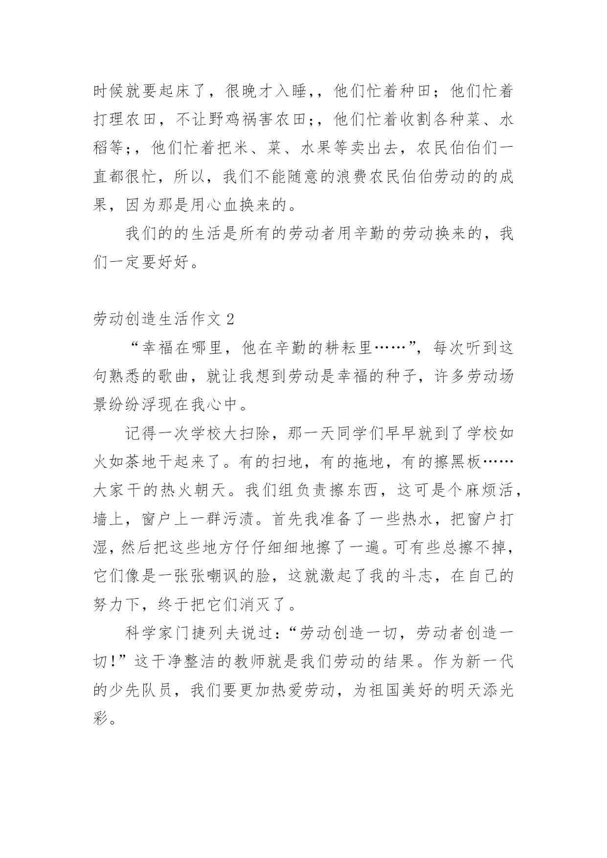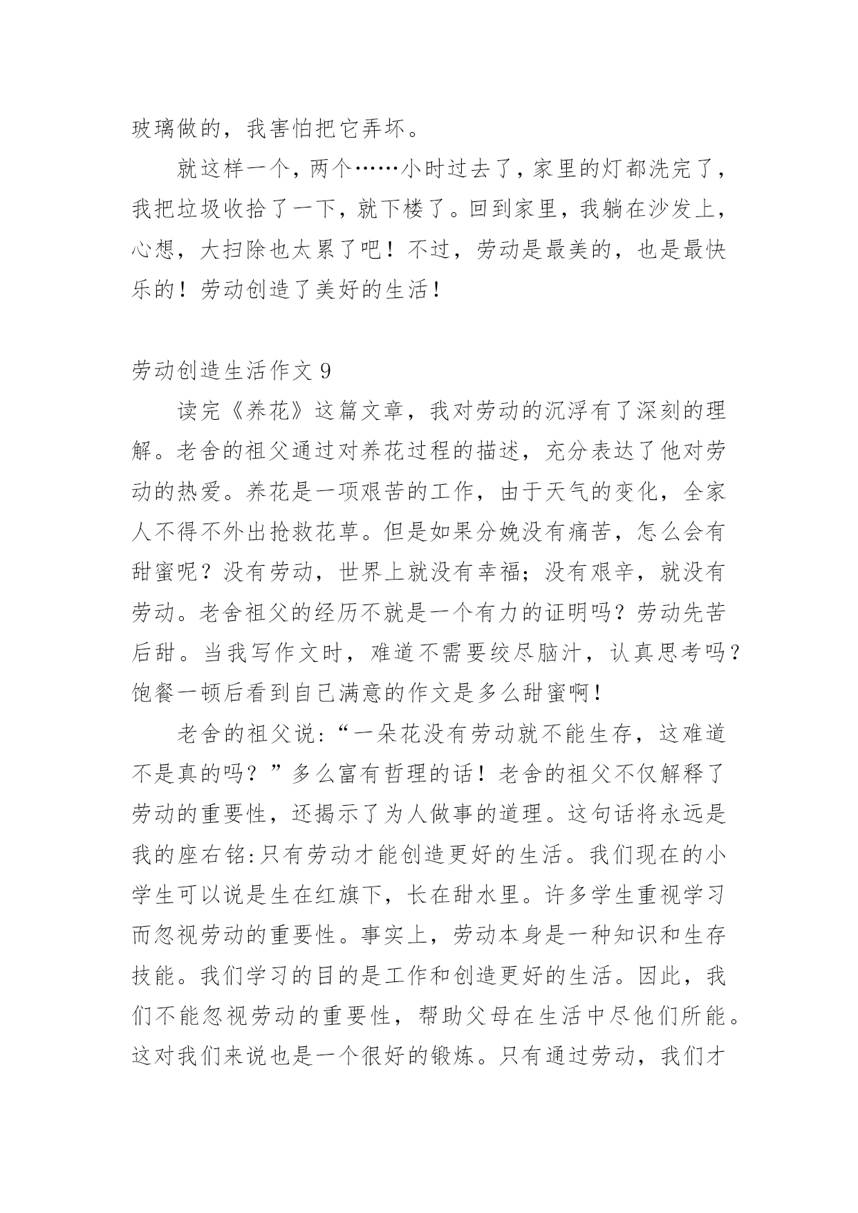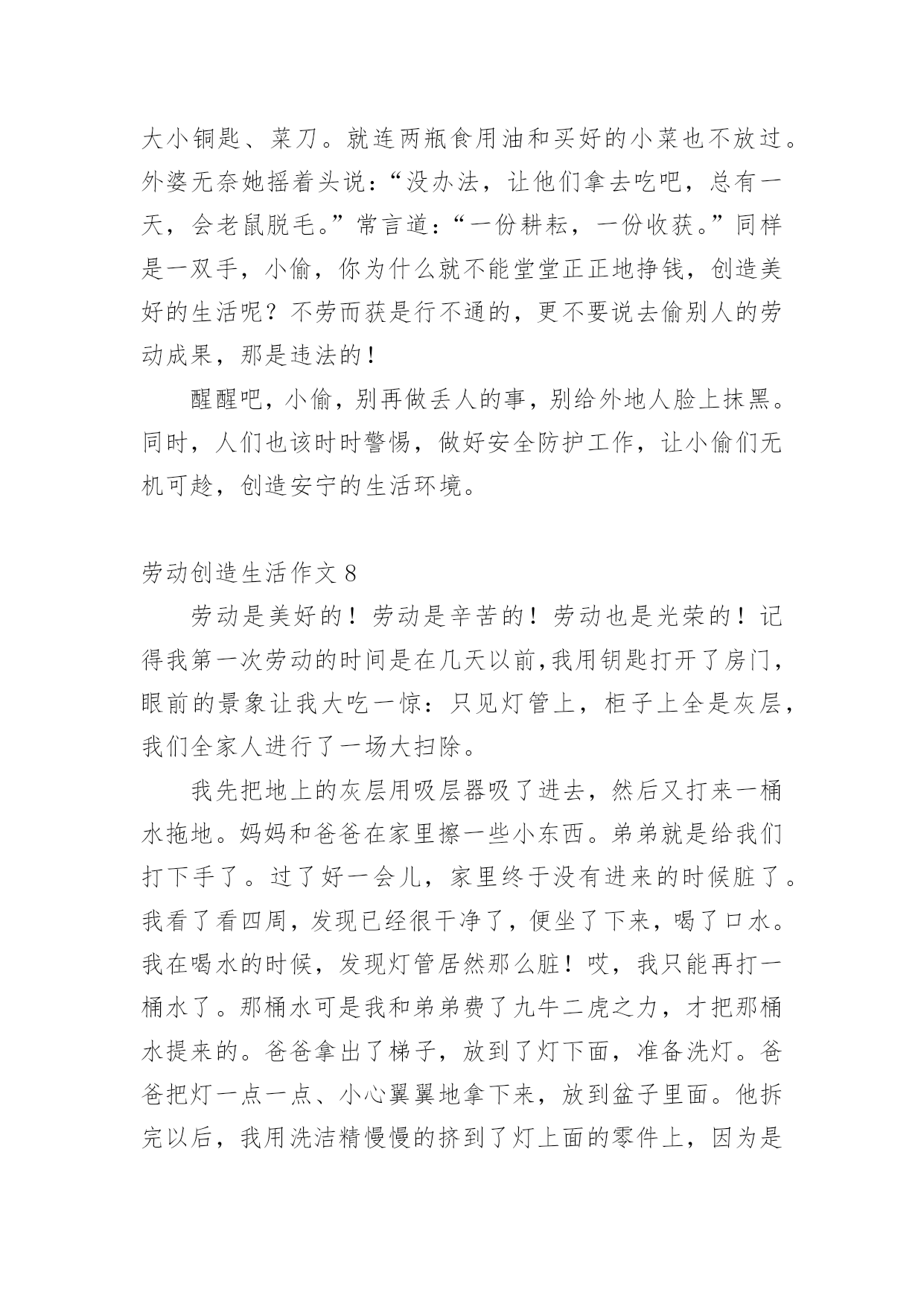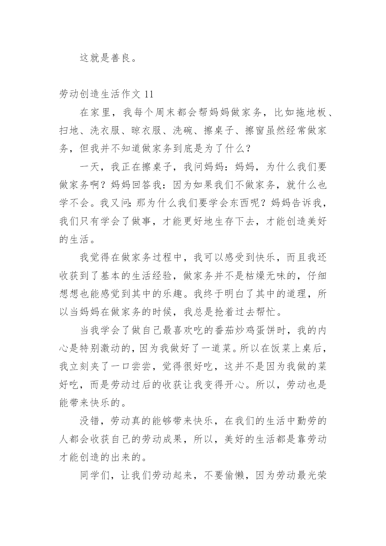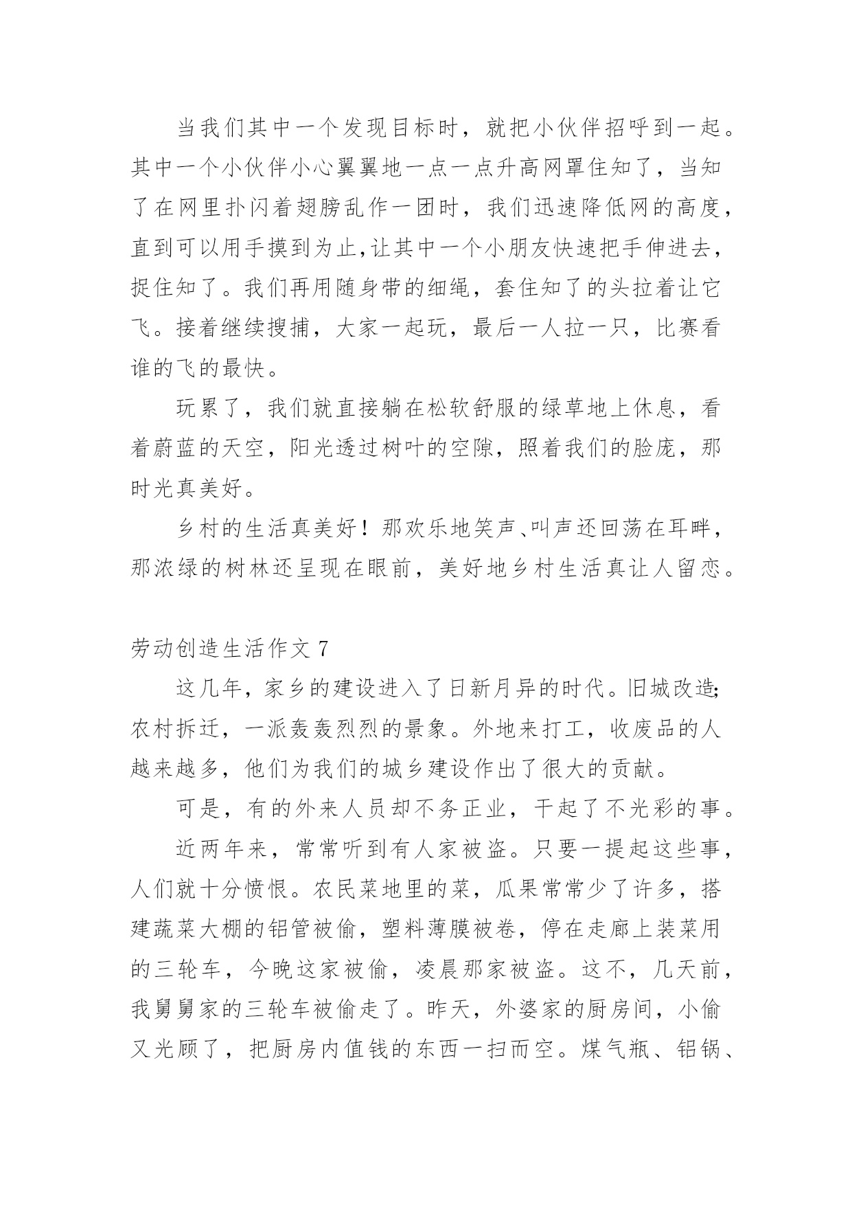 劳动创造生活作文劳动创造生活作文(汇编15篇)无论是身处学校还是步入社会,大家或多或少都会接触过作文吧,借助作文可以宣泄心中的情感,调节自己的心情。写起作文来就毫无头绪?以下是小编精心整理的劳动创造生活作文,欢迎大家借鉴与参考,希望对大家有所帮助。劳动创造生活作文1都说的生活是创造的,你也许会问为什么呢?你们肯定会想,为什么是劳动创造了美丽的生活呢?让我给大吧!现在,我每天一起床,透过玻璃窗往外一瞧,天气还阴沉沉的,有几个小点在动来动去,原来是正在劳动的老、老嘛,他们正在扫地呢,所以我们每天出门的时候,道路才会干干净净。还有我们的教室,每天早晨都有早来的值日生,等到全班都到齐了,教室已经被打扫得干干净净,当然,我也不例外,我是负责擦黑板的,我虽然不用早来,但是我也会把黑板擦得闪闪发光。劳动不仅创造了美丽生活,还创造了先进的。以前我们洗衣服都是用手洗,现在我们洗衣服用的却是快捷的洗衣机,以前我们学习都是靠自己,现在却有了网课,网络劳动了我们的生活,劳动创造了我们美丽的世界。我们再来看看农民伯伯的生活吧,农民伯伯每天很早的时候就要起床了,很晚才入睡,,他们忙着种田;他们忙着打理农田,不让野鸡祸害农田;,他们忙着收割各种菜、水稻等;,他们忙着把米、菜、水果等卖出去,农民伯伯们一直都很忙,所以,我们不能随意的浪费农民伯伯劳动的的成果,因为那是用心血换来的。我们的的生活是所有的劳动者用辛勤的劳动换来的,我们一定要好好。劳动创造生活作文2“幸福在哪里,他在辛勤的耕耘里……”,每次听到这句熟悉的歌曲,就让我想到劳动是幸福的种子,许多劳动场景纷纷浮现在我心中。记得一次学校大扫除,那一天同学们早早就到了学校如火如荼地干起来了。有的扫地,有的拖地,有的擦黑板……大家干的热火朝天。我们组负责擦东西,这可是个麻烦活,墙上,窗户上一群污渍。首先我准备了一些热水,把窗户打湿,然后把这些地方仔仔细细地擦了一遍。可有些总擦不掉,它们像是一张张嘲讽的脸,这就激起了我的斗志,在自己的努力下,终于把它们消灭了。科学家门捷列夫说过:“劳动创造一切,劳动者创造一切!”这干净整洁的教师就是我们劳动的结果。作为新一代的少先队员,我们要更加热爱劳动,为祖国美好的明天添光彩。劳动创造生活作文3大家明白我们此刻的幸福生活是怎样来的吗没错,都是靠劳动得来的。有这么一个故事,讲的是一个老汉,他在临终前对他的两个儿子说:“孩子们,我把所有的钱都埋在了葡萄地里,你们快去找吧。”等到老汉走了,两个儿子就拿着锄头去葡萄地里翻啊翻,结果一毛钱都没有得到。可是他们却在无意间给葡萄地松了土,最终葡萄大丰收卖了很多钱。两个儿子明白了父亲的用心良苦,从此每一天都勤劳地工作着,最终两人都过上了幸福欢乐的生活。所以说,劳动是幸福的源泉。再看看我们周围,农民伯伯辛苦地耕耘,得到了大丰收;环卫工人无论刮风下雨都会把街道打扫得干干净净......我们生活中有很多这样的'人,他们默默劳动着,为自我,为大家创造了完美的生活。这些人都值得我们尊敬。然而在我们的身边,却有一个个衣来伸手饭来张口的“小皇帝”和“小公主”,在家不愿做家务,在学校不愿打扫卫生。他们离开了父母,手脚就会像被捆住了一样动弹不得,什么都不会做。同学们,仅有劳动才能创造完美生活,让我们一齐劳动起来吧!劳动创造生活作文4生活就像一朵花,当你用心去种它的时候,它就会开出最美的花。以前,家里的电视只是黑白的,只有几个频道能看,现在,电视不仅有几十个频道,还很大,有42寸的,还有52寸的呢!变了的还有扇子,不过扇子们变身了,有的变成了吊扇,有的变成了小小的台扇和大的台扇……各种各样。哦!对了,现在这些各样的风扇又变身了,成了____空调,这个空调呀,不但可以“吐”风,而且能变温度。我看呀,再过多几年“季节变化机”就会被发明出来了。这变化是够大了吧?不够,最大的应该是____电脑。这个电脑用处多,还很小。电脑它只要你一点,什么问题都解决了,电脑还能视频通话、聊qq、玩游戏、听音乐……当然,有变化的不只是这些,现在的生活中早已有:电水壶、跑步机、电磁炉、数码相机……如今,生活这朵花,已被我们这些“园丁”种开花了,还是最美的花。劳动创造生活作文5我每天都在享受美好生活,我要感恩它,报答它。我生活在一个充满温暖的大家庭中,关心我的人有很多,在家里:每天早上,妈妈总是早早起床,为我做饭;每天,爸爸无论是在骄阳似火的日子里,还是在天寒地冻、风雨交加的日子里,总会准时地接我、送我;每当我感到无助时,爷爷奶奶总会鼓励我、激励我勇敢前行;每当我做题遇到“拦路虎”时,哥哥姐姐总是来帮助我驱赶“拦路虎”,并教我举一反三。在学校:每天,老师总会把满腹知道的知识毫无保留地传授给我,让我尽情遨游知识的海洋;课上课下,同学们总会互相帮助,其乐融融。在社会:清洁工每天总会把垃圾清理干