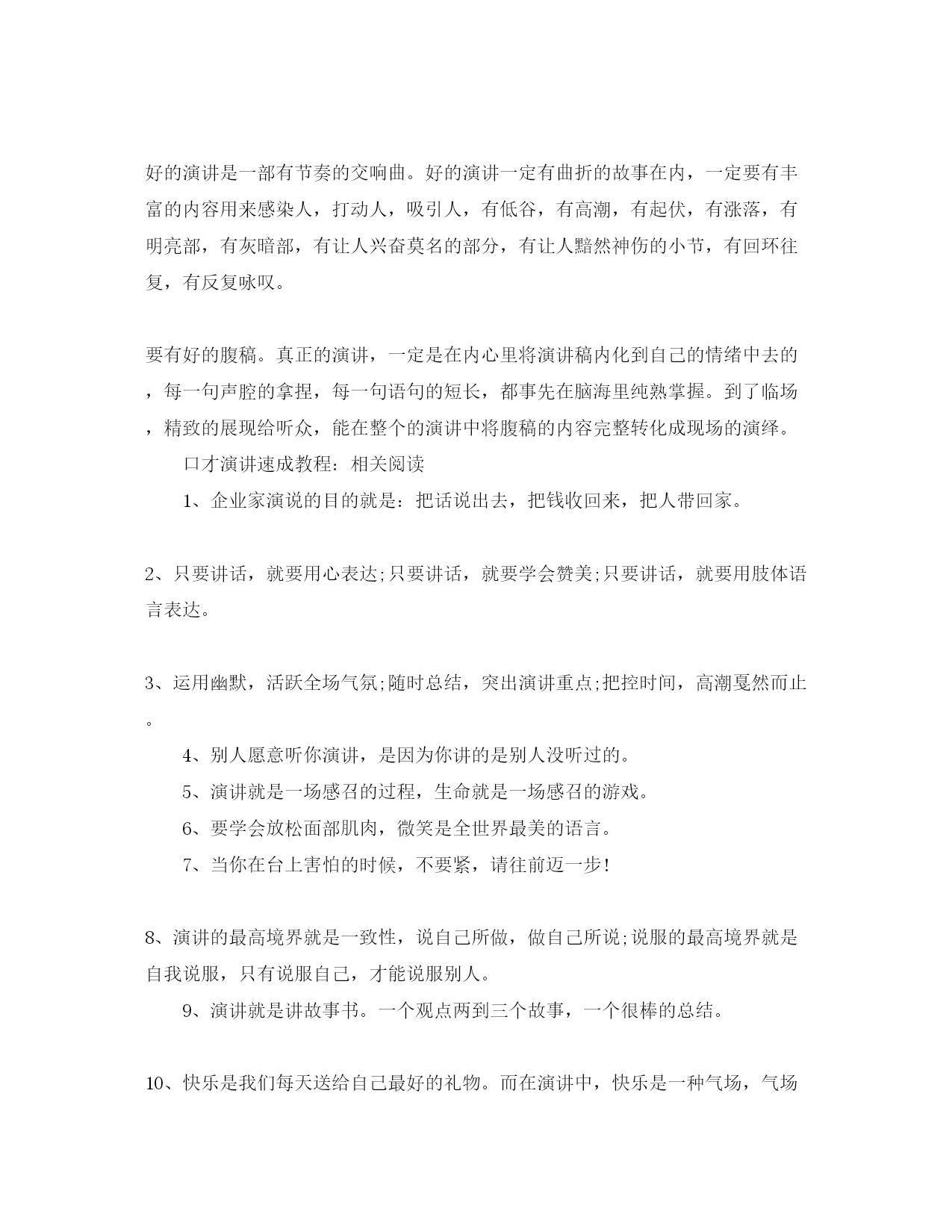 此资料由网络收集而来,如有侵权请告知上传者立即删除。资料共分享,我们负责传递知识。口才演讲速成教程演讲,在我的经验看来,已经不能算是一件简单的事情了,既需要”;讲”;,同时也需要”;演”;。二者之间,不可偏废。下面是小编整理的一些关于口才演讲速成教程的资料,供你参考。口才演讲速成教程:演讲经验演讲不是单纯的表演。演讲整个过程,纵然是有”;演”;的成份在内,但绝对不是演戏,一定要把自己的思想感情,融入到整个演讲过程中,要将自己纳入到自己的演讲词中,把自己声音高低、手足举动、面部表情都带上自己的思想,要把这些结合到你的演讲内容中去,要用真实的感情去引发台下听众的共鸣,要用真实的语言和声音打动人。演讲不是单纯的照本宣科。我本人就见过无数的演讲者,演讲之前,还拿着演讲稿在那里温习,到了演讲来临,时不时还要对着演讲稿看上一两眼,这种演讲,充其量算是讲课,按着正常的讲义去授业解惑当然可以,但不足以打动人。真正的演讲一定是脱稿的,是与环境相融合的,一定是与听众的思想情绪交融一起的,所以,好的演讲,绝不可以依赖讲稿。演讲是一门综合艺术。演讲是一件相对复杂的事情,每一次成功的演讲,都是将相关门类的艺术气质相结合的产物,是演讲者综合能力的一次展现,演讲结果的好坏,取决于演讲者对很多现场环境,对于自身气质的一次完美结合。演讲不是声嘶力竭的吼叫。要将自己的意图传递给听者,不是单靠喊叫可以实现的,不能把自己的内容通过非常小的声音就传递给受众的演讲者,绝对不是一个好的演讲者,你的内容是不是打动人,不在于声调的高低。好的演讲是一部有节奏的交响曲。好的演讲一定有曲折的故事在内,一定要有丰富的内容用来感染人,打动人,吸引人,有低谷,有高潮,有起伏,有涨落,有明亮部,有灰暗部,有让人兴奋莫名的部分,有让人黯然神伤的小节,有回环往复,有反复咏叹。要有好的腹稿。真正的演讲,一定是在内心里将演讲稿内化到自己的情绪中去的,每一句声腔的拿捏,每一句语句的短长,都事先在脑海里纯熟掌握。到了临场,精致的展现给听众,能在整个的演讲中将腹稿的内容完整转化成现场的演绎。口才演讲速成教程:相关阅读1、企业家演说的目的就是:把话说出去,把钱收回来,把人带回家。2、只要讲话,就要用心表达;只要讲话,就要学会赞美;只要讲话,就要用肢体语言表达。3、运用幽默,活跃全场气氛;随时总结,突出演讲重点;把控时间,高潮戛然而止。4、别人愿意听你演讲,是因为你讲的是别人没听过的。5、演讲就是一场感召的过程,生命就是一场感召的游戏。6、要学会放松面部肌肉,微笑是全世界最美的语言。7、当你在台上害怕的时候,不要紧,请往前迈一步!8、演讲的最高境界就是一致性,说自己所做,做自己所说;说服的最高境界就是自我说服,只有说服自己,才能说服别人。9、演讲就是讲故事书。一个观点两到三个故事,一个很棒的总结。10、快乐是我们每天送给自己最好的礼物。而在演讲中,快乐是一种气场,气场是一种战斗力,气场就是说服力。11、演讲是用问的。通过发问,才能与听众产生互动;通过发问,才能使听众产生思考;通过发问,才能产生头脑风暴。12、上场演说前,一定要做好体力、情绪、状态准备,演讲一定要准备充分。准备得越充分就会越自信,越自信就会越自然,越自然演讲就会越成功。成功来自于准备,一小时演讲,十小时准备。13、演讲的心态:撕下脸皮,丢在地上,踩三脚。丢脸才会赏脸,小范围的丢脸是为了大范围的赏脸。14.演说一定要有停顿。停顿,让听众有时间思考,让听众有参与感;停顿,使演讲变得抑扬顿挫,起承转合;停顿,道出了演讲者最大的心声。15.在演讲时,一定要注意和听众用眼神沟通,你的眼神会传情、会放电、会送秋天的菠菜。要和最认同你、态度最好、最配合你的人进行深度的眼神交流。16、演讲是信心的传递,不要讲连自己都不相信的内容;体力的说服,从头到尾要保持最好的状态;情绪的转移,自然流露真感情。17、动作创造情绪,手势增加力度。通过肢体动作打开心门,才能让更好的东西流入听众的心田。18、策略致胜,内容为王。演说要传递爱、信心和希望,演说要表达使命、愿景和目标。19、要明确演说的目的。公众演说是一对多的批发,是一种对众人有计划、有目的、有主题、有系统的思想传播。20、驰骋商海风云,笑傲春秋人生,掌握演说智慧,胜过百万雄兵。21、高潮结尾,为演说增色加分;令人难忘的结尾,会让听众期待你下一次演说。22、善用视听等辅助道具来加强效果,一场好的演讲,并不单纯停留在”;说”;上,而是需要音乐、灯光、视频等道具共同展现。23、大师只说家常话,真感情就是好文章。24、全世界最好的故事就是属于你的故事。自己的经历是演说最好的素材,自己的经历是一座宝藏,要好好发掘和利用。25、眼睛是心灵的窗户,演说是智慧的