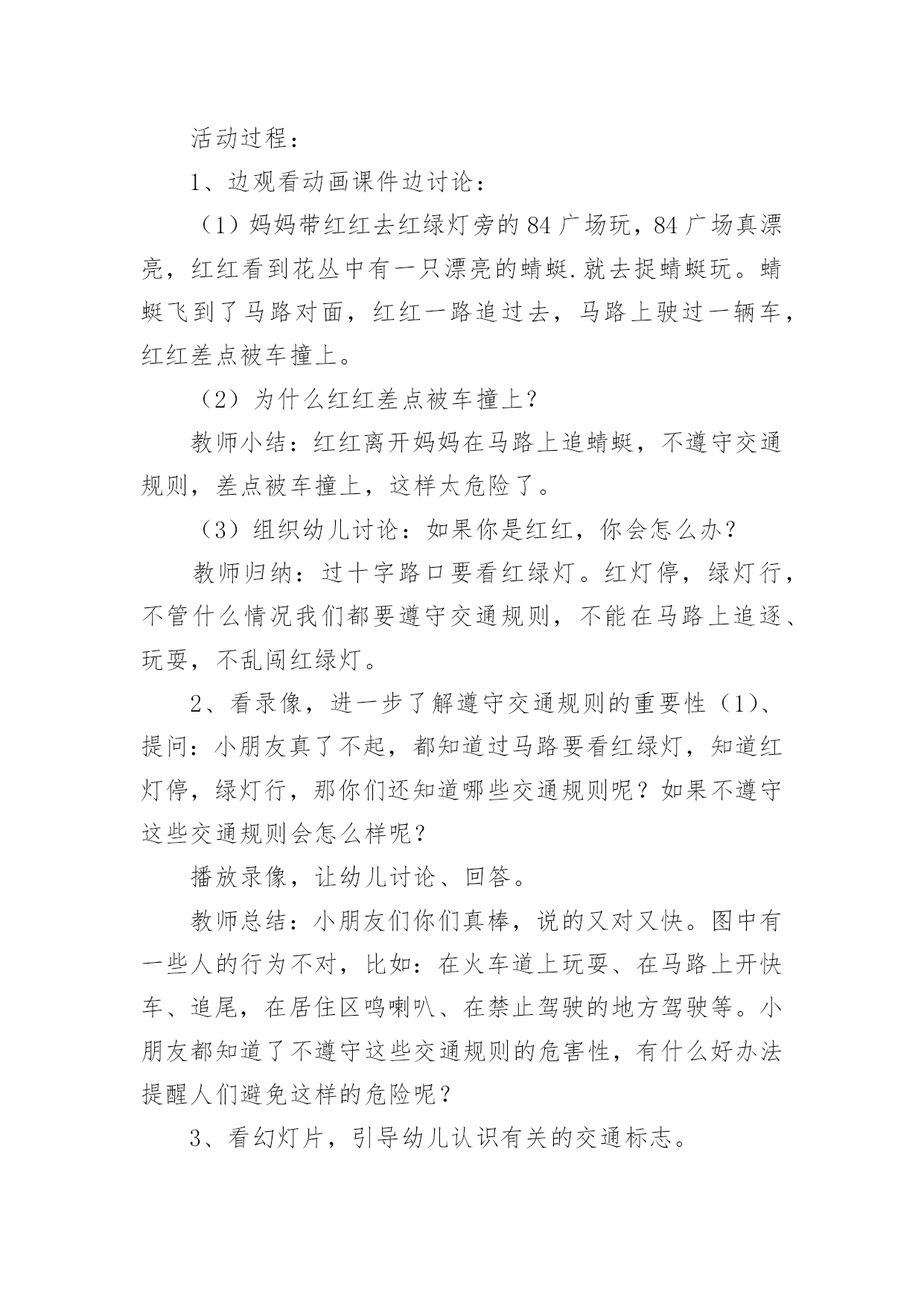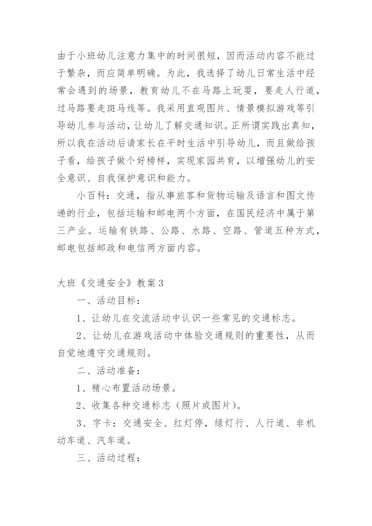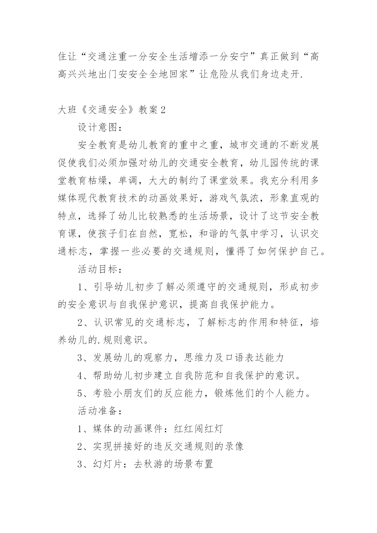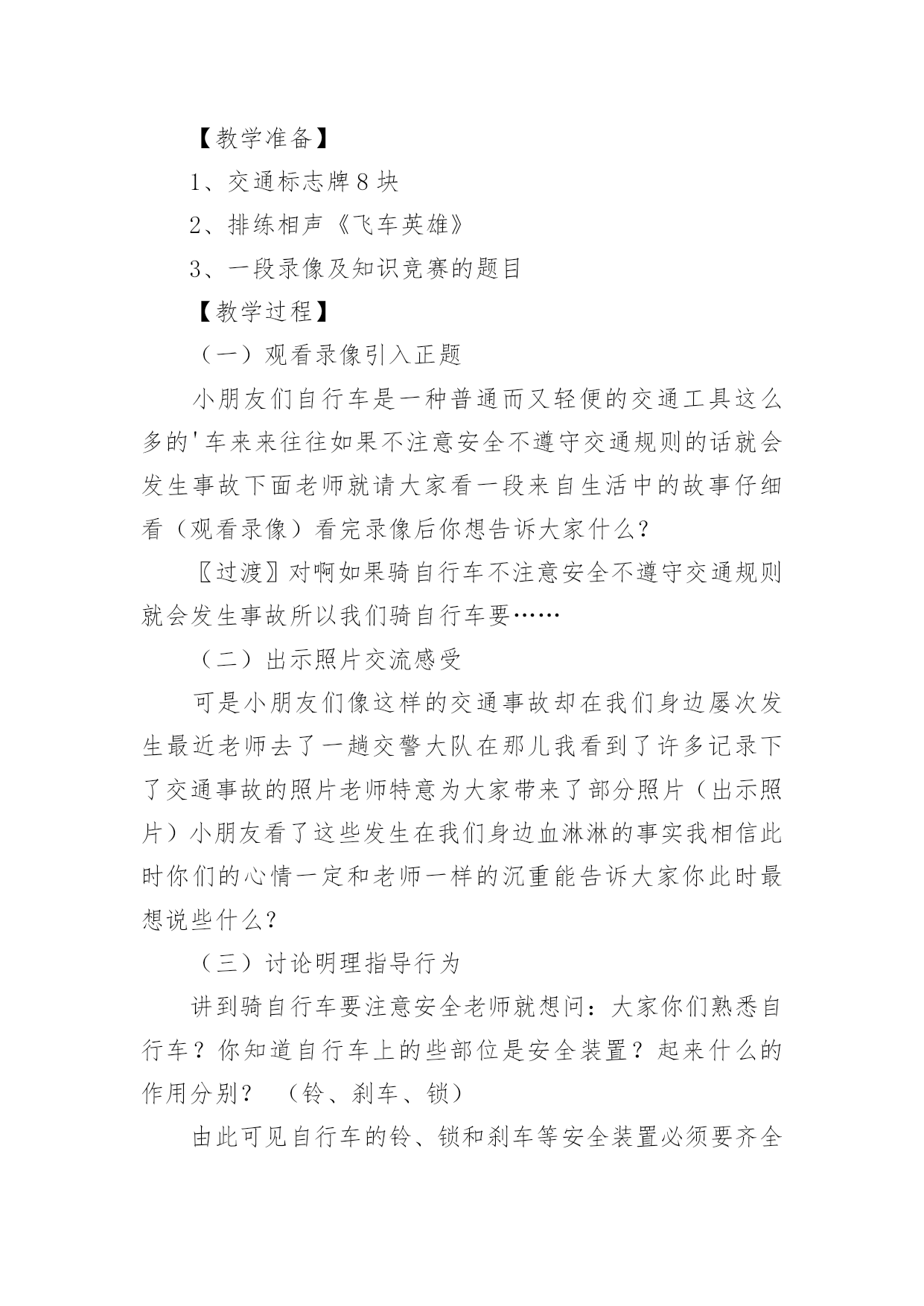 大班《交通安全》教案作为一名默默奉献的教育工作者,很有必要精心设计一份教案,编写教案有利于我们弄通教材内容,进而选择科学、恰当的教学方法。优秀的教案都具备一些什么特点呢?下面是小编收集整理的大班《交通安全》教案,仅供参考,大家一起来看看吧。大班《交通安全》教案1【教学目标】1、知识目标:识记必要的交通安全知识遵守交通规则确保交通安全2、能力目标:通过本次法制教育使学生认识标志牌的作用了解与他们生活密切相关的交通规则;明确遵守交通规则创设良好交通环境的重要性3、思想目标:使学生明白要全面建设小康社会需要加强对社会成员的交通法规教育共同创设良好的交通环境结合个人在实际生活中的所见所闻和亲身经历充分认识自觉遵守交通规则的重要性以及不遵守交通规则所带来的危害性增强安全意识【教学重点】小学生日常生活中常见的交通规则【教学难点】认识交通标志牌掌握其用途【教学准备】1、交通标志牌8块2、排练相声《飞车英雄》3、一段录像及知识竞赛的题目【教学过程】(一)观看录像引入正题小朋友们自行车是一种普通而又轻便的交通工具这么多的'车来来往往如果不注意安全不遵守交通规则的话就会发生事故下面老师就请大家看一段来自生活中的故事仔细看(观看录像)看完录像后你想告诉大家什么?〖过渡〗对啊如果骑自行车不注意安全不遵守交通规则就会发生事故所以我们骑自行车要……(二)出示照片交流感受可是小朋友们像这样的交通事故却在我们身边屡次发生最近老师去了一趟交警大队在那儿我看到了许多记录下了交通事故的照片老师特意为大家带来了部分照片(出示照片)小朋友看了这些发生在我们身边血淋淋的事实我相信此时你们的心情一定和老师一样的沉重能告诉大家你此时最想说些什么?(三)讨论明理指导行为讲到骑自行车要注意安全老师就想问:大家你们熟悉自行车?你知道自行车上的些部位是安全装置?起来什么的作用分别?(铃、刹车、锁)由此可见自行车的铃、锁和刹车等安全装置必须要齐全有效但是骑车时不懂或不遵守交通规则也是很容易发生事故请看这些同学是怎样骑车的?他们这样做对?为什么?是啊骑自行车时不准双手离把和撑伞骑车;不准搭肩并排和合骑一辆车;不准骑车追赶;不准攀扶机动车;不准快车道上行驶;不准骑车带人;不准超重、超长、超宽、超高带物……我们再完整地读一遍下面我们来听一段相声:《飞车英雄》听完相声后你们有什么想法?你们会骑自行车?你是几岁学会的?你在什么地方学会骑自行车的?其实我们国家法律规定不满十二周岁一律不准骑自行车因为自行车的构造是根据成年人设计的骑车人必须具有一定体力、智力和骑车技术还需要有一定的交通常识及分析、判断能力要遵守交通规则细心的同学会发现道路上除了交通警察以外还有许许多多忠于职守、永不下岗的“交通警”它们是谁呢?(出示交通标志)想和这些“交通警”交朋友?那就快快行动吧你都认识了些交通标志呢?学生介绍你们认识这些交通标志?谁来告诉大家?(四)学以致用演示训练我们认识了一些交通标志现在请位同学把这些交通标志分别贴在相对应的道路上请大家接着看[在道路两端分别再加上家、工厂、自行车](生演示)你学得可真不赖自行车的确应该在慢车道上靠右行驶为了使小朋友们更好地遵守交通规则老师送大家一首儿歌《自行车安全行》一齐来读一读刚才小朋友们读得还比较流利但是没有把一些重点强调出来下面就请小朋友根据老师给你圈出来的重点再读一遍(五)知识竞赛情感升华接下来我们看一段录像请同学们说说这样做对不对?小朋友们观察得很仔细判断得也很正确我们来进行交通安全知识竞赛来考考大家这个知识掌握得怎样?你们说好不好?为了把这次竞赛搞好我建议大家分成红黄队这边四组组成红队这边四组组成黄队如果答对一组得十分答错扣十分不答不给分要是同队可以相互补充和纠正还有如果你有比对方更好更深的见解的话我也给你加十分老师请你们两位当红队的计分员请你们两位当黄队的计分员好比赛就要开始了请同学们做好准备抢答题、必答题请红队各选一名代表完成1、2两小题请黄队回答3、4两小题第2题也就是最后一题抢答题下列交通标志?准备好公布比赛结果为了让安全时刻围绕着我们就让我们把安全知识、标语记下来时刻提醒自己和我们身边的人拿起你的笔动手写一写吧(学生写安全警示句、安全宣传语)(六)总结:通过学习我们认识了许多常用的交通标志熟悉了与行人有关的交通法规老师希望同学们今后将交通规则牢牢记住让“交通注重一分安全生活增添一分安宁”真正做到“高高兴兴地出门安安全全地回家”让危险从我们身边走开.大班《交通安全》教案2设计意图:安全教育是幼儿教育的重中之重,城市交通的不断发展促使我们必须加强对幼儿的交通安全教育,幼儿园传统的课堂教育枯燥,单调,大大的制约了课堂效果。我充分利用多媒体现代教育技术的动画效果好,游戏气氛浓,形象直观的特点,选择了幼儿比较熟悉的生活场景,设计了这节安全教育课,使孩子们在自