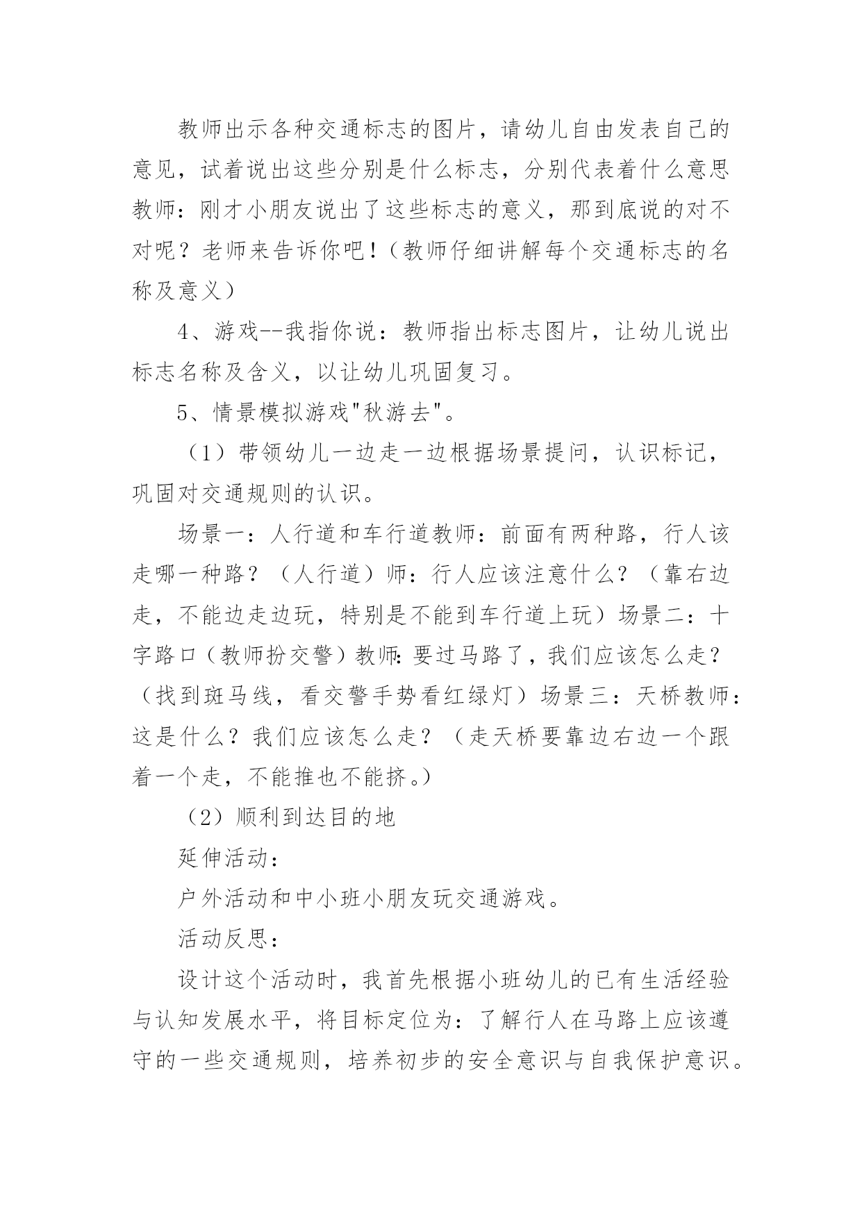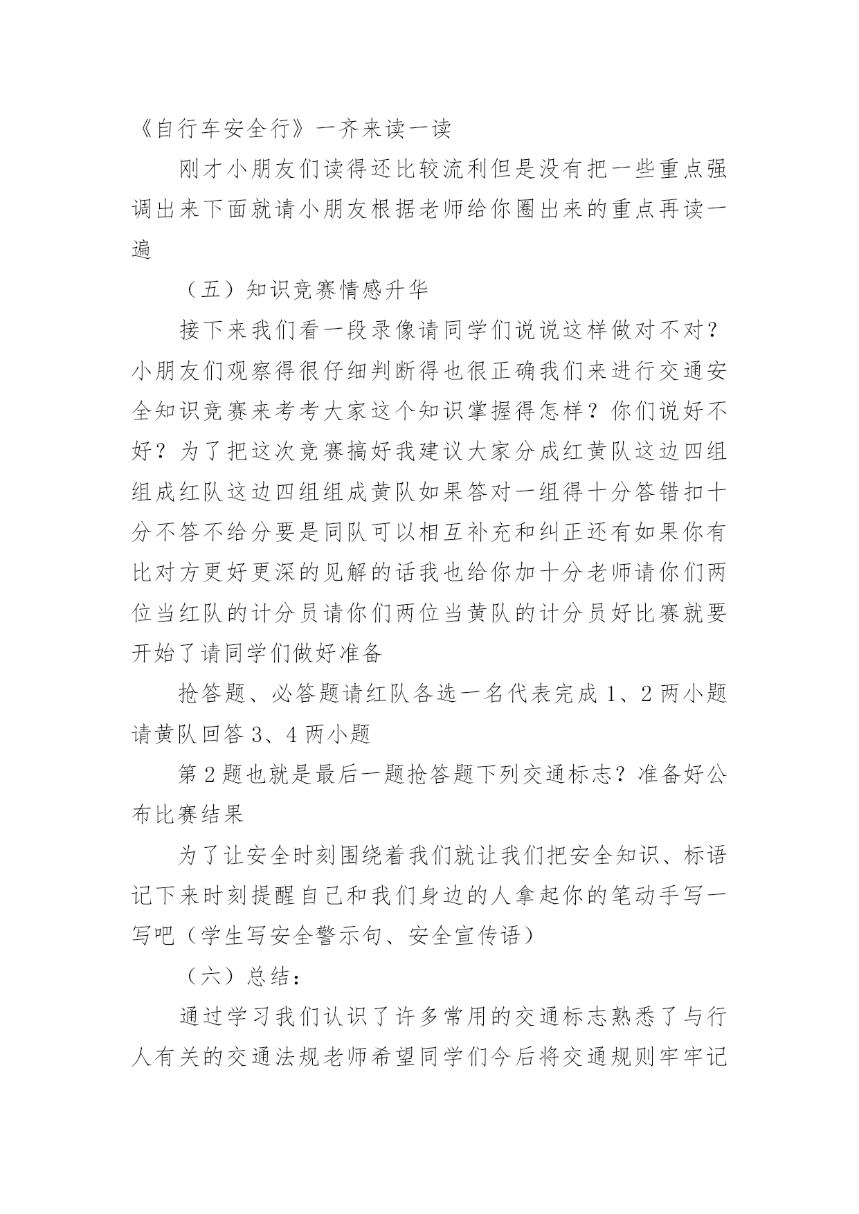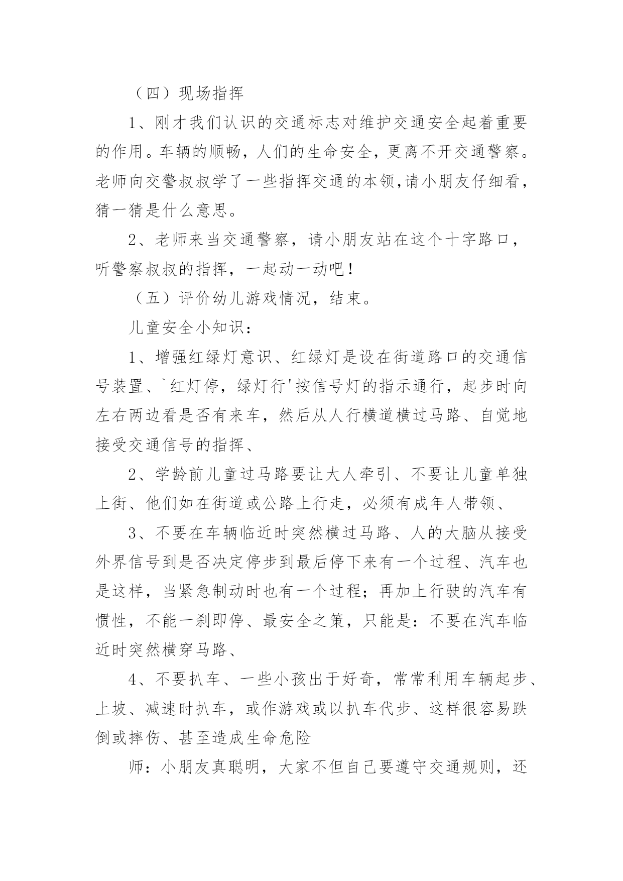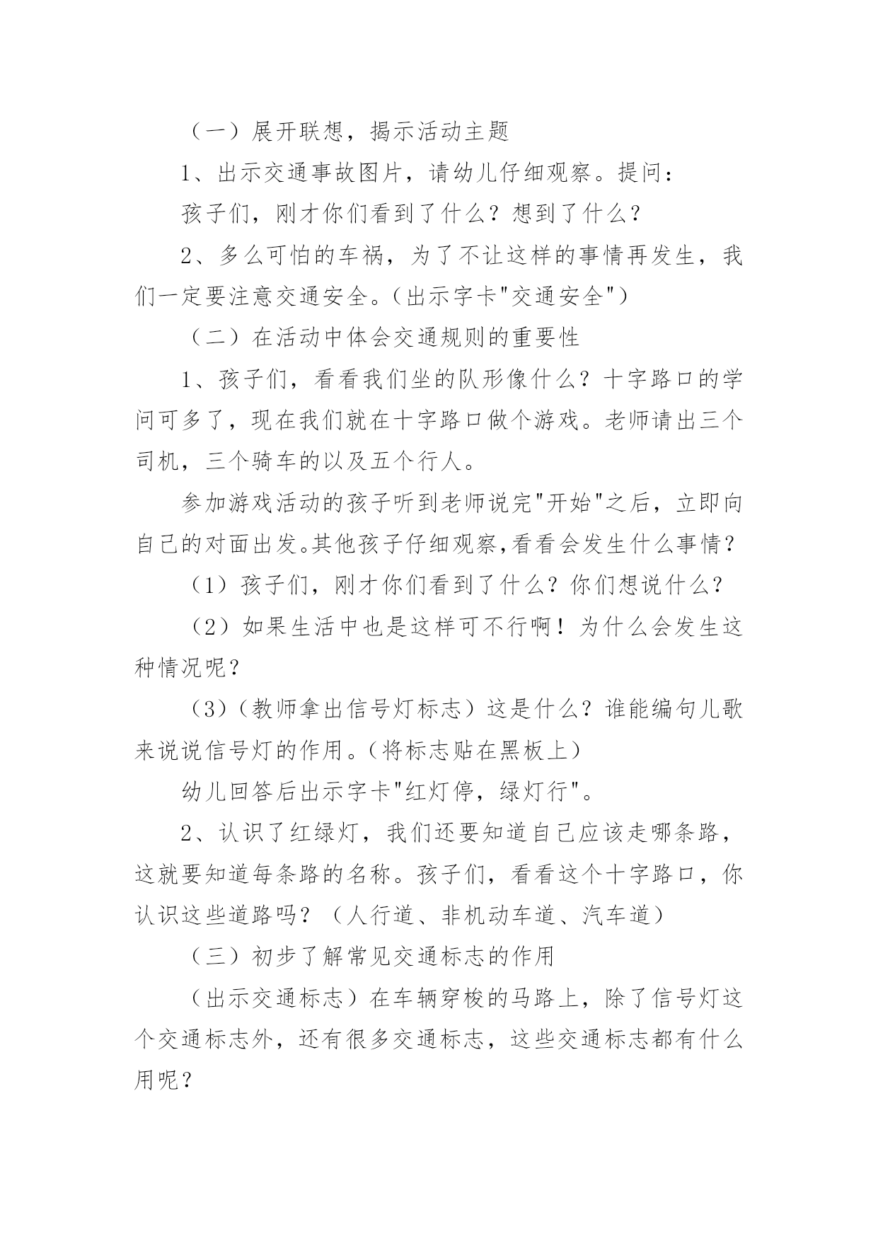 大班《交通安全》教案作为一名默默奉献的教育工作者,很有必要精心设计一份教案,编写教案有利于我们弄通教材内容,进而选择科学、恰当的教学方法。优秀的教案都具备一些什么特点呢?下面是小编收集整理的大班《交通安全》教案,仅供参考,大家一起来看看吧。大班《交通安全》教案1【教学目标】1、知识目标:识记必要的交通安全知识遵守交通规则确保交通安全2、能力目标:通过本次法制教育使学生认识标志牌的作用了解与他们生活密切相关的交通规则;明确遵守交通规则创设良好交通环境的重要性3、思想目标:使学生明白要全面建设小康社会需要加强对社会成员的交通法规教育共同创设良好的交通环境结合个人在实际生活中的所见所闻和亲身经历充分认识自觉遵守交通规则的重要性以及不遵守交通规则所带来的危害性增强安全意识【教学重点】小学生日常生活中常见的交通规则【教学难点】认识交通标志牌掌握其用途【教学准备】1、交通标志牌8块2、排练相声《飞车英雄》3、一段录像及知识竞赛的题目【教学过程】(一)观看录像引入正题小朋友们自行车是一种普通而又轻便的交通工具这么多的'车来来往往如果不注意安全不遵守交通规则的话就会发生事故下面老师就请大家看一段来自生活中的故事仔细看(观看录像)看完录像后你想告诉大家什么?〖过渡〗对啊如果骑自行车不注意安全不遵守交通规则就会发生事故所以我们骑自行车要……(二)出示照片交流感受可是小朋友们像这样的交通事故却在我们身边屡次发生最近老师去了一趟交警大队在那儿我看到了许多记录下了交通事故的照片老师特意为大家带来了部分照片(出示照片)小朋友看了这些发生在我们身边血淋淋的事实我相信此时你们的心情一定和老师一样的沉重能告诉大家你此时最想说些什么?(三)讨论明理指导行为讲到骑自行车要注意安全老师就想问:大家你们熟悉自行车?你知道自行车上的些部位是安全装置?起来什么的作用分别?(铃、刹车、锁)由此可见自行车的铃、锁和刹车等安全装置必须要齐全有效但是骑车时不懂或不遵守交通规则也是很容易发生事故请看这些同学是怎样骑车的?他们这样做对?为什么?是啊骑自行车时不准双手离把和撑伞骑车;不准搭肩并排和合骑一辆车;不准骑车追赶;不准攀扶机动车;不准快车道上行驶;不准骑车带人;不准超重、超长、超宽、超高带物……我们再完整地读一遍下面我们来听一段相声:《飞车英雄》听完相声后你们有什么想法?你们会骑自行车?你是几岁学会的?你在什么地方学会骑自行车的?其实我们国家法律规定不满十二周岁一律不准骑自行车因为自行车的构造是根据成年人设计的骑车人必须具有一定体力、智力和骑车技术还需要有一定的交通常识及分析、判断能力要遵守交通规则细心的同学会发现道路上除了交通警察以外还有许许多多忠于职守、永不下岗的“交通警”它们是谁呢?(出示交通标志)想和这些“交通警”交朋友?那就快快行动吧你都认识了些交通标志呢?学生介绍你们认识这些交通标志?谁来告诉大家?(四)学以致用演示训练我们认识了一些交通标志现在请位同学把这些交通标志分别贴在相对应的道路上请大家接着看[在道路两端分别再加上家、工厂、自行车](生演示)你学得可真不赖自行车的确应该在慢车道上靠右行驶为了使小朋友们更好地遵守交通规则老师送大家一首儿歌《自行车安全行》一齐来读一读刚才小朋友们读得还比较流利但是没有把一些重点强调出来下面就请小朋友根据老师给你圈出来的重点再读一遍(五)知识竞赛情感升华接下来我们看一段录像请同学们说说这样做对不对?小朋友们观察得很仔细判断得也很正确我们来进行交通安全知识竞赛来考考大家这个知识掌握得怎样?你们说好不好?为了把这次竞赛搞好我建议大家分成红黄队这边四组组成红队这边四组组成黄队如果答对一组得十分答错扣十分不答不给分要是同队可以相互补充和纠正还有如果你有比对方更好更深的见解的话我也给你加十分老师请你们两位当红队的计分员请你们两位当黄队的计分员好比赛就要开始了请同学们做好准备抢答题、必答题请红队各选一名代表完成1、2两小题请黄队回答3、4两小题第2题也就是最后一题抢答题下列交通标志?准备好公布比赛结果为了让安全时刻围绕着我们就让我们把安全知识、标语记下来时刻提醒自己和我们身边的人拿起你的笔动手写一写吧(学生写安全警示句、安全宣传语)(六)总结:通过学习我们认识了许多常用的交通标志熟悉了与行人有关的交通法规老师希望同学们今后将交通规则牢牢记住让“交通注重一分安全生活增添一分安宁”真正做到“高高兴兴地出门安安全全地回家”让危险从我们身边走开.大班《交通安全》教案2设计意图:安全教育是幼儿教育的重中之重,城市交通的不断发展促使我们必须加强对幼儿的交通安全教育,幼儿园传统的课堂教育枯燥,单调,大大的制约了课堂效果。我充分利用多媒体现代教育技术的动画效果好,游戏气氛浓,形象直观的特点,选择了幼儿比较熟悉的生活场景,设计了这节安全教育课,使孩子们在自