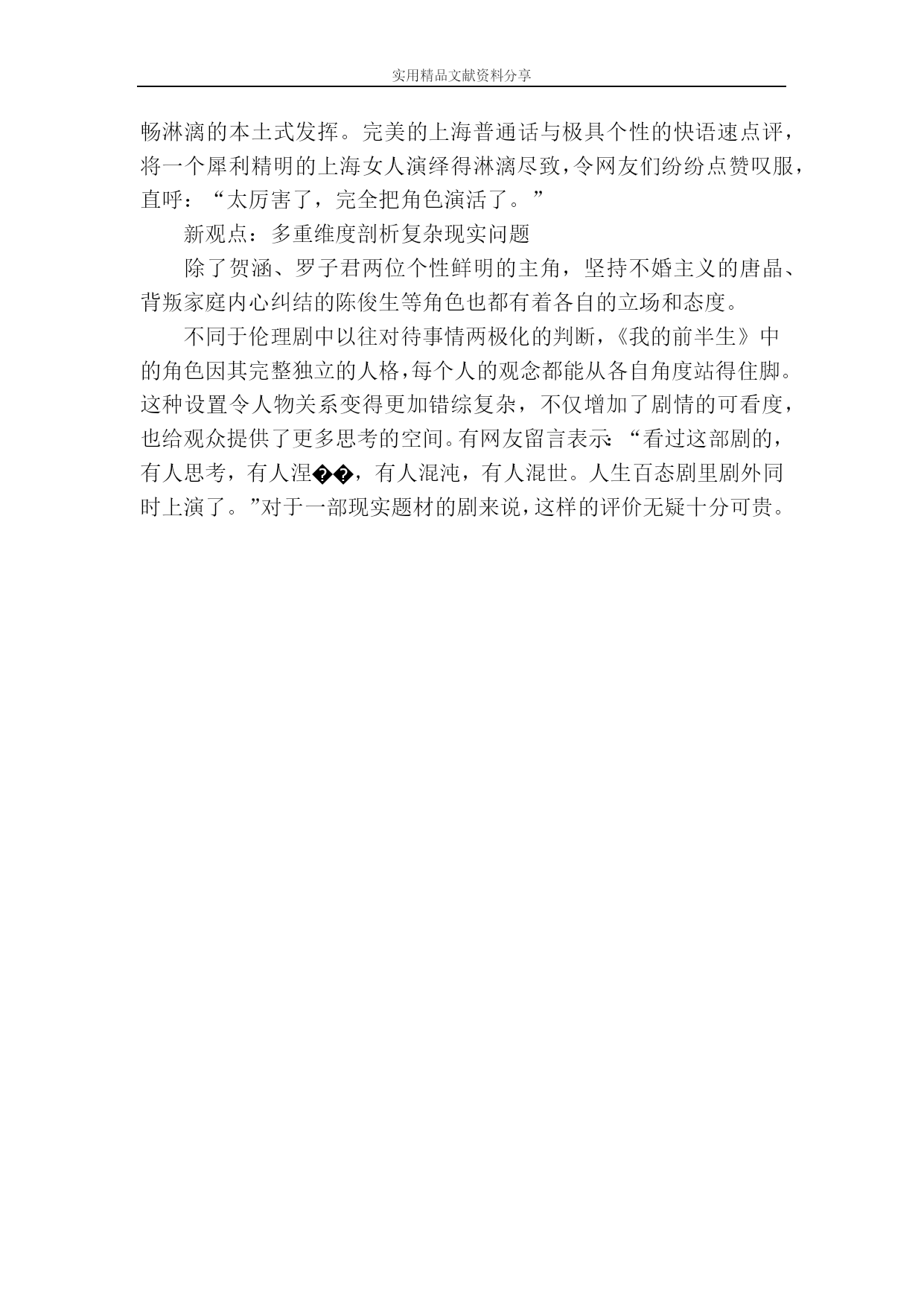 实用精品文献资料分享“三新理论”成就《我的前半生》“三新理论”成就《我的前半生》凭借紧凑现实的剧情和无处不在的犀利金句,《我的前半生》在东方卫视首播后成绩斐然,播出第二天收视成绩就一举破1,当晚收视率达1.054,单集最高收视率1.188,同时段排名省级卫视全国第一。而在极具公信力的评分网站豆瓣上,该剧的评分也得到了国产剧中罕见的8分,成为了暑期档现实题材国产剧中一匹亮眼的黑马。新视角:打破现实题材国产剧伦理硬梗以往,提到现实主义题材国产剧,婆媳关系和男女主人公的情感纠葛往往是剧情中迈不过去的硬梗。这类以伦理梗为主要卖点的剧通常凭借狗血的剧情吸引观众,很难引发观众对于现实的思考。而《我的前半生》尽管是以女主角罗子君遭遇离婚为开端,但之后聚焦的却是她面对新人生在感情和职场方面的蜕变。通过展现罗子君从人生低谷逆袭开启属于自己人生新篇章的过程,该剧倡导女性独立的观点呼之欲出。对于越来越多在婚姻和职场间迷茫徘徊的都市女性来说,《我的前半生》无疑称得上是一部具有指导性意义的良心好剧。新演技:靳东、马伊P突破自我演活角色在观众以往的印象中,靳东一直是温文尔雅的“儒雅男”代表。《伪装者》中的明楼对家人体贴照顾细致入微,《琅琊榜》中的蔺晨个性潇洒脾气极好,《欢乐颂》中的谭宗明更是大气稳重。然而在《我的前半生》中,靳东却一改往日的儒雅风范,不仅信奉利益至上的职场原则,更开启了犀利的怼人模式。面对马伊P饰演的罗子君,靳东饰演的贺涵从一开始就没给对方好脸色。每当罗子君发表与自己观点不和的言论时,贺涵总会毫不留情地用犀利语言回敬对方。而这有话直说的真性情表现也得到了无数网友的喜爱。网友们纷纷感叹:“靳东这个角色和以往相比有很大突破啊。”而土生土长的上海姑娘马伊P多年来塑造的角色性格也都偏向干练直率的北方姑娘,这一次终于在《我的前半生》中完成了一次酣畅淋漓的本土式发挥。完美的上海普通话与极具个性的快语速点评,将一个犀利精明的上海女人演绎得淋漓尽致,令网友们纷纷点赞叹服,直呼:“太厉害了,完全把角色演活了。”新观点:多重维度剖析复杂现实问题除了贺涵、罗子君两位个性鲜明的主角,坚持不婚主义的唐晶、背叛家庭内心纠结的陈俊生等角色也都有着各自的立场和态度。不同于伦理剧中以往对待事情两极化的判断,《我的前半生》中的角色因其完整独立的人格,每个人的观念都能从各自角度站得住脚。这种设置令人物关系变得更加错综复杂,不仅增加了剧情的可看度,也给观众提供了更多思考的空间。有网友留言表示:“看过这部剧的,有人思考,有人涅,有人混沌,有人混世。人生百态剧里剧外同时上演了。”对于一部现实题材的剧来说,这样的评价无疑十分可贵。