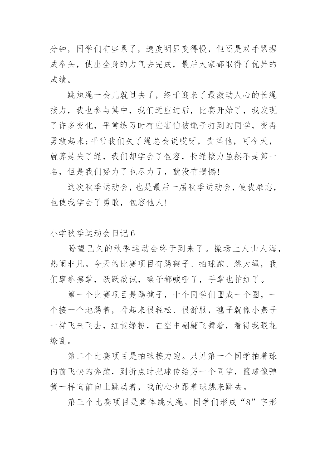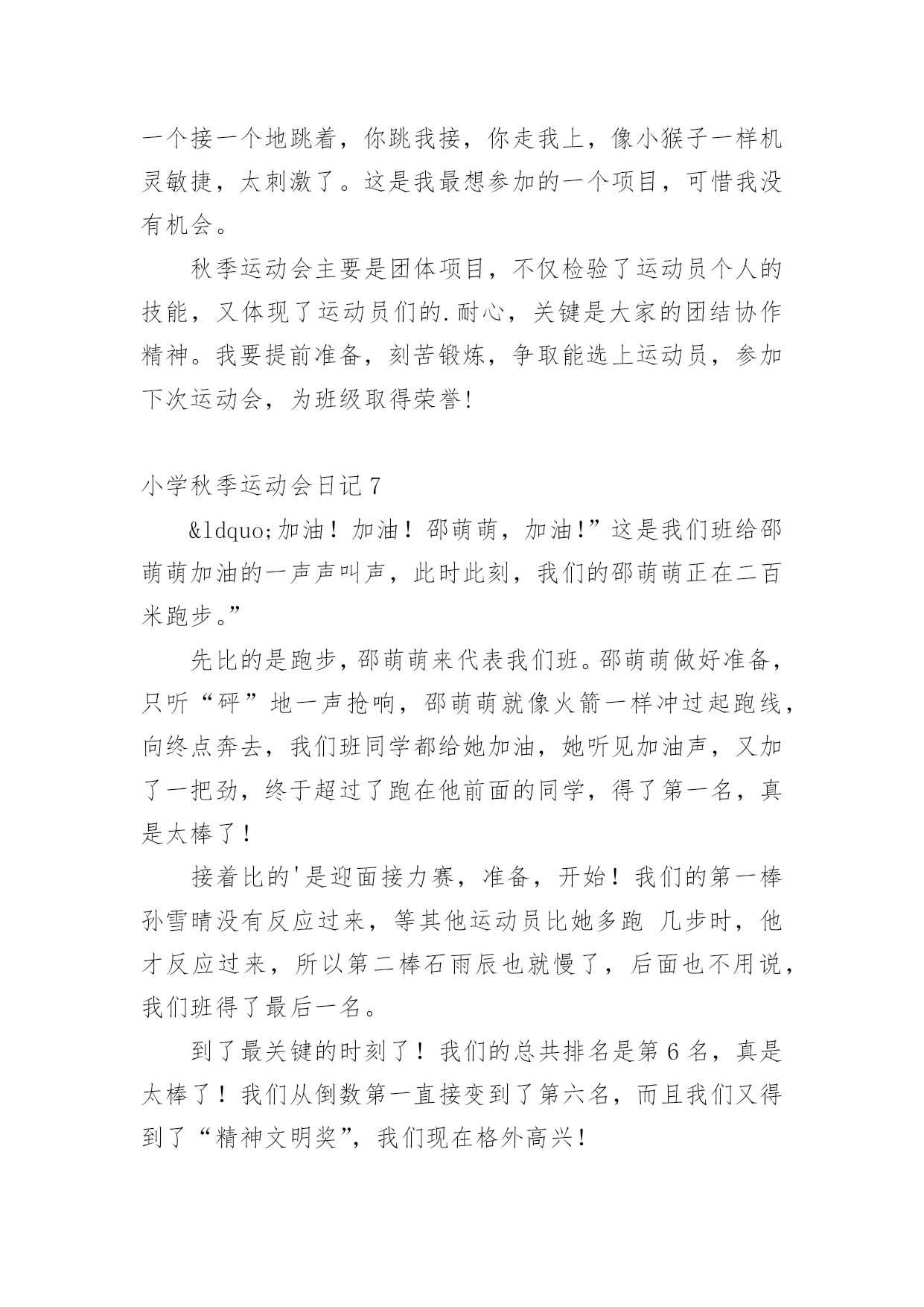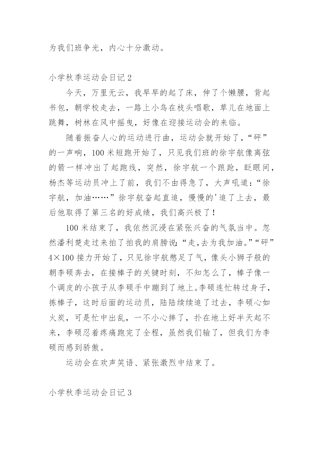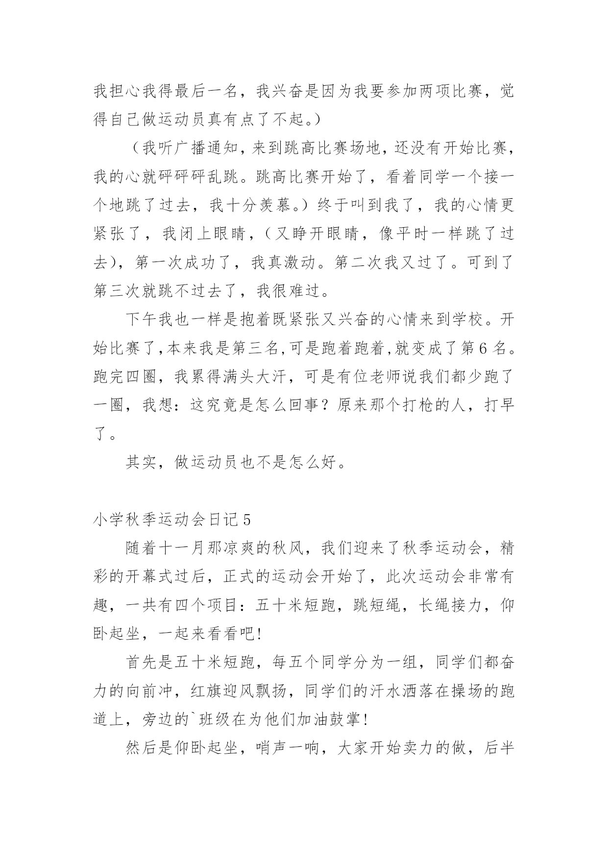 小学秋季运动会日记即将要到一天的结尾了,我们对人和事情也有了新的看法,因此我们要写好日记了。日记怎么写才不会千篇一律呢?以下是小编整理的小学秋季运动会日记,供大家参考借鉴,希望可以帮助到有需要的朋友。小学秋季运动会日记1太阳刚露出了头,秋风吹过,同学们早早的就来到操场,一年一度的秋季运动会马上就要开始了,我们在操场的看台上坐下,期待着运动会的开始。运功会的比赛项目有很多,例如,短跑、长跑、跳高、跳远等。我们班也有同学参加了比赛。比赛就要开始了,同学都准备好了十足的热情和呐喊声为参赛选手加油。首先比赛的项目是100米短跑。“各就各位,预备,跑!”枪声一响,选手们便奋不顾身地冲了出去,只见每个人都拼尽全力向终点跑去。一开始,我们班的同学就被其他选手甩在了后面,渐渐地距离拉大,我们在那看着十分着急,大家都不由自主为他呐喊助威“加油,加油。”他好像听到了我们的声音,突然,速度变快了,拼了命的`往前跑,紧接着,一个个选手都被他超了过去。终于到达终点,拿到了第二名的好成绩,虽然没有得到第一,但是我们依然很开心,都为他感到骄傲。颁奖仪式开始了,看着我们班的同学能够站在领奖台上,为我们班争光,内心十分激动。小学秋季运动会日记2今天,万里无云,我早早的起了床,伸了个懒腰,背起书包,朝学校走去,一路上小鸟在枝头唱歌,草儿在地面上跳舞,树林在风中摇曳,好像在迎接运动会的来临。随着振奋人心的运动进行曲,运动会就开始了,“砰”的一声响,100米短跑开始了,只见我们班的徐宇航像离弦的箭一样冲出了起跑线,突然,徐宇航一个踉跄,眨眼间,杨杰等运动员冲上了前,我们不由得急了,大声吼道:“徐宇航,加油……”徐宇航奋起直追,慢慢的'追了上去,最后他取得了第三名的好成绩,我们高兴极了!100米结束了,我依然沉浸在紧张兴奋的气氛当中。忽然潘利楚走过来拍了拍我的肩膀说:“走,去为我加油。”“砰”4×100接力开始了,只见徐宇航憋足了气,像头小狮子般的朝李硕奔去,在接棒子的关键时刻,不知怎么了,棒子像一个调皮的小孩子从李硕手中蹦到了地上。李硕连忙转过身子,拣棒子,这时后面的运动员,陆陆续续追了过去,李硕心如火炭,可是忙中出乱,一不小心摔了,扑在地上好半天起不来,李硕忍着疼痛跑完了全程,虽然我们输了,但我们为李硕而感到骄傲。运动会在欢声笑语、紧张激烈中结束了。小学秋季运动会日记3星期四的早上我带着激动的心情,迈着轻松的步子走进了学校的大门,因为今天是一年一度的秋季运动会。上午,运动会开幕式开始了。各个方队在班主任带领下迈着整齐的步子,走向各自预定的方位。开幕式的表演是由各班级的啦啦队组成,有跳街舞的.、有跳健美操的……下午,运动会正式开始了。比赛的项目有男、女50米、200米、400米、600米跑步;50米接力赛;投篮、投准等等。同学们一个精神抖擞,箭步如飞,赢得了阵阵掌声和助威声。好不容易轮到我们班的选手比赛了。只见张璐豪站在起跑线上,左腿向前微弓,右腿向后直蹬着地,目视前方,身体向前微倾。只听“呯”的一声响,张璐豪的身体就像离弦的箭一样冲了出去,把其他选手远远丢在了后面。同学们兴奋极了,高呼着“三三三三,金豆乐园,团结一致,勇往直前。”不一会儿,张同学就跑到了终点,为我们班赢得了第一。秋季运动会在紧张、热烈、有趣的气氛中结束了,我班争得了优异的成绩。小学秋季运动会日记4今天,也就是星期四(11月5日)。上午是我参加跳高比赛,下午是跑步800米也就是四圈。(这句话是典型的.口头语言,可以这样改:上午我要参加跳高比赛,下午要参加800米比赛,要跑操场四圈。)我有点紧张又有点兴奋,我想跳高也不是怎么难吧?(这里可以这样改:(我紧张是因为我担心我得最后一名,我兴奋是因为我要参加两项比赛,觉得自己做运动员真有点了不起。)(我听广播通知,来到跳高比赛场地,还没有开始比赛,我的心就砰砰砰乱跳。跳高比赛开始了,看着同学一个接一个地跳了过去,我十分羡慕。)终于叫到我了,我的心情更紧张了,我闭上眼睛,(又睁开眼睛,像平时一样跳了过去),第一次成功了,我真激动。第二次我又过了。可到了第三次就跳不过去了,我很难过。下午我也一样是抱着既紧张又兴奋的心情来到学校。开始比赛了,本来我是第三名,可是跑着跑着,就变成了第6名。跑完四圈,我累得满头大汗,可是有位老师说我们都少跑了一圈,我想:这究竟是怎么回事?原来那个打枪的人,打早了。其实,做运动员也不是怎么好。小学秋季运动会日记5随着十一月那凉爽的秋风,我们迎来了秋季运动会,精彩的开幕式过后,正式的运动会开始了,此次运动会非常有趣,一共有四个项目:五十米短跑,跳短绳,长绳接力,仰卧起坐,一起来看看吧!首先是五十米短跑,每五个同学分为一组,同学们都奋力的向前冲,红旗迎风飘扬,同学们的汗水洒落在操场的跑道上,旁边的`班级在为他们加油鼓掌!然后是仰卧起坐,