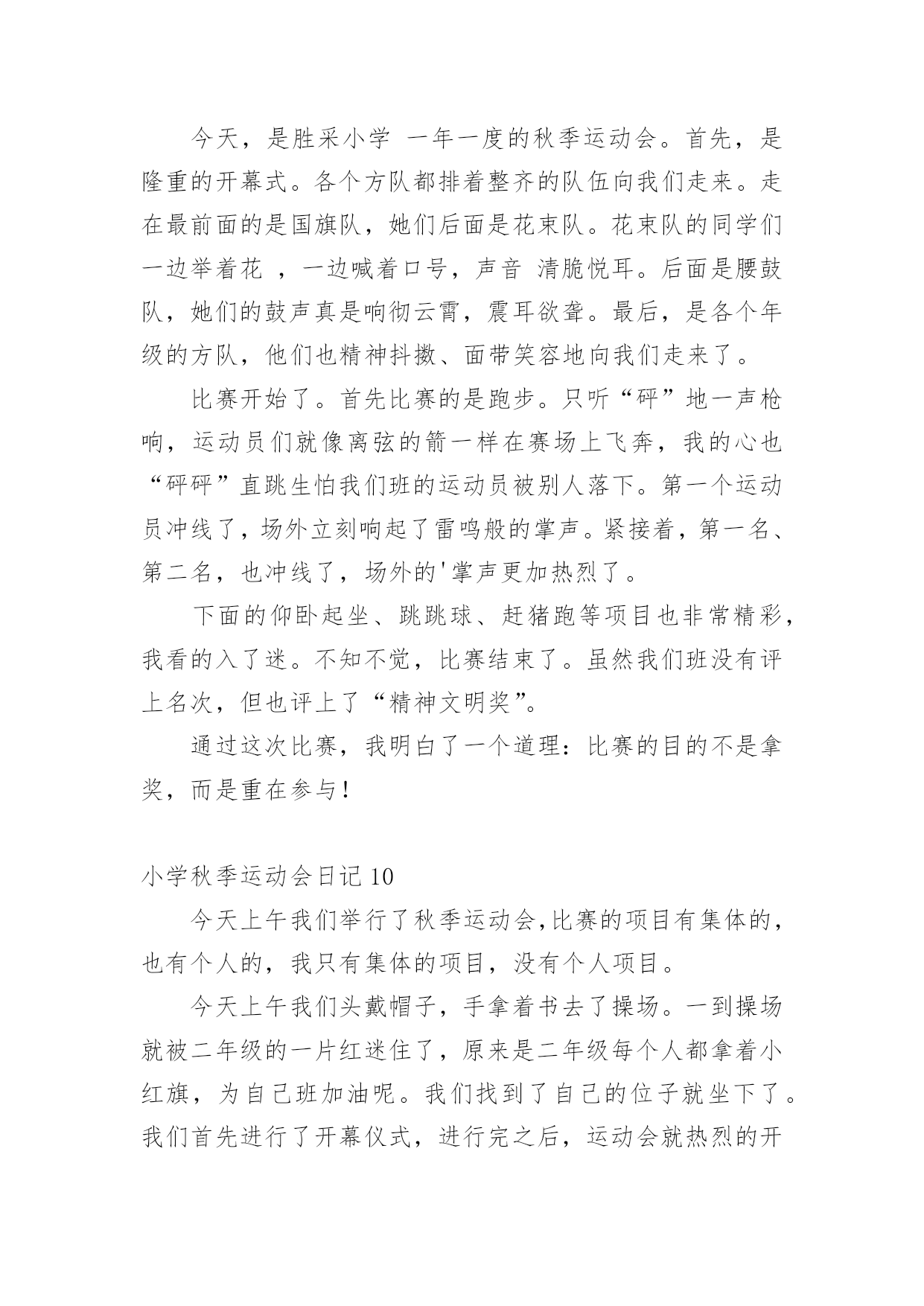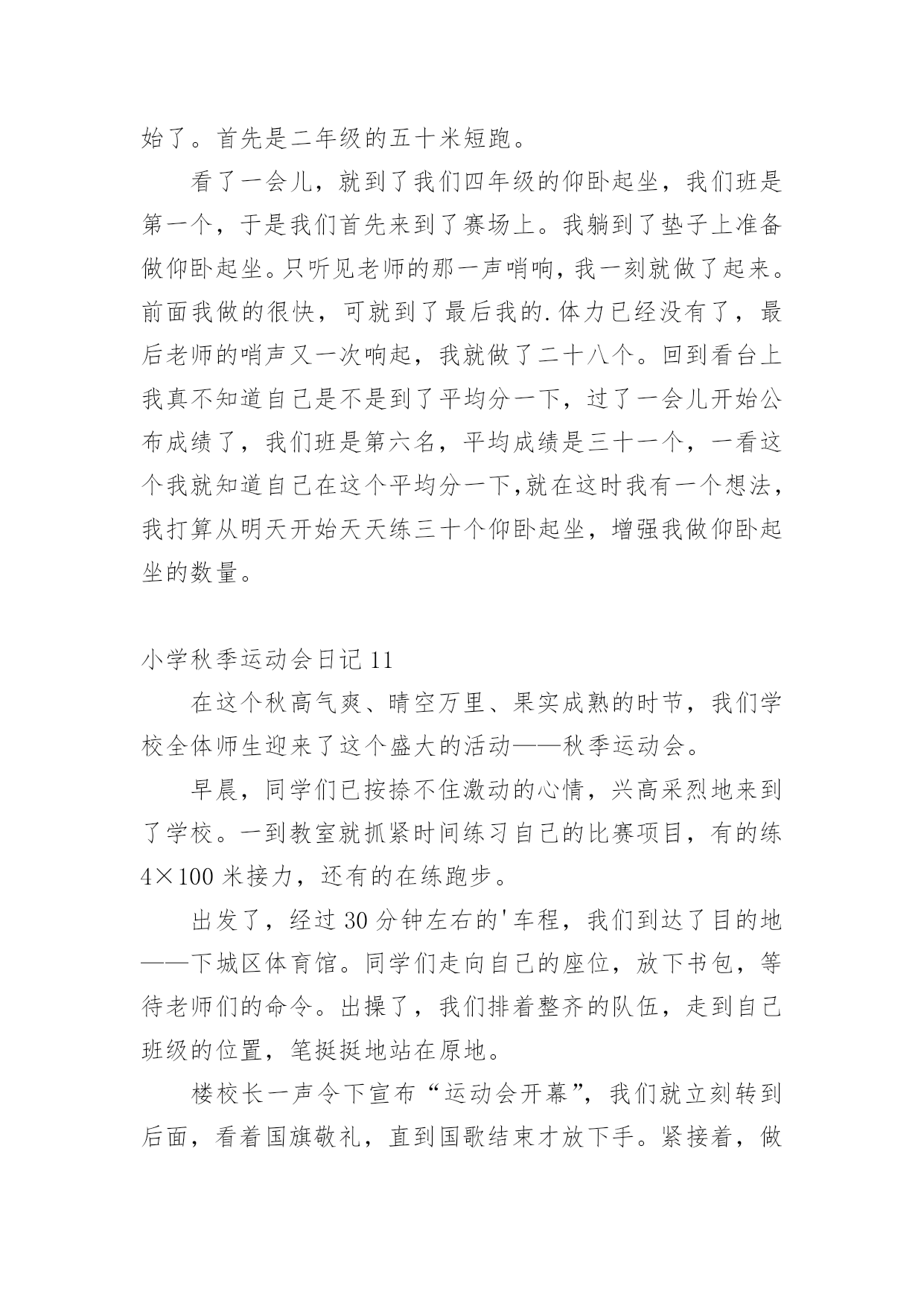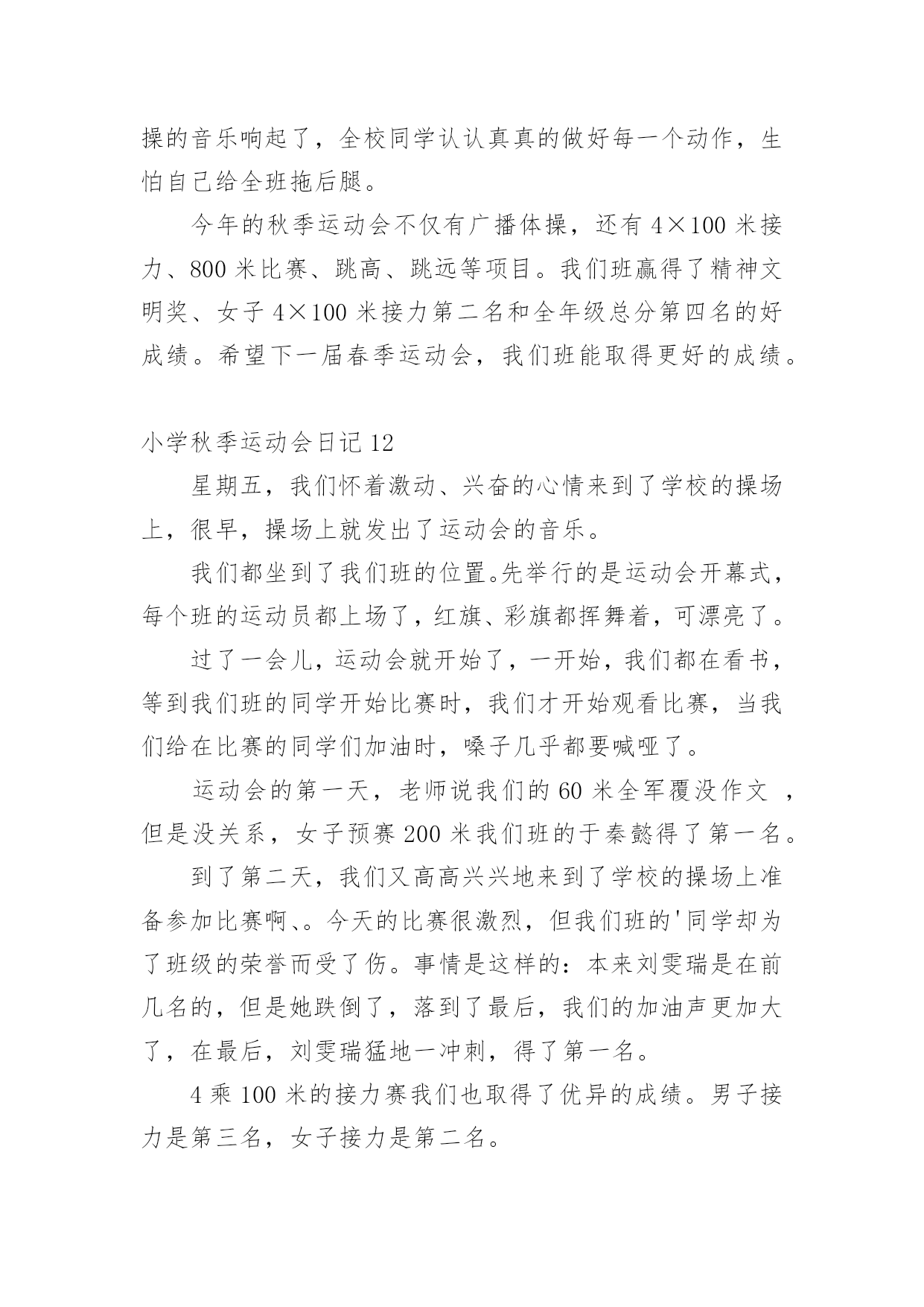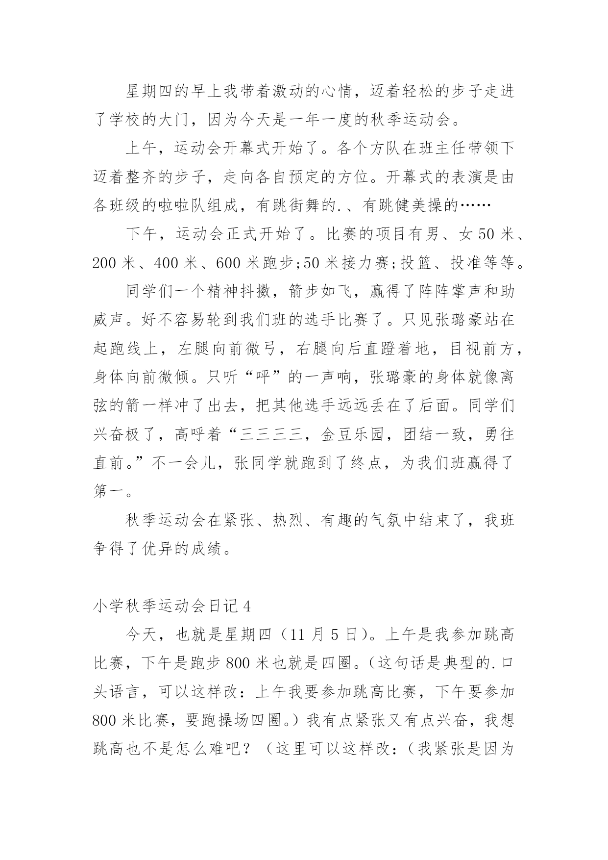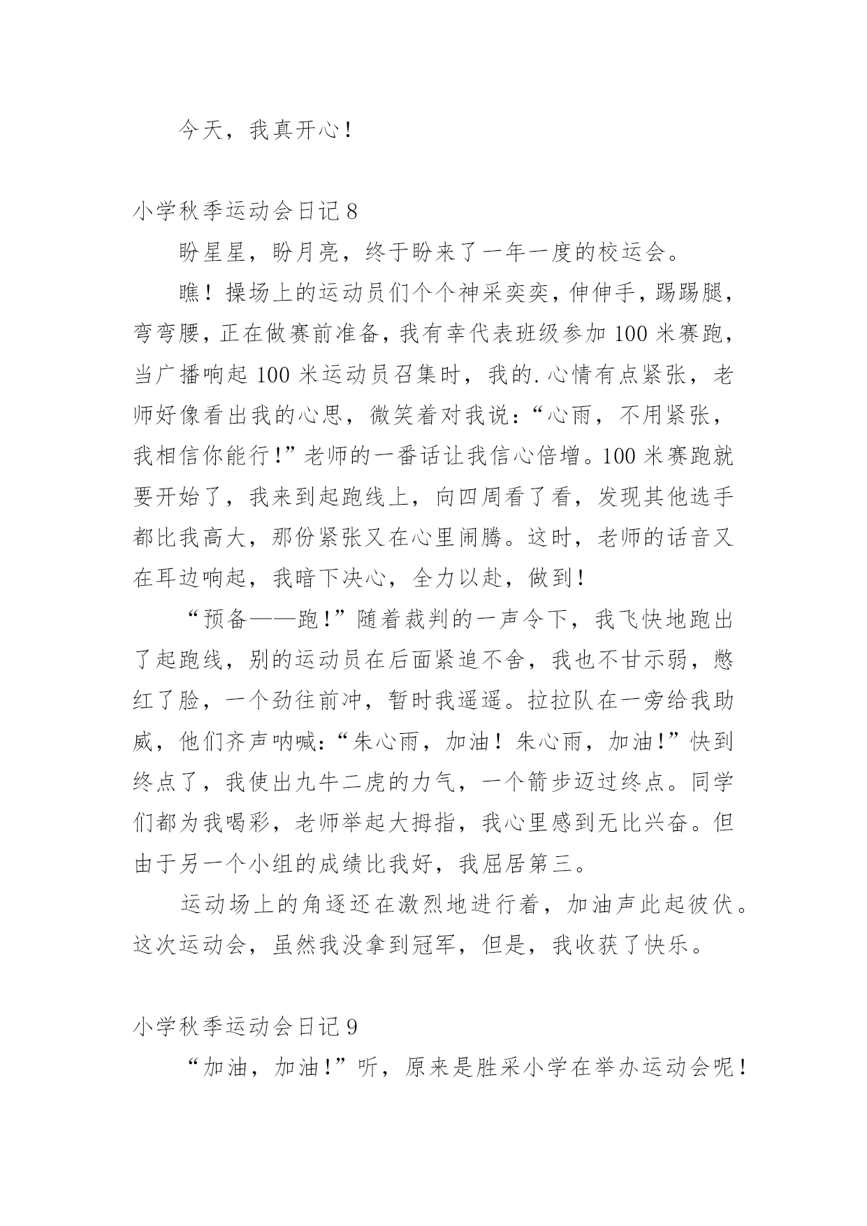 小学秋季运动会日记即将要到一天的结尾了,我们对人和事情也有了新的看法,因此我们要写好日记了。日记怎么写才不会千篇一律呢?以下是小编整理的小学秋季运动会日记,供大家参考借鉴,希望可以帮助到有需要的朋友。小学秋季运动会日记1太阳刚露出了头,秋风吹过,同学们早早的就来到操场,一年一度的秋季运动会马上就要开始了,我们在操场的看台上坐下,期待着运动会的开始。运功会的比赛项目有很多,例如,短跑、长跑、跳高、跳远等。我们班也有同学参加了比赛。比赛就要开始了,同学都准备好了十足的热情和呐喊声为参赛选手加油。首先比赛的项目是100米短跑。“各就各位,预备,跑!”枪声一响,选手们便奋不顾身地冲了出去,只见每个人都拼尽全力向终点跑去。一开始,我们班的同学就被其他选手甩在了后面,渐渐地距离拉大,我们在那看着十分着急,大家都不由自主为他呐喊助威“加油,加油。”他好像听到了我们的声音,突然,速度变快了,拼了命的`往前跑,紧接着,一个个选手都被他超了过去。终于到达终点,拿到了第二名的好成绩,虽然没有得到第一,但是我们依然很开心,都为他感到骄傲。颁奖仪式开始了,看着我们班的同学能够站在领奖台上,为我们班争光,内心十分激动。小学秋季运动会日记2今天,万里无云,我早早的起了床,伸了个懒腰,背起书包,朝学校走去,一路上小鸟在枝头唱歌,草儿在地面上跳舞,树林在风中摇曳,好像在迎接运动会的来临。随着振奋人心的运动进行曲,运动会就开始了,“砰”的一声响,100米短跑开始了,只见我们班的徐宇航像离弦的箭一样冲出了起跑线,突然,徐宇航一个踉跄,眨眼间,杨杰等运动员冲上了前,我们不由得急了,大声吼道:“徐宇航,加油……”徐宇航奋起直追,慢慢的'追了上去,最后他取得了第三名的好成绩,我们高兴极了!100米结束了,我依然沉浸在紧张兴奋的气氛当中。忽然潘利楚走过来拍了拍我的肩膀说:“走,去为我加油。”“砰”4×100接力开始了,只见徐宇航憋足了气,像头小狮子般的朝李硕奔去,在接棒子的关键时刻,不知怎么了,棒子像一个调皮的小孩子从李硕手中蹦到了地上。李硕连忙转过身子,拣棒子,这时后面的运动员,陆陆续续追了过去,李硕心如火炭,可是忙中出乱,一不小心摔了,扑在地上好半天起不来,李硕忍着疼痛跑完了全程,虽然我们输了,但我们为李硕而感到骄傲。运动会在欢声笑语、紧张激烈中结束了。小学秋季运动会日记3星期四的早上我带着激动的心情,迈着轻松的步子走进了学校的大门,因为今天是一年一度的秋季运动会。上午,运动会开幕式开始了。各个方队在班主任带领下迈着整齐的步子,走向各自预定的方位。开幕式的表演是由各班级的啦啦队组成,有跳街舞的.、有跳健美操的……下午,运动会正式开始了。比赛的项目有男、女50米、200米、400米、600米跑步;50米接力赛;投篮、投准等等。同学们一个精神抖擞,箭步如飞,赢得了阵阵掌声和助威声。好不容易轮到我们班的选手比赛了。只见张璐豪站在起跑线上,左腿向前微弓,右腿向后直蹬着地,目视前方,身体向前微倾。只听“呯”的一声响,张璐豪的身体就像离弦的箭一样冲了出去,把其他选手远远丢在了后面。同学们兴奋极了,高呼着“三三三三,金豆乐园,团结一致,勇往直前。”不一会儿,张同学就跑到了终点,为我们班赢得了第一。秋季运动会在紧张、热烈、有趣的气氛中结束了,我班争得了优异的成绩。小学秋季运动会日记4今天,也就是星期四(11月5日)。上午是我参加跳高比赛,下午是跑步800米也就是四圈。(这句话是典型的.口头语言,可以这样改:上午我要参加跳高比赛,下午要参加800米比赛,要跑操场四圈。)我有点紧张又有点兴奋,我想跳高也不是怎么难吧?(这里可以这样改:(我紧张是因为我担心我得最后一名,我兴奋是因为我要参加两项比赛,觉得自己做运动员真有点了不起。)(我听广播通知,来到跳高比赛场地,还没有开始比赛,我的心就砰砰砰乱跳。跳高比赛开始了,看着同学一个接一个地跳了过去,我十分羡慕。)终于叫到我了,我的心情更紧张了,我闭上眼睛,(又睁开眼睛,像平时一样跳了过去),第一次成功了,我真激动。第二次我又过了。可到了第三次就跳不过去了,我很难过。下午我也一样是抱着既紧张又兴奋的心情来到学校。开始比赛了,本来我是第三名,可是跑着跑着,就变成了第6名。跑完四圈,我累得满头大汗,可是有位老师说我们都少跑了一圈,我想:这究竟是怎么回事?原来那个打枪的人,打早了。其实,做运动员也不是怎么好。小学秋季运动会日记5随着十一月那凉爽的秋风,我们迎来了秋季运动会,精彩的开幕式过后,正式的运动会开始了,此次运动会非常有趣,一共有四个项目:五十米短跑,跳短绳,长绳接力,仰卧起坐,一起来看看吧!首先是五十米短跑,每五个同学分为一组,同学们都奋力的向前冲,红旗迎风飘扬,同学们的汗水洒落在操场的跑道上,旁边的`班级在为他们加油鼓掌!然后是仰卧起坐,