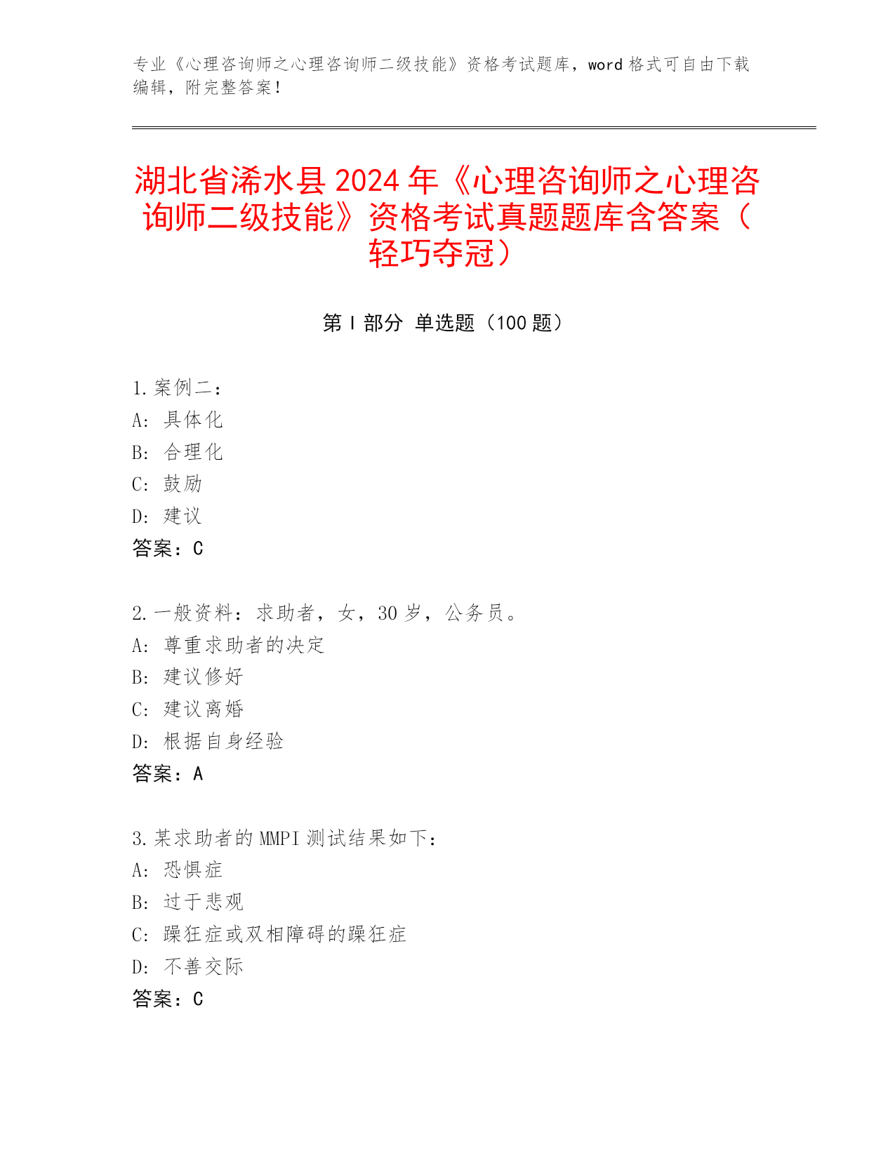 2024年湖北省浠水县《心理咨询师之心理咨询师二级技能》资格考试必背200题真题含答案【预热题】