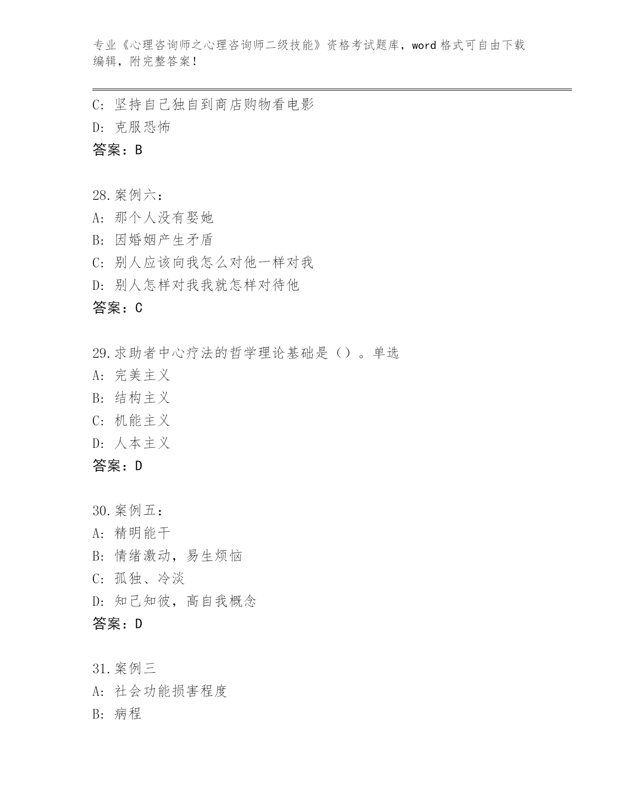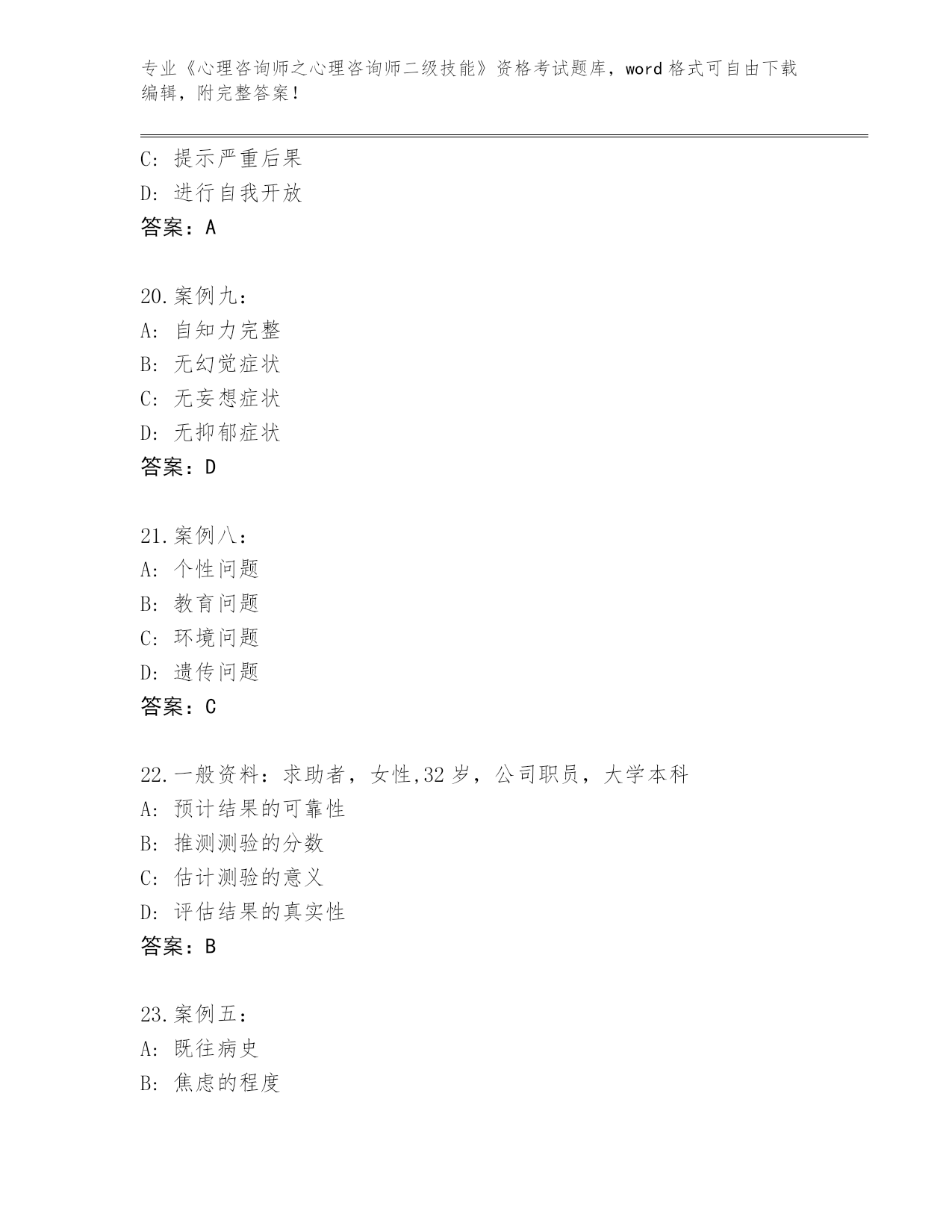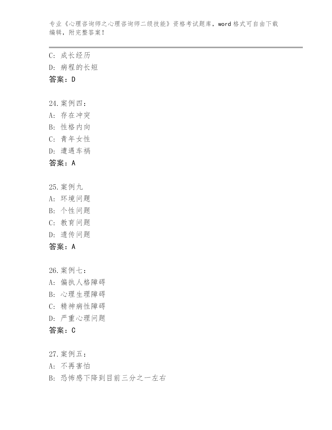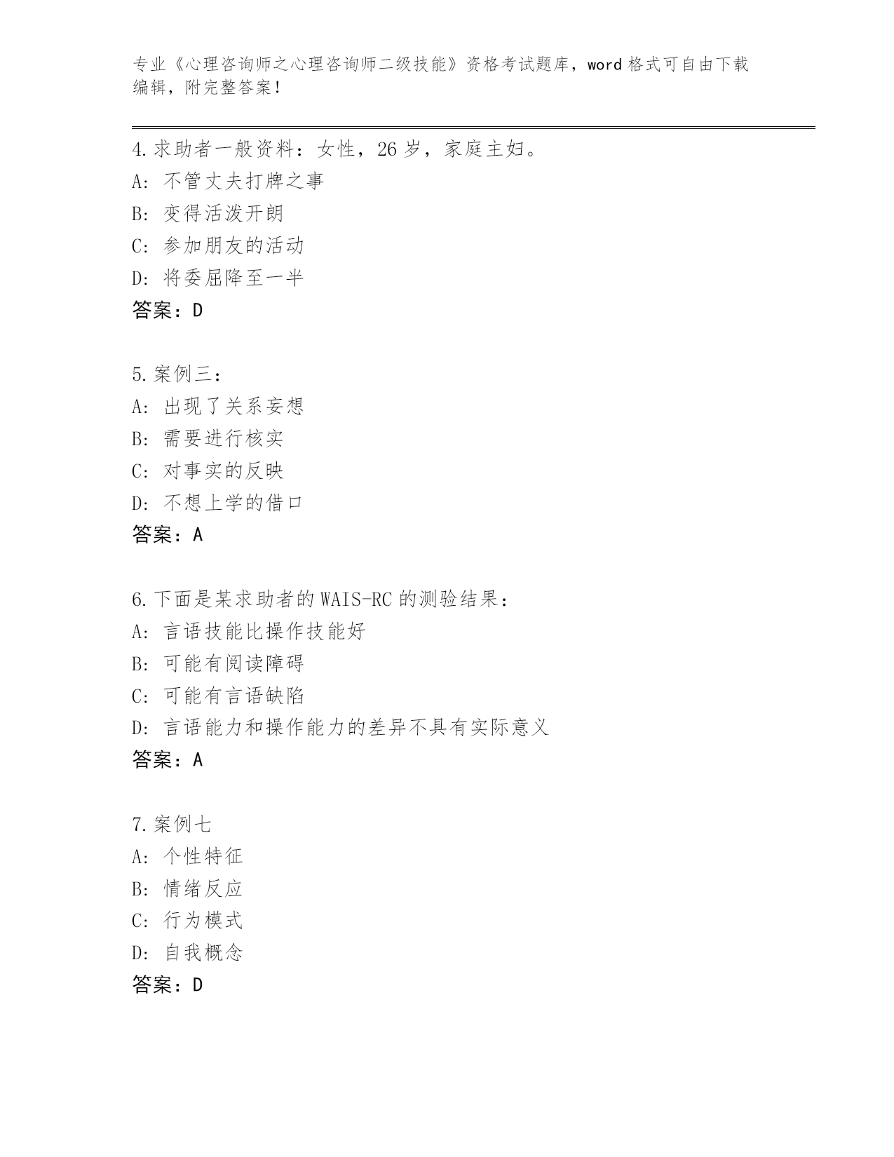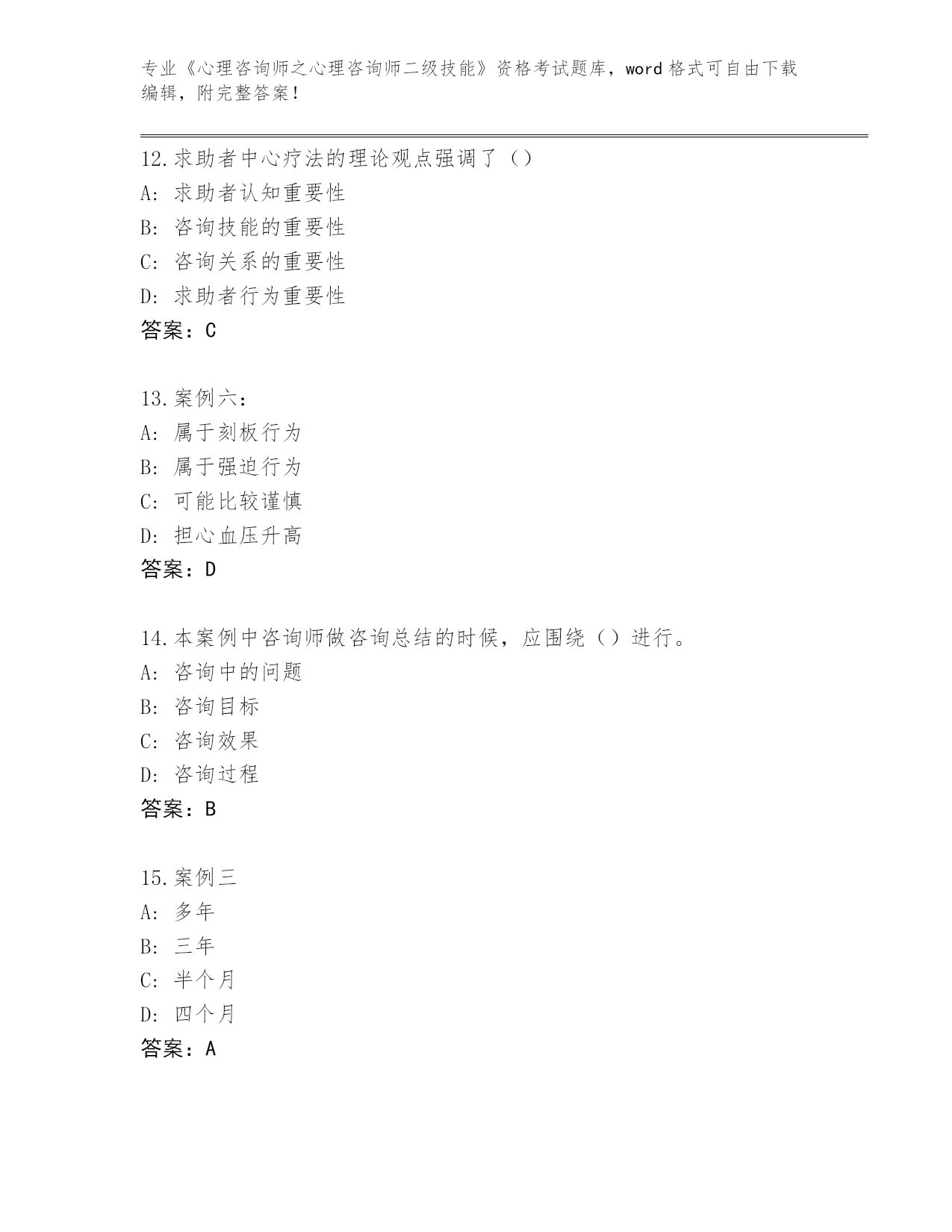 湖北省浠水县2024年《心理咨询师之心理咨询师二级技能》资格考试必背200题题库大全带答案(轻巧夺冠)