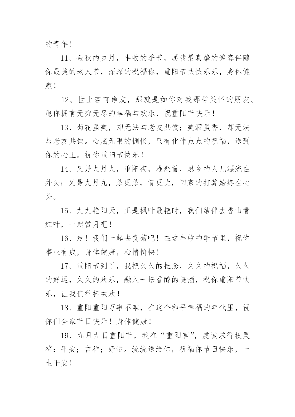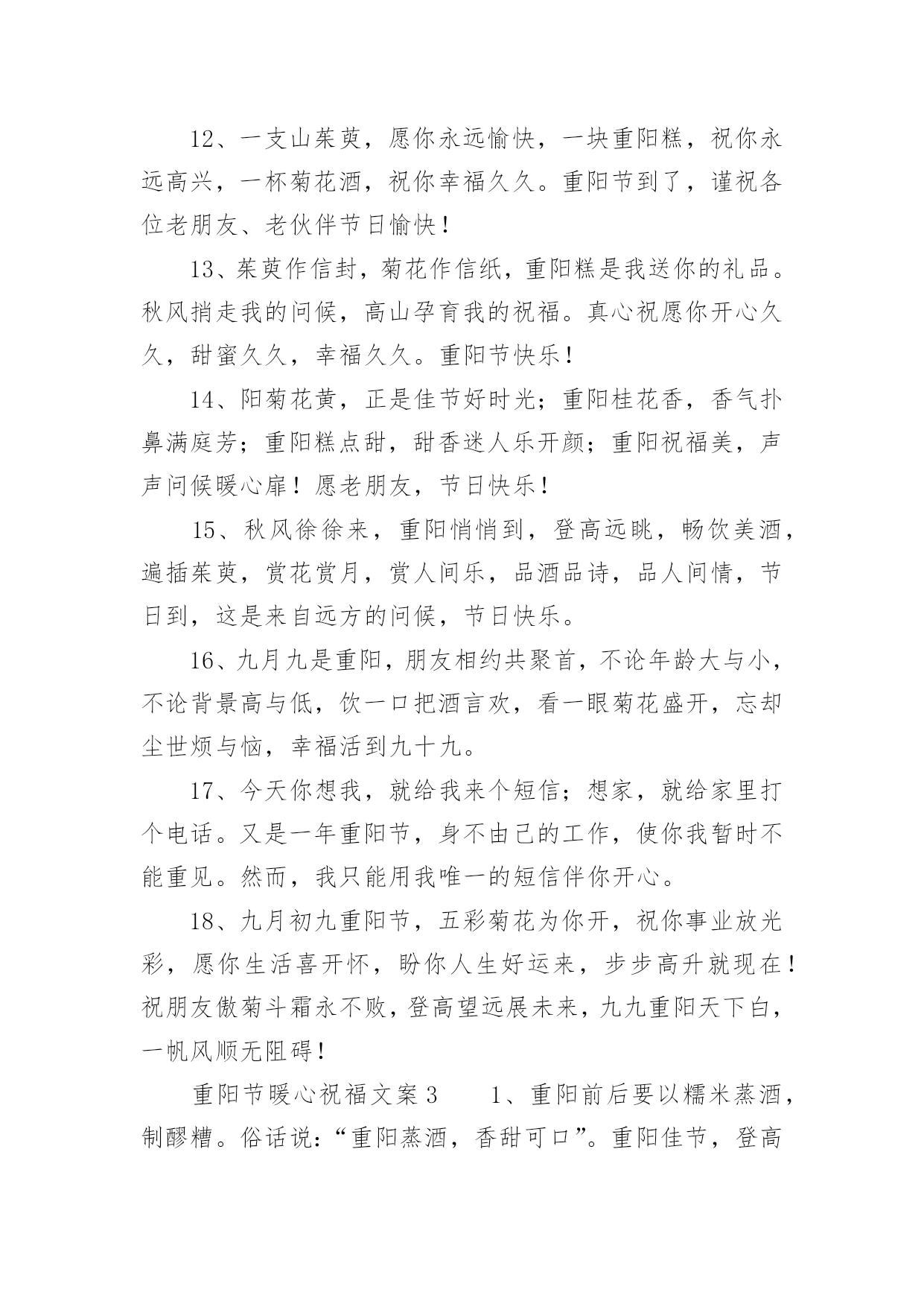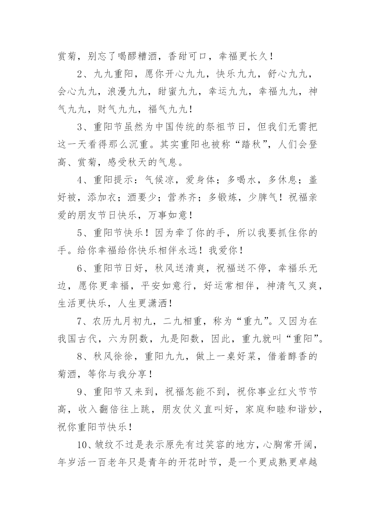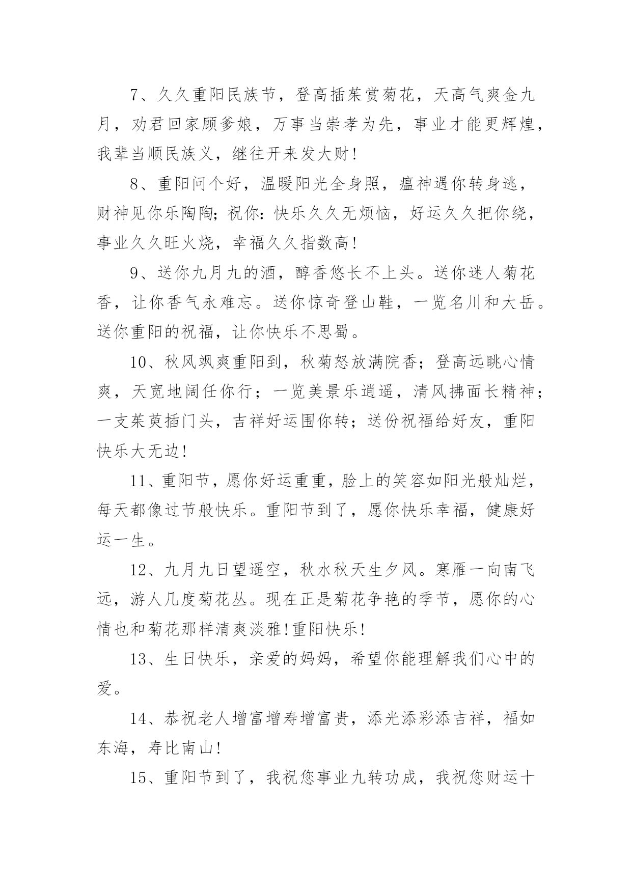重阳节暖心祝福文案重阳节暖心祝福文案随着社交网络的发展,越来越多人钟情于在网上发布文案,文案用以记录和分享生活日常。那些火遍朋友圈的文案都是什么样的呢?以下是小编为大家收集的重阳节暖心祝福文案,欢迎阅读与收藏。重阳节暖心祝福文案11、送你九月九的酒,醇香悠长不上头。送你迷人菊香,让你香气永难忘。送你惊奇登山鞋,一览名川和大岳。送你重阳的祝福,让你快乐不思蜀。2、久久重阳,愿你甜蜜蜜的生活一重重;美滋滋的好事一重重;乐呵呵的笑容一重重;沉甸甸的收获一重重;金灿灿的果实一重重;重阳节祝你好运一重重!3、您心灵深处,积存着一脉生命之泉,永远畅流不息。祝您长寿!4、九月初九重阳节,九九思念久久不变。对你的祝福久久不能减低,对你的怀恋久久不能散去,对你的关心久久不能消弭。祝你激情久久、幸福久久、快乐久久!5、一个敬老并登高的日子,一个快乐并团圆的节日,在这个喜庆的节日中,愿你快乐多多,记得对父母说声“愿您健康、幸福”重阳节快乐。6、酿一杯思念的酒,摘一片鸿雁的羽,添一缕菊花的香,在重阳的时候送到你手中,让弥漫着祝福的芬芳,飘逸出幸福的味道,带给你无限好运和快乐。7、久久重阳民族节,登高插茱赏菊花,天高气爽金九月,劝君回家顾爹娘,万事当崇孝为先,事业才能更辉煌,我辈当顺民族义,继往开来发大财!8、重阳问个好,温暖阳光全身照,瘟神遇你转身逃,财神见你乐陶陶;祝你:快乐久久无烦恼,好运久久把你绕,事业久久旺火烧,幸福久久指数高!9、送你九月九的酒,醇香悠长不上头。送你迷人菊花香,让你香气永难忘。送你惊奇登山鞋,一览名川和大岳。送你重阳的祝福,让你快乐不思蜀。10、秋风飒爽重阳到,秋菊怒放满院香;登高远眺心情爽,天宽地阔任你行;一览美景乐逍遥,清风拂面长精神;一支茱萸插门头,吉祥好运围你转;送份祝福给好友,重阳快乐大无边!11、重阳节,愿你好运重重,脸上的笑容如阳光般灿烂,每天都像过节般快乐。重阳节到了,愿你快乐幸福,健康好运一生。12、九月九日望遥空,秋水秋天生夕风。寒雁一向南飞远,游人几度菊花丛。现在正是菊花争艳的季节,愿你的心情也和菊花那样清爽淡雅!重阳快乐!13、生日快乐,亲爱的妈妈,希望你能理解我们心中的爱。14、恭祝老人增富增寿增富贵,添光添彩添吉祥,福如东海,寿比南山!15、重阳节到了,我祝您事业九转功成,我祝您财运十拿九稳,我祝您万事九月大吉;我的祝福一言九鼎,祝您重阳节快乐!16、请老寿星的女儿、女婿上堂拜寿:一拜,祝老寿星福如东海、寿比南山;二拜,祝老寿星日月昌明、松鹤长春;三拜,祝老寿星笑口常开、天伦永享。17、重阳来登高,避灾祈福平安长,身插一束茱萸草,思念悠长情飞扬,斟满一杯重阳酒,点点祝福电波传,重阳节,愿您幸福平安,健康相随,重阳快乐!18、九相逢是重阳,秋高气爽菊花香。九九相随是重阳,天长地久岁月长。九九相伴是重阳,好事成双不可挡。九九归一是重阳,步步登高人吉祥。重阳节快乐!19、菊花台,香满怀,思念排成排;雁南归,茱萸飞,友情堆成堆;重阳节,遥望月,祝福白如雪:好运不绝,成功不缺,幸福快乐永不歇。20、爷爷高高的个儿,宽宽的肩,别看他已年过古稀,可说起话来,声音像洪钟一样雄浑有力;走起路来蹬、蹬、蹬他,连小伙子也追不上呢。21、重阳望秋空,金菊红叶染秋风。秋思秋情缘秋起,举杯邀月秋正浓。登高处,笑长空,抬望眼,好前程。茱萸一支寄深情,人共佳节醉秋风。22、咬定青山不放松,时间不怕久,爱情要有韧劲;蜡炬成灰泪始干,辛苦不怕久,爱情要有拼劲;久久节到,真爱在手,真情在心,九月九,重阳节到,祝你幸福到永久!23、风雨中您是我坚强的支柱;海浪里,您是避风的港湾。看着您逐渐弯下的脊梁,我想要说:亲爱的爸爸,您辛苦了!24、不忘兄弟,是从远隔天涯的祝福开始;不忘兄弟,是从点点滴滴的回忆开始;不忘兄弟,是从佳节到来的问候开始。重阳节,祝兄弟姐妹快乐重重,喜事重重!25、爸爸妈妈,感谢您们多年来不辞劳苦,重阳来临之际,祝你们身体健康,永远开心快乐!我爱你们!26、菊花香,重阳九,福寿长久久。重阳糕,香又甜,知足常乐活神仙。人生不过一百年,天天都盼艳阳天。重阳节,请爱惜自己的身体健康,长寿一百年!27、愿电波驾着我的祝福:幸福,好运送给你。祝你生日愉快!天天愉快!28、父亲的爱深沉而热烈,给了我勇敢坚定的信念,在为您点燃生日蜡烛的时候,我真心希望父亲的生命之树常绿!29、远也好,近也好,牵挂就好;平淡也好,富贵也好,健康就好;电话也好,信息也好,随着祝福,你幸福就好。祝你重阳节快乐!30、爷爷是山,我是树,是山哺育了树。山,深沉稳重;山,刚直伟岸。树,永远依恋着山,树,永远感恩着山。生日快乐,祝爷爷健康平安!31、人间情,父母亲;人世爱,父母爱;常沟通,不孤独;常回家,有快乐;常联系,有幸福。祝天下父母身体健康,开心每一天!