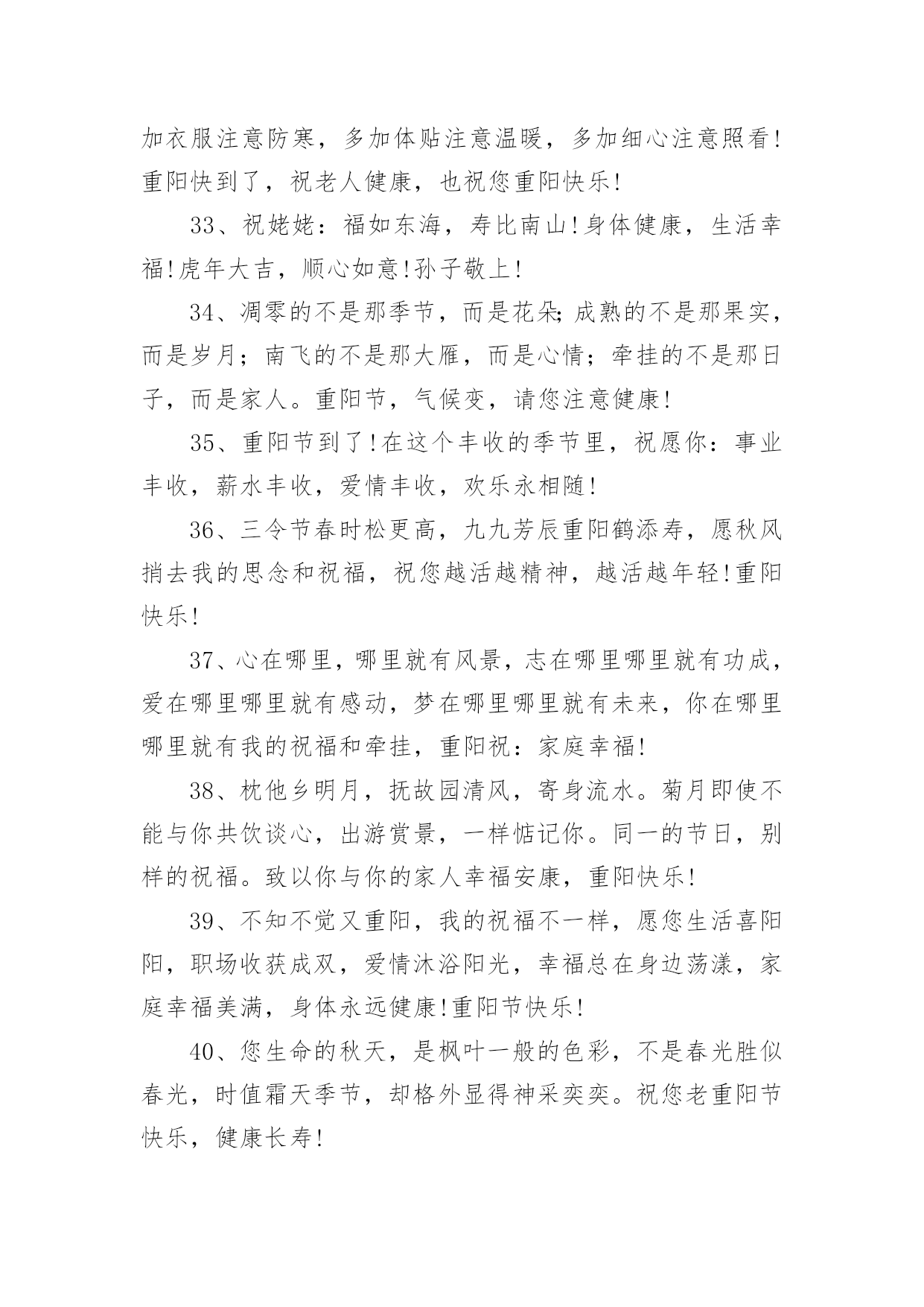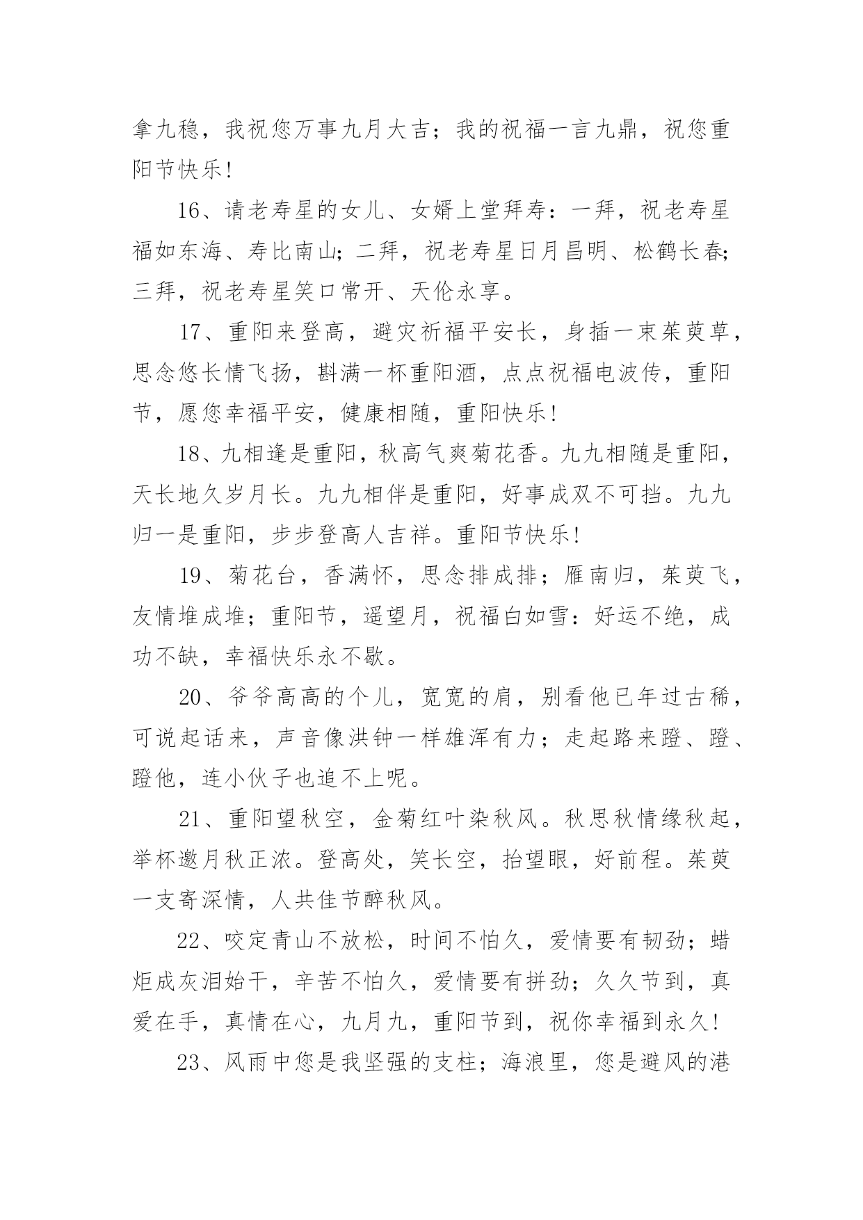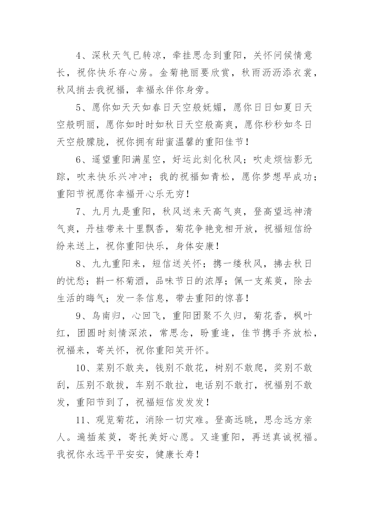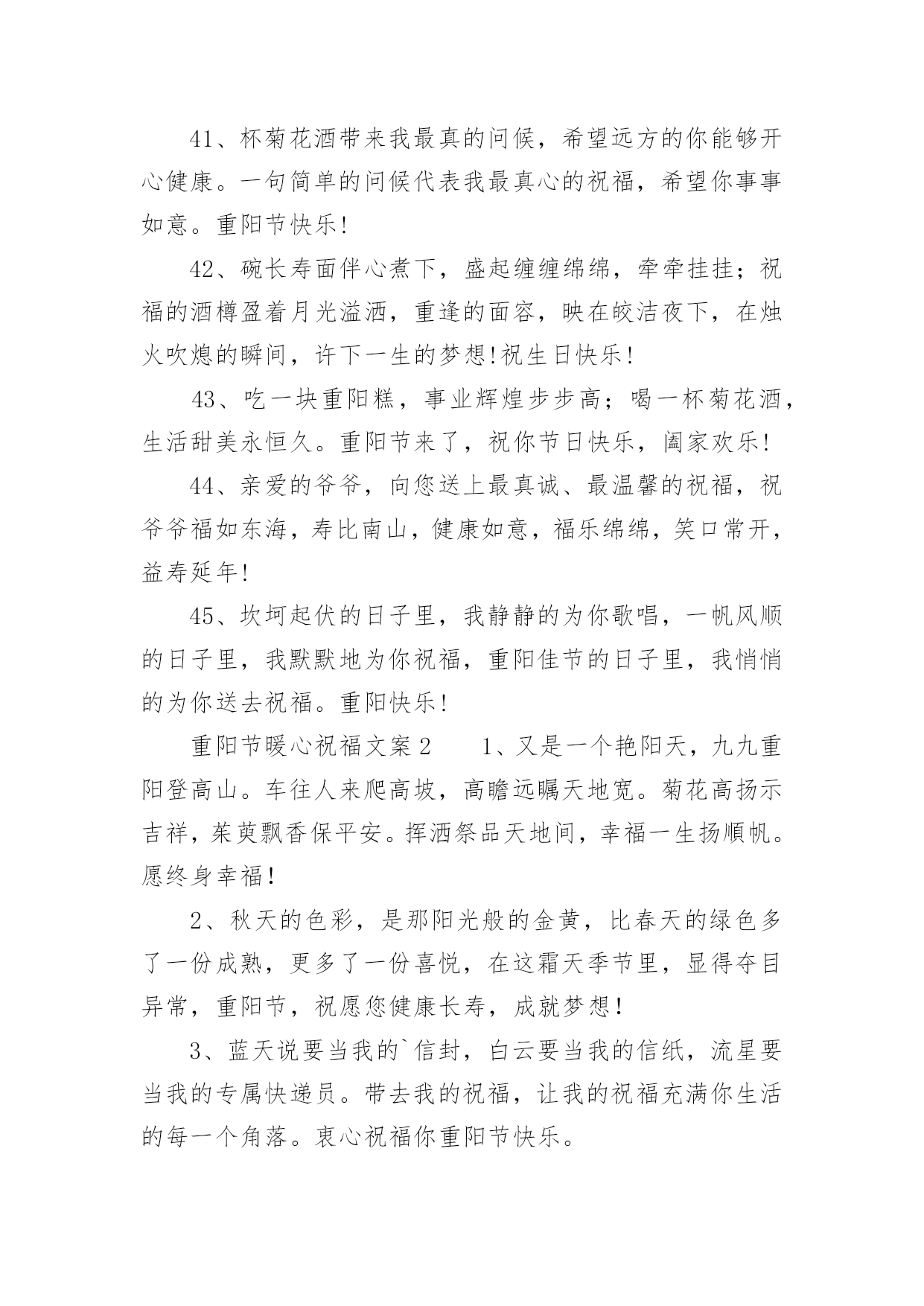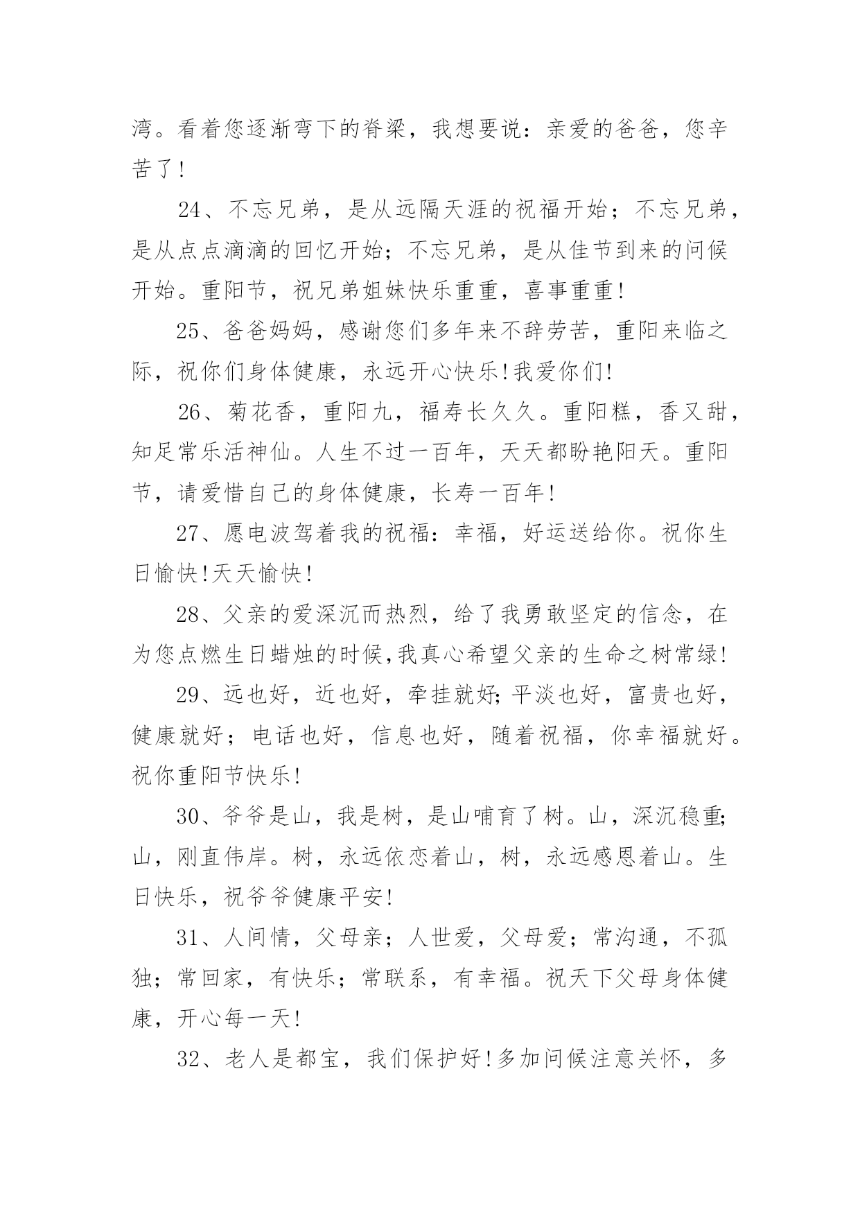 重阳节暖心祝福文案重阳节暖心祝福文案随着社交网络的发展,越来越多人钟情于在网上发布文案,文案用以记录和分享生活日常。那些火遍朋友圈的文案都是什么样的呢?以下是小编为大家收集的重阳节暖心祝福文案,欢迎阅读与收藏。重阳节暖心祝福文案11、送你九月九的酒,醇香悠长不上头。送你迷人菊香,让你香气永难忘。送你惊奇登山鞋,一览名川和大岳。送你重阳的祝福,让你快乐不思蜀。2、久久重阳,愿你甜蜜蜜的生活一重重;美滋滋的好事一重重;乐呵呵的笑容一重重;沉甸甸的收获一重重;金灿灿的果实一重重;重阳节祝你好运一重重!3、您心灵深处,积存着一脉生命之泉,永远畅流不息。祝您长寿!4、九月初九重阳节,九九思念久久不变。对你的祝福久久不能减低,对你的怀恋久久不能散去,对你的关心久久不能消弭。祝你激情久久、幸福久久、快乐久久!5、一个敬老并登高的日子,一个快乐并团圆的节日,在这个喜庆的节日中,愿你快乐多多,记得对父母说声“愿您健康、幸福”重阳节快乐。6、酿一杯思念的酒,摘一片鸿雁的羽,添一缕菊花的香,在重阳的时候送到你手中,让弥漫着祝福的芬芳,飘逸出幸福的味道,带给你无限好运和快乐。7、久久重阳民族节,登高插茱赏菊花,天高气爽金九月,劝君回家顾爹娘,万事当崇孝为先,事业才能更辉煌,我辈当顺民族义,继往开来发大财!8、重阳问个好,温暖阳光全身照,瘟神遇你转身逃,财神见你乐陶陶;祝你:快乐久久无烦恼,好运久久把你绕,事业久久旺火烧,幸福久久指数高!9、送你九月九的酒,醇香悠长不上头。送你迷人菊花香,让你香气永难忘。送你惊奇登山鞋,一览名川和大岳。送你重阳的祝福,让你快乐不思蜀。10、秋风飒爽重阳到,秋菊怒放满院香;登高远眺心情爽,天宽地阔任你行;一览美景乐逍遥,清风拂面长精神;一支茱萸插门头,吉祥好运围你转;送份祝福给好友,重阳快乐大无边!11、重阳节,愿你好运重重,脸上的笑容如阳光般灿烂,每天都像过节般快乐。重阳节到了,愿你快乐幸福,健康好运一生。12、九月九日望遥空,秋水秋天生夕风。寒雁一向南飞远,游人几度菊花丛。现在正是菊花争艳的季节,愿你的心情也和菊花那样清爽淡雅!重阳快乐!13、生日快乐,亲爱的妈妈,希望你能理解我们心中的爱。14、恭祝老人增富增寿增富贵,添光添彩添吉祥,福如东海,寿比南山!15、重阳节到了,我祝您事业九转功成,我祝您财运十拿九稳,我祝您万事九月大吉;我的祝福一言九鼎,祝您重阳节快乐!16、请老寿星的女儿、女婿上堂拜寿:一拜,祝老寿星福如东海、寿比南山;二拜,祝老寿星日月昌明、松鹤长春;三拜,祝老寿星笑口常开、天伦永享。17、重阳来登高,避灾祈福平安长,身插一束茱萸草,思念悠长情飞扬,斟满一杯重阳酒,点点祝福电波传,重阳节,愿您幸福平安,健康相随,重阳快乐!18、九相逢是重阳,秋高气爽菊花香。九九相随是重阳,天长地久岁月长。九九相伴是重阳,好事成双不可挡。九九归一是重阳,步步登高人吉祥。重阳节快乐!19、菊花台,香满怀,思念排成排;雁南归,茱萸飞,友情堆成堆;重阳节,遥望月,祝福白如雪:好运不绝,成功不缺,幸福快乐永不歇。20、爷爷高高的个儿,宽宽的肩,别看他已年过古稀,可说起话来,声音像洪钟一样雄浑有力;走起路来蹬、蹬、蹬他,连小伙子也追不上呢。21、重阳望秋空,金菊红叶染秋风。秋思秋情缘秋起,举杯邀月秋正浓。登高处,笑长空,抬望眼,好前程。茱萸一支寄深情,人共佳节醉秋风。22、咬定青山不放松,时间不怕久,爱情要有韧劲;蜡炬成灰泪始干,辛苦不怕久,爱情要有拼劲;久久节到,真爱在手,真情在心,九月九,重阳节到,祝你幸福到永久!23、风雨中您是我坚强的支柱;海浪里,您是避风的港湾。看着您逐渐弯下的脊梁,我想要说:亲爱的爸爸,您辛苦了!24、不忘兄弟,是从远隔天涯的祝福开始;不忘兄弟,是从点点滴滴的回忆开始;不忘兄弟,是从佳节到来的问候开始。重阳节,祝兄弟姐妹快乐重重,喜事重重!25、爸爸妈妈,感谢您们多年来不辞劳苦,重阳来临之际,祝你们身体健康,永远开心快乐!我爱你们!26、菊花香,重阳九,福寿长久久。重阳糕,香又甜,知足常乐活神仙。人生不过一百年,天天都盼艳阳天。重阳节,请爱惜自己的身体健康,长寿一百年!27、愿电波驾着我的祝福:幸福,好运送给你。祝你生日愉快!天天愉快!28、父亲的爱深沉而热烈,给了我勇敢坚定的信念,在为您点燃生日蜡烛的时候,我真心希望父亲的生命之树常绿!29、远也好,近也好,牵挂就好;平淡也好,富贵也好,健康就好;电话也好,信息也好,随着祝福,你幸福就好。祝你重阳节快乐!30、爷爷是山,我是树,是山哺育了树。山,深沉稳重;山,刚直伟岸。树,永远依恋着山,树,永远感恩着山。生日快乐,祝爷爷健康平安!31、人间情,父母亲;人世爱,父母爱;常沟通,不孤独;常回家,有快乐;常联系,有幸福。祝天下父母身体健康,开心每一天!