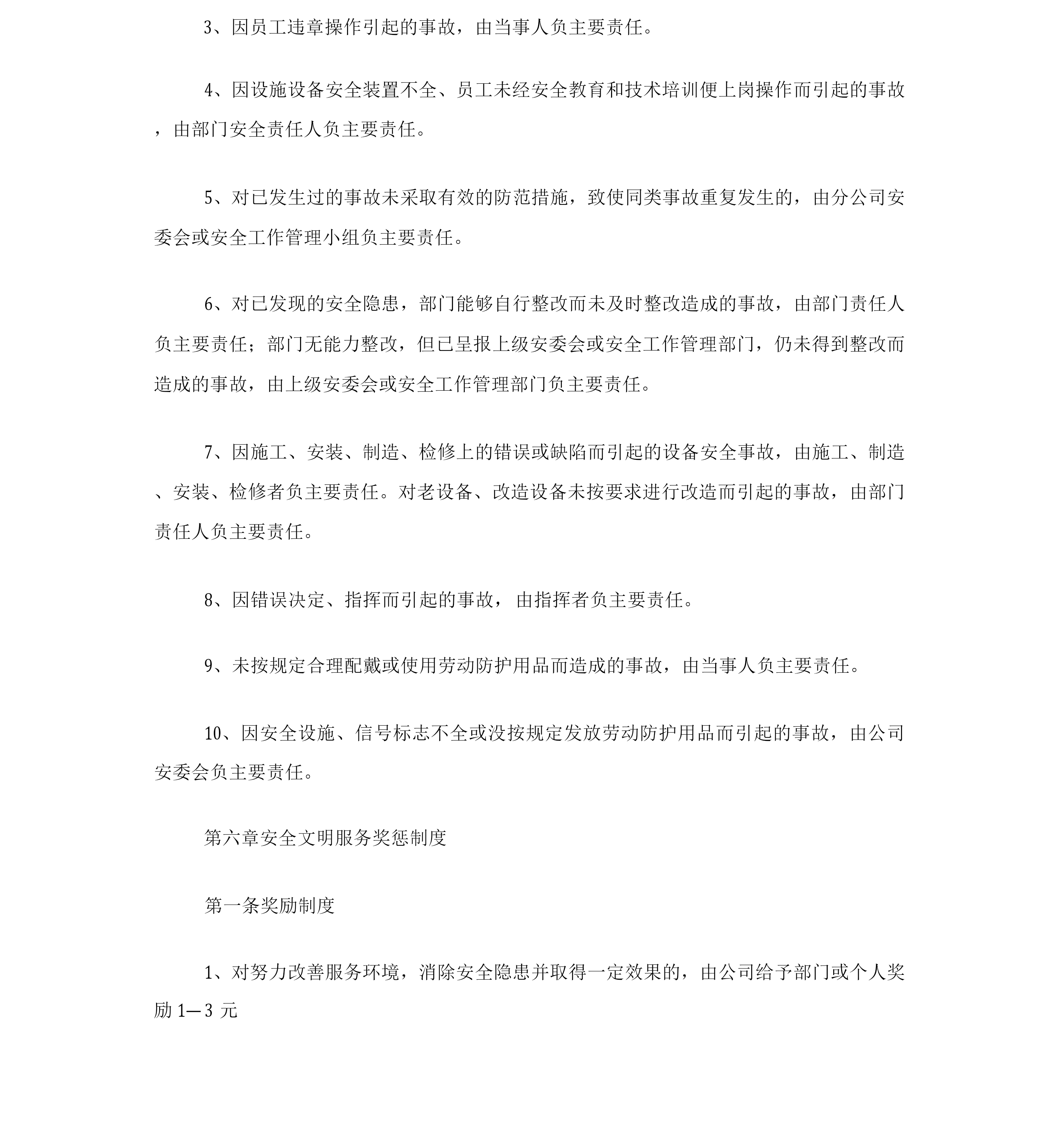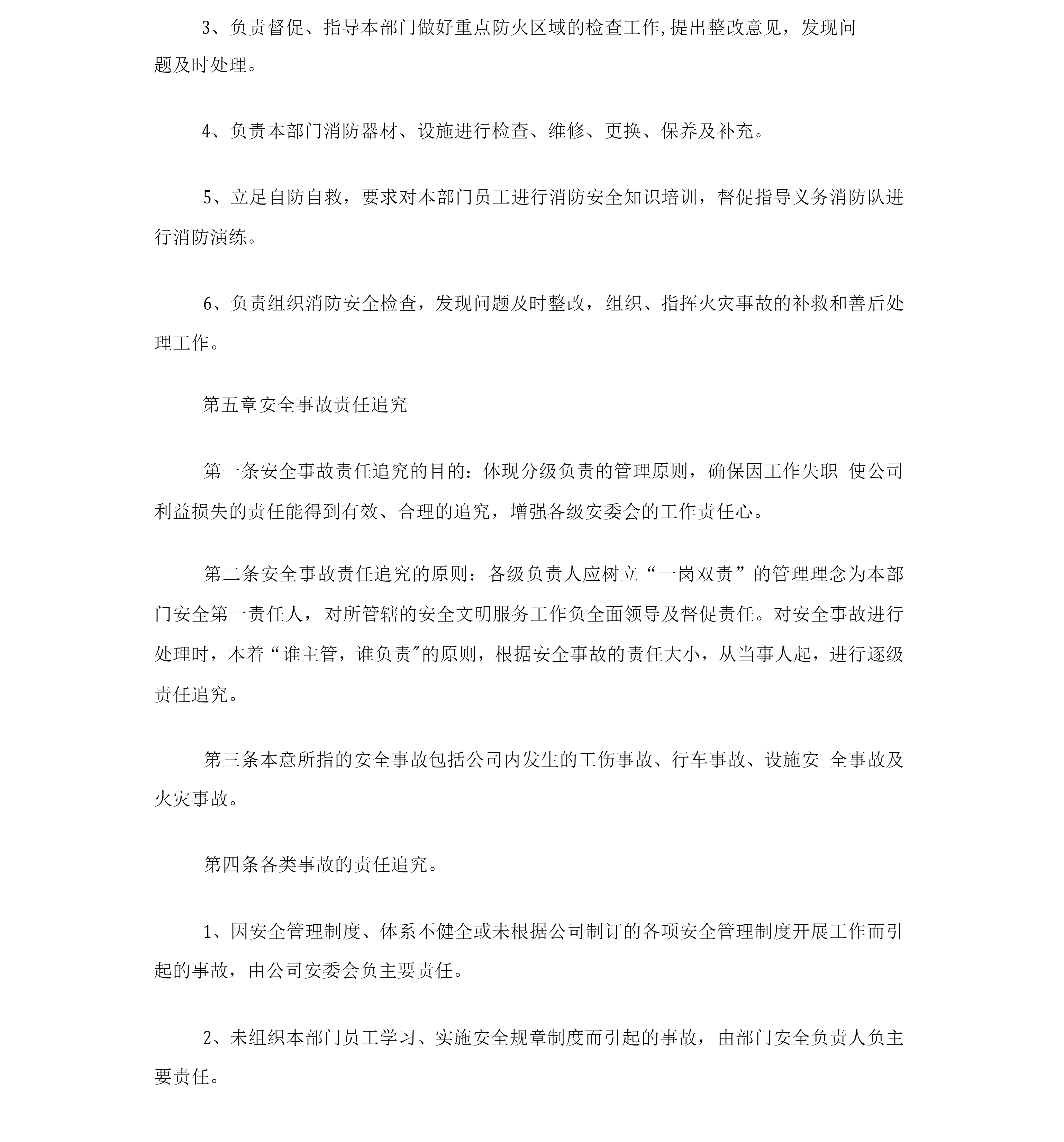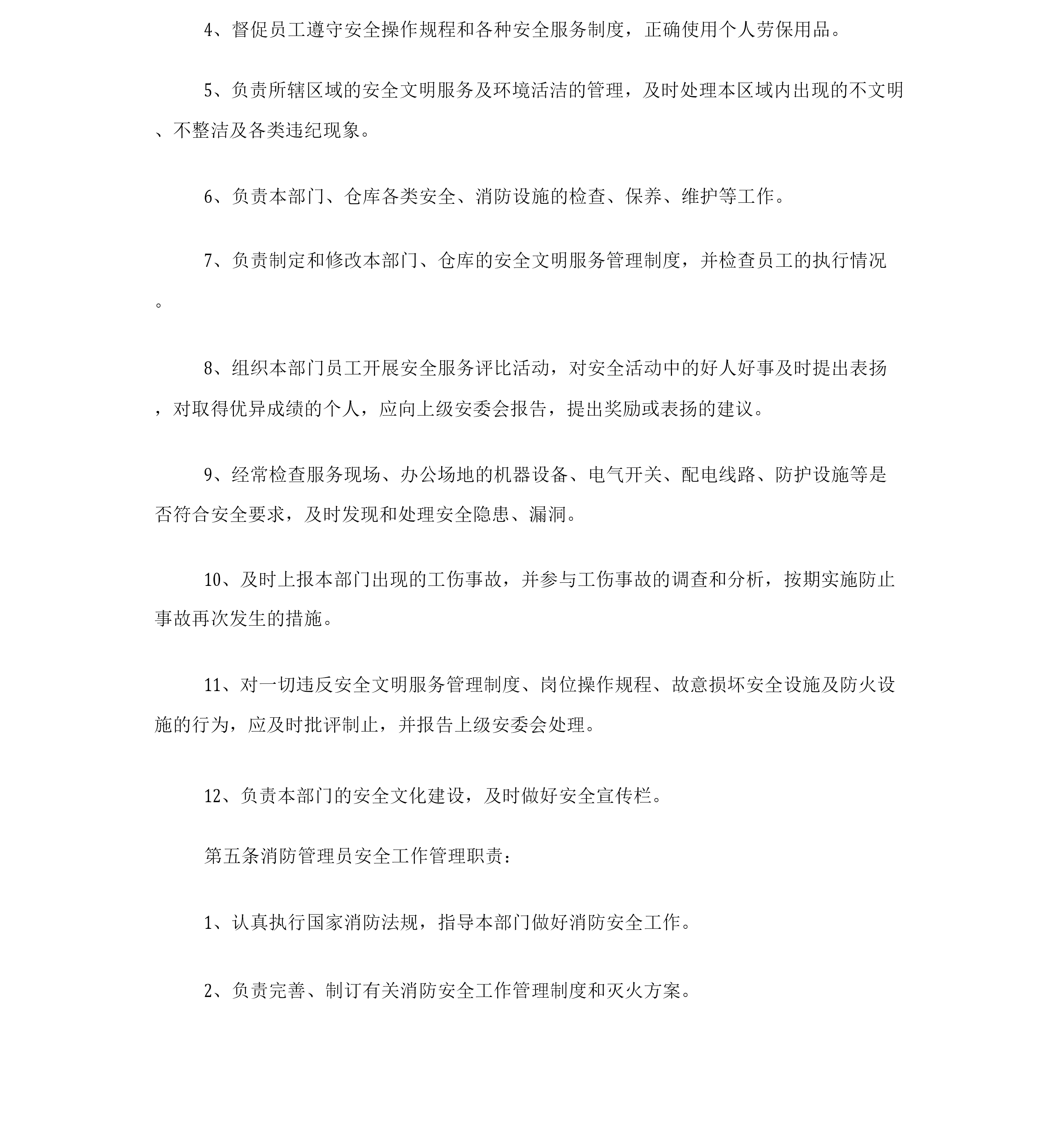 物流公司安全管理制度第一章总则为认真贯彻落实“安全第一,预防为主,综合治理”的安全管理方针,消除隐患,创建安全文明的服务环境,切实做好各类安全事故的防范措施,维护公司财产安全,保障员工身心健康,特制订本制度。第二章适用范围本制度适用于物流公司各个职能部门以及班组。第三章管理内容本制度规定了物流公司的安全文明服务管理体系构成、各自职责、安全事故责任追究、安全文明服务奖惩制度、安全文明服务及三级教育制度。第四章安全文明服务管理体系构成及各自职责第一条物流公司的安全管理体系的构成划分安全委员会,下设综合科、场站班、大车班和小车班的安全管理小组,安全管理小组成员中设消防管理员。第二条安委会及安全工作管理小组实行逐级责任制,下一级对上一级负责,并签订安全责任状,各管理部门签订至部门负责人,仓库主管。第三条物流公司安委会安全管理职责:1、认真贯彻执行(国家)上级有关安全生产及有关劳动保护的方针、政策,组织推动公司物流的安全生产工作,改善劳动条件。2、负责指导各职能部门制订、完善或修订包括紧急预案、车辆安全、危险点源等各项安全管理制度和安全操作规程,并监督各部门的执行情况。3、负责组织召开季度、年度安全工作会议,做好员工的安全文明服务教育(三级教育)、培训工作。4、负责对各职能部门的服务现场及劳动安全防护用品的发放和使用情况进行不定期检查、考核,对检查中存在的隐患漏洞提出意见,并限期整改。5、指导、监督各职能部门进行日常现场管理,做好检查和评比工作。6、负责汇总和审查各职能部门的安全文明服务工作计划,并检查其实施、执行情况。7、负责处理各类重大安全事故(包括工伤事故、火警事故、交通事故等)。8、负责重大安全事故的统计与上报,参加事故的调查和分析,并按照“三不放过”的原则(即事故原因不活不放过;事故责任者和员工没有受到教育不放过;没有防范措施不放过)对发生的事故进行处理。9、负责对物流范围内各项新建、改建的基建工程的施工按照“三同时”的要求进行安全监督,对不符合安全要求,提出整改措施,并督促其限期完成。第四条各部门、职能部门、仓库安全文明服务管理小组职责:1、认真贯彻执行上级安委会安全文明服务工作的制度、方针和决定,并及时向员工传达。2、负责开展本部门、仓库的安全文明服务工作。3、经常对员工进行安全服务知识教育,特别是对新员工及更换工种的员工进行培训和考核4、督促员工遵守安全操作规程和各种安全服务制度,正确使用个人劳保用品。5、负责所辖区域的安全文明服务及环境活洁的管理,及时处理本区域内出现的不文明、不整洁及各类违纪现象。6、负责本部门、仓库各类安全、消防设施的检查、保养、维护等工作。7、负责制定和修改本部门、仓库的安全文明服务管理制度,并检查员工的执行情况。8、组织本部门员工开展安全服务评比活动,对安全活动中的好人好事及时提出表扬,对取得优异成绩的个人,应向上级安委会报告,提出奖励或表扬的建议。9、经常检查服务现场、办公场地的机器设备、电气开关、配电线路、防护设施等是否符合安全要求,及时发现和处理安全隐患、漏洞。10、及时上报本部门出现的工伤事故,并参与工伤事故的调查和分析,按期实施防止事故再次发生的措施。11、对一切违反安全文明服务管理制度、岗位操作规程、故意损坏安全设施及防火设施的行为,应及时批评制止,并报告上级安委会处理。12、负责本部门的安全文化建设,及时做好安全宣传栏。第五条消防管理员安全工作管理职责:1、认真执行国家消防法规,指导本部门做好消防安全工作。2、负责完善、制订有关消防安全工作管理制度和灭火方案。3、负责督促、指导本部门做好重点防火区域的检查工作,提出整改意见,发现问题及时处理。4、负责本部门消防器材、设施进行检查、维修、更换、保养及补充。5、立足自防自救,要求对本部门员工进行消防安全知识培训,督促指导义务消防队进行消防演练。6、负责组织消防安全检查,发现问题及时整改,组织、指挥火灾事故的补救和善后处理工作。第五章安全事故责任追究第一条安全事故责任追究的目的:体现分级负责的管理原则,确保因工作失职使公司利益损失的责任能得到有效、合理的追究,增强各级安委会的工作责任心。第二条安全事故责任追究的原则:各级负责人应树立“一岗双责”的管理理念为本部门安全第一责任人,对所管辖的安全文明服务工作负全面领导及督促责任。对安全事故进行处理时,本着“谁主管,谁负责"的原则,根据安全事故的责任大小,从当事人起,进行逐级责任追究。第三条本意所指的安全事故包括公司内发生的工伤事故、行车事故、设施安全事故及火灾事故。第四条各类事故的责任追究。1、因安全管理制度、体系不健全或未根据公司制订的各项安全管理制度开展工作而引起的事故,由公司安委会负主要责任。2、未