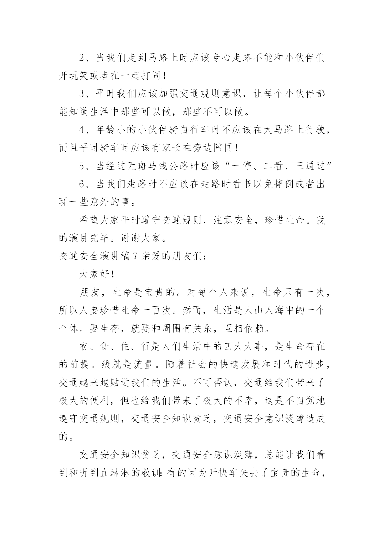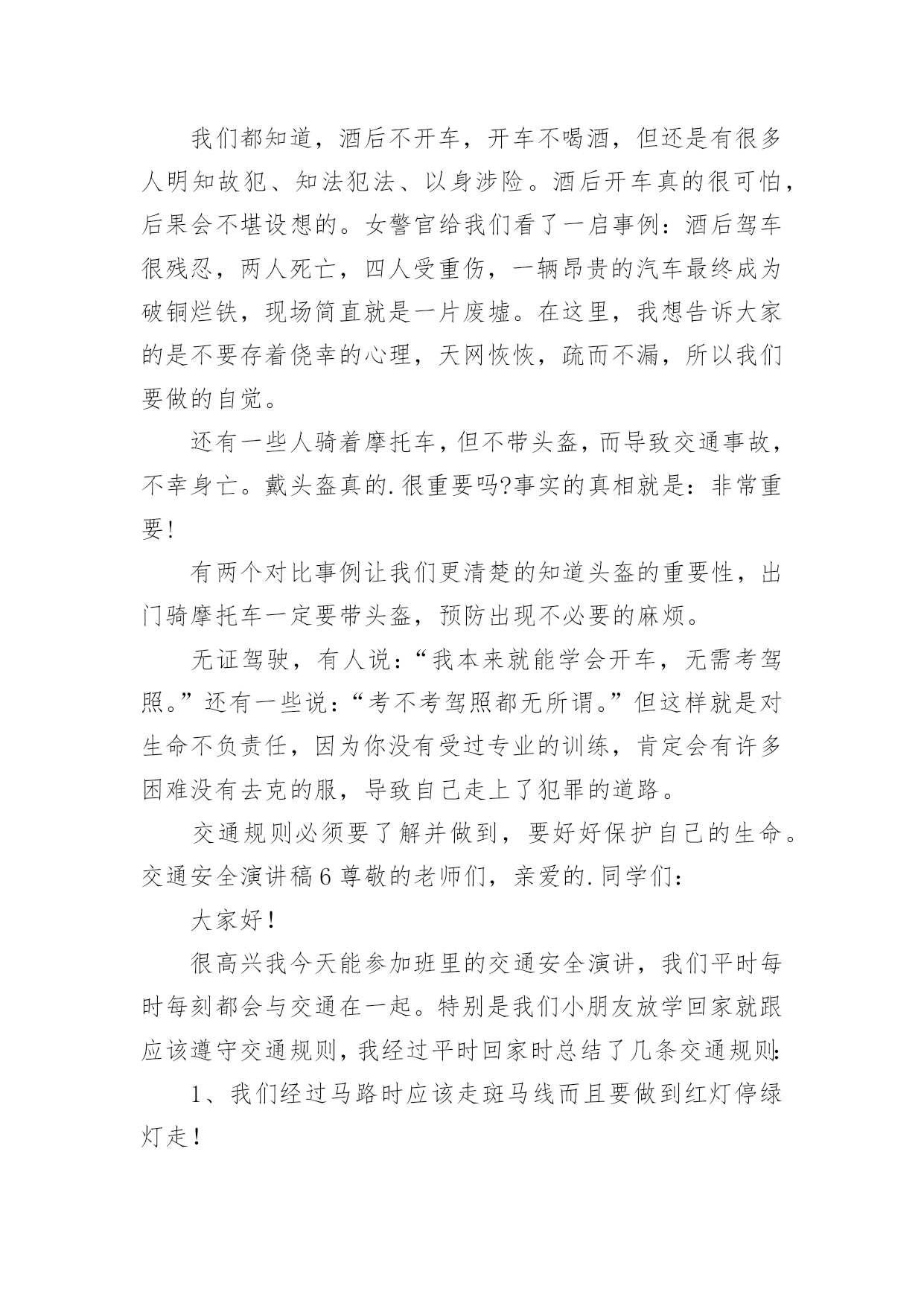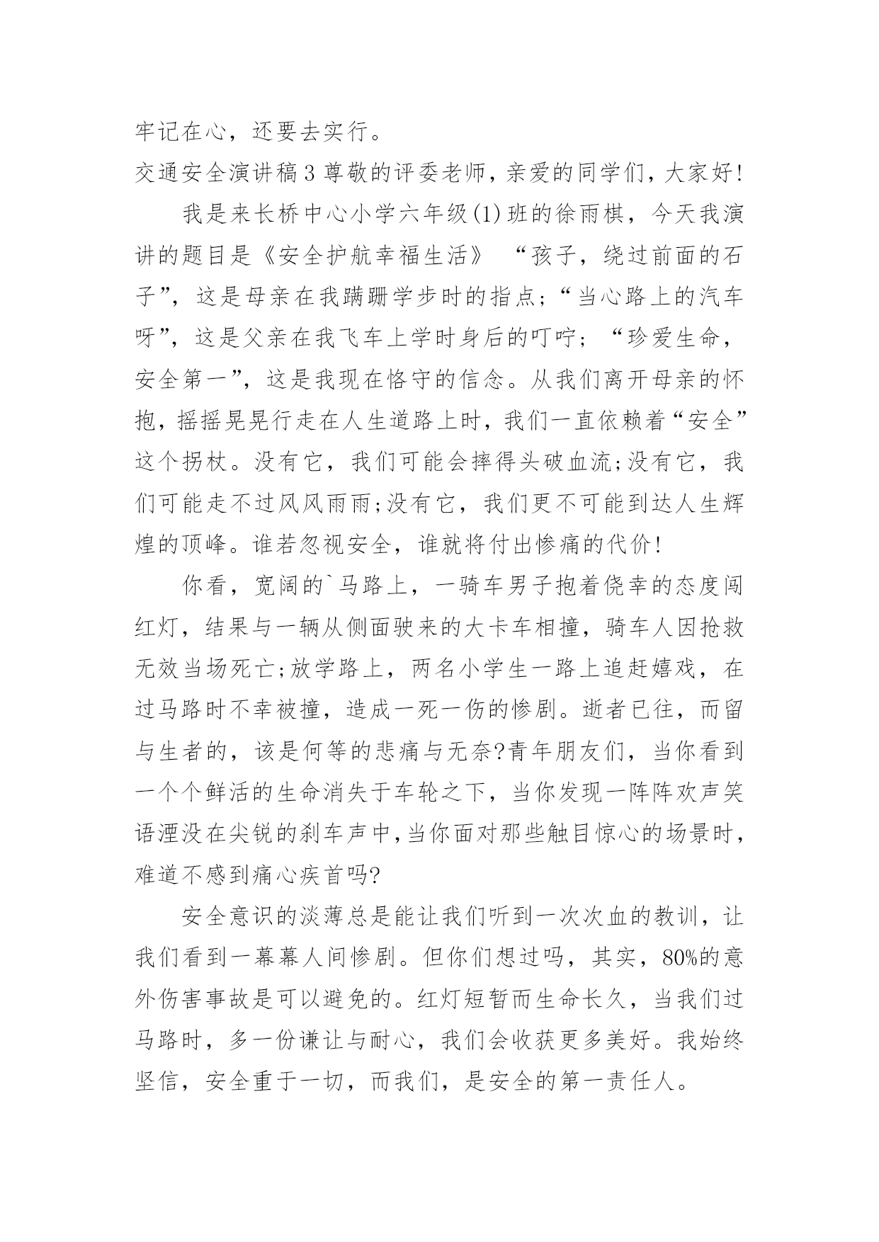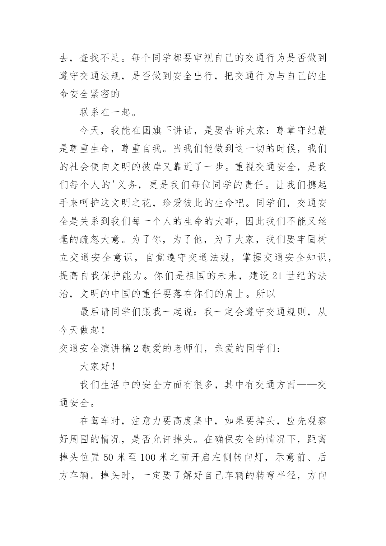 交通安全演讲稿交通安全演讲稿演讲稿是一种实用性比较强的文稿,是为演讲准备的书面材料。在我们平凡的日常里,演讲稿应用范围愈来愈广泛,那么,怎么去写演讲稿呢?以下是小编精心整理的交通安全演讲稿,希望对大家有所帮助。交通安全演讲稿1红灯短暂而生命长久,为了更好的宣传交通安全知识,更好的珍视我们的生命,就要把"增强交通安全意识提高自我保护能力"这一交通安全主题贯穿于现实生活的每一天,并以此为契机把交通安全教育深入持久的搞下去,真正抓出实效。在此,向全体师生再次发出倡议:1,我们要认真学习交通安全的法律法规,遵守交通规则,加强安全意识,树立交通安全文明公德。2,当我们徒步行走于人来车往的马路时,请时刻保持清醒的头脑,不在马路上嬉戏打闹,密切注意机动车的行驶情况,预防交通事故的发生。3,当我们穿马路时,多一份谦让与耐心,不闯红灯,走人行横道,绝不能为贪一时之快横穿马路。4,严禁12周岁以下的学生骑自行车。5,放学后不要在校门口因等人而堵塞交通,有车接送的同学,要告诉家长尽量不要因停车而影响同学们的出行,停车时离校门要远一些。6,倡议各班组织召开一次交通安全主题班会,总结过去,查找不足。每个同学都要审视自己的交通行为是否做到遵守交通法规,是否做到安全出行,把交通行为与自己的生命安全紧密的联系在一起。今天,我能在国旗下讲话,是要告诉大家:尊章守纪就是尊重生命,尊重自我。当我们能做到这一切的时候,我们的社会便向文明的彼岸又靠近了一步。重视交通安全,是我们每个人的'义务,更是我们每位同学的责任。让我们携起手来呵护这文明之花,珍爱彼此的生命吧。同学们,交通安全是关系到我们每一个人的生命的大事,因此我们不能又丝毫的疏忽大意。为了你,为了他,为了大家,我们要牢固树立交通安全意识,自觉遵守交通法规,掌握交通安全知识,提高自我保护能力。你们是祖国的未来,建设21世纪的法治,文明的中国的重任要落在你们的肩上。所以最后请同学们跟我一起说:我一定会遵守交通规则,从今天做起!交通安全演讲稿2敬爱的老师们,亲爱的同学们:大家好!我们生活中的安全方面有很多,其中有交通方面——交通安全。在驾车时,注意力要高度集中,如果要掉头,应先观察好周围的情况,是否允许掉头。在确保安全的情况下,距离掉头位置50米至100米之前开启左侧转向灯,示意前、后方车辆。掉头时,一定要了解好自己车辆的转弯半径,方向盘打几把最为合适。速度不宜过快,不要因为自己的车辆配备有ESP(电子稳定系统),就将车速提高。毕竟系统也是有盲点的.。甚至有时会失灵。所以,不要逞能。还要时刻关注“三镜”(两侧后视镜,车内后视镜),确保万无一失。如果这里不允许掉头。就要继续行车,寻找最佳位置,进行掉头。千万不要不遵守规定,否则,后果严重。要超车时,要提前开启相应方向的转向灯,并且,眼睛要注视着相应方向的后视镜。有超车灯的车辆,可以根据情况,调整超车灯闪烁的次数。千万不要强行超车。不要疲劳驾驶、酒后驾驶。开车要礼让,在两辆车逆行同时通过一条小路时,两方中有一方要停车让行。小型车礼让大型车。否则,两辆车谁也无法通过。行车时,要选择好自己的车道。不要占用紧急车道和超车道。不要在两条线中间行车;也要注意前方车辆的转向灯、倒车灯和刹车灯是否起亮,要提前做出判断。在一些不配备行车自动落锁或感速式自动落锁系统的车辆,在行驶中,一定不要拉动车门把手。如有具备“车内多动症”的儿童,要让孩子坐在后排,并将后排的儿童安全锁锁上,以免发生意外。孩子坐车时,身子的距离一定要远离安全气囊(超过20厘米),否则,会影响安全气囊的爆开。不系安全带,一定要远离安全气囊。很小的孩子要选用儿童座椅。并且要固定牢固。我们要认识一些交通标志,汽车的车灯。过马路要走斑马线……我以后要多了解一些有关于交通安全的常识,并且牢记在心,还要去实行。交通安全演讲稿3尊敬的评委老师,亲爱的同学们,大家好!我是来长桥中心小学六年级(1)班的徐雨棋,今天我演讲的题目是《安全护航幸福生活》“孩子,绕过前面的石子”,这是母亲在我蹒跚学步时的指点;“当心路上的汽车呀”,这是父亲在我飞车上学时身后的叮咛;“珍爱生命,安全第一”,这是我现在恪守的信念。从我们离开母亲的怀抱,摇摇晃晃行走在人生道路上时,我们一直依赖着“安全”这个拐杖。没有它,我们可能会摔得头破血流;没有它,我们可能走不过风风雨雨;没有它,我们更不可能到达人生辉煌的顶峰。谁若忽视安全,谁就将付出惨痛的代价!你看,宽阔的`马路上,一骑车男子抱着侥幸的态度闯红灯,结果与一辆从侧面驶来的大卡车相撞,骑车人因抢救无效当场死亡;放学路上,两名小学生一路上追赶嬉戏,在过马路时不幸被撞,造成一死一伤的惨剧。逝者已往,而留与生者的,该是何等的悲痛与无奈?青年朋友们,当你看到一个个鲜活的生命消失于车轮之下,当你发现一阵阵欢声笑语湮没在尖锐
