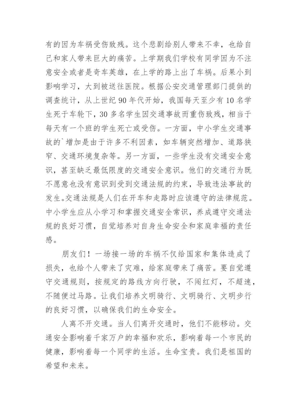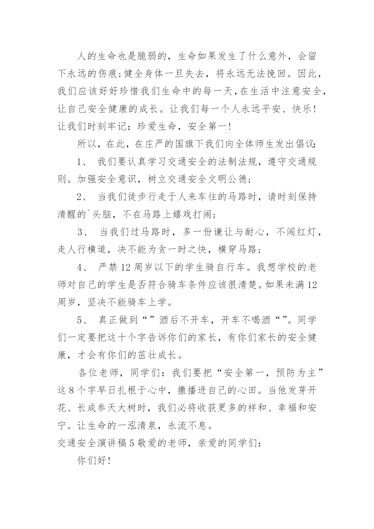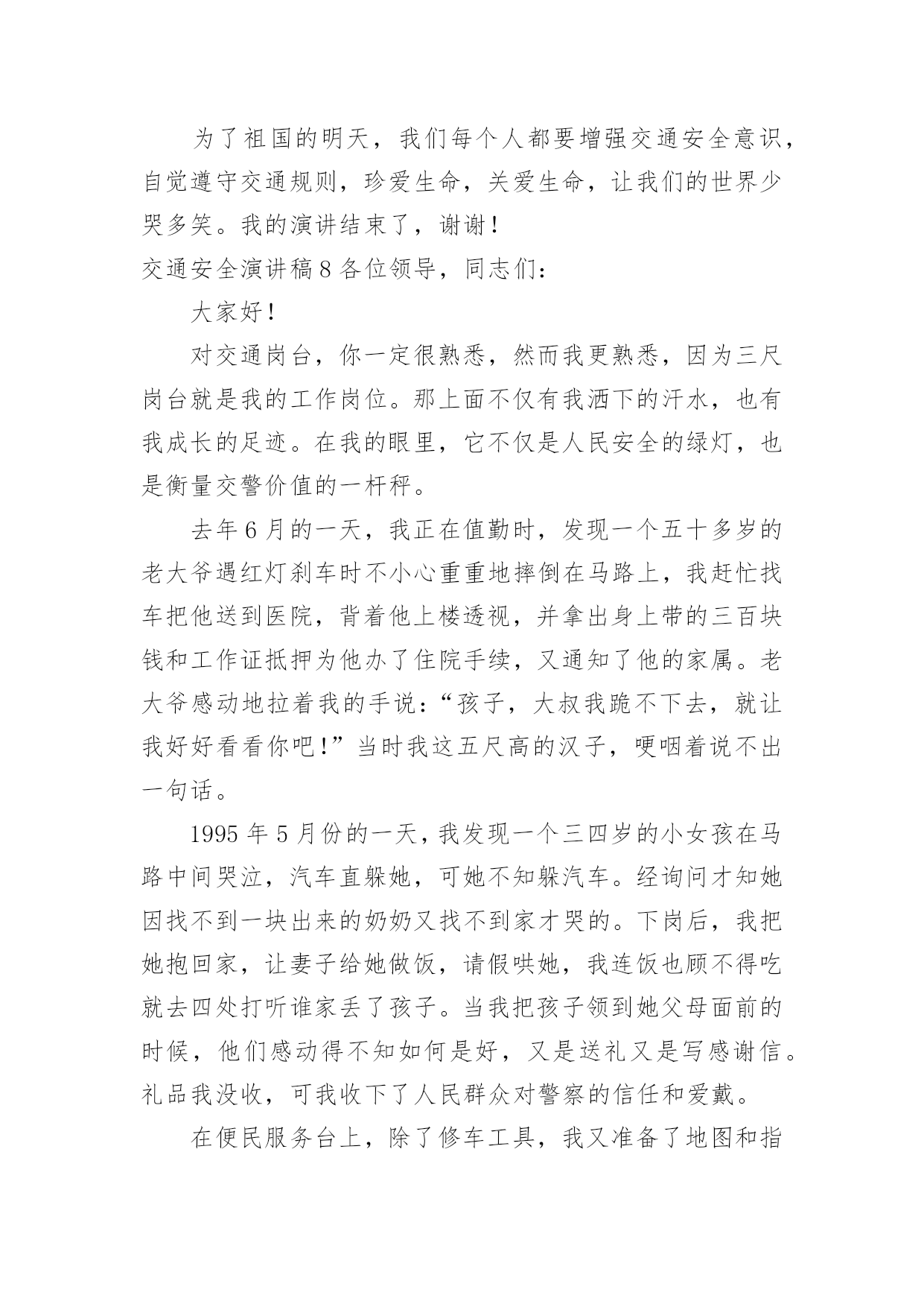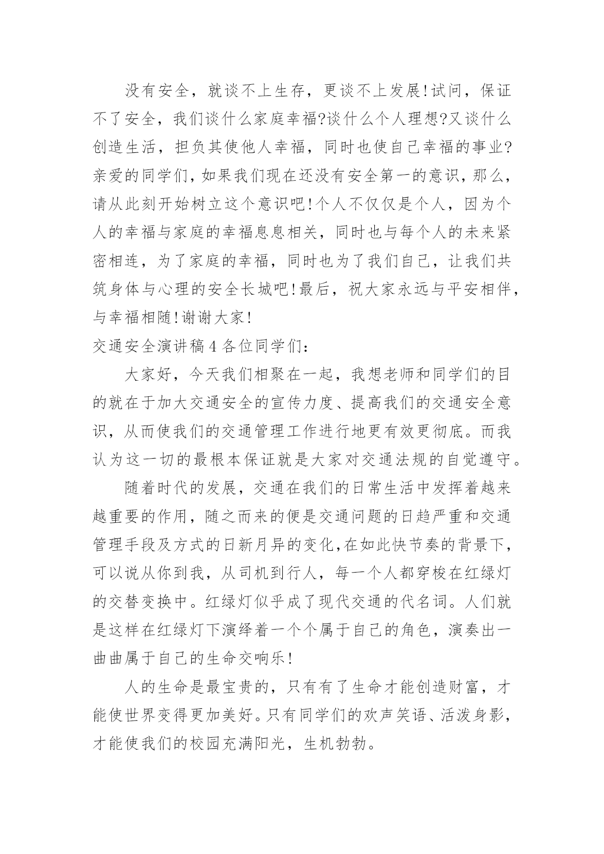 交通安全演讲稿交通安全演讲稿演讲稿是一种实用性比较强的文稿,是为演讲准备的书面材料。在我们平凡的日常里,演讲稿应用范围愈来愈广泛,那么,怎么去写演讲稿呢?以下是小编精心整理的交通安全演讲稿,希望对大家有所帮助。交通安全演讲稿1红灯短暂而生命长久,为了更好的宣传交通安全知识,更好的珍视我们的生命,就要把"增强交通安全意识提高自我保护能力"这一交通安全主题贯穿于现实生活的每一天,并以此为契机把交通安全教育深入持久的搞下去,真正抓出实效。在此,向全体师生再次发出倡议:1,我们要认真学习交通安全的法律法规,遵守交通规则,加强安全意识,树立交通安全文明公德。2,当我们徒步行走于人来车往的马路时,请时刻保持清醒的头脑,不在马路上嬉戏打闹,密切注意机动车的行驶情况,预防交通事故的发生。3,当我们穿马路时,多一份谦让与耐心,不闯红灯,走人行横道,绝不能为贪一时之快横穿马路。4,严禁12周岁以下的学生骑自行车。5,放学后不要在校门口因等人而堵塞交通,有车接送的同学,要告诉家长尽量不要因停车而影响同学们的出行,停车时离校门要远一些。6,倡议各班组织召开一次交通安全主题班会,总结过去,查找不足。每个同学都要审视自己的交通行为是否做到遵守交通法规,是否做到安全出行,把交通行为与自己的生命安全紧密的联系在一起。今天,我能在国旗下讲话,是要告诉大家:尊章守纪就是尊重生命,尊重自我。当我们能做到这一切的时候,我们的社会便向文明的彼岸又靠近了一步。重视交通安全,是我们每个人的'义务,更是我们每位同学的责任。让我们携起手来呵护这文明之花,珍爱彼此的生命吧。同学们,交通安全是关系到我们每一个人的生命的大事,因此我们不能又丝毫的疏忽大意。为了你,为了他,为了大家,我们要牢固树立交通安全意识,自觉遵守交通法规,掌握交通安全知识,提高自我保护能力。你们是祖国的未来,建设21世纪的法治,文明的中国的重任要落在你们的肩上。所以最后请同学们跟我一起说:我一定会遵守交通规则,从今天做起!交通安全演讲稿2敬爱的老师们,亲爱的同学们:大家好!我们生活中的安全方面有很多,其中有交通方面——交通安全。在驾车时,注意力要高度集中,如果要掉头,应先观察好周围的情况,是否允许掉头。在确保安全的情况下,距离掉头位置50米至100米之前开启左侧转向灯,示意前、后方车辆。掉头时,一定要了解好自己车辆的转弯半径,方向盘打几把最为合适。速度不宜过快,不要因为自己的车辆配备有ESP(电子稳定系统),就将车速提高。毕竟系统也是有盲点的.。甚至有时会失灵。所以,不要逞能。还要时刻关注“三镜”(两侧后视镜,车内后视镜),确保万无一失。如果这里不允许掉头。就要继续行车,寻找最佳位置,进行掉头。千万不要不遵守规定,否则,后果严重。要超车时,要提前开启相应方向的转向灯,并且,眼睛要注视着相应方向的后视镜。有超车灯的车辆,可以根据情况,调整超车灯闪烁的次数。千万不要强行超车。不要疲劳驾驶、酒后驾驶。开车要礼让,在两辆车逆行同时通过一条小路时,两方中有一方要停车让行。小型车礼让大型车。否则,两辆车谁也无法通过。行车时,要选择好自己的车道。不要占用紧急车道和超车道。不要在两条线中间行车;也要注意前方车辆的转向灯、倒车灯和刹车灯是否起亮,要提前做出判断。在一些不配备行车自动落锁或感速式自动落锁系统的车辆,在行驶中,一定不要拉动车门把手。如有具备“车内多动症”的儿童,要让孩子坐在后排,并将后排的儿童安全锁锁上,以免发生意外。孩子坐车时,身子的距离一定要远离安全气囊(超过20厘米),否则,会影响安全气囊的爆开。不系安全带,一定要远离安全气囊。很小的孩子要选用儿童座椅。并且要固定牢固。我们要认识一些交通标志,汽车的车灯。过马路要走斑马线……我以后要多了解一些有关于交通安全的常识,并且牢记在心,还要去实行。交通安全演讲稿3尊敬的评委老师,亲爱的同学们,大家好!我是来长桥中心小学六年级(1)班的徐雨棋,今天我演讲的题目是《安全护航幸福生活》“孩子,绕过前面的石子”,这是母亲在我蹒跚学步时的指点;“当心路上的汽车呀”,这是父亲在我飞车上学时身后的叮咛;“珍爱生命,安全第一”,这是我现在恪守的信念。从我们离开母亲的怀抱,摇摇晃晃行走在人生道路上时,我们一直依赖着“安全”这个拐杖。没有它,我们可能会摔得头破血流;没有它,我们可能走不过风风雨雨;没有它,我们更不可能到达人生辉煌的顶峰。谁若忽视安全,谁就将付出惨痛的代价!你看,宽阔的`马路上,一骑车男子抱着侥幸的态度闯红灯,结果与一辆从侧面驶来的大卡车相撞,骑车人因抢救无效当场死亡;放学路上,两名小学生一路上追赶嬉戏,在过马路时不幸被撞,造成一死一伤的惨剧。逝者已往,而留与生者的,该是何等的悲痛与无奈?青年朋友们,当你看到一个个鲜活的生命消失于车轮之下,当你发现一阵阵欢声笑语湮没在尖锐