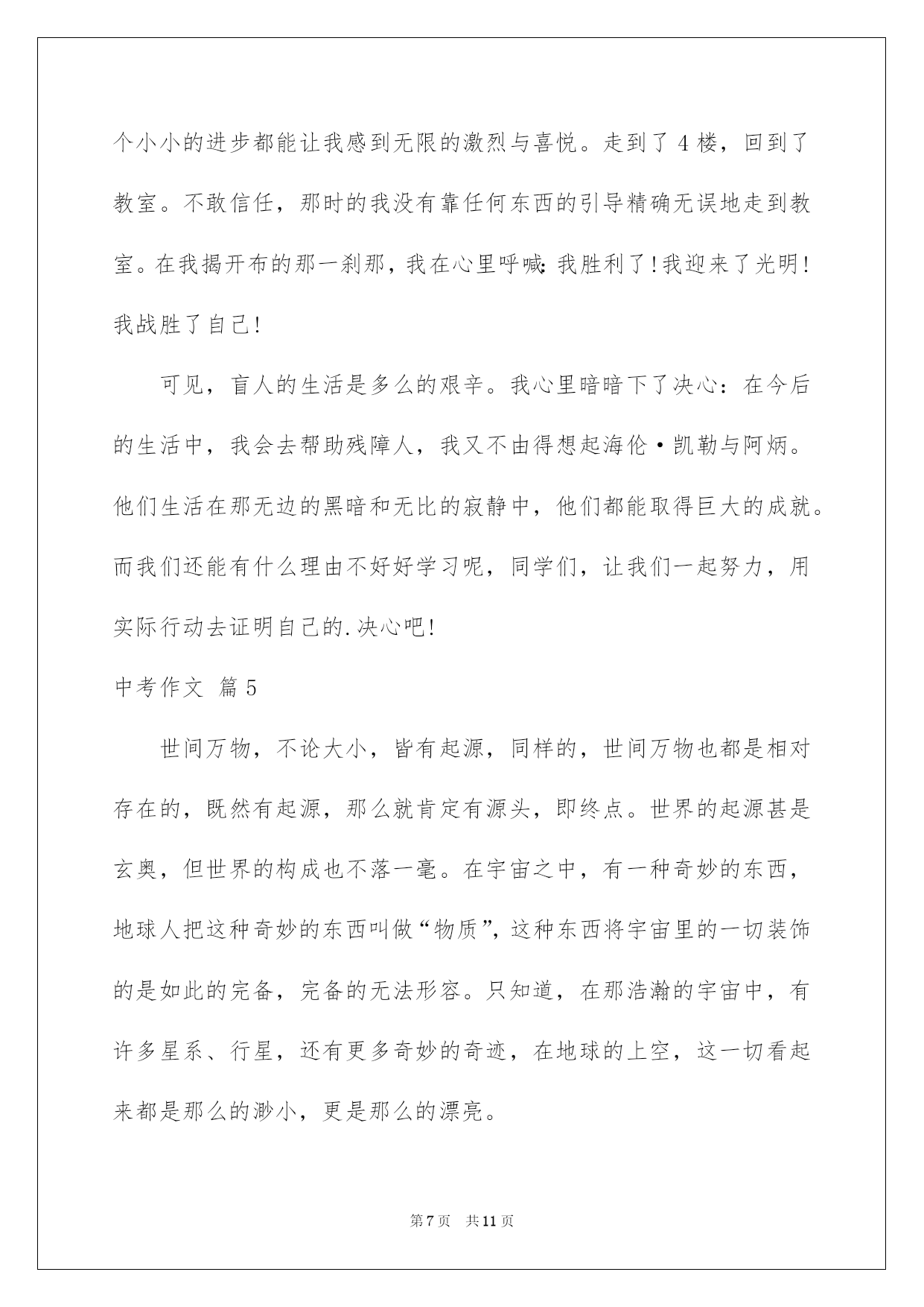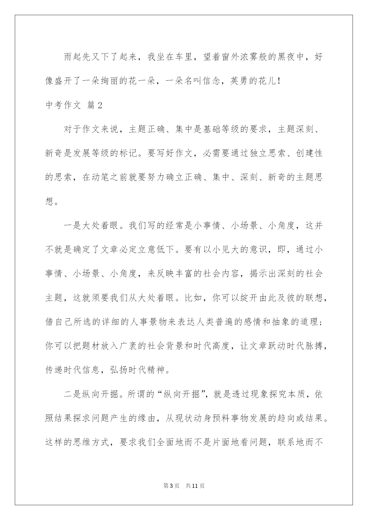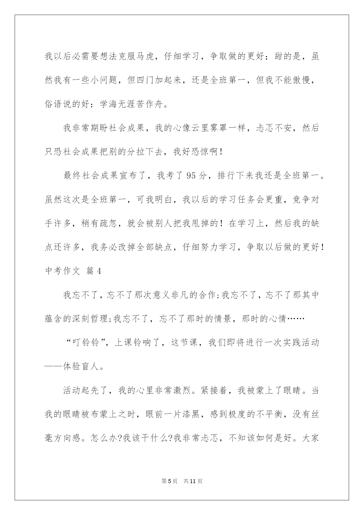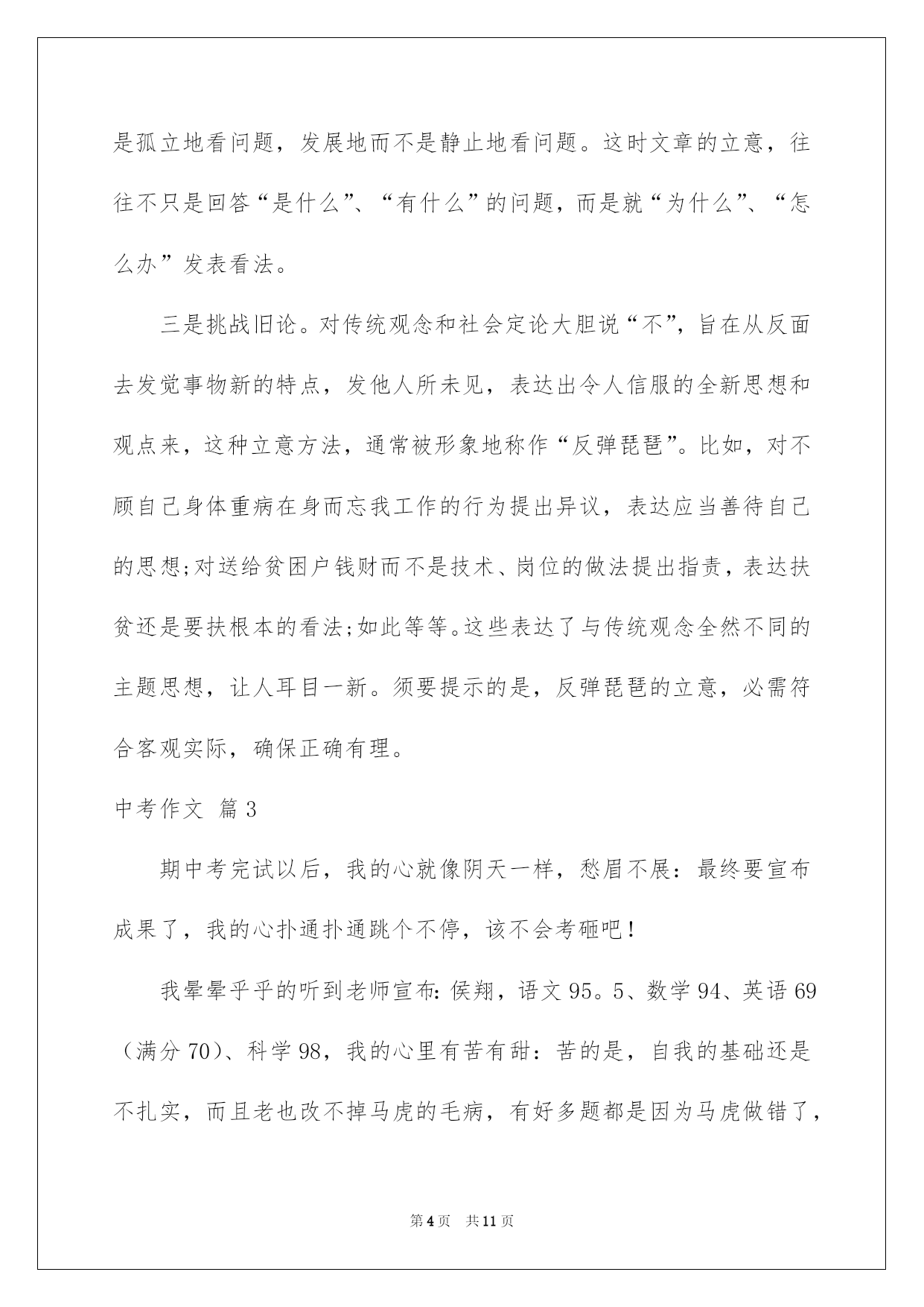 第PAGE\*Arabic\*MERGEFORMAT11页共NUMPAGES\*Arabic\*MERGEFORMAT11页第PAGE\*MERGEFORMAT11页共NUMPAGES\*MERGEFORMAT11页第PAGE\*MERGEFORMAT11页共NUMPAGES\*MERGEFORMAT11页第PAGE\*MERGEFORMAT11页共NUMPAGES\*MERGEFORMAT11页第PAGE\*MERGEFORMAT11页共NUMPAGES\*MERGEFORMAT11页第PAGE\*MERGEFORMAT11页共NUMPAGES\*MERGEFORMAT11页第PAGE\*MERGEFORMAT11页共NUMPAGES\*MERGEFORMAT11页第PAGE\*MERGEFORMAT11页共NUMPAGES\*MERGEFORMAT11页第PAGE\*MERGEFORMAT11页共NUMPAGES\*MERGEFORMAT11页第PAGE\*MERGEFORMAT11页共NUMPAGES\*MERGEFORMAT11页第PAGE\*MERGEFORMAT11页共NUMPAGES\*MERGEFORMAT11页2022中考作文精选中考作文合集六篇在学习、工作或生活中,大家总免不了要接触或运用作文吧,作文是通过文字来表达一个主题意义的记叙方法。信任写作文是一个让很多人都头痛的问题,下面是我细心整理的中考作文6篇,欢迎阅读与保藏。中考作文篇1天黑了,我的心情却还是保持着愉悦,多数的快乐细胞不断从我身上涌出来,传达着此刻喜悦的心情,因为我始终坚持着,“坚持就是成功。”这一信念,让我英勇,没落下这毕业前的一大缺憾!三点左右,惊慌,期盼刚到这儿,今日就砰砰的乱跳即希望时间过得快一点,又希望时间过得慢一点,担忧出现,心有余力而力却不足的状况,期盼的心保持着,看了看这个体育馆,静默念道,没关系,坚持就是成功,没关系,然后就英勇的走了进去。四点左右,迟疑,英勇进入体育馆快速找到了仰卧起坐和篮球的场地先做了仰卧起坐,可越到后面,脑袋里的小黑人的就争先恐后的冒出,教唆着:“放弃吧,可以休息了,”“不行以,坚持就是成功,英勇点。”小白人突然出现打断了小黑人的话,对呀,为什么不坚持呢,哪怕只是一小会儿,自己也赢了一大步,就这样,这信念又让我英勇了起来,快速完成了仰卧起坐和篮球绕杆这两场。五点左右,忐忑,信念要跑八百米了,心又在忐忑担心起来,每每轮到我跑时,总会退缩在一旁,不敢出来,“快点跑完,这八百米就完了,坚持一下”一旁老师见我这样就喊道,嗯,坚持就是成功,我英勇的走了上去,只听一声起先,我快速跑了起来,超过一个又一个同学可不到半天腿就起先酸了起来,慢慢力不从心了,脑子就像被浆糊了一下,整个人恍恍惚惚的,勉牵强强跑了一圈,腿就变得千斤重了,动作机械式的,抬起,落下,风在吼耳边轰炸着,好像蛊惑着,慢一点,停下来休息一下。不能,肯定不能停下来,坚持就是成功,信任自己,肯定能跑完,好像这一信念供应了我动力,让我英勇……最终,我跑完了800米。雨起先又下了起来,我坐在车里,望着窗外浓雾般的黑夜中,好像盛开了一朵绚丽的花一朵,一朵名叫信念,英勇的花儿!中考作文篇2对于作文来说,主题正确、集中是基础等级的要求,主题深刻、新奇是发展等级的标记。要写好作文,必需要通过独立思索、创建性的思索,在动笔之前就要努力确立正确、集中、深刻、新奇的主题思想。一是大处着眼。我们写的经常是小事情、小场景、小角度,这并不就是确定了文章必定立意低下。要有以小见大的意识,即,通过小事情、小场景、小角度,来反映丰富的社会内容,揭示出深刻的社会主题,这就须要我们从大处着眼。比如,你可以绽开由此及彼的联想,借自己所选的详细的人事景物来表达人类普遍的感情和抽象的道理;你可以把题材放入广袤的社会背景和时代高度,让文章跃动时代脉搏,传递时代信息,弘扬时代精神。二是纵向开掘。所谓的“纵向开掘”,就是透过现象探究本质,依照结果探求问题产生的缘由,从现状动身预料事物发展的趋向或结果。这样的思维方式,要求我们全面地而不是片面地看问题,联系地而不是孤立地看问题,发展地而不是静止地看问题。这时文章的立意,往往不只是回答“是什么”、“有什么”的问题,而是就“为什么”、“怎么办”发表看法。三是挑战旧论。对传统观念和社会定论大胆说“不”,旨在从反面去发觉事物新的特点,发他人所未见,表达出令人信服的全新思想和观点来,这种立意方法,通常被形象地称作“反弹琵琶”。比如,对不顾自己身体重病在身而忘我工作的行为提出异议,表达应当善待自己的思想;对送给贫