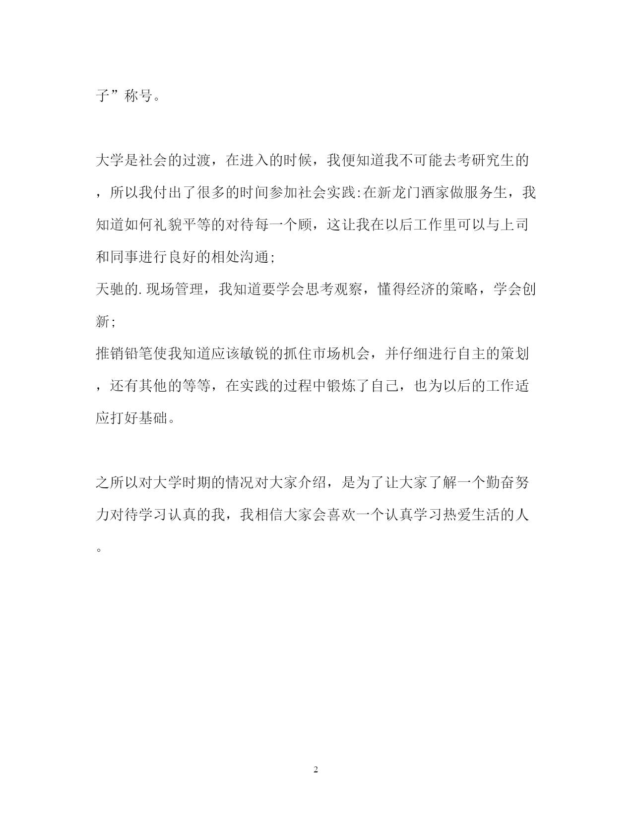 此资料由网络收集而来,如有侵权请告知上传者立即删除。资料共分享,我们负责传递知识。PAGEPAGE2商学专业研究生的自我介绍商学专业研究生的自我介绍范文大家好,我叫应届毕业生求职网,**岁。我于年****--****年就读于**大学商学院,支持我走过来并且充实度过的是我的自信,努力和上进。刚到大学时,来自农村,沉默寡言,虚荣自卑,所有与管理有关的品质自己几乎都没有,可是我相信自己有学好这个专业的信心和潜能,于是努力的学习各门知识,认真提高自己的专业能力,尤其注重英语和计算机的学习,取得了很好的成绩,并且连续*年获得奖学金。于此同时我也深深的意识到学习管理专业仅仅靠书本是不够的,能力则更为重要。于是我广泛的参加学校的活动,诸如辩论会,英文竞赛,组织同乡会等,并且扩张自己的兴趣与爱好,学习围棋,书法,口琴,日语,评弹等,它们不仅仅让我的大学生活更为充实和有趣,重要的是锻炼了我的沟通,组织的能力,提升自己的修养和品德,让我可以更好的和每个人交往,****年获得商学院分团委的“活动积极分子”称号。大学是社会的过渡,在进入的时候,我便知道我不可能去考研究生的,所以我付出了很多的时间参加社会实践:在新龙门酒家做服务生,我知道如何礼貌平等的对待每一个顾,这让我在以后工作里可以与上司和同事进行良好的相处沟通;天驰的.现场管理,我知道要学会思考观察,懂得经济的策略,学会创新;推销铅笔使我知道应该敏锐的抓住市场机会,并仔细进行自主的策划,还有其他的等等,在实践的过程中锻炼了自己,也为以后的工作适应打好基础。之所以对大学时期的情况对大家介绍,是为了让大家了解一个勤奋努力对待学习认真的我,我相信大家会喜欢一个认真学习热爱生活的人。