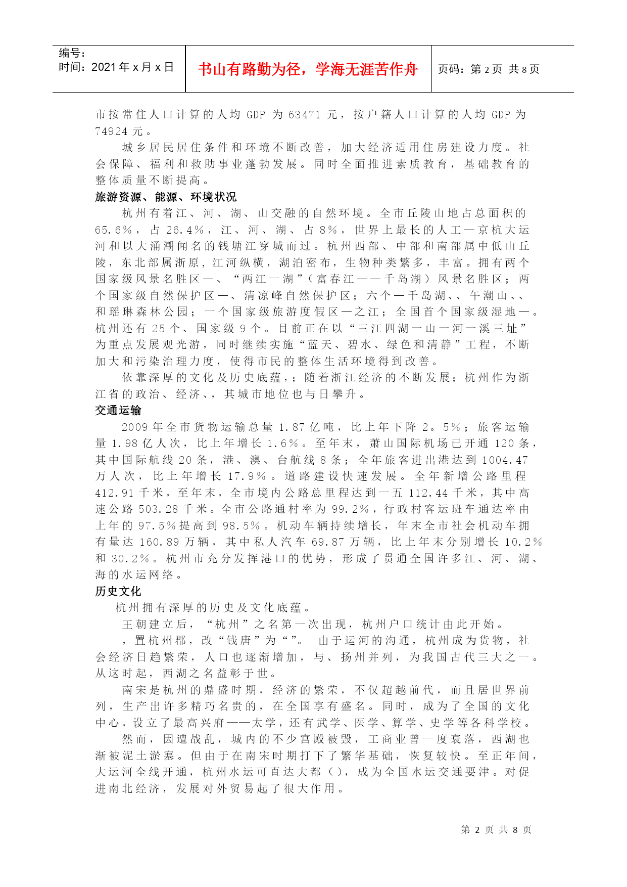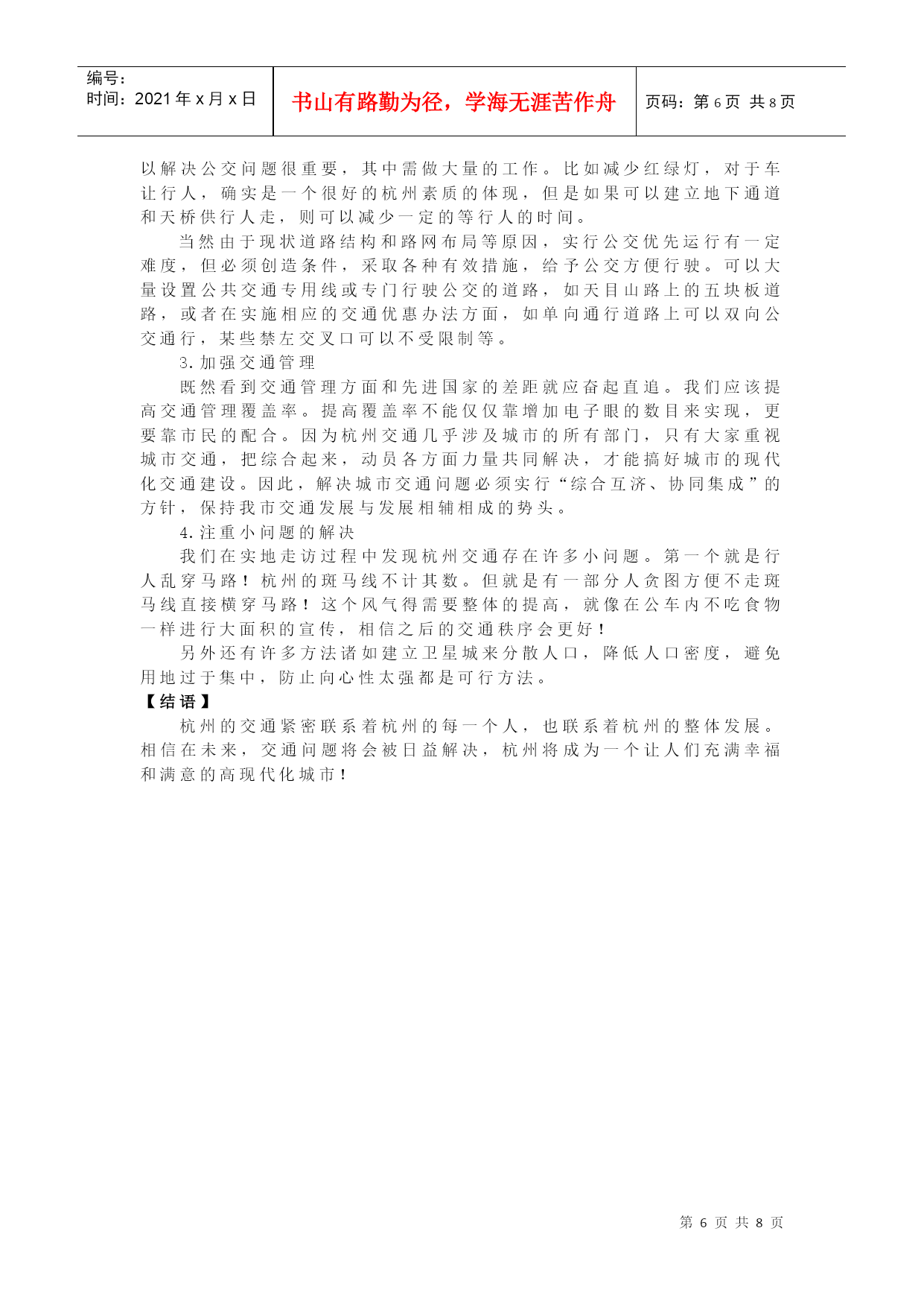 编号:时间:2021年x月x日书山有路勤为径,学海无涯苦作舟页码:第PAGE8页共NUMPAGES8页第PAGE\*MERGEFORMAT8页共NUMPAGES\*MERGEFORMAT8页HYPERLINK"xxxx/"杭州交通问题调研报告【关键词】杭州交通【摘要】杭州是一座风景秀丽,气候宜人,适合人们居住的旅游城市,然后随着城市化进程的加快,杭州正变得越来越拥挤,让住在杭州的和来杭的人们都为之不满意。此报告深入了解杭州交通状况,并试着提出可行的解决方案。【正文】地理位置杭州是浙江省省会,全省政治、经济、科教和文化中心,是全国重点风景旅游城市和历史文化名城,副省级城市。杭州地处长江三角洲南翼,杭州湾西端,钱塘江下游,京杭大运河南端,是长江三角洲重要中心城市和中国东南部交通枢纽。杭州市区中心地理坐标为北纬30°16'、东经120°12'。区划概况全市总面积1.66万平方公里,其中3068平方千米;总人口660.4万人,其中市辖区409.5万人。辖8个市辖区、2个县,代管3个,(、、、、、、、和、和、、。)共57个街道、110个镇、39个乡(包括1个乡),678个社区、65个、3666个;其中市辖区共有44个街道、49个镇、3个乡,597个社区、4个居民区、807个行政村。如今杭州跨江发展,建立了城东新城,所以功能分区如右图。人民生活水平发展状况初步核算,2009年全市实现生产总值(GDP)5098.66亿元,按可比价格计算,比上年增长10.0%。全市按常住人口计算的人均GDP为63471元,按户籍人口计算的人均GDP为74924元。城乡居民居住条件和环境不断改善,加大经济适用住房建设力度。社会保障、福利和救助事业蓬勃发展。同时全面推进素质教育,基础教育的整体质量不断提高。旅游资源、能源、环境状况杭州有着江、河、湖、山交融的自然环境。全市丘陵山地占总面积的65.6%,占26.4%,江、河、湖、占8%,世界上最长的人工—京杭大运河和以大涌潮闻名的钱塘江穿城而过。杭州西部、中部和南部属中低山丘陵,东北部属浙原,江河纵横,湖泊密布,生物种类繁多,丰富。拥有两个国家级风景名胜区—、“两江一湖”(富春江——千岛湖)风景名胜区;两个国家级自然保护区—、清凉峰自然保护区;六个—千岛湖、、午潮山、、和瑶琳森林公园;一个国家级旅游度假区—之江;全国首个国家级湿地—。杭州还有25个、国家级9个。目前正在以“三江四湖一山一河一溪三址”为重点发展观光游,同时继续实施“蓝天、碧水、绿色和清静”工程,不断加大和污染治理力度,使得市民的整体生活环境得到改善。依靠深厚的文化及历史底蕴,;随着浙江经济的不断发展;杭州作为浙江省的政治、经济、,其城市地位也与日攀升。交通运输2009年全市货物运输总量1.87亿吨,比上年下降2。5%;旅客运输量1.98亿人次,比上年增长1.6%。至年末,萧山国际机场已开通120条,其中国际航线20条,港、澳、台航线8条;全年旅客进出港达到1004.47万人次,比上年增长17.9%。道路建设快速发展。全年新增公路里程412.91千米,至年末,全市境内公路总里程达到一五112.44千米,其中高速公路503.28千米。全市公路通村率为99.2%,行政村客运班车通达率由上年的97.5%提高到98.5%。机动车辆持续增长,年末全市社会机动车拥有量达160.89万辆,其中私人汽车69.87万辆,比上年末分别增长10.2%和30.2%。杭州市充分发挥港口的优势,形成了贯通全国许多江、河、湖、海的水运网络。历史文化杭州拥有深厚的历史及文化底蕴。王朝建立后,“杭州”之名第一次出现,杭州户口统计由此开始。,置杭州郡,改“钱唐”为“”。由于运河的沟通,杭州成为货物,社会经济日趋繁荣,人口也逐渐增加,与、扬州并列,为我国古代三大之一。从这时起,西湖之名益彰于世。南宋是杭州的鼎盛时期,经济的繁荣,不仅超越前代,而且居世界前列,生产出许多精巧名贵的,在全国享有盛名。同时,成为了全国的文化中心,设立了最高兴府──太学,还有武学、医学、算学、史学等各科学校。然而,因遭战乱,城内的不少宫殿被毁,工商业曾一度衰落,西湖也渐被泥土淤塞。但由于在南宋时期打下了繁华基础,恢复较快。至正年间,大运河全线开通,杭州水运可直达大都(),成为全国水运交通要津。对促进南北经济,发展对外贸易起了很大作用。到了元年(1912),废府设市,从后的百余年间,国力不振,民生凋敝,杭州城市年久失修,工商业也困难重重,西湖的不少景点,大多残破不堪,有的已经废圮。1949年5月3日,杭州市才获得新生。而至今50年来,杭州市发生了巨大的变化。现在的杭州,是确定的全国重点风景旅游城市,国家公布的,是浙江省省会
