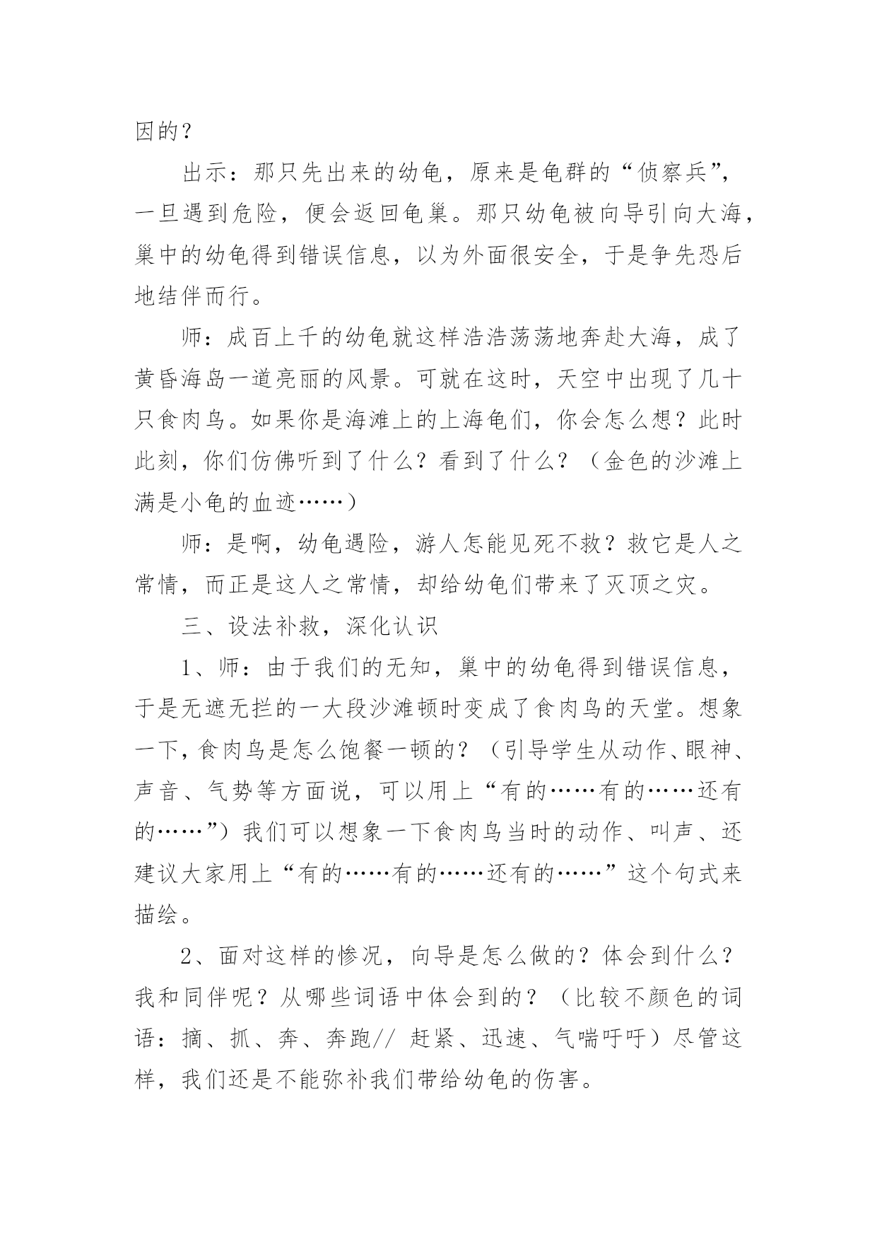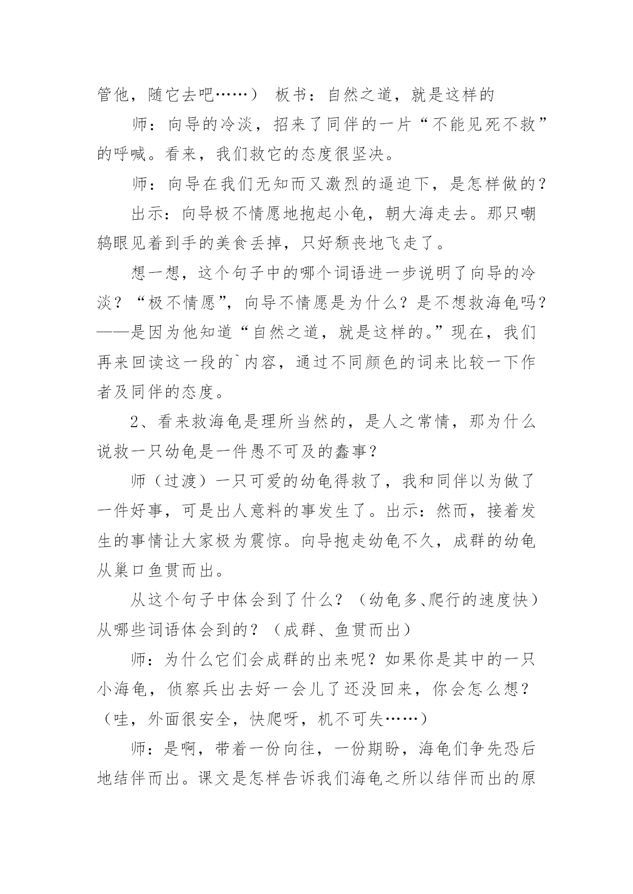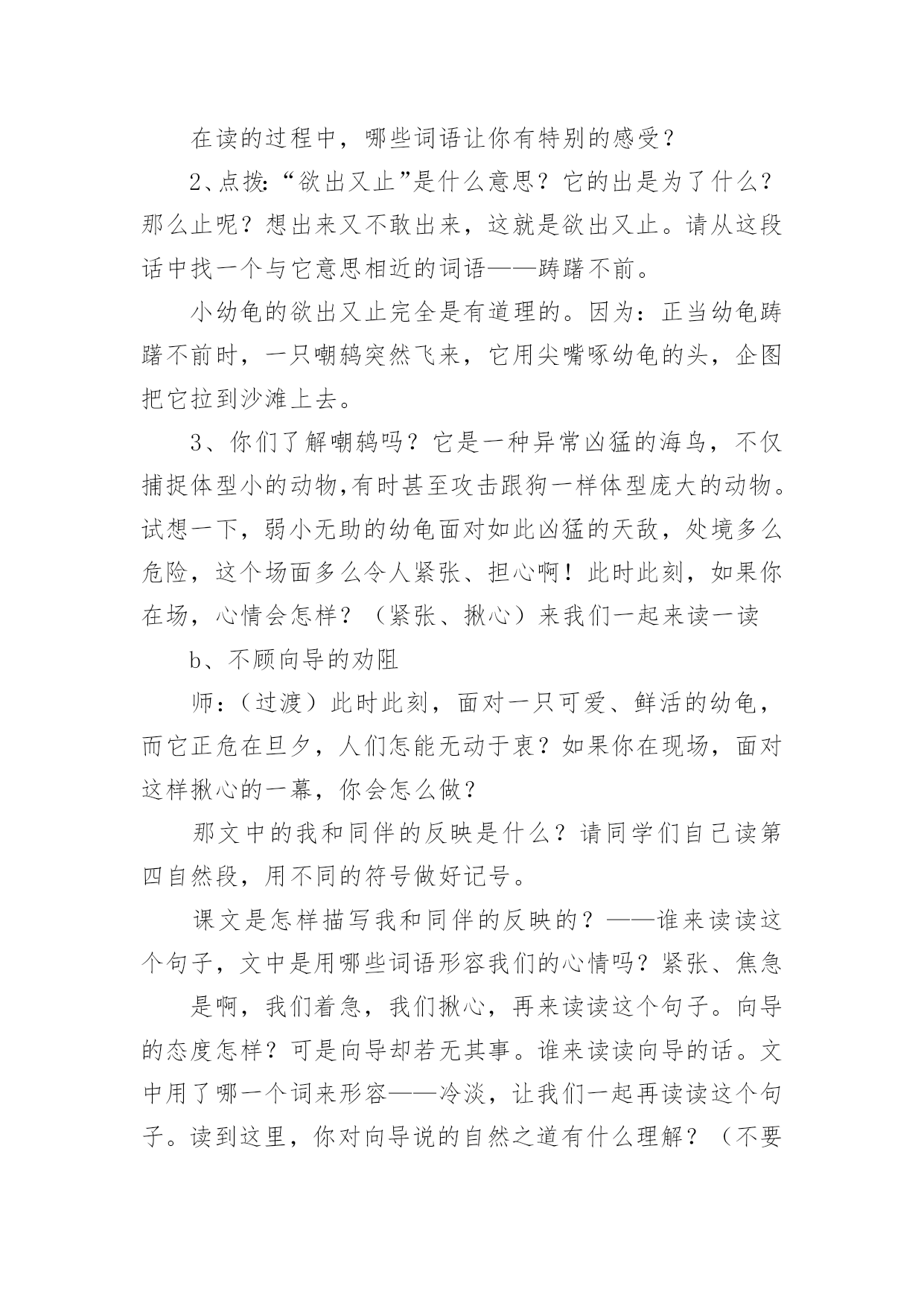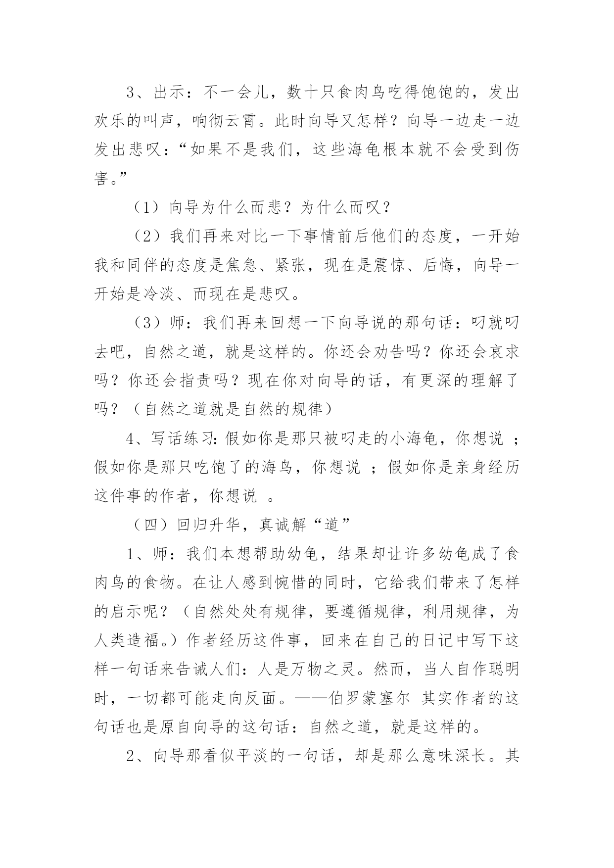 自然之道的教学设计自然之道的教学设计作为一无名无私奉献的教育工作者,有必要进行细致的教学设计准备工作,教学设计是一个系统设计并实现学习目标的过程,它遵循学习效果最优的原则吗,是课件开发质量高低的关键所在。那么什么样的教学设计才是好的呢?以下是小编帮大家整理的自然之道的教学设计,欢迎阅读与收藏。自然之道的教学设计1一、教学目标1、知识目标:掌握本课生字词。2、能力目标:有感情朗读课文,理解课文内容,体会文章表达的思想感情,从中受到做事要遵循自然规律的教育。3、情感目标:丰富见闻,激发学生探究大自然规律的兴趣。二、教学重难点1、理解课文内容,体会文章表达的思想感情,从中受到做事要遵循自然规律的教育。2、丰富见闻,激发学生探究大自然规律的兴趣。三、教学方法读出感悟法教学过程:(一)看图想象,感知惨状同学们,这节课我们继续学习第九课,请大家齐读课题。经过上节课的学习,我们已经知道课文讲的是我和同伴到(南太平洋加拉巴哥岛旅游),因(救了一只海龟)而(伤害了许多海龟的事)。这就是课文的插图。(二)探究原因,逐步悟道一、从图片上我们感受到许多的小海龟受到了海鸟的袭击,这真是惨不忍睹的一幕,造成这一惨状的原因是什么?请同学们从文中找出一句话来概括。(文中句子:我们干了一件愚不可及的蠢事)结合课文说一说,这件愚不可及的蠢事是什么?(救了一只幼龟)二、对于这件事,你们有什么疑问吗?(学生质疑)三、整理学生的问题a、我们救幼龟的原因是什么?b、为什么说救一只幼龟是一件愚不可及的蠢事?现在,就请你们打开书,带着这些问题去读一读课文,找出相关的语句并做好批注。四、交流,汇报以上问题。读完了课文,我们先来探讨第一个问题1、“我们”救幼龟的原因是什么?谁来读读你从文中找出相关的句子。a:看见探头幼龟遇险出示:突然,一只幼龟把头探出龟巢,却又欲出而止,似乎在侦察外面是否安全。正当幼龟踌躇不前时,一只嘲鸫突然飞来,它用尖嘴啄幼龟的头,企图把它拉到沙滩上去。让我们一起来读读这段文字。在读的过程中,哪些词语让你有特别的感受?2、点拨:“欲出又止”是什么意思?它的出是为了什么?那么止呢?想出来又不敢出来,这就是欲出又止。请从这段话中找一个与它意思相近的词语——踌躇不前。小幼龟的欲出又止完全是有道理的。因为:正当幼龟踌躇不前时,一只嘲鸫突然飞来,它用尖嘴啄幼龟的头,企图把它拉到沙滩上去。3、你们了解嘲鸫吗?它是一种异常凶猛的海鸟,不仅捕捉体型小的动物,有时甚至攻击跟狗一样体型庞大的动物。试想一下,弱小无助的幼龟面对如此凶猛的天敌,处境多么危险,这个场面多么令人紧张、担心啊!此时此刻,如果你在场,心情会怎样?(紧张、揪心)来我们一起来读一读b、不顾向导的劝阻师:(过渡)此时此刻,面对一只可爱、鲜活的幼龟,而它正危在旦夕,人们怎能无动于衷?如果你在现场,面对这样揪心的一幕,你会怎么做?那文中的我和同伴的反映是什么?请同学们自己读第四自然段,用不同的符号做好记号。课文是怎样描写我和同伴的反映的?——谁来读读这个句子,文中是用哪些词语形容我们的心情吗?紧张、焦急是啊,我们着急,我们揪心,再来读读这个句子。向导的态度怎样?可是向导却若无其事。谁来读读向导的话。文中用了哪一个词来形容——冷淡,让我们一起再读读这个句子。读到这里,你对向导说的自然之道有什么理解?(不要管他,随它去吧……)板书:自然之道,就是这样的师:向导的冷淡,招来了同伴的一片“不能见死不救”的呼喊。看来,我们救它的态度很坚决。师:向导在我们无知而又激烈的逼迫下,是怎样做的?出示:向导极不情愿地抱起小龟,朝大海走去。那只嘲鸫眼见着到手的美食丢掉,只好颓丧地飞走了。想一想,这个句子中的哪个词语进一步说明了向导的冷淡?“极不情愿”,向导不情愿是为什么?是不想救海龟吗?——是因为他知道“自然之道,就是这样的。”现在,我们再来回读这一段的`内容,通过不同颜色的词来比较一下作者及同伴的态度。2、看来救海龟是理所当然的,是人之常情,那为什么说救一只幼龟是一件愚不可及的蠢事?师(过渡)一只可爱的幼龟得救了,我和同伴以为做了一件好事,可是出人意料的事发生了。出示:然而,接着发生的事情让大家极为震惊。向导抱走幼龟不久,成群的幼龟从巢口鱼贯而出。从这个句子中体会到了什么?(幼龟多、爬行的速度快)从哪些词语体会到的?(成群、鱼贯而出)师:为什么它们会成群的出来呢?如果你是其中的一只小海龟,侦察兵出去好一会儿了还没回来,你会怎么想?(哇,外面很安全,快爬呀,机不可失……)师:是啊,带着一份向往,一份期盼,海龟们争先恐后地结伴而出。课文是怎样告诉我们海龟之所以结伴而出的原因的?出示:那只先出来的幼龟,原来是龟群的“侦察兵”,一旦遇到危险,便会返回龟巢。那只幼龟被向导引向大海,巢中的幼龟得到错误信息,以为外面很安全,于是争先恐后地结伴而行