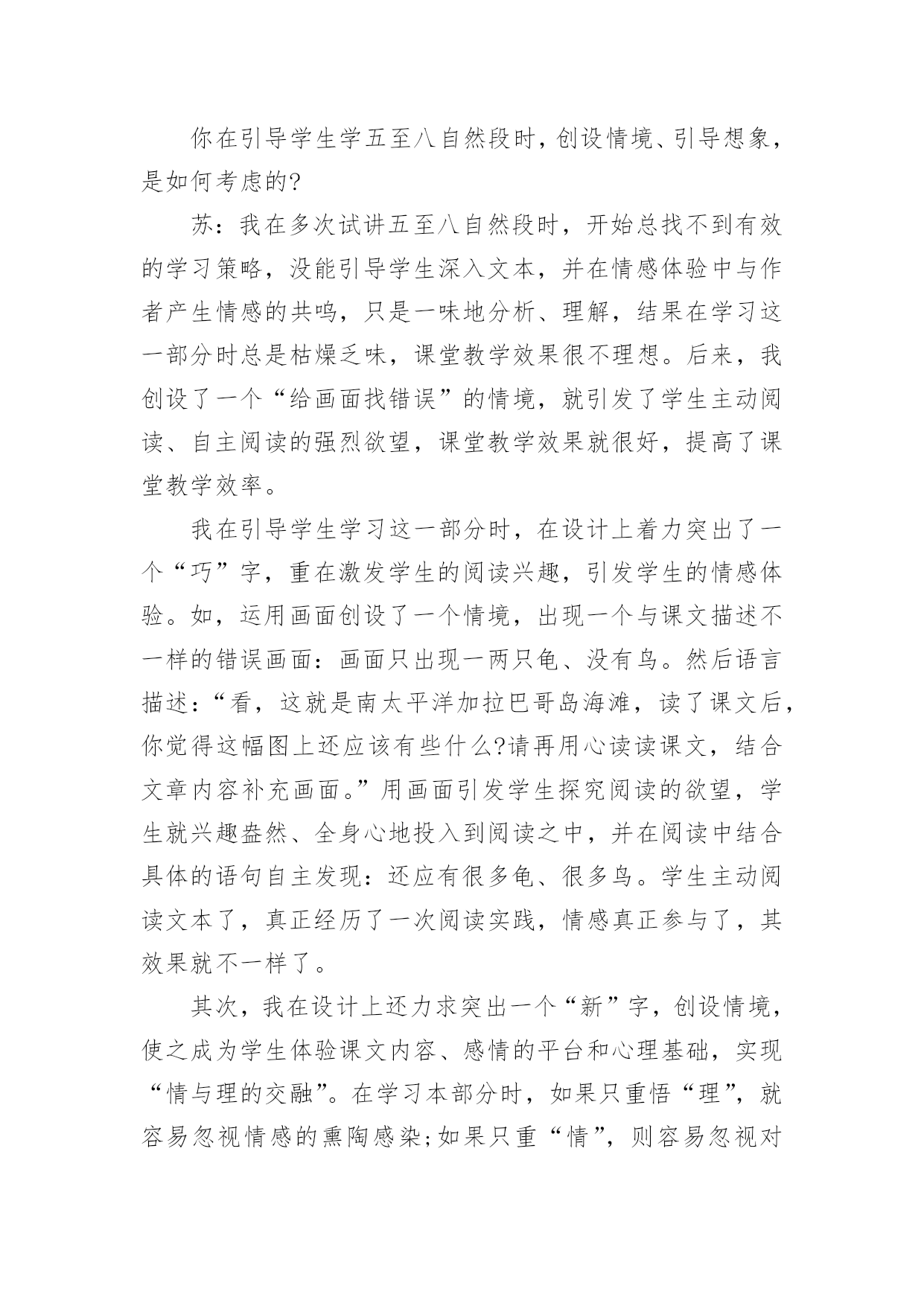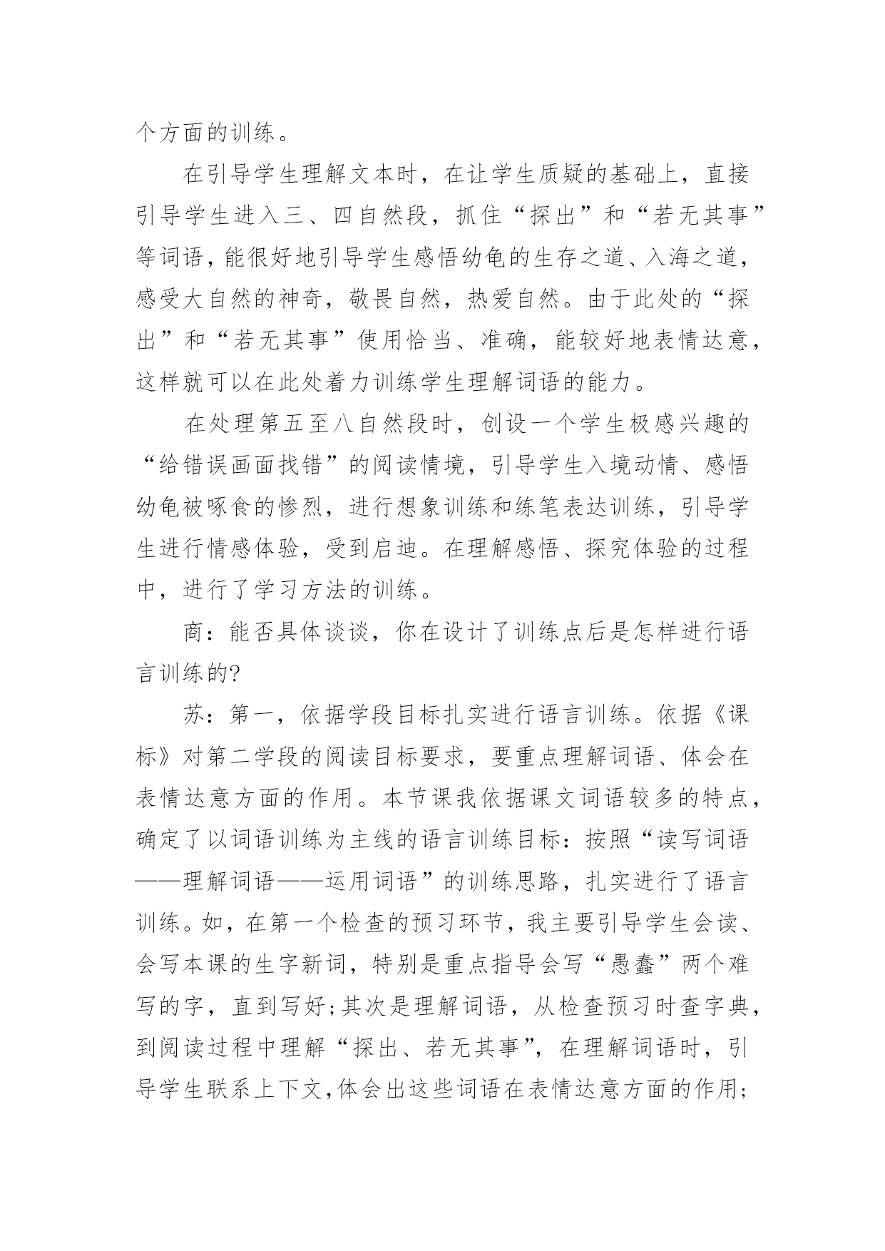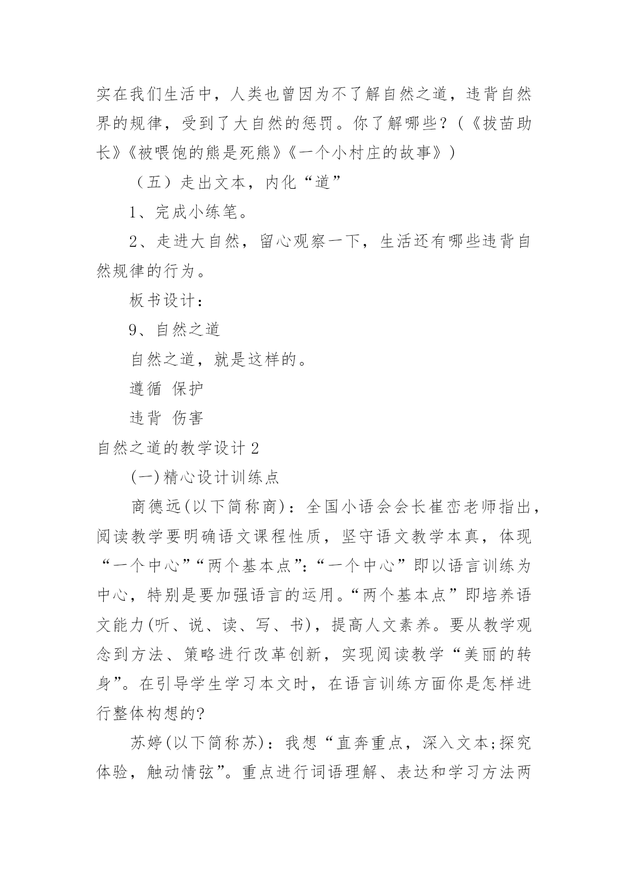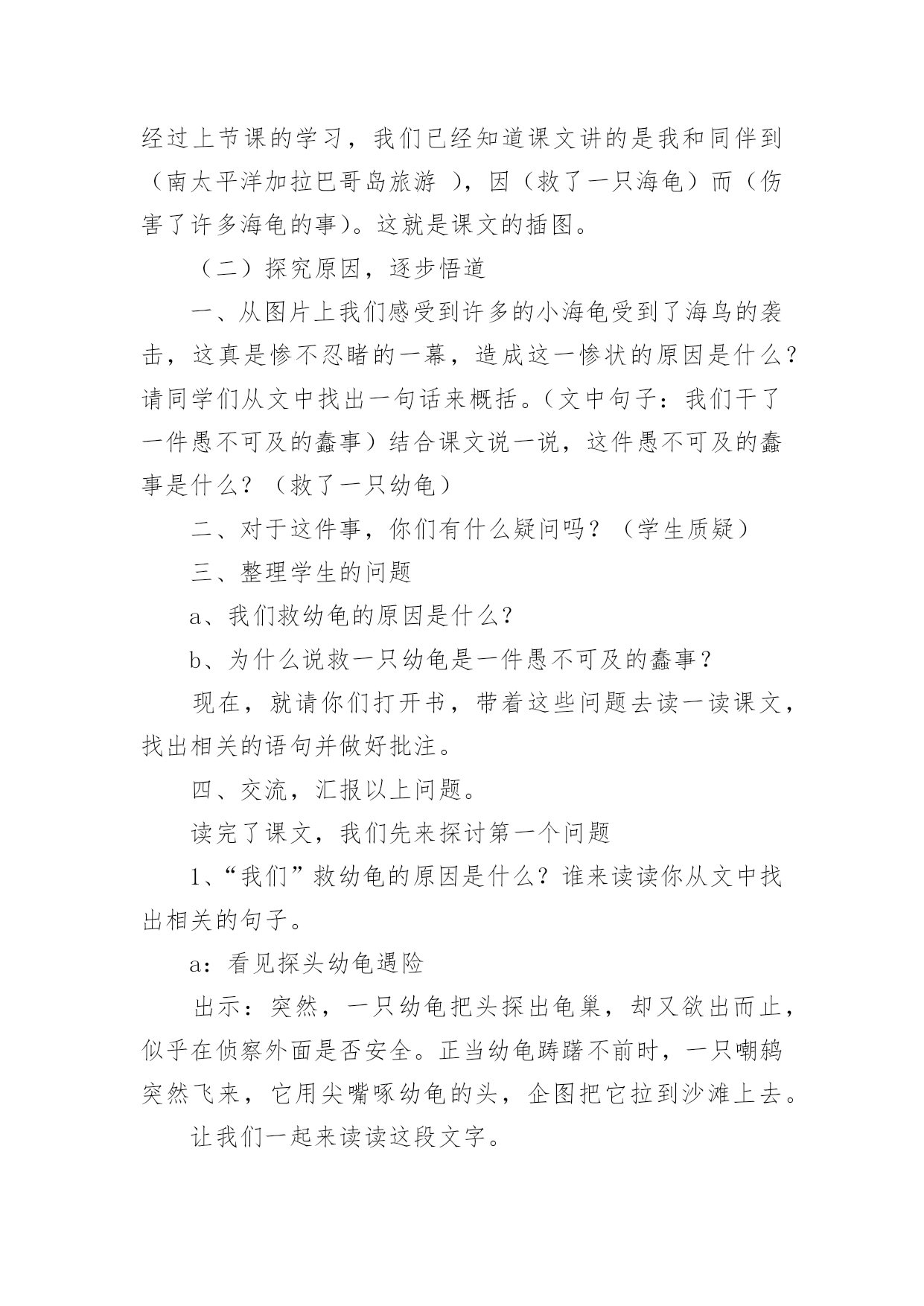 自然之道的教学设计自然之道的教学设计作为一无名无私奉献的教育工作者,有必要进行细致的教学设计准备工作,教学设计是一个系统设计并实现学习目标的过程,它遵循学习效果最优的原则吗,是课件开发质量高低的关键所在。那么什么样的教学设计才是好的呢?以下是小编帮大家整理的自然之道的教学设计,欢迎阅读与收藏。自然之道的教学设计1一、教学目标1、知识目标:掌握本课生字词。2、能力目标:有感情朗读课文,理解课文内容,体会文章表达的思想感情,从中受到做事要遵循自然规律的教育。3、情感目标:丰富见闻,激发学生探究大自然规律的兴趣。二、教学重难点1、理解课文内容,体会文章表达的思想感情,从中受到做事要遵循自然规律的教育。2、丰富见闻,激发学生探究大自然规律的兴趣。三、教学方法读出感悟法教学过程:(一)看图想象,感知惨状同学们,这节课我们继续学习第九课,请大家齐读课题。经过上节课的学习,我们已经知道课文讲的是我和同伴到(南太平洋加拉巴哥岛旅游),因(救了一只海龟)而(伤害了许多海龟的事)。这就是课文的插图。(二)探究原因,逐步悟道一、从图片上我们感受到许多的小海龟受到了海鸟的袭击,这真是惨不忍睹的一幕,造成这一惨状的原因是什么?请同学们从文中找出一句话来概括。(文中句子:我们干了一件愚不可及的蠢事)结合课文说一说,这件愚不可及的蠢事是什么?(救了一只幼龟)二、对于这件事,你们有什么疑问吗?(学生质疑)三、整理学生的问题a、我们救幼龟的原因是什么?b、为什么说救一只幼龟是一件愚不可及的蠢事?现在,就请你们打开书,带着这些问题去读一读课文,找出相关的语句并做好批注。四、交流,汇报以上问题。读完了课文,我们先来探讨第一个问题1、“我们”救幼龟的原因是什么?谁来读读你从文中找出相关的句子。a:看见探头幼龟遇险出示:突然,一只幼龟把头探出龟巢,却又欲出而止,似乎在侦察外面是否安全。正当幼龟踌躇不前时,一只嘲鸫突然飞来,它用尖嘴啄幼龟的头,企图把它拉到沙滩上去。让我们一起来读读这段文字。在读的过程中,哪些词语让你有特别的感受?2、点拨:“欲出又止”是什么意思?它的出是为了什么?那么止呢?想出来又不敢出来,这就是欲出又止。请从这段话中找一个与它意思相近的词语——踌躇不前。小幼龟的欲出又止完全是有道理的。因为:正当幼龟踌躇不前时,一只嘲鸫突然飞来,它用尖嘴啄幼龟的头,企图把它拉到沙滩上去。3、你们了解嘲鸫吗?它是一种异常凶猛的海鸟,不仅捕捉体型小的动物,有时甚至攻击跟狗一样体型庞大的动物。试想一下,弱小无助的幼龟面对如此凶猛的天敌,处境多么危险,这个场面多么令人紧张、担心啊!此时此刻,如果你在场,心情会怎样?(紧张、揪心)来我们一起来读一读b、不顾向导的劝阻师:(过渡)此时此刻,面对一只可爱、鲜活的幼龟,而它正危在旦夕,人们怎能无动于衷?如果你在现场,面对这样揪心的一幕,你会怎么做?那文中的我和同伴的反映是什么?请同学们自己读第四自然段,用不同的符号做好记号。课文是怎样描写我和同伴的反映的?——谁来读读这个句子,文中是用哪些词语形容我们的心情吗?紧张、焦急是啊,我们着急,我们揪心,再来读读这个句子。向导的态度怎样?可是向导却若无其事。谁来读读向导的话。文中用了哪一个词来形容——冷淡,让我们一起再读读这个句子。读到这里,你对向导说的自然之道有什么理解?(不要管他,随它去吧……)板书:自然之道,就是这样的师:向导的冷淡,招来了同伴的一片“不能见死不救”的呼喊。看来,我们救它的态度很坚决。师:向导在我们无知而又激烈的逼迫下,是怎样做的?出示:向导极不情愿地抱起小龟,朝大海走去。那只嘲鸫眼见着到手的美食丢掉,只好颓丧地飞走了。想一想,这个句子中的哪个词语进一步说明了向导的冷淡?“极不情愿”,向导不情愿是为什么?是不想救海龟吗?——是因为他知道“自然之道,就是这样的。”现在,我们再来回读这一段的`内容,通过不同颜色的词来比较一下作者及同伴的态度。2、看来救海龟是理所当然的,是人之常情,那为什么说救一只幼龟是一件愚不可及的蠢事?师(过渡)一只可爱的幼龟得救了,我和同伴以为做了一件好事,可是出人意料的事发生了。出示:然而,接着发生的事情让大家极为震惊。向导抱走幼龟不久,成群的幼龟从巢口鱼贯而出。从这个句子中体会到了什么?(幼龟多、爬行的速度快)从哪些词语体会到的?(成群、鱼贯而出)师:为什么它们会成群的出来呢?如果你是其中的一只小海龟,侦察兵出去好一会儿了还没回来,你会怎么想?(哇,外面很安全,快爬呀,机不可失……)师:是啊,带着一份向往,一份期盼,海龟们争先恐后地结伴而出。课文是怎样告诉我们海龟之所以结伴而出的原因的?出示:那只先出来的幼龟,原来是龟群的“侦察兵”,一旦遇到危险,便会返回龟巢。那只幼龟被向导引向大海,巢中的幼龟得到错误信息,以为外面很安全,于是争先恐后地结伴而行