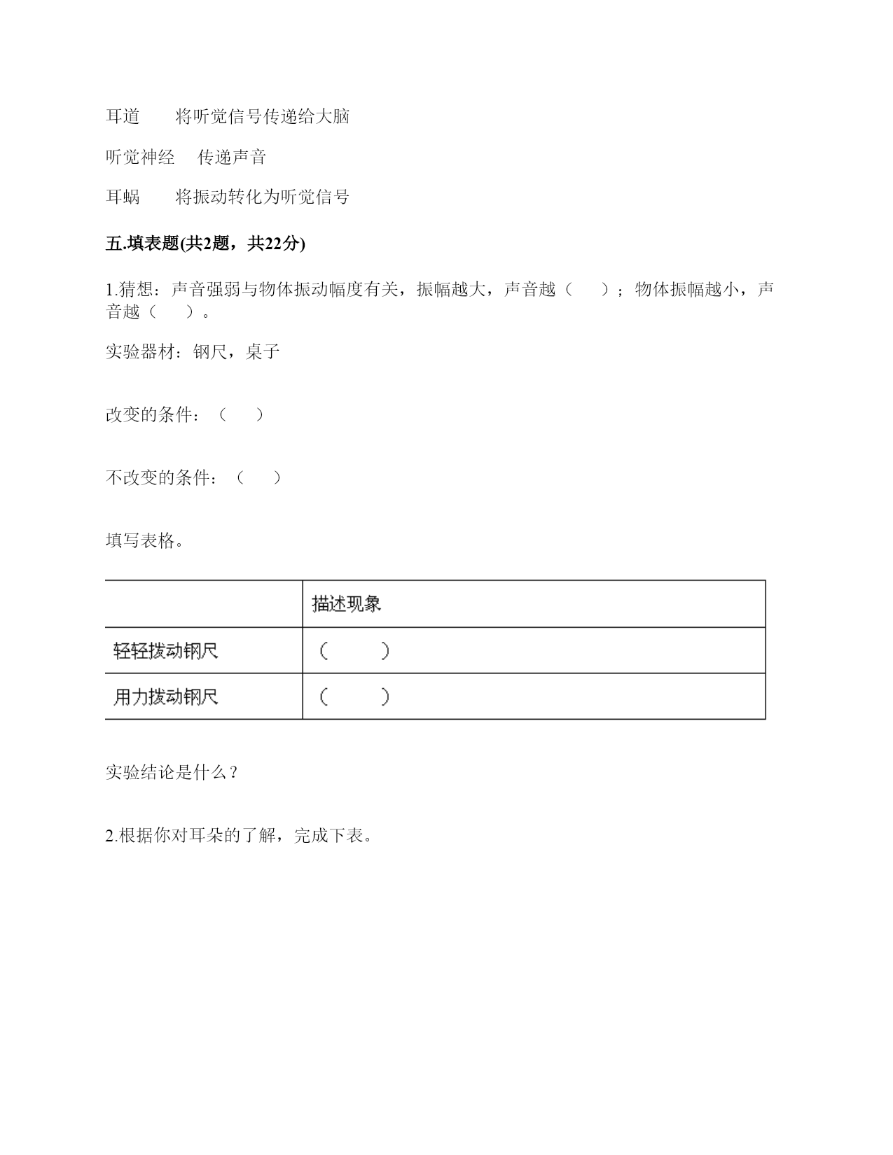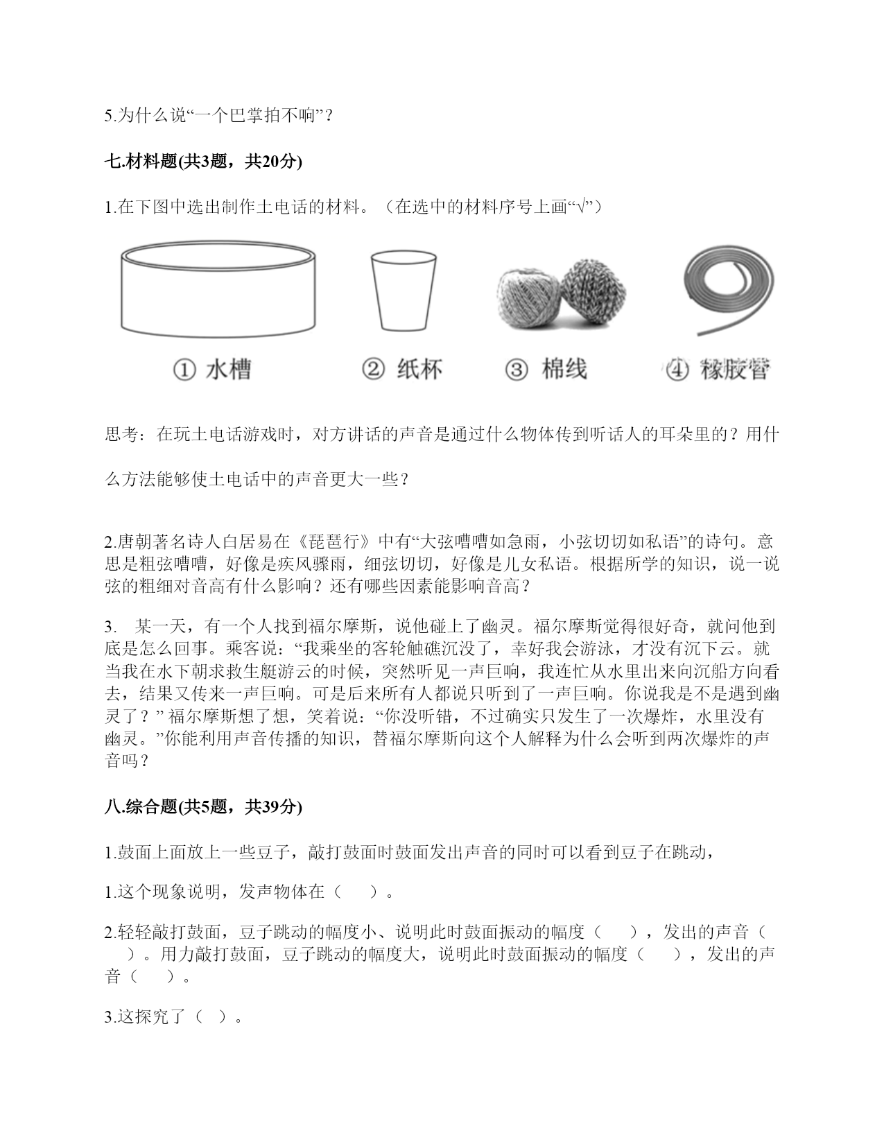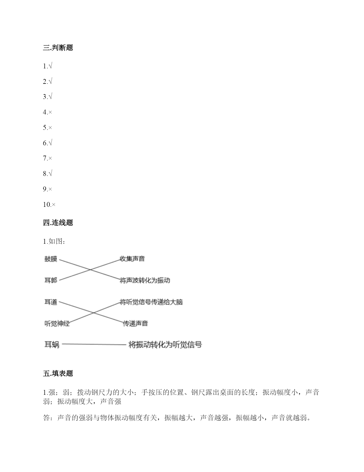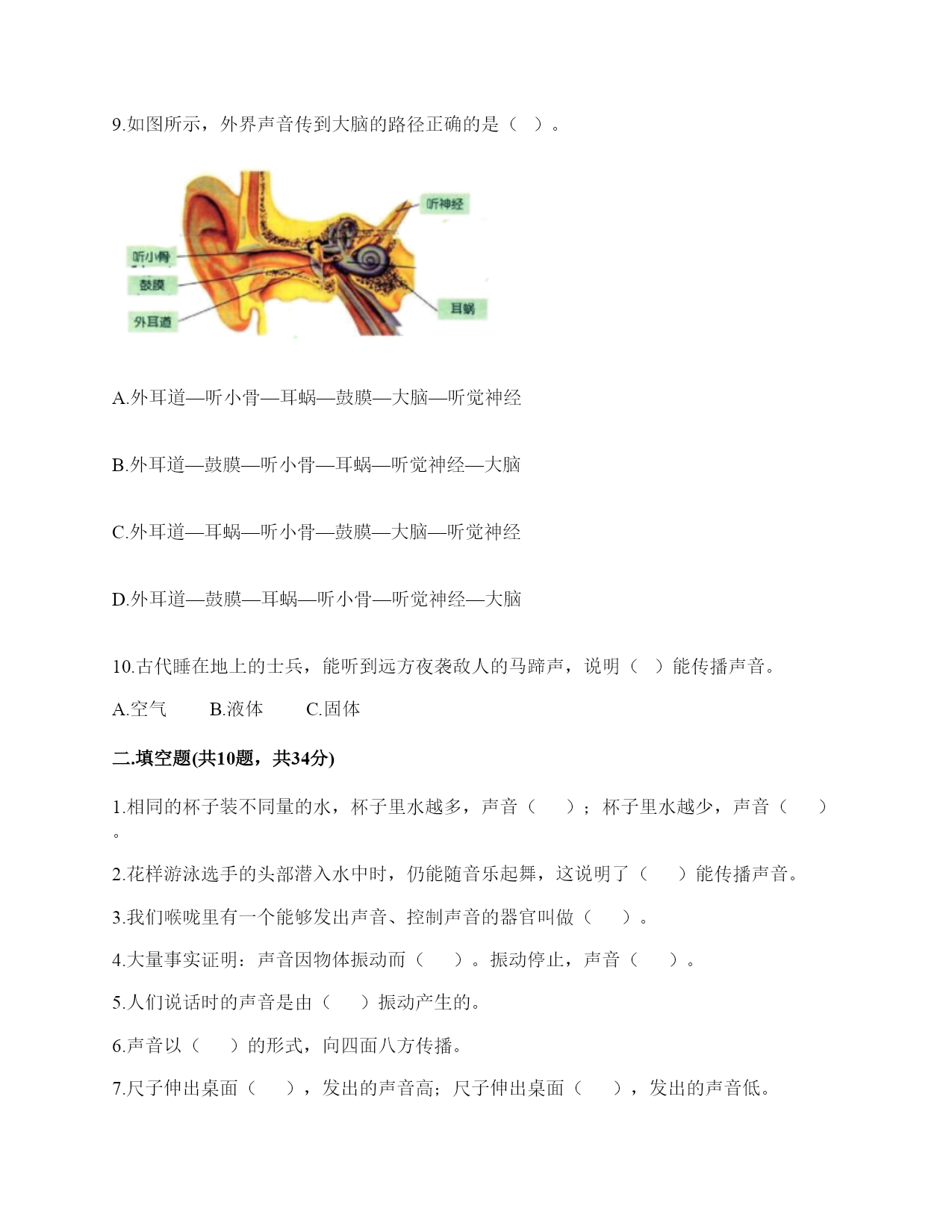 小学科学《声音》练习题一.选择题(共10题,共20分)1.电影《铁道游击队》中的队员们为了抗日,经常将耳朵贴在钢轨上,这样做主要是()。A.卧倒,防止敌人发现自己B.防止敌人的机枪扫射C.因为声音在钢轨中传播比在空气中快,能提前听到日军火车到来2.电视机里的歌声是由()振动产生的。A.声带B.空气C.喇叭3.敲击音叉的力越大,发出的声音()。A.越高B.越响C.越轻4.敲打音叉会发出声音,敲打停止了仍能听到一段余音,这是因为()。A.音叉停止振动后仍能发声B.声音传到人耳需要一段时间C.敲打停止后音叉继续振动了一段时间5.听诊器的探头与()的作用相似。A.听小骨B.耳蜗C.耳郭6.要使小提琴发出的声音变高,应采取的办法是()。A.调松琴弦B.调紧琴弦C.增加部分弦线的长度7.下列关于声音的传播的描述,正确的是()。A.声音沿着一个方向传播B.老师讲课的声音传播到我们耳朵中,没有依靠任何物质C.敲锣时,要使锣停止发声,可用手按住锣面8.将振动的音叉放入水槽内的水中,我们用耳朵贴在水槽壁上可以听到音叉发出的声音,其传播途径是()。A.音叉-水-水槽-人耳B.音叉-水槽-人耳C.音叉-空气-人耳9.如图所示,外界声音传到大脑的路径正确的是()。A.外耳道—听小骨—耳蜗—鼓膜—大脑—听觉神经B.外耳道—鼓膜—听小骨—耳蜗—听觉神经—大脑C.外耳道—耳蜗—听小骨—鼓膜—大脑—听觉神经D.外耳道—鼓膜—耳蜗—听小骨—听觉神经—大脑10.古代睡在地上的士兵,能听到远方夜袭敌人的马蹄声,说明()能传播声音。A.空气B.液体C.固体二.填空题(共10题,共34分)1.相同的杯子装不同量的水,杯子里水越多,声音();杯子里水越少,声音()。2.花样游泳选手的头部潜入水中时,仍能随音乐起舞,这说明了()能传播声音。3.我们喉咙里有一个能够发出声音、控制声音的器官叫做()。4.大量事实证明:声音因物体振动而()。振动停止,声音()。5.人们说话时的声音是由()振动产生的。6.声音以()的形式,向四面八方传播。7.尺子伸出桌面(),发出的声音高;尺子伸出桌面(),发出的声音低。8.如图所示,相同的碗里装入不同量的水,用小锤敲击碗时,可发出不同音调,那么发声体主要是(),发出的声音音调从左至右依次()(填“升高”“降低”或“不变”)。9.听觉神经的作用是(),鼓膜有()的作用。10.物体振动可以产生(),并以()的形式向着()传播。三.判断题(共10题,共20分)1.远处有声音传过来,一定有物体在振动。()2.声音能引起周围物质的振动。()3.我们改变电视机的音量时,改变的是声音的强弱。()4.为了防止琴弦松脱,琴弦调得越紧越好。()5.在任何场所我们都要大声说话,防止别人听不清。()6.用力压皮筋,皮筋不发声,因为皮筋没振动。()7.敲击音叉时音叉会发出声音,所以只要对音叉用力,音叉就能发出声音。()8.喇叭发声时能弹起泡沫小球。()9.在水中敲击音叉,音叉不会发出声音。()10.声音过高或过强都不会对我们的听力产生伤害。()四.连线题(共1题,共5分)1.将下面耳朵的结构和其所具备的功能连在一起。鼓膜收集声音耳郭将声波转化为振动耳道将听觉信号传递给大脑听觉神经传递声音耳蜗将振动转化为听觉信号五.填表题(共2题,共22分)1.猜想:声音强弱与物体振动幅度有关,振幅越大,声音越();物体振幅越小,声音越()。实验器材:钢尺,桌子改变的条件:()不改变的条件:()填写表格。实验结论是什么?2.根据你对耳朵的了解,完成下表。六.简答题(共5题,共25分)1.同根弦发出的声音高低变化的规律是什么?2.二胡只有两根弦,它是怎样发出高低不同、强弱不同的声音的?3.用手拍桌子时,我们可以听到声音,却看不到桌子的振动,你能想一个好方法让我们感受桌子的振动吗?4.编钟上悬挂的是铜器。用木槌击打铜器。请你判断铜器发出的声音有什么不同?5.为什么说“一个巴掌拍不响”?七.材料题(共3题,共20分)1.在下图中选出制作土电话的材料。(在选中的材料序号上画“√”)思考:在玩土电话游戏时,对方讲话的声音是通过什么物体传到听话人的耳朵里的?用什么方法能够使土电话中的声音更大一些?2.唐朝著名诗人白居易在《琵琶行》中有“大弦嘈嘈如急雨,小弦切切如私语”的诗句。意思是粗弦嘈嘈,好像是疾风骤雨,细弦切切,好像是儿女私语。根据所学的知识,说一说弦的粗细对音高有什么影响?还有哪些因素能影响音高?3.某一天,有一个人找到福尔摩斯,说他碰上了幽灵。福尔摩斯觉得很好奇,就问他到底是怎么回事。乘客说:“我乘坐的客轮触礁沉没了,幸好我会游泳,才