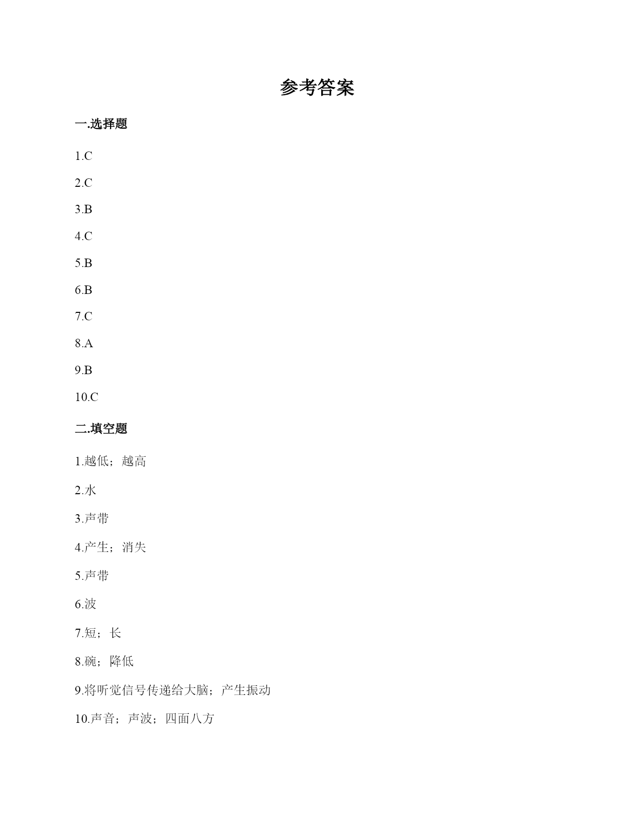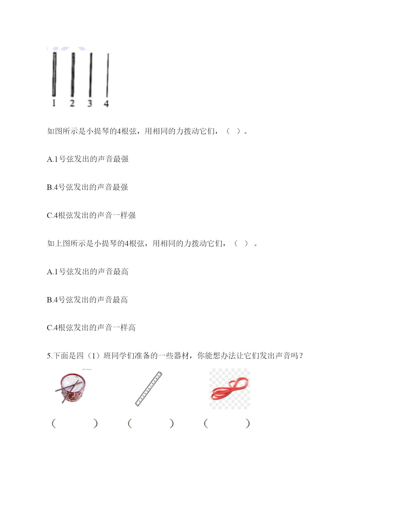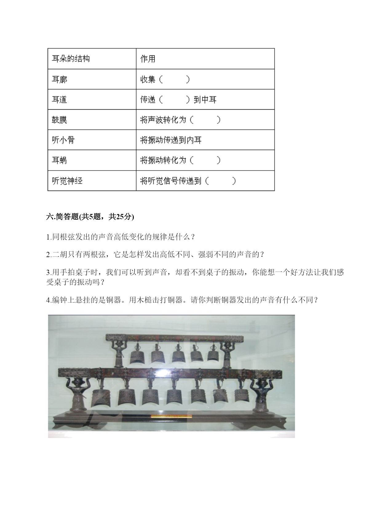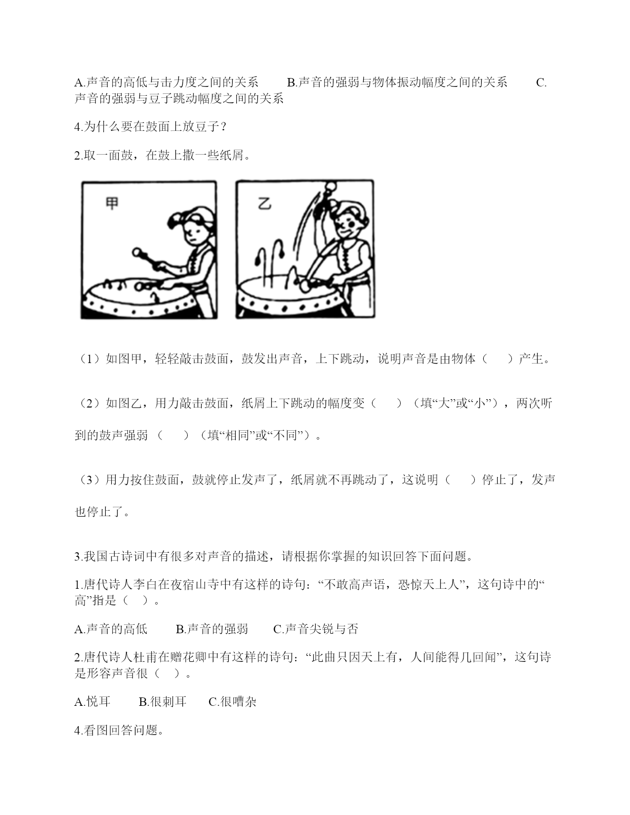 小学科学《声音》练习题一.选择题(共10题,共20分)1.电影《铁道游击队》中的队员们为了抗日,经常将耳朵贴在钢轨上,这样做主要是()。A.卧倒,防止敌人发现自己B.防止敌人的机枪扫射C.因为声音在钢轨中传播比在空气中快,能提前听到日军火车到来2.电视机里的歌声是由()振动产生的。A.声带B.空气C.喇叭3.敲击音叉的力越大,发出的声音()。A.越高B.越响C.越轻4.敲打音叉会发出声音,敲打停止了仍能听到一段余音,这是因为()。A.音叉停止振动后仍能发声B.声音传到人耳需要一段时间C.敲打停止后音叉继续振动了一段时间5.听诊器的探头与()的作用相似。A.听小骨B.耳蜗C.耳郭6.要使小提琴发出的声音变高,应采取的办法是()。A.调松琴弦B.调紧琴弦C.增加部分弦线的长度7.下列关于声音的传播的描述,正确的是()。A.声音沿着一个方向传播B.老师讲课的声音传播到我们耳朵中,没有依靠任何物质C.敲锣时,要使锣停止发声,可用手按住锣面8.将振动的音叉放入水槽内的水中,我们用耳朵贴在水槽壁上可以听到音叉发出的声音,其传播途径是()。A.音叉-水-水槽-人耳B.音叉-水槽-人耳C.音叉-空气-人耳9.如图所示,外界声音传到大脑的路径正确的是()。A.外耳道—听小骨—耳蜗—鼓膜—大脑—听觉神经B.外耳道—鼓膜—听小骨—耳蜗—听觉神经—大脑C.外耳道—耳蜗—听小骨—鼓膜—大脑—听觉神经D.外耳道—鼓膜—耳蜗—听小骨—听觉神经—大脑10.古代睡在地上的士兵,能听到远方夜袭敌人的马蹄声,说明()能传播声音。A.空气B.液体C.固体二.填空题(共10题,共34分)1.相同的杯子装不同量的水,杯子里水越多,声音();杯子里水越少,声音()。2.花样游泳选手的头部潜入水中时,仍能随音乐起舞,这说明了()能传播声音。3.我们喉咙里有一个能够发出声音、控制声音的器官叫做()。4.大量事实证明:声音因物体振动而()。振动停止,声音()。5.人们说话时的声音是由()振动产生的。6.声音以()的形式,向四面八方传播。7.尺子伸出桌面(),发出的声音高;尺子伸出桌面(),发出的声音低。8.如图所示,相同的碗里装入不同量的水,用小锤敲击碗时,可发出不同音调,那么发声体主要是(),发出的声音音调从左至右依次()(填“升高”“降低”或“不变”)。9.听觉神经的作用是(),鼓膜有()的作用。10.物体振动可以产生(),并以()的形式向着()传播。三.判断题(共10题,共20分)1.远处有声音传过来,一定有物体在振动。()2.声音能引起周围物质的振动。()3.我们改变电视机的音量时,改变的是声音的强弱。()4.为了防止琴弦松脱,琴弦调得越紧越好。()5.在任何场所我们都要大声说话,防止别人听不清。()6.用力压皮筋,皮筋不发声,因为皮筋没振动。()7.敲击音叉时音叉会发出声音,所以只要对音叉用力,音叉就能发出声音。()8.喇叭发声时能弹起泡沫小球。()9.在水中敲击音叉,音叉不会发出声音。()10.声音过高或过强都不会对我们的听力产生伤害。()四.连线题(共1题,共5分)1.将下面耳朵的结构和其所具备的功能连在一起。鼓膜收集声音耳郭将声波转化为振动耳道将听觉信号传递给大脑听觉神经传递声音耳蜗将振动转化为听觉信号五.填表题(共2题,共22分)1.猜想:声音强弱与物体振动幅度有关,振幅越大,声音越();物体振幅越小,声音越()。实验器材:钢尺,桌子改变的条件:()不改变的条件:()填写表格。实验结论是什么?2.根据你对耳朵的了解,完成下表。六.简答题(共5题,共25分)1.同根弦发出的声音高低变化的规律是什么?2.二胡只有两根弦,它是怎样发出高低不同、强弱不同的声音的?3.用手拍桌子时,我们可以听到声音,却看不到桌子的振动,你能想一个好方法让我们感受桌子的振动吗?4.编钟上悬挂的是铜器。用木槌击打铜器。请你判断铜器发出的声音有什么不同?5.为什么说“一个巴掌拍不响”?七.材料题(共3题,共20分)1.在下图中选出制作土电话的材料。(在选中的材料序号上画“√”)思考:在玩土电话游戏时,对方讲话的声音是通过什么物体传到听话人的耳朵里的?用什么方法能够使土电话中的声音更大一些?2.唐朝著名诗人白居易在《琵琶行》中有“大弦嘈嘈如急雨,小弦切切如私语”的诗句。意思是粗弦嘈嘈,好像是疾风骤雨,细弦切切,好像是儿女私语。根据所学的知识,说一说弦的粗细对音高有什么影响?还有哪些因素能影响音高?3.某一天,有一个人找到福尔摩斯,说他碰上了幽灵。福尔摩斯觉得很好奇,就问他到底是怎么回事。乘客说:“我乘坐的客轮触礁沉没了,幸好我会游泳,才