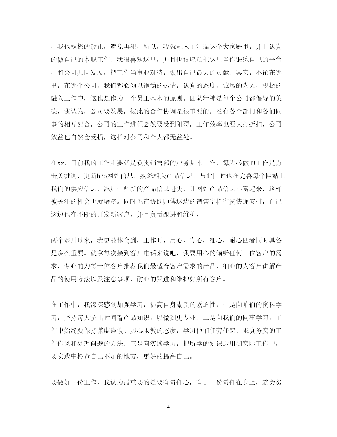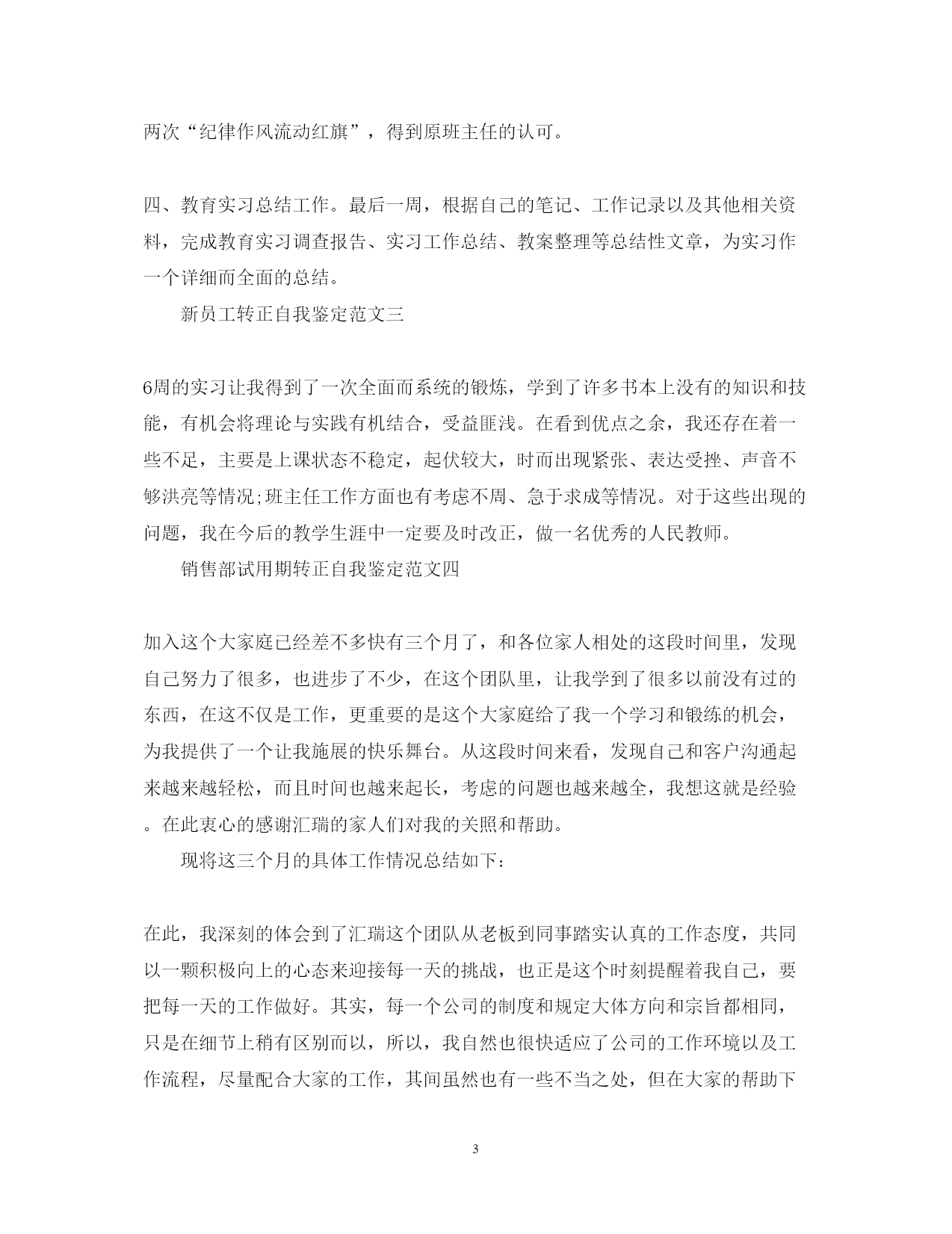 此资料由网络收集而来,如有侵权请告知上传者立即删除。资料共分享,我们负责传递知识。PAGEPAGE5工作转正自我鉴定怎么写工作转正自我鉴定怎么写?下面是整理的关于新员工转正自我鉴定范文多篇,欢迎阅读!新员工转正自我鉴定范文一(通用版)我于20xx年x月x日成为公司的试用员工,到今天3个月试用期已满,根据公司的规章制度,现申请转为公司正式员工。从来公司的第一天开始,我就把自己融入到我们的这个团队中,现将这三个月的工作情况总结如下:一、非常注意的向周围的老同事学习,在工作中处处留意,多看,多思考,多学习,以较快的速度熟悉着公司的情况,较好的融入到了我们的这个团队中。二、对工作认真负责,任劳任怨,与同事配合默契,平时刻苦钻研,不断创新,能够在规定时间内出色的完成任务,保证公司项目进度,做到让客户、领导、自己都满意。三、协助领导带新员工,虽然我自己还是一个来公司不久的尚在试用期的新员工,但在9-10月份,还是积极主动的协助领导带新人,将自己知道的和在工作中应该着重注意的问题都教给XXX总之,经过三个月的试用期,我认为我能够积极、主动、熟练的完成自己的工作,在工作中能够发现问题,并积极全面的配合公司的要求来展开工作,与同事能够很好的配合和协调。在以后的工作中我会一如继往,对人:与人为善,对工作:力求完美,不断的提升自己的业务水平及综合素质,以期为公司的发展尽自己的一份力量。新员工转正自我鉴定范文二实习期间,在xx学校各位领导和有关老师的帮助、指导下,我顺利地完成了教育实习任务。下面,就此期间自己在教学实习和班主任实习等方面的工作做一个简单的自我鉴定:一、教学与班主任工作见习。这是首周的任务,目的是熟悉实习学校、班级的基本情况,接受指导老师的点拨,并随班听课,作好听课笔记,积累教学经验,为日后几周打下良好的基础。另外,在原任课老师的帮助下,熟悉教材、大纲,写出至少4个详细而完整的教案,经审阅、批核并达到要求后,正式授课。二、教学工作实习。这是第2至5周的任务,我与队友xx组成一个教学小组,负责06普高一(3)班的语文教学,内容为人教版《语文•必修一》的第3、4单元。总体看来,我能做到认真备课,努力搜集教学素材,所设计的教案、课件规范美观,内容准确。板书工整,教态自然,课堂教学效果良好;教学基本符合新课标要求;教学语言表达清楚,普通话顺畅;课外辅导耐心细致,负责到底,答疑解惑比较正确而有启发性,批改作业仔细正确,注重评点与鼓励相结合。三、班主任工作实习。在原班主任的指引下,我较快地熟悉全班学生姓名、个性、兴趣爱好、组织情况(干部、团、队员)以及班级特点,工作积极主动,认真负责,常到教室、宿舍与学生沟通,做思想辅导工作,解决他们学习、生活中的问题。处理日常事务尽量讲究效率,基本做到有计划进行各项班务工作。积极发动班委的策划、组织功能,并十分注重与两位组员的合作交流,相互体谅,效果比较明显。曾成功地举行四次主题班会:《我爱我班》、《勇往直前,直面挫折》、《知识决定命运》、《珍惜•离别•相聚》,组织学生参加“配乐朗诵诗文比赛”、高一级郊游、班级足球赛、长征展览观赏等系列集体活动,并带领班级取得两次“纪律作风流动红旗”,得到原班主任的认可。四、教育实习总结工作。最后一周,根据自己的笔记、工作记录以及其他相关资料,完成教育实习调查报告、实习工作总结、教案整理等总结性文章,为实习作一个详细而全面的总结。新员工转正自我鉴定范文三6周的实习让我得到了一次全面而系统的锻炼,学到了许多书本上没有的知识和技能,有机会将理论与实践有机结合,受益匪浅。在看到优点之余,我还存在着一些不足,主要是上课状态不稳定,起伏较大,时而出现紧张、表达受挫、声音不够洪亮等情况;班主任工作方面也有考虑不周、急于求成等情况。对于这些出现的问题,我在今后的教学生涯中一定要及时改正,做一名优秀的人民教师。销售部试用期转正自我鉴定范文四加入这个大家庭已经差不多快有三个月了,和各位家人相处的这段时间里,发现自己努力了很多,也进步了不少,在这个团队里,让我学到了很多以前没有过的东西,在这不仅是工作,更重要的是这个大家庭给了我一个学习和锻练的机会,为我提供了一个让我施展的快乐舞台。从这段时间来看,发现自己和客户沟通起来越来越轻松,而且时间也越来起长,考虑的问题也越来越全,我想这就是经验。在此衷心的感谢汇瑞的家人们对我的关照和帮助。现将这三个月的具体工作情况总结如下:在此,我深刻的体会到了汇瑞这个团队从老板到同事踏实认真的工作态度,共同以一颗积极向上的心态来迎接每一天的挑战,也正是这个时刻提醒着我自己,要把每一天的工作做好。其实,每一个公司的制度和规定大体方向和宗旨都相同,只是在细节上稍有区别而以,所以,我自然也很快适应了公司的工作环境以及