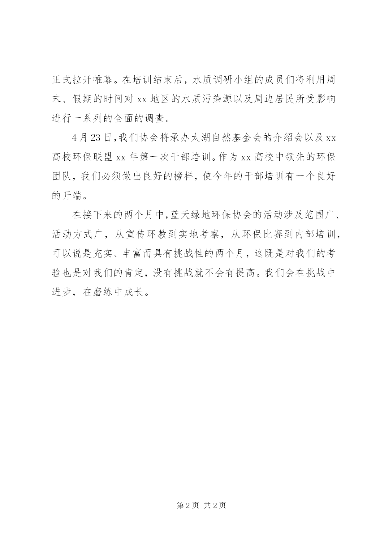 第PAGE\*Arabic\*MERGEFORMAT2页共NUMPAGES\*MERGEFORMAT2页校园环保协会工作计划四月悄悄走近,随着3月26日“地球一小时”活动圆满落幕,4月22日“世界地球日”又将悄然而至。今年的“世界地球日”活动准备分为校内、校外两块进行:校内。我们将再次和学校后勤服务处进行合作,在“世界地球日”那天举行绿色校园的启动仪式。绿色校园的主要内容为号召大家以个人或者班级的名义领养校园内的植物以及绿化带,保护我们自己的家园。而我们协会则起到中间枢纽的作用,在同学们和后勤服务处之间进行沟通和交流,将校园绿化状况得到很好改善。校外。基于我们协会和花园西村良好合作的关系,我们将在4月21日下午于花园西村进行“世界地球日”的宣传活动,使环保深入民心。此外,我们蓝天绿地环保协会也将与化学与环境工程学院艺术部进行合作,共同在艺术文化节举办“环保时装”设计大赛,号召大家利用身边的废旧物品来进行一场环保时装的“对决赛”。此次大赛为全校性比赛,给学院学生均可进行报名,分为初、复赛阶段。这不仅仅只是一个比赛,得到的也不仅仅只是一张奖状、一个荣誉称号,更多的是环保的思想理念以及光明的未来。4月9日,蓝天绿地环保协会的部分成员将赴南京参加xx五市水质调查的培训,此次培训意味着xx地区水质调查活动将正式拉开帷幕。在培训结束后,水质调研小组的成员们将利用周末、假期的时间对xx地区的水质污染源以及周边居民所受影响进行一系列的全面的调查。4月23日,我们协会将承办太湖自然基金会的介绍会以及xx高校环保联盟xx年第一次干部培训。作为xx高校中领先的环保团队,我们必须做出良好的榜样,使今年的干部培训有一个良好的开端。在接下来的两个月中,蓝天绿地环保协会的活动涉及范围广、活动方式广,从宣传环教到实地考察,从环保比赛到内部培训,可以说是充实、丰富而具有挑战性的两个月,这既是对我们的考验也是对我们的肯定,没有挑战就不会有提高。我们会在挑战中进步,在磨练中成长。