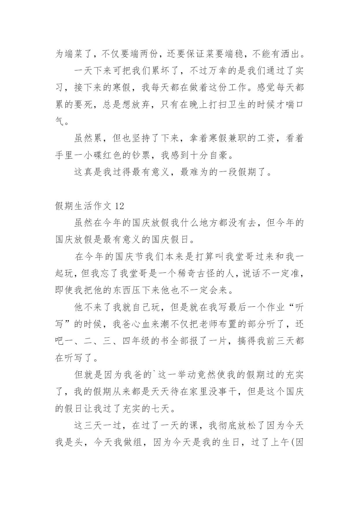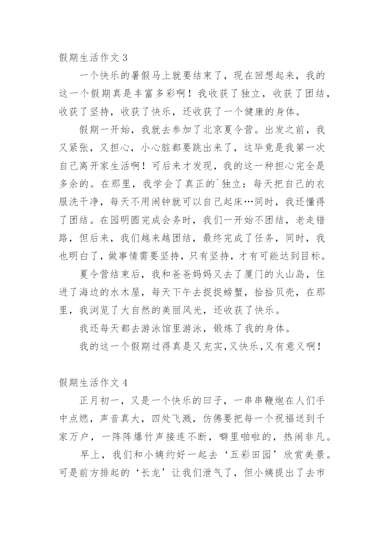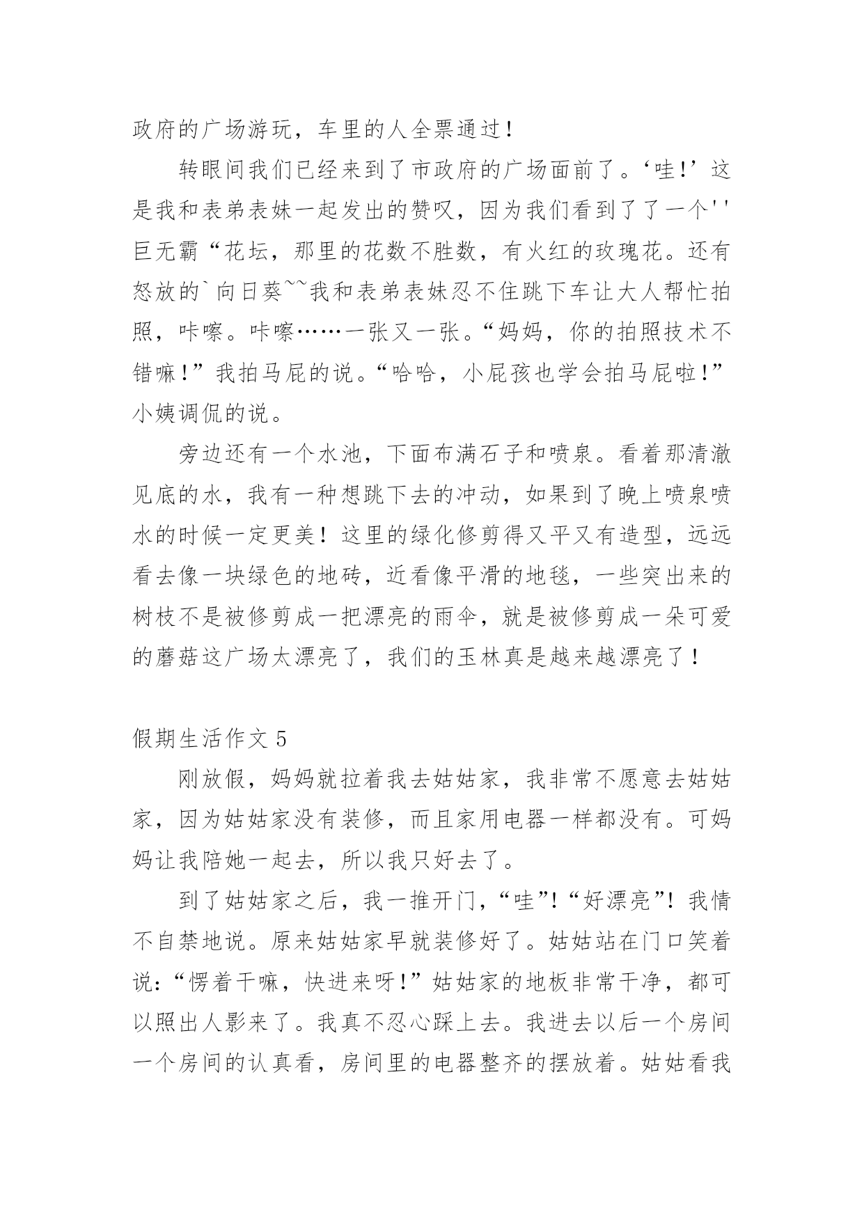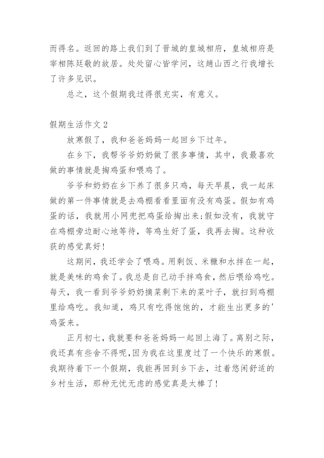 假期生活作文假期生活作文[经典]在现实生活或工作学习中,大家都不可避免地会接触到作文吧,借助作文可以提高我们的语言组织能力。为了让您在写作文时更加简单方便,下面是小编精心整理的假期生活作文,欢迎阅读与收藏。假期生活作文1这个暑假是我有史以来最有意义的一个暑假,这个暑假我学到了很多,也增强了很多……放假了,可不能一直玩。暑假里,我上了练字班,写字有很大进步,受到了老师的表扬。除了老师布置的作业外,我还完成了爸爸妈妈布置的'作业。如做阅读理解,每天三道奥数题等等。生命在于运动。这个暑假里,我还参加了一个体能训练班,耐力有所提高。一个月后,以前只能跑一公里的我已经不存在了,代替他的是能跑四公里的我。这个暑假因为我的耐力提高了,所以我的跳绳水平也提高了,已经能突破一分钟200个了。假期也是玩耍放松的时候,我先后两次去了郑东新区的冠军溜冰场溜冰(溜得可是真冰呀!),溜冰很简单,一学就会。我还去了尖叫动漫电玩城打游戏,我们还去游览了山西省长治县太行大峡谷的红豆峡,红豆峡因为种植的红豆很多而得名。返回的路上我们到了晋城的皇城相府,皇城相府是宰相陈廷敬的故居。处处留心皆学问,这趟山西之行我增长了许多见识。总之,这个假期我过得很充实,有意义。假期生活作文2放寒假了,我和爸爸妈妈一起回乡下过年。在乡下,我帮爷爷奶奶做了很多事情,其中,我最喜欢做的事情就是掏鸡蛋和喂鸡了。爷爷和奶奶在乡下养了很多只鸡,每天早晨,我一起床做的第一件事情就是去鸡棚看看里面有没有鸡蛋。假如有鸡蛋的话,我就用小网兜把鸡蛋给掏出来;假如没有,我就守在鸡棚旁边耐心地等待,等鸡生好了蛋,我再去掏。这种收获的感觉真好!这期间,我还学会了喂鸡。用剩饭、米糠和水拌在一起,就是美味的鸡食了。我总是自己动手拌鸡食,然后喂给鸡吃。每天,我一看到爷爷奶奶摘菜剩下来的菜叶子,就扫到鸡棚里给鸡吃。我知道,鸡只有吃得饱饱的,才能生出更多的'鸡蛋来。正月初七,我就要和爸爸妈妈一起回上海了。离别之际,我还真有些舍不得呢,因为我在这里度过了一个快乐的寒假。我期待着下一个假期,我能再回到乡下去,过着悠闲舒适的乡村生活,那种无忧无虑的感觉真是太棒了!假期生活作文3一个快乐的暑假马上就要结束了,现在回想起来,我的这一个假期真是丰富多彩啊!我收获了独立,收获了团结,收获了坚持,收获了快乐,还收获了一个健康的身体。假期一开始,我就去参加了北京夏令营。出发之前,我又紧张,又担心,小心脏都要跳出来了,这毕竟是我第一次自己离开家生活啊!可后来才发现,我的这一种担心完全是多余的。在那里,我学会了真正的`独立:每天把自己的衣服洗干净,每天不用闹钟就可以自己起床…同时,我还懂得了团结。在园明圆完成会务时,我们一开始不团结,老走错路,但后来,我们越来越团结,最终完成了任务,同时,我也明白了,做事情需要坚持,只有坚持,才有可能达到目标。夏令营结束后,我和爸爸妈妈又去了厦门的火山岛,住进了海边的水木屋,每天下午去捉捉螃蟹,拾拾贝壳,在那里,我浏览了大自然的美丽风光,还收获了快乐。我还每天都去游泳馆里游泳,锻炼了我的身体。我的这一个假期过得真是又充实,又快乐,又有意义啊!假期生活作文4正月初一,又是一个快乐的曰子,一串串鞭炮在人们手中点燃,声音真大,四处飞溅,仿佛要把每一个祝福送到千家万户,一阵阵爆竹声接连不断,噼里啪啦的,热闹非凡。早上,我们和小姨约好一起去‘五彩田园’欣赏美景。可是前方排起的‘长龙’让我们泄气了,但小姨提出了去市政府的广场游玩,车里的人全票通过!转眼间我们已经来到了市政府的广场面前了。‘哇!’这是我和表弟表妹一起发出的赞叹,因为我们看到了了一个''巨无霸“花坛,那里的花数不胜数,有火红的玫瑰花。还有怒放的`向日葵~~我和表弟表妹忍不住跳下车让大人帮忙拍照,咔嚓。咔嚓……一张又一张。“妈妈,你的拍照技术不错嘛!”我拍马屁的说。“哈哈,小屁孩也学会拍马屁啦!”小姨调侃的说。旁边还有一个水池,下面布满石子和喷泉。看着那清澈见底的水,我有一种想跳下去的冲动,如果到了晚上喷泉喷水的时候一定更美!这里的绿化修剪得又平又有造型,远远看去像一块绿色的地砖,近看像平滑的地毯,一些突出来的树枝不是被修剪成一把漂亮的雨伞,就是被修剪成一朵可爱的蘑菇这广场太漂亮了,我们的玉林真是越来越漂亮了!假期生活作文5刚放假,妈妈就拉着我去姑姑家,我非常不愿意去姑姑家,因为姑姑家没有装修,而且家用电器一样都没有。可妈妈让我陪她一起去,所以我只好去了。到了姑姑家之后,我一推开门,“哇”!“好漂亮”!我情不自禁地说。原来姑姑家早就装修好了。姑姑站在门口笑着说:“愣着干嘛,快进来呀!”姑姑家的地板非常干净,都可以照出人影来了。我真不忍心踩上去。我进去以后一个房间一个房间的认真看,房间里的电器整齐的摆放着。姑姑看我那高兴的表情,笑着对妈妈说:“以后梓玲再