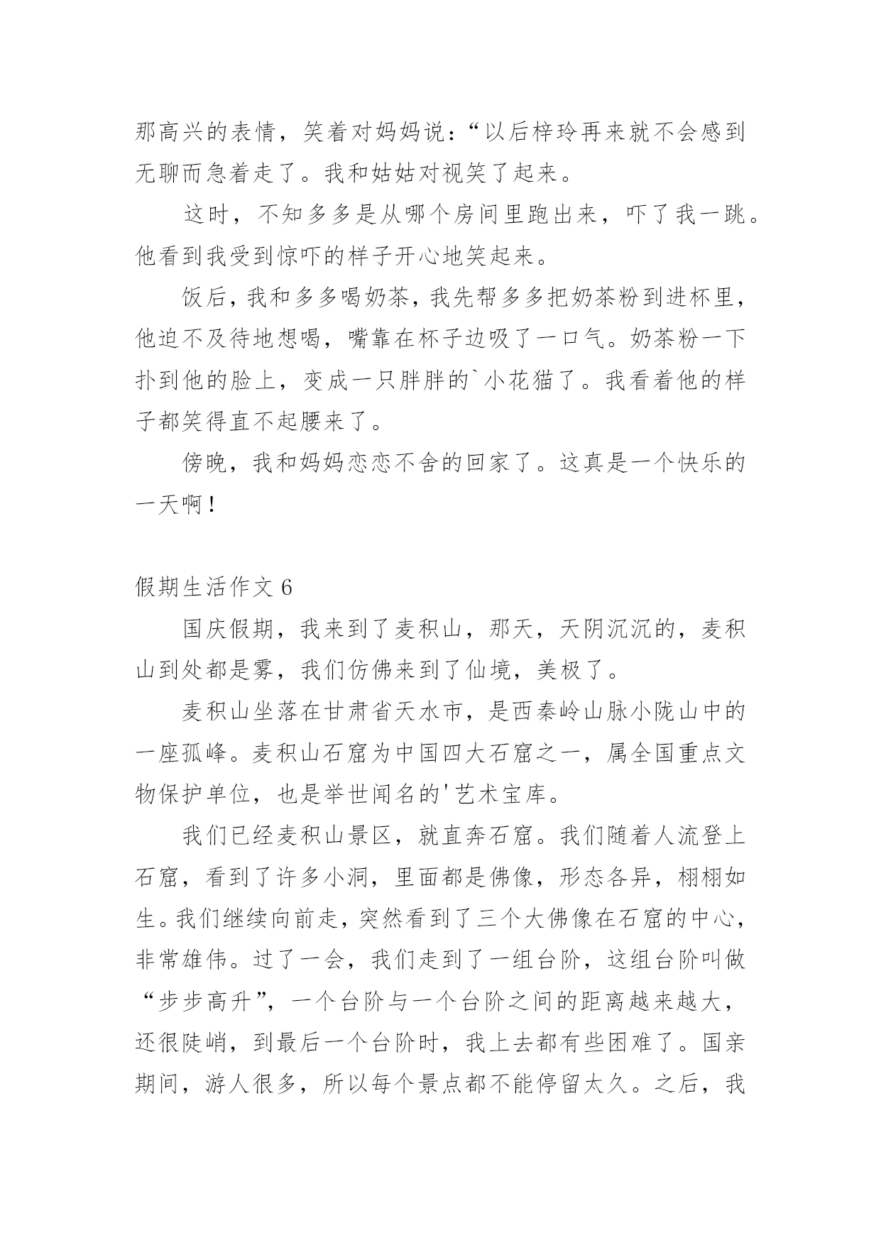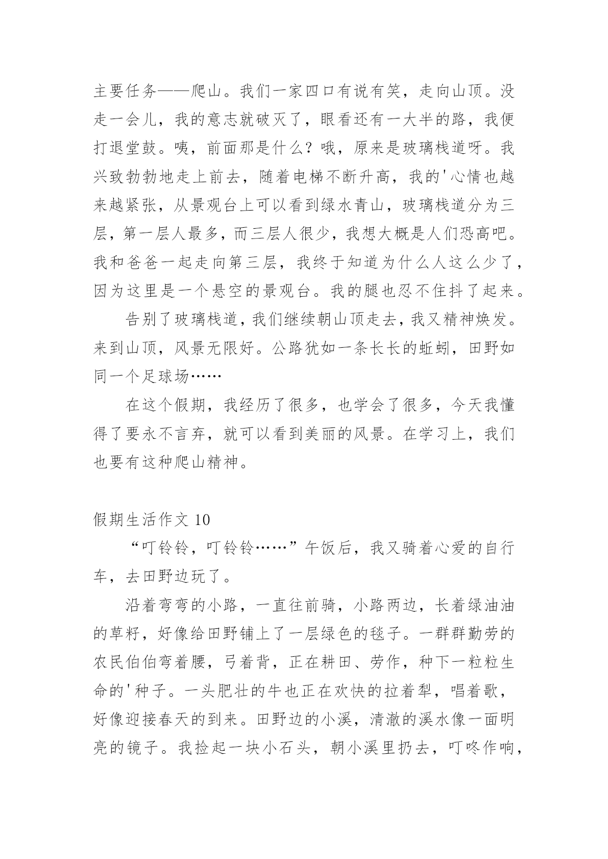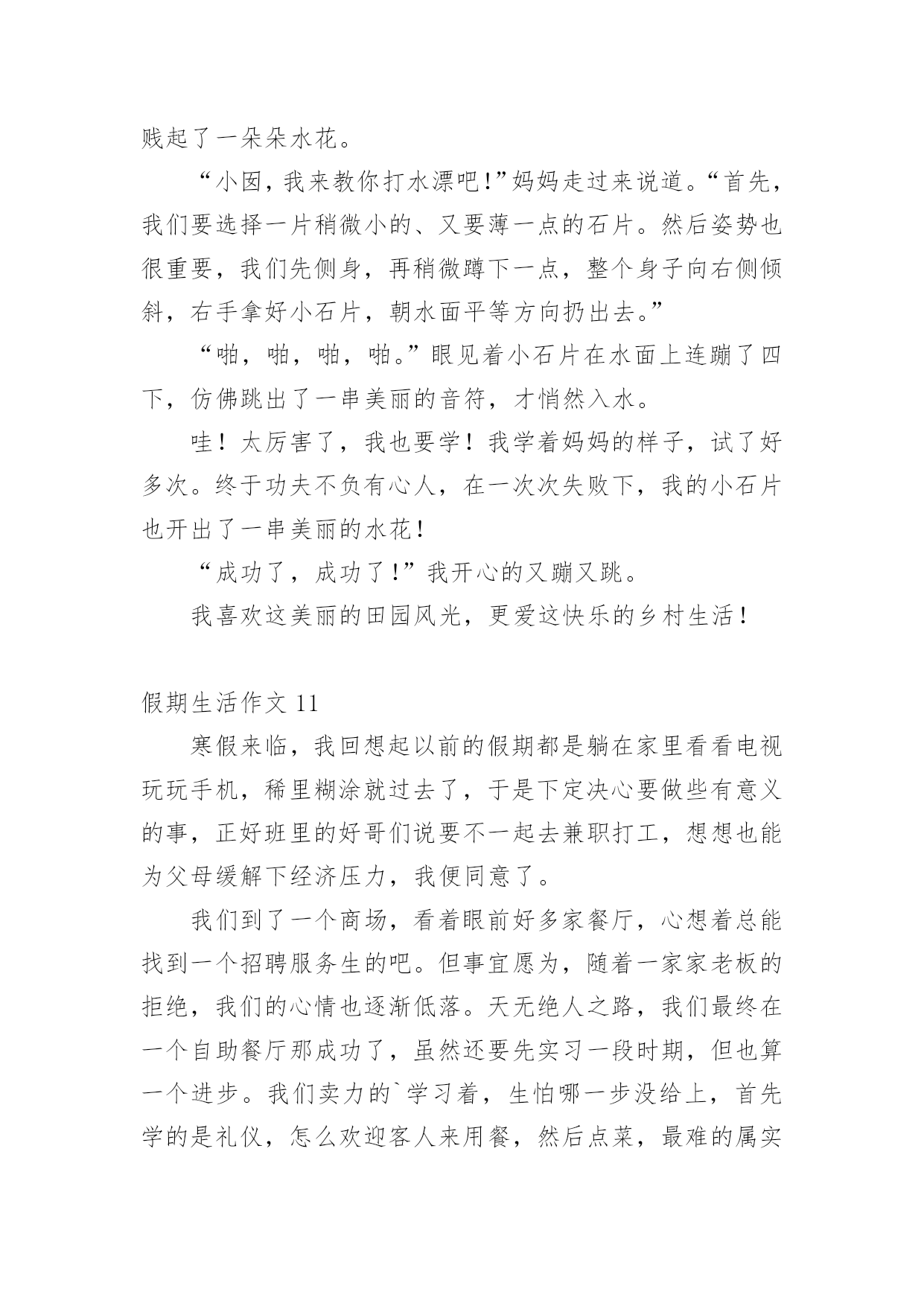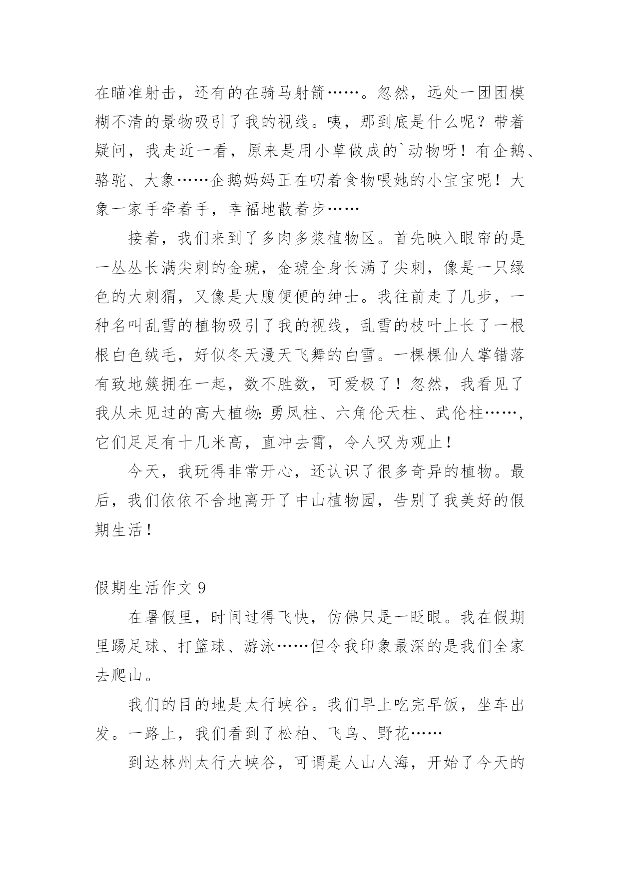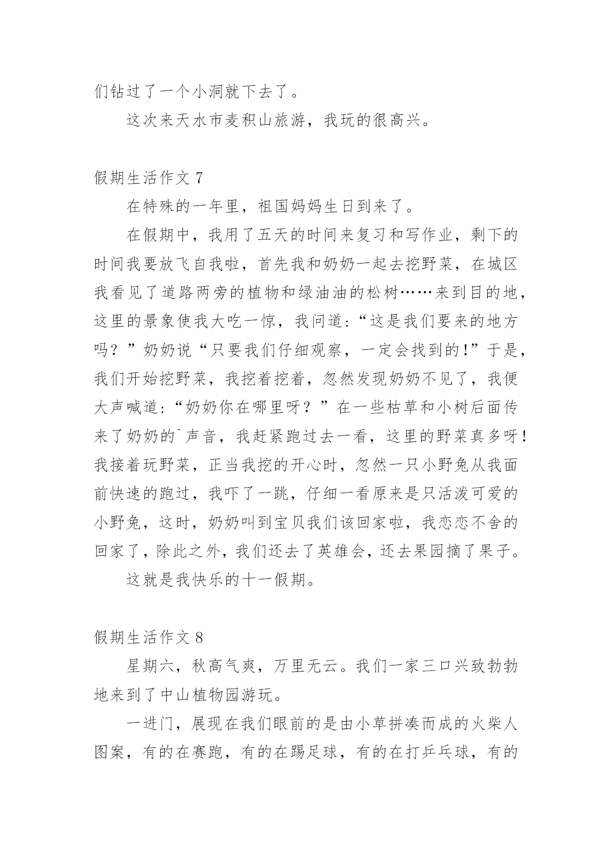 假期生活作文假期生活作文[经典]在现实生活或工作学习中,大家都不可避免地会接触到作文吧,借助作文可以提高我们的语言组织能力。为了让您在写作文时更加简单方便,下面是小编精心整理的假期生活作文,欢迎阅读与收藏。假期生活作文1这个暑假是我有史以来最有意义的一个暑假,这个暑假我学到了很多,也增强了很多……放假了,可不能一直玩。暑假里,我上了练字班,写字有很大进步,受到了老师的表扬。除了老师布置的作业外,我还完成了爸爸妈妈布置的'作业。如做阅读理解,每天三道奥数题等等。生命在于运动。这个暑假里,我还参加了一个体能训练班,耐力有所提高。一个月后,以前只能跑一公里的我已经不存在了,代替他的是能跑四公里的我。这个暑假因为我的耐力提高了,所以我的跳绳水平也提高了,已经能突破一分钟200个了。假期也是玩耍放松的时候,我先后两次去了郑东新区的冠军溜冰场溜冰(溜得可是真冰呀!),溜冰很简单,一学就会。我还去了尖叫动漫电玩城打游戏,我们还去游览了山西省长治县太行大峡谷的红豆峡,红豆峡因为种植的红豆很多而得名。返回的路上我们到了晋城的皇城相府,皇城相府是宰相陈廷敬的故居。处处留心皆学问,这趟山西之行我增长了许多见识。总之,这个假期我过得很充实,有意义。假期生活作文2放寒假了,我和爸爸妈妈一起回乡下过年。在乡下,我帮爷爷奶奶做了很多事情,其中,我最喜欢做的事情就是掏鸡蛋和喂鸡了。爷爷和奶奶在乡下养了很多只鸡,每天早晨,我一起床做的第一件事情就是去鸡棚看看里面有没有鸡蛋。假如有鸡蛋的话,我就用小网兜把鸡蛋给掏出来;假如没有,我就守在鸡棚旁边耐心地等待,等鸡生好了蛋,我再去掏。这种收获的感觉真好!这期间,我还学会了喂鸡。用剩饭、米糠和水拌在一起,就是美味的鸡食了。我总是自己动手拌鸡食,然后喂给鸡吃。每天,我一看到爷爷奶奶摘菜剩下来的菜叶子,就扫到鸡棚里给鸡吃。我知道,鸡只有吃得饱饱的,才能生出更多的'鸡蛋来。正月初七,我就要和爸爸妈妈一起回上海了。离别之际,我还真有些舍不得呢,因为我在这里度过了一个快乐的寒假。我期待着下一个假期,我能再回到乡下去,过着悠闲舒适的乡村生活,那种无忧无虑的感觉真是太棒了!假期生活作文3一个快乐的暑假马上就要结束了,现在回想起来,我的这一个假期真是丰富多彩啊!我收获了独立,收获了团结,收获了坚持,收获了快乐,还收获了一个健康的身体。假期一开始,我就去参加了北京夏令营。出发之前,我又紧张,又担心,小心脏都要跳出来了,这毕竟是我第一次自己离开家生活啊!可后来才发现,我的这一种担心完全是多余的。在那里,我学会了真正的`独立:每天把自己的衣服洗干净,每天不用闹钟就可以自己起床…同时,我还懂得了团结。在园明圆完成会务时,我们一开始不团结,老走错路,但后来,我们越来越团结,最终完成了任务,同时,我也明白了,做事情需要坚持,只有坚持,才有可能达到目标。夏令营结束后,我和爸爸妈妈又去了厦门的火山岛,住进了海边的水木屋,每天下午去捉捉螃蟹,拾拾贝壳,在那里,我浏览了大自然的美丽风光,还收获了快乐。我还每天都去游泳馆里游泳,锻炼了我的身体。我的这一个假期过得真是又充实,又快乐,又有意义啊!假期生活作文4正月初一,又是一个快乐的曰子,一串串鞭炮在人们手中点燃,声音真大,四处飞溅,仿佛要把每一个祝福送到千家万户,一阵阵爆竹声接连不断,噼里啪啦的,热闹非凡。早上,我们和小姨约好一起去‘五彩田园’欣赏美景。可是前方排起的‘长龙’让我们泄气了,但小姨提出了去市政府的广场游玩,车里的人全票通过!转眼间我们已经来到了市政府的广场面前了。‘哇!’这是我和表弟表妹一起发出的赞叹,因为我们看到了了一个''巨无霸“花坛,那里的花数不胜数,有火红的玫瑰花。还有怒放的`向日葵~~我和表弟表妹忍不住跳下车让大人帮忙拍照,咔嚓。咔嚓……一张又一张。“妈妈,你的拍照技术不错嘛!”我拍马屁的说。“哈哈,小屁孩也学会拍马屁啦!”小姨调侃的说。旁边还有一个水池,下面布满石子和喷泉。看着那清澈见底的水,我有一种想跳下去的冲动,如果到了晚上喷泉喷水的时候一定更美!这里的绿化修剪得又平又有造型,远远看去像一块绿色的地砖,近看像平滑的地毯,一些突出来的树枝不是被修剪成一把漂亮的雨伞,就是被修剪成一朵可爱的蘑菇这广场太漂亮了,我们的玉林真是越来越漂亮了!假期生活作文5刚放假,妈妈就拉着我去姑姑家,我非常不愿意去姑姑家,因为姑姑家没有装修,而且家用电器一样都没有。可妈妈让我陪她一起去,所以我只好去了。到了姑姑家之后,我一推开门,“哇”!“好漂亮”!我情不自禁地说。原来姑姑家早就装修好了。姑姑站在门口笑着说:“愣着干嘛,快进来呀!”姑姑家的地板非常干净,都可以照出人影来了。我真不忍心踩上去。我进去以后一个房间一个房间的认真看,房间里的电器整齐的摆放着。姑姑看我那高兴的表情,笑着对妈妈说:“以后梓玲再