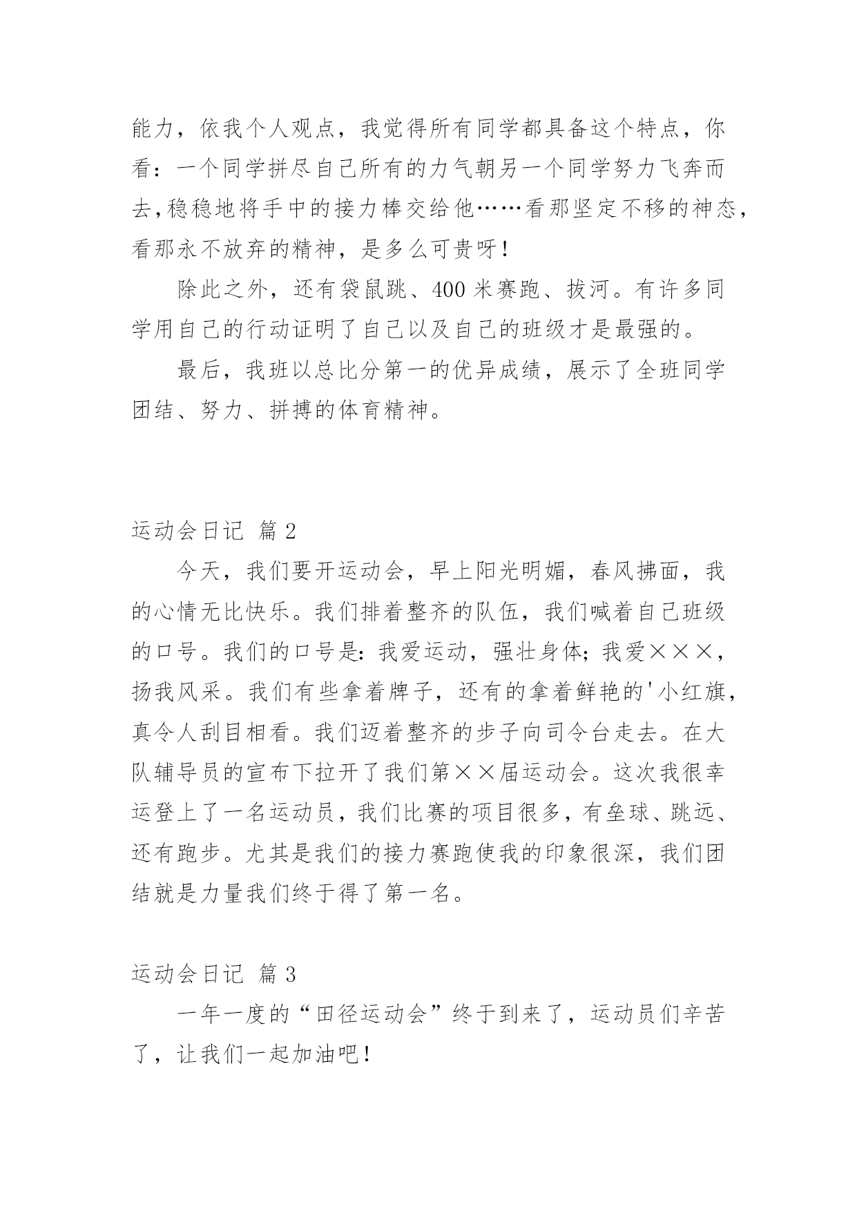 运动会日记运动会日记优秀(3篇)一天的时间即将结束了,你有什么总结呢?这时候,最关键的日记怎么能落下。如何把日记做到重点突出呢?以下是小编整理的运动会日记3篇,供大家参考借鉴,希望可以帮助到有需要的朋友。运动会日记篇1在昨天,运动会就已经拉开序幕。今天,是我们四年级的竞争,每个参赛选手都心情激动,热血沸腾,都准备在运动会上大显身手,为自己的班级争光。第一个比赛项目是跳绳,也是我参赛的项目。我在比赛前,还痴心妄想地认为自己至少能跳一百多个,其实呀,我根本就不行。瞧瞧比赛的实况吧:除了我,每个同学都像跳得很轻松似的,他们手上的跳绳在空中唱着欢快的歌,极像一个被驯服的宠物;而我呢,笨手笨脚的,绳子不是被脚踩了,就是打在我背上的帽子上,或者就是绕在我的脚上,完全不听我指挥,没完没了地出错,最终的结果,裁判老师勉强给了我“五个”的成绩。唉!这倒霉的成绩啊!不仅把我自己的脸羞的通红,还把全班的比赛成绩拉了下水。第二个项目是接力赛,裁判一声令下,同学们一个个便像飞毛腿似的.“飞”出去。接力赛主要是考验团队的协作能力,依我个人观点,我觉得所有同学都具备这个特点,你看:一个同学拼尽自己所有的力气朝另一个同学努力飞奔而去,稳稳地将手中的接力棒交给他……看那坚定不移的神态,看那永不放弃的精神,是多么可贵呀!除此之外,还有袋鼠跳、400米赛跑、拔河。有许多同学用自己的行动证明了自己以及自己的班级才是最强的。最后,我班以总比分第一的优异成绩,展示了全班同学团结、努力、拼搏的体育精神。运动会日记篇2今天,我们要开运动会,早上阳光明媚,春风拂面,我的心情无比快乐。我们排着整齐的队伍,我们喊着自己班级的口号。我们的口号是:我爱运动,强壮身体;我爱×××,扬我风采。我们有些拿着牌子,还有的拿着鲜艳的'小红旗,真令人刮目相看。我们迈着整齐的步子向司令台走去。在大队辅导员的宣布下拉开了我们第××届运动会。这次我很幸运登上了一名运动员,我们比赛的项目很多,有垒球、跳远、还有跑步。尤其是我们的接力赛跑使我的印象很深,我们团结就是力量我们终于得了第一名。运动会日记篇3一年一度的“田径运动会”终于到来了,运动员们辛苦了,让我们一起加油吧!乌云压天,不过运动员们可是信心勃勃呢!好像连天塌下来也不怕。除了运动员,我们也很兴高采烈,啦啦队的喊声震耳欲聋:“六班,六班,天下无敌!四年六班,非同一般……”至于环保小分队呢?他们也在汗如雨下地捡垃圾,是班级荣誉背后的强力推手。不大一会儿,家长们也接二连三地搬来美味的饮料、食品。每次学校有重要活动,他们总能义无反顾地过来帮忙,我们最喜欢看到他们熟悉的.笑容。我们真希望爸爸妈妈也能常来班里走走……同学们一听到有饮料,就像一阵狂风似的,跑了上去,争先恐后,饮料箱里瞬间变得空荡荡的!这真是一个热闹的运动会呀!