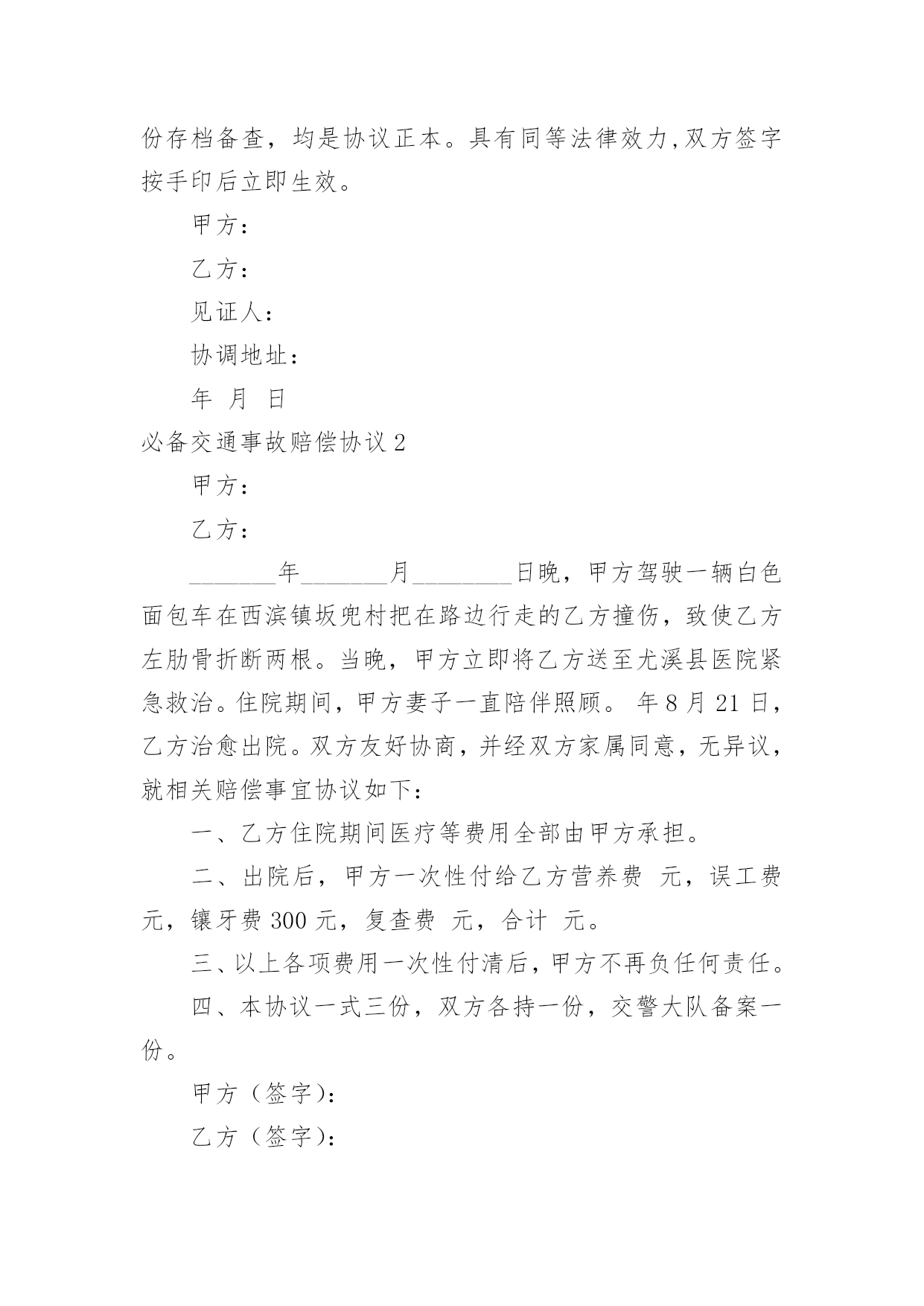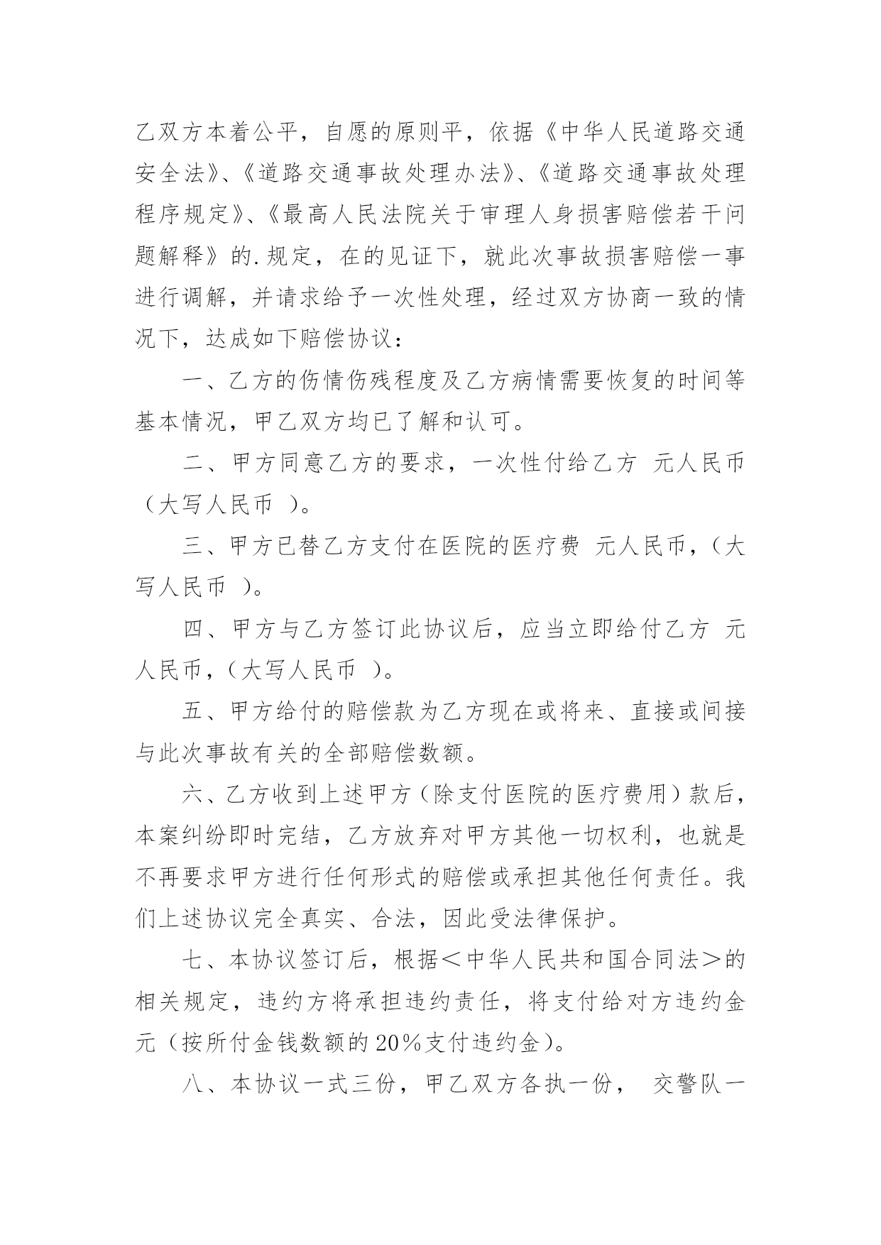 交通事故赔偿协议必备交通事故赔偿协议在充满活力,日益开放的今天,协议起到的作用越来越大,签订协议可以使双方受到法律的保护。拟起协议来就毫无头绪?下面是小编整理的必备交通事故赔偿协议,希望对大家有所帮助。必备交通事故赔偿协议1甲方:(肇事方)男,年出生,族。身份证号:住址:联系方式:乙方:(受害方)女,年出生,族。身份证号:住址:联系方式:年月日,在造成受伤,此事发生后,乙方被送到医院治疗,经诊断:。乙方在医院住院天进行康复休养,在此期间共花费医疗费元人民币(大写)。目前伤势已经基本痊愈,根据医院的主治医师的意见可以回家进行调养。为此甲乙双方本着公平,自愿的原则平,依据《中华人民道路交通安全法》、《道路交通事故处理办法》、《道路交通事故处理程序规定》、《最高人民法院关于审理人身损害赔偿若干问题解释》的.规定,在的见证下,就此次事故损害赔偿一事进行调解,并请求给予一次性处理,经过双方协商一致的情况下,达成如下赔偿协议:一、乙方的伤情伤残程度及乙方病情需要恢复的时间等基本情况,甲乙双方均已了解和认可。二、甲方同意乙方的要求,一次性付给乙方元人民币(大写人民币)。三、甲方已替乙方支付在医院的医疗费元人民币,(大写人民币)。四、甲方与乙方签订此协议后,应当立即给付乙方元人民币,(大写人民币)。五、甲方给付的赔偿款为乙方现在或将来、直接或间接与此次事故有关的全部赔偿数额。六、乙方收到上述甲方(除支付医院的医疗费用)款后,本案纠纷即时完结,乙方放弃对甲方其他一切权利,也就是不再要求甲方进行任何形式的赔偿或承担其他任何责任。我们上述协议完全真实、合法,因此受法律保护。七、本协议签订后,根据<中华人民共和国合同法>的相关规定,违约方将承担违约责任,将支付给对方违约金元(按所付金钱数额的20%支付违约金)。八、本协议一式三份,甲乙双方各执一份,交警队一份存档备查,均是协议正本。具有同等法律效力,双方签字按手印后立即生效。甲方:乙方:见证人:协调地址:年月日必备交通事故赔偿协议2甲方:乙方:_______年_______月________日晚,甲方驾驶一辆白色面包车在西滨镇坂兜村把在路边行走的乙方撞伤,致使乙方左肋骨折断两根。当晚,甲方立即将乙方送至尤溪县医院紧急救治。住院期间,甲方妻子一直陪伴照顾。年8月21日,乙方治愈出院。双方友好协商,并经双方家属同意,无异议,就相关赔偿事宜协议如下:一、乙方住院期间医疗等费用全部由甲方承担。二、出院后,甲方一次性付给乙方营养费元,误工费元,镶牙费300元,复查费元,合计元。三、以上各项费用一次性付清后,甲方不再负任何责任。四、本协议一式三份,双方各持一份,交警大队备案一份。甲方(签字):乙方(签字):年月日
