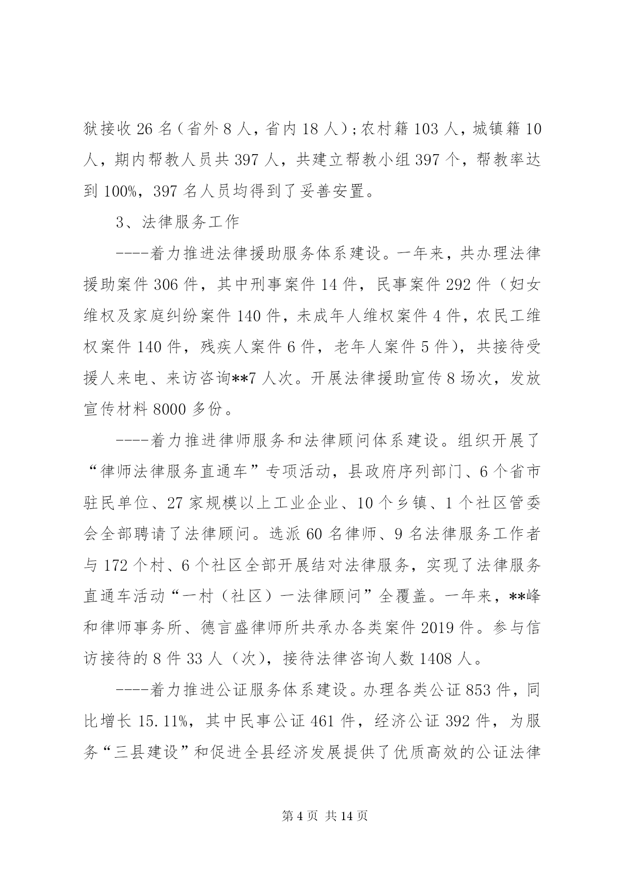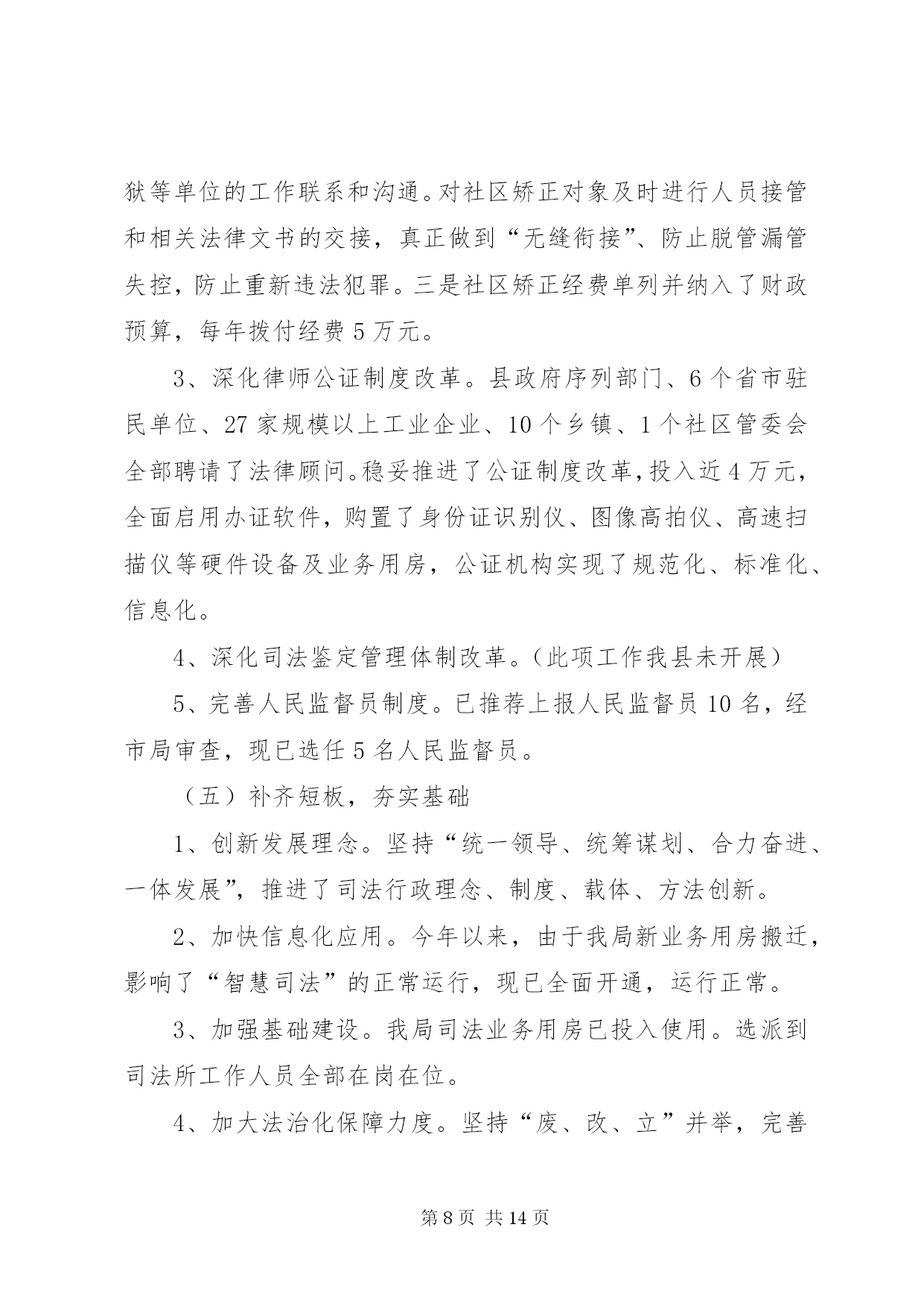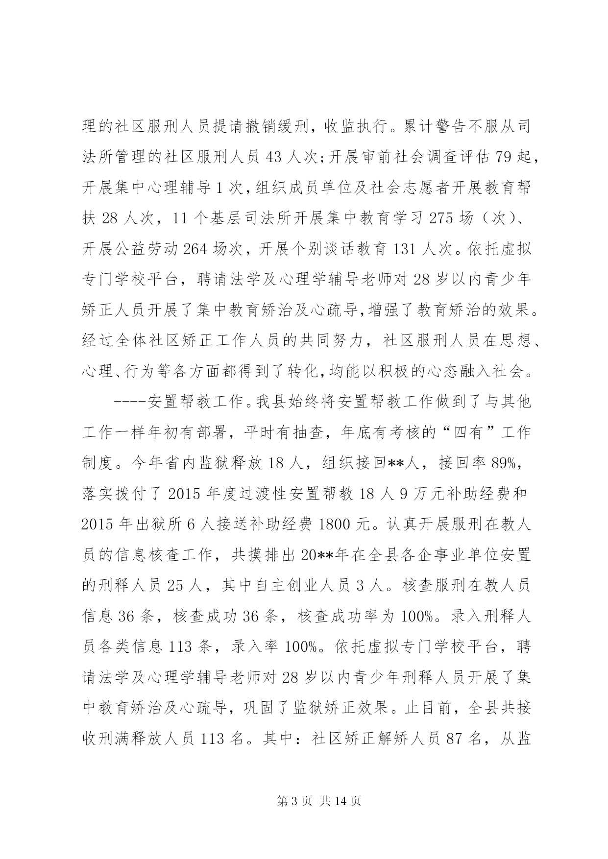第PAGE\*Arabic\*MERGEFORMAT14页共NUMPAGES\*MERGEFORMAT14页县司法局自查自评报告市局考评工作领导小组:根据《全市司法行政工作绩效考评办法》和《**市司法局关于做好20**年度绩效考评工作的通知》,我们对20**年度工作完成情况进行了自查自评,自我评价总体工作完成情况得分为100分,申请加分项3个,共33.5分,自评减分0分,并对提交相关报告和证明材料的真实性负责。具体自查自评情况如下:一、常规工作完成情况1、普法依法治理工作20**年,我们扎实开展“法律八进”活动,采取多种形式,加强法治宣传教育工作。依托县职教中心举办了新型农民职业技术培训班,开展了《崇尚科学反对邪教构建和谐促进发展》的专题讲座12场(次),使农民群众初步掌握了反邪教基本常识及相关法律法规政策,有效提高了识邪辨邪、防邪治邪的能力和水平。结合3.15等重点法治宣传日,采取设立咨询台、展出宣传板面、发放宣传资料等形式在城乡集中进行法律宣传咨询服务活动122场(次),在全县范围内赠送图书资料和发放便民联系卡、法律援助指南、法律服务卡等宣传资料5万余册(份)。通过电信、移动、联通等通信公司先后发送普法手机短信336条,在县电视台播出宣传标语158条(次),掀起了全民学法用法守法的热潮。县政府常务会XX县区委常委会专题研究“七五”普法工作,批转了《县委宣传部、县司法局关于在全县公民中开展法治宣传教育第七个五年规划(2016-2020)》。12月13日召开了全县第七次法治宣传教育工作会议,会议总结全县“六五”普法工作,表彰先进集体和先进个人,安排部署了全县“七五”普法工作。2、基层基础工作----人民调解工作。我们始终将矛盾纠纷调处化解工作作为重要工作摆上议事日程抓紧抓好,全力维护社会和谐稳定。全县各级调委会共调解各类矛盾纠纷3794起,调处成功3742件,调解成功率为98.6%,涉及金额972.97万元,其中疑难案件204起。运用“三调联动”机制调处案件共**2件,达到调处纠纷总和的4.3%。诉前司法确认案件50件。“**县矛盾纠纷网上调解中心”及“人民调解指导中心”正常运行;进一步规范行业性人民调解委员会的工作,协助各行业人民调解委员会开展矛盾纠纷化解工作,行业性调委会共调处矛盾纠纷185起,调解成功179起,成功率为97%。----社区矫正工作。通过上级业务部门的指导,积极组织社区矫正工作人员参加各种业务培训、讲座,强化日常专业知识学习,进一步提高了社区矫正工作人员的综合能力。全县累计接收社区服刑人员570名,累计解除394名,目前在册176名(其中:缓刑173名,假释1名,暂予监外执行1名,管制1名)。20**年重新违法犯罪1人。累计重新违法犯罪2名,对2名不服从管理的社区服刑人员提请撤销缓刑,收监执行。累计警告不服从司法所管理的社区服刑人员43人次;开展审前社会调查评估79起,开展集中心理辅导1次,组织成员单位及社会志愿者开展教育帮扶28人次,11个基层司法所开展集中教育学习275场(次)、开展公益劳动264场次,开展个别谈话教育131人次。依托虚拟专门学校平台,聘请法学及心理学辅导老师对28岁以内青少年矫正人员开展了集中教育矫治及心疏导,增强了教育矫治的效果。经过全体社区矫正工作人员的共同努力,社区服刑人员在思想、心理、行为等各方面都得到了转化,均能以积极的心态融入社会。----安置帮教工作。我县始终将安置帮教工作做到了与其他工作一样年初有部署,平时有抽查,年底有考核的“四有”工作制度。今年省内监狱释放18人,组织接回**人,接回率89%,落实拨付了2015年度过渡性安置帮教18人9万元补助经费和2015年出狱所6人接送补助经费1800元。认真开展服刑在教人员的信息核查工作,共摸排出20**年在全县各企事业单位安置的刑释人员25人,其中自主创业人员3人。核查服刑在教人员信息36条,核查成功36条,核查成功率为100%。录入刑释人员各类信息113条,录入率100%。依托虚拟专门学校平台,聘请法学及心理学辅导老师对28岁以内青少年刑释人员开展了集中教育矫治及心疏导,巩固了监狱矫正效果。止目前,全县共接收刑满释放人员113名。其中:社区矫正解矫人员87名,从监狱接收26名(省外8人,省内18人);农村籍103人,城镇籍10人,期内帮教人员共397人,共建立帮教小组397个,帮教率达到100%,397名人员均得到了妥善安置。3、法律服务工作----着力推进法律援助服务体系建设。一年来,共办理法律援助案件306件,其中刑事案件14件,民事案件292件(妇女维权及家庭纠纷案件140件,未成年人维权案件4件,农民工维权案件140件,残疾人案件6件,老年人案件5件),共接待受援人来电、来访咨询**7人次