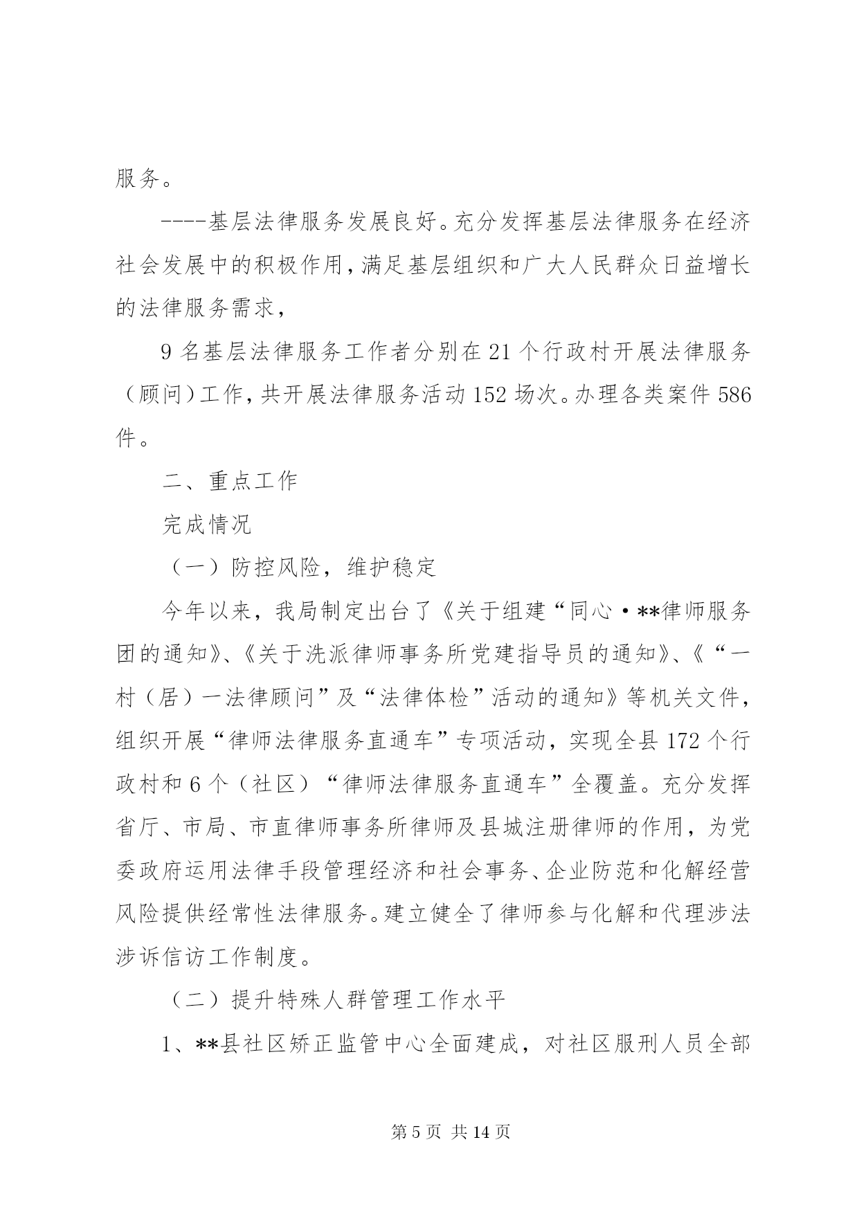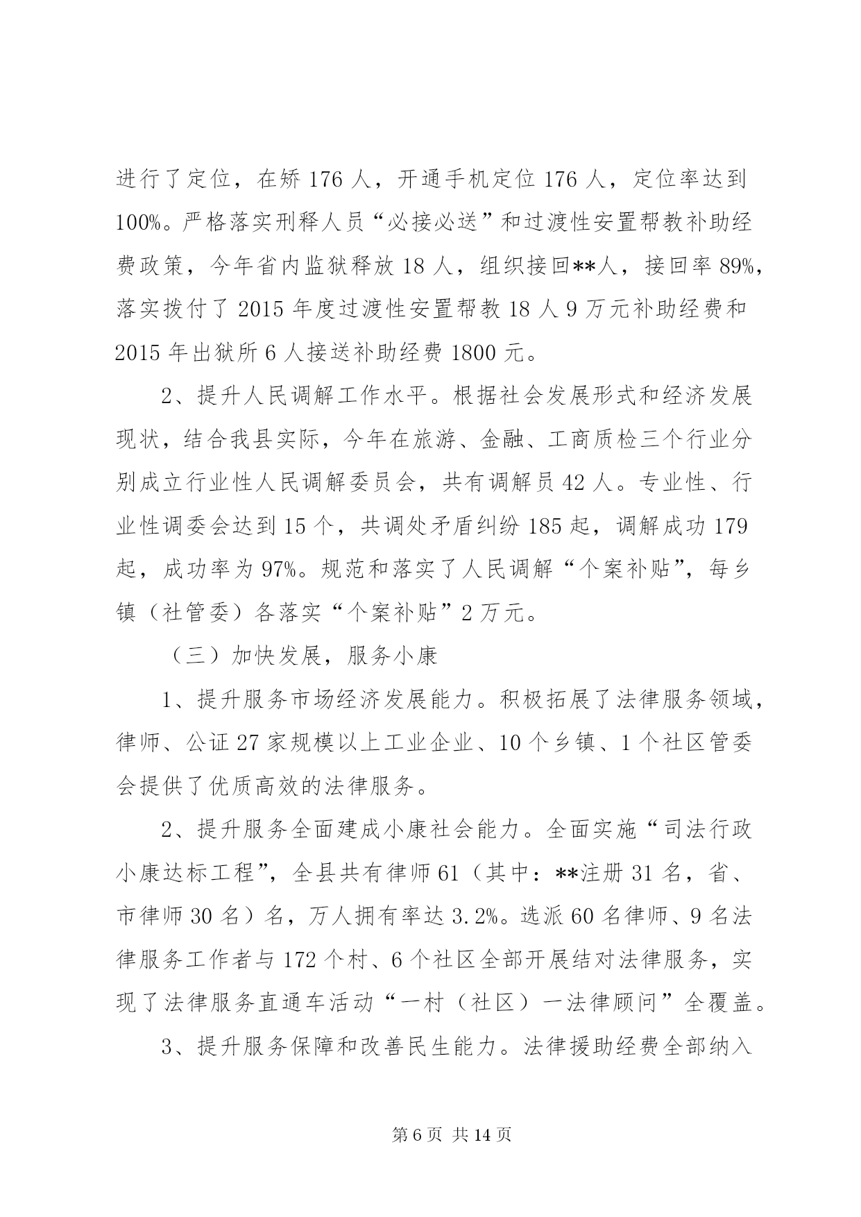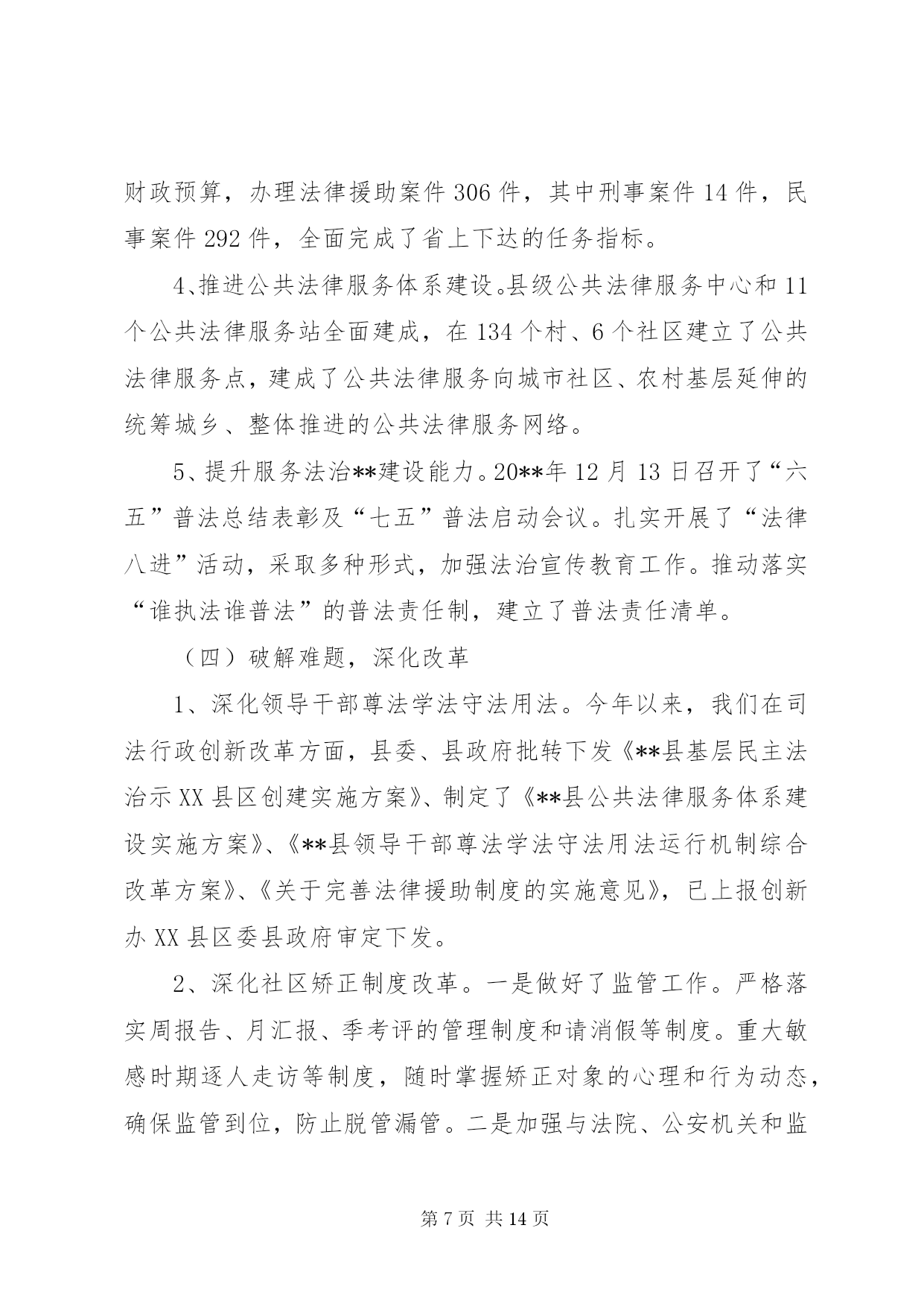 第PAGE\*Arabic\*MERGEFORMAT14页共NUMPAGES\*MERGEFORMAT14页县司法局自查自评报告市局考评工作领导小组:根据《全市司法行政工作绩效考评办法》和《**市司法局关于做好20**年度绩效考评工作的通知》,我们对20**年度工作完成情况进行了自查自评,自我评价总体工作完成情况得分为100分,申请加分项3个,共33.5分,自评减分0分,并对提交相关报告和证明材料的真实性负责。具体自查自评情况如下:一、常规工作完成情况1、普法依法治理工作20**年,我们扎实开展“法律八进”活动,采取多种形式,加强法治宣传教育工作。依托县职教中心举办了新型农民职业技术培训班,开展了《崇尚科学反对邪教构建和谐促进发展》的专题讲座12场(次),使农民群众初步掌握了反邪教基本常识及相关法律法规政策,有效提高了识邪辨邪、防邪治邪的能力和水平。结合3.15等重点法治宣传日,采取设立咨询台、展出宣传板面、发放宣传资料等形式在城乡集中进行法律宣传咨询服务活动122场(次),在全县范围内赠送图书资料和发放便民联系卡、法律援助指南、法律服务卡等宣传资料5万余册(份)。通过电信、移动、联通等通信公司先后发送普法手机短信336条,在县电视台播出宣传标语158条(次),掀起了全民学法用法守法的热潮。县政府常务会XX县区委常委会专题研究“七五”普法工作,批转了《县委宣传部、县司法局关于在全县公民中开展法治宣传教育第七个五年规划(2016-2020)》。12月13日召开了全县第七次法治宣传教育工作会议,会议总结全县“六五”普法工作,表彰先进集体和先进个人,安排部署了全县“七五”普法工作。2、基层基础工作----人民调解工作。我们始终将矛盾纠纷调处化解工作作为重要工作摆上议事日程抓紧抓好,全力维护社会和谐稳定。全县各级调委会共调解各类矛盾纠纷3794起,调处成功3742件,调解成功率为98.6%,涉及金额972.97万元,其中疑难案件204起。运用“三调联动”机制调处案件共**2件,达到调处纠纷总和的4.3%。诉前司法确认案件50件。“**县矛盾纠纷网上调解中心”及“人民调解指导中心”正常运行;进一步规范行业性人民调解委员会的工作,协助各行业人民调解委员会开展矛盾纠纷化解工作,行业性调委会共调处矛盾纠纷185起,调解成功179起,成功率为97%。----社区矫正工作。通过上级业务部门的指导,积极组织社区矫正工作人员参加各种业务培训、讲座,强化日常专业知识学习,进一步提高了社区矫正工作人员的综合能力。全县累计接收社区服刑人员570名,累计解除394名,目前在册176名(其中:缓刑173名,假释1名,暂予监外执行1名,管制1名)。20**年重新违法犯罪1人。累计重新违法犯罪2名,对2名不服从管理的社区服刑人员提请撤销缓刑,收监执行。累计警告不服从司法所管理的社区服刑人员43人次;开展审前社会调查评估79起,开展集中心理辅导1次,组织成员单位及社会志愿者开展教育帮扶28人次,11个基层司法所开展集中教育学习275场(次)、开展公益劳动264场次,开展个别谈话教育131人次。依托虚拟专门学校平台,聘请法学及心理学辅导老师对28岁以内青少年矫正人员开展了集中教育矫治及心疏导,增强了教育矫治的效果。经过全体社区矫正工作人员的共同努力,社区服刑人员在思想、心理、行为等各方面都得到了转化,均能以积极的心态融入社会。----安置帮教工作。我县始终将安置帮教工作做到了与其他工作一样年初有部署,平时有抽查,年底有考核的“四有”工作制度。今年省内监狱释放18人,组织接回**人,接回率89%,落实拨付了2015年度过渡性安置帮教18人9万元补助经费和2015年出狱所6人接送补助经费1800元。认真开展服刑在教人员的信息核查工作,共摸排出20**年在全县各企事业单位安置的刑释人员25人,其中自主创业人员3人。核查服刑在教人员信息36条,核查成功36条,核查成功率为100%。录入刑释人员各类信息113条,录入率100%。依托虚拟专门学校平台,聘请法学及心理学辅导老师对28岁以内青少年刑释人员开展了集中教育矫治及心疏导,巩固了监狱矫正效果。止目前,全县共接收刑满释放人员113名。其中:社区矫正解矫人员87名,从监狱接收26名(省外8人,省内18人);农村籍103人,城镇籍10人,期内帮教人员共397人,共建立帮教小组397个,帮教率达到100%,397名人员均得到了妥善安置。3、法律服务工作----着力推进法律援助服务体系建设。一年来,共办理法律援助案件306件,其中刑事案件14件,民事案件292件(妇女维权及家庭纠纷案件140件,未成年人维权案件4件,农民工维权案件140件,残疾人案件6件,老年人案件5件),共接待受援人来电、来访咨询**7人次