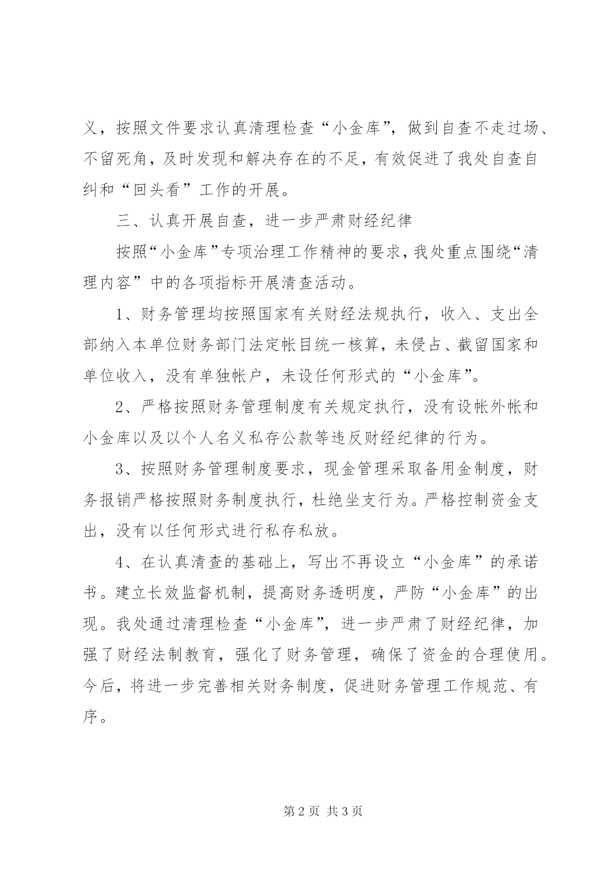 第PAGE\*Arabic\*MERGEFORMAT3页共NUMPAGES\*MERGEFORMAT3页小金库治理工作总结关于“小金库”专项治理工作的工作总结按照市治理“小金库”工作领导小组办公室《关于转发中治办[201*]7号文件深入贯彻落实贺国强同志关于“小金库”治理工作重要指示精神的通知》吉治金办[201*]9号文件要求和部署,我处高度重视,迅速行动,认真组织学习贯彻中共中央政治局常委、中纪委书纪贺国强同志的重要指示精神,确保“小金库”治理工作按照中央的要求在年底前完成。现将工作情况总结如下:一、领导重视,认识到位处领导积极将“小金库”问题与市委“思想大解放、作风大转变、服务大提升”主题教育有机结合起来。组织全体干部职工认真学习领会中央、省、市和有关文件精神,全面安排部署此项工作。把深入开展“小金库”专项治理工作,作为源头上防治腐败和深入贯彻落实建立健全惩治和预防腐败体系的一项重要举措。二、加强宣传,掌握政策为使“小金库”专项治理工作深入开展,形成声势,我处开展了多形式、多角度地宣传中央、省和市委、政府关于“小金库”专项治理工作的重要意义、工作内容和政策规定,深入学习“小金库”专项治理的各种文件和政策要求,鼓励广大干部职工积极参与“小金库”专项治理工作,充分认识开展此项工作的重大意义,按照文件要求认真清理检查“小金库”,做到自查不走过场、不留死角,及时发现和解决存在的不足,有效促进了我处自查自纠和“回头看”工作的开展。三、认真开展自查,进一步严肃财经纪律按照“小金库”专项治理工作精神的要求,我处重点围绕“清理内容”中的各项指标开展清查活动。1、财务管理均按照国家有关财经法规执行,收入、支出全部纳入本单位财务部门法定帐目统一核算,未侵占、截留国家和单位收入,没有单独帐户,未设任何形式的“小金库”。2、严格按照财务管理制度有关规定执行,没有设帐外帐和小金库以及以个人名义私存公款等违反财经纪律的行为。3、按照财务管理制度要求,现金管理采取备用金制度,财务报销严格按照财务制度执行,杜绝坐支行为。严格控制资金支出,没有以任何形式进行私存私放。4、在认真清查的基础上,写出不再设立“小金库”的承诺书。建立长效监督机制,提高财务透明度,严防“小金库”的出现。我处通过清理检查“小金库”,进一步严肃了财经纪律,加强了财经法制教育,强化了财务管理,确保了资金的合理使用。今后,将进一步完善相关财务制度,促进财务管理工作规范、有序。二一一年十二月六日