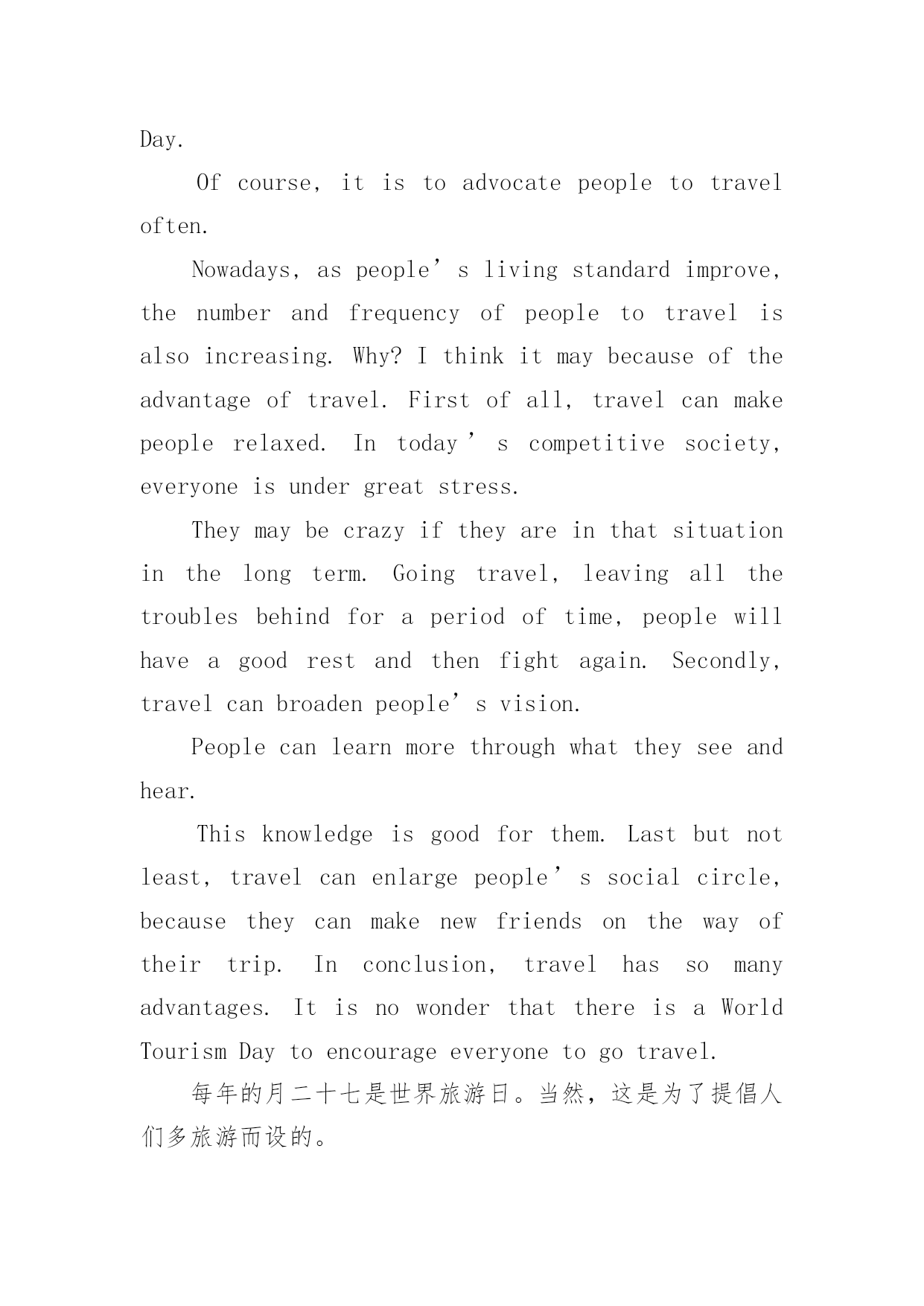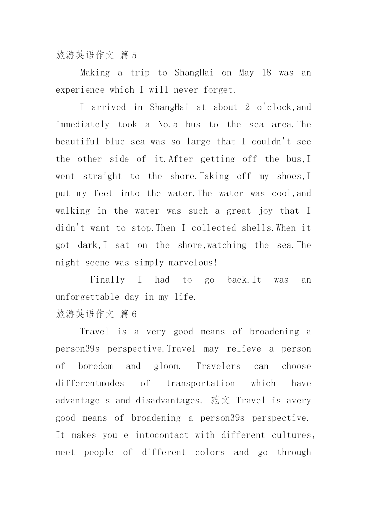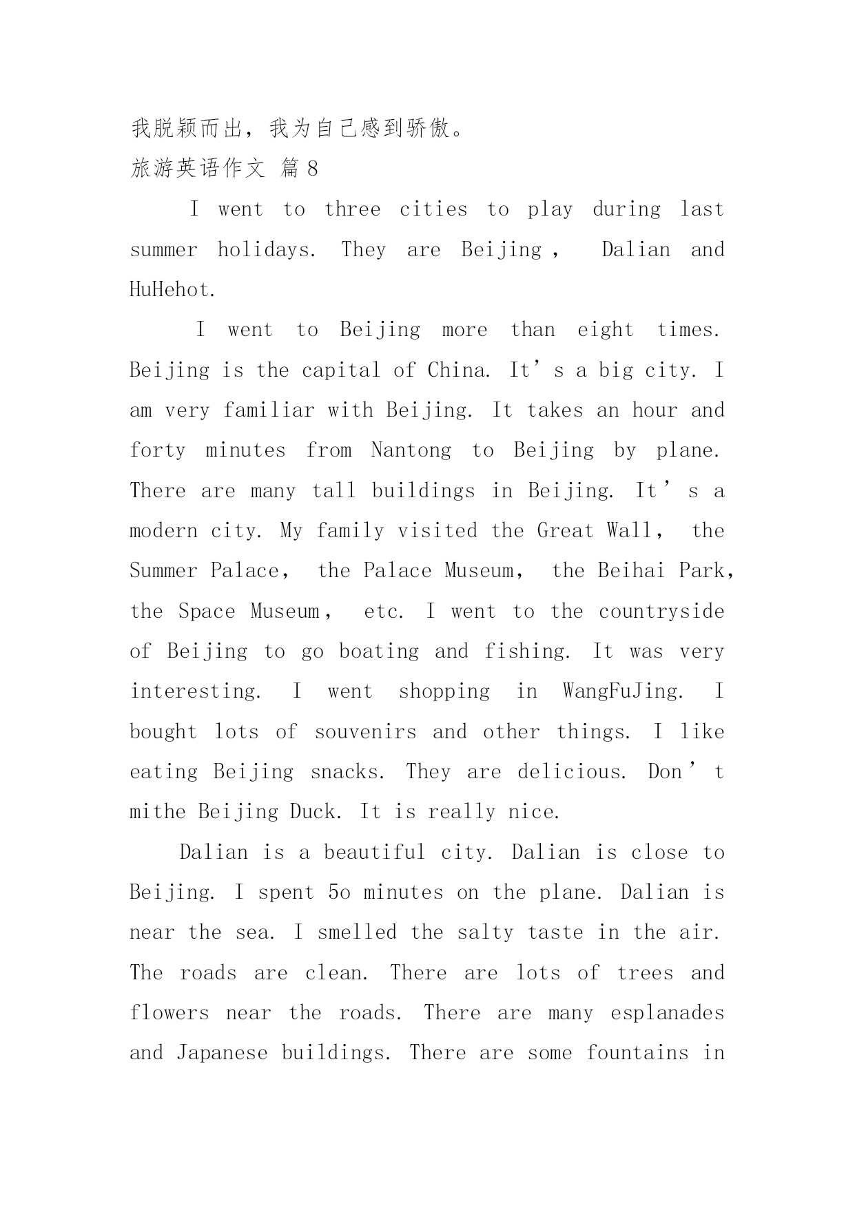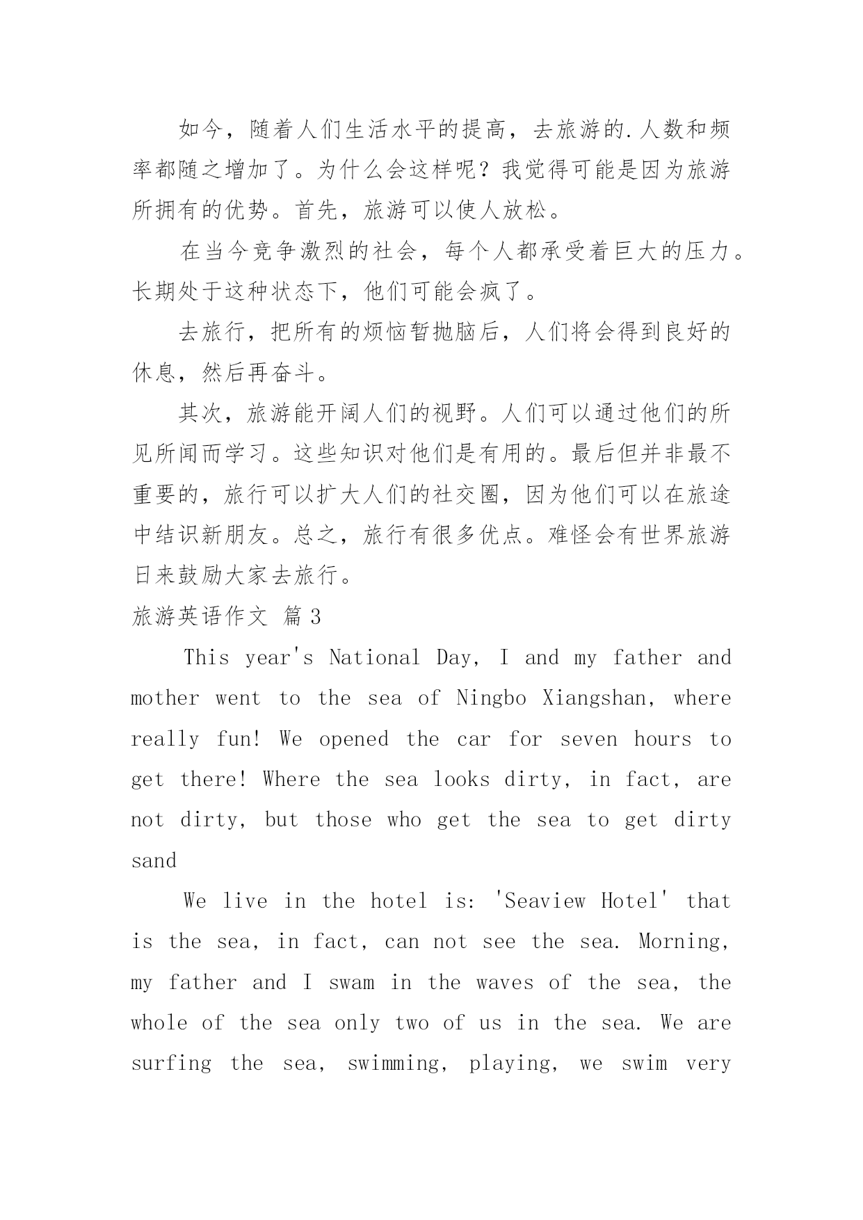 旅游英语作文【实用】旅游英语作文汇总九篇在日常的学习、工作、生活中,大家对作文都不陌生吧,写作文可以锻炼我们的独处习惯,让自己的心静下来,思考自己未来的方向。那么问题来了,到底应如何写一篇优秀的作文呢?以下是小编帮大家整理的旅游英语作文9篇,欢迎阅读,希望大家能够喜欢。旅游英语作文篇1Nowadays,travelingisbecomingamoreandmoreimportantpartofourlife.Butsometravelershavesomebadbehaviorsandhabitswhilevisitingsomeplacesofinterest.Somemakenoisesinpublicplaces.Othersthrowrubbishandwriteordraweverywhereandsoon.Asamiddleschoolstudent,Ithinkweshouldpayattentiontoourbehaviors.Forexample,throwrubbishintodustbinsanddon’twriteordrawontherelics.Don’tmakenoisesinpublicplaces.We’dbetterfollowguidesandobeyorders.Atthesametime,weshouldnotonlyprotectnaturalenvironmentbutalsorespectlocalcustomsandtraditions.旅游英语作文篇227th,SeptemberofeveryyearisWorldTourismDay.Ofcourse,itistoadvocatepeopletotraveloften.Nowadays,aspeople’slivingstandardimprove,thenumberandfrequencyofpeopletotravelisalsoincreasing.Why?Ithinkitmaybecauseoftheadvantageoftravel.Firstofall,travelcanmakepeoplerelaxed.Intoday’scompetitivesociety,everyoneisundergreatstress.Theymaybecrazyiftheyareinthatsituationinthelongterm.Goingtravel,leavingallthetroublesbehindforaperiodoftime,peoplewillhaveagoodrestandthenfightagain.Secondly,travelcanbroadenpeople’svision.Peoplecanlearnmorethroughwhattheyseeandhear.Thisknowledgeisgoodforthem.Lastbutnotleast,travelcanenlargepeople’ssocialcircle,becausetheycanmakenewfriendsonthewayoftheirtrip.Inconclusion,travelhassomanyadvantages.ItisnowonderthatthereisaWorldTourismDaytoencourageeveryonetogotravel.每年的月二十七是世界旅游日。当然,这是为了提倡人们多旅游而设的。如今,随着人们生活水平的提高,去旅游的.人数和频率都随之增加了。为什么会这样呢?我觉得可能是因为旅游所拥有的优势。首先,旅游可以使人放松。在当今竞争激烈的社会,每个人都承受着巨大的压力。长期处于这种状态下,他们可能会疯了。去旅行,把所有的烦恼暂抛脑后,人们将会得到良好的休息,然后再奋斗。其次,旅游能开阔人们的视野。人们可以通过他们的所见所闻而学习。这些知识对他们是有用的。最后但并非最不重要的,旅行可以扩大人们的社交圈,因为他们可以在旅途中结识新朋友。总之,旅行有很多优点。难怪会有世界旅游日来鼓励大家去旅行。旅游英语作文篇3Thisyear'sNationalDay,IandmyfatherandmotherwenttotheseaofNingboXiangshan,wherereallyfun!Weopenedthecarforsevenhourstogetthere!Wherethesealooksdirty,infact,arenotdirty,butthosewhogettheseatogetdirtysandWeliveinthehotelis:'SeaviewHotel'thatisthesea,infac