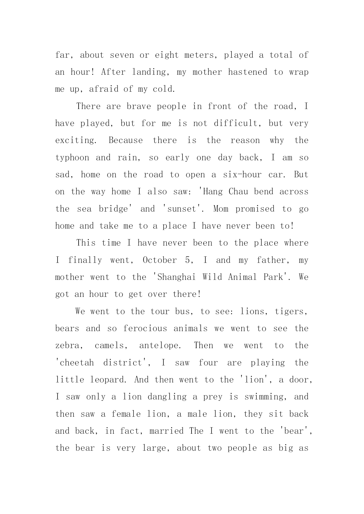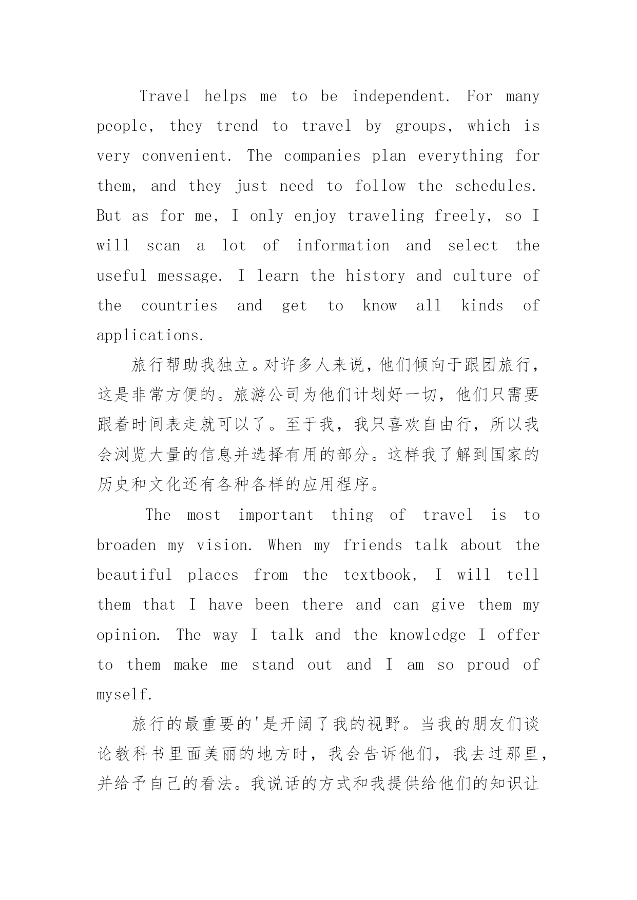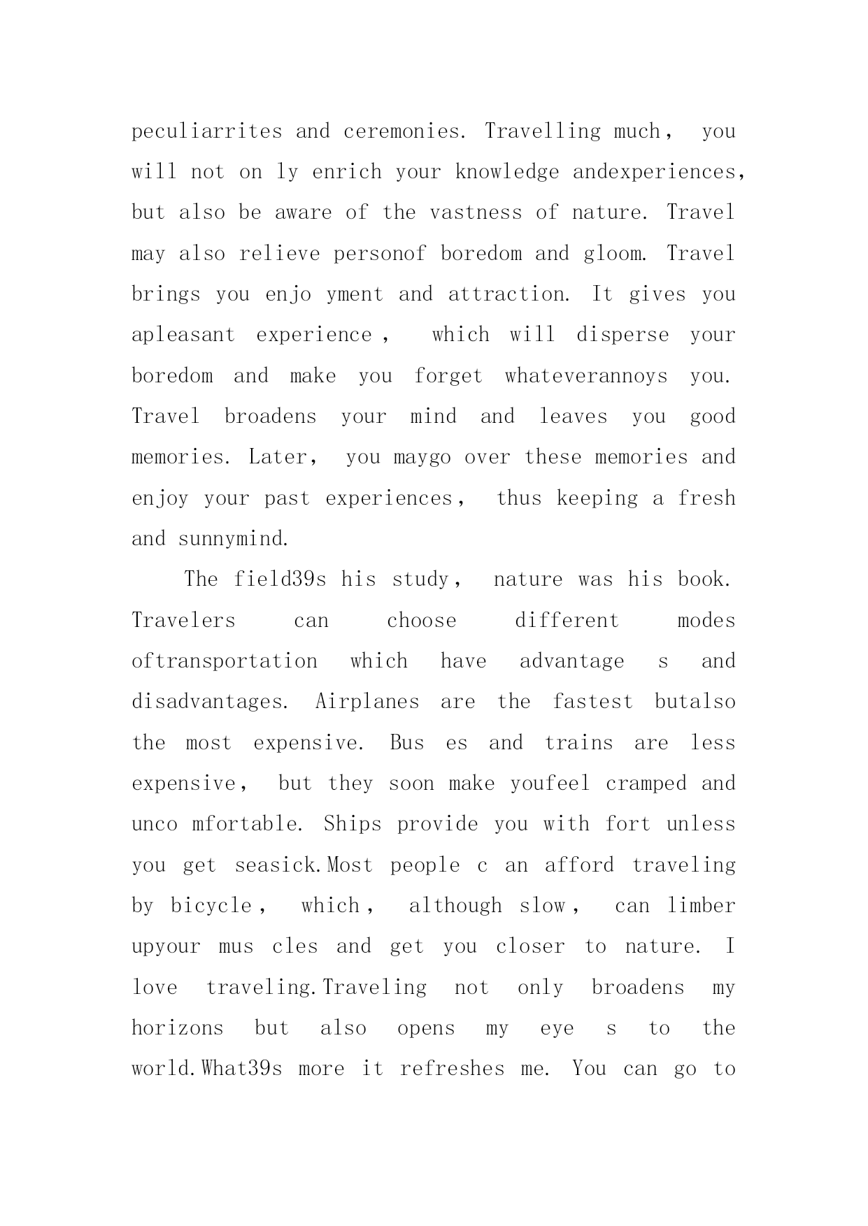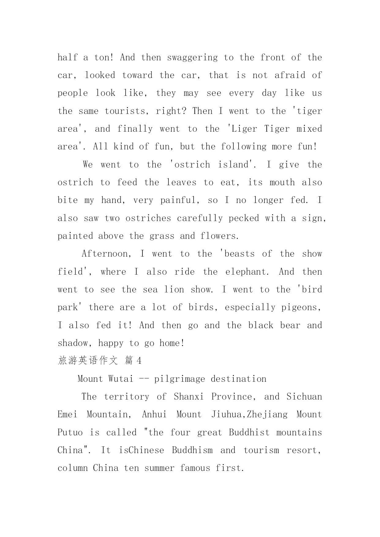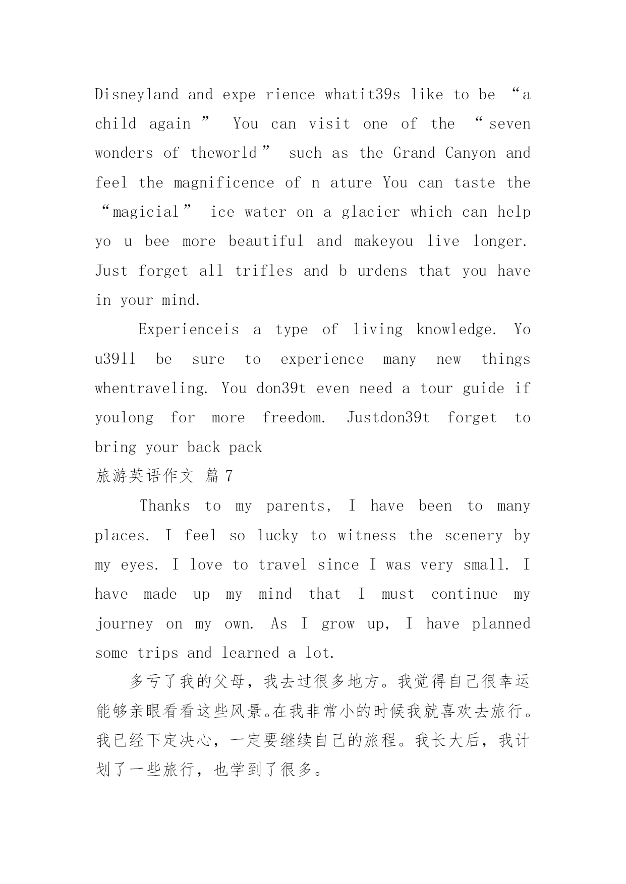 旅游英语作文【实用】旅游英语作文汇总九篇在日常的学习、工作、生活中,大家对作文都不陌生吧,写作文可以锻炼我们的独处习惯,让自己的心静下来,思考自己未来的方向。那么问题来了,到底应如何写一篇优秀的作文呢?以下是小编帮大家整理的旅游英语作文9篇,欢迎阅读,希望大家能够喜欢。旅游英语作文篇1Nowadays,travelingisbecomingamoreandmoreimportantpartofourlife.Butsometravelershavesomebadbehaviorsandhabitswhilevisitingsomeplacesofinterest.Somemakenoisesinpublicplaces.Othersthrowrubbishandwriteordraweverywhereandsoon.Asamiddleschoolstudent,Ithinkweshouldpayattentiontoourbehaviors.Forexample,throwrubbishintodustbinsanddon’twriteordrawontherelics.Don’tmakenoisesinpublicplaces.We’dbetterfollowguidesandobeyorders.Atthesametime,weshouldnotonlyprotectnaturalenvironmentbutalsorespectlocalcustomsandtraditions.旅游英语作文篇227th,SeptemberofeveryyearisWorldTourismDay.Ofcourse,itistoadvocatepeopletotraveloften.Nowadays,aspeople’slivingstandardimprove,thenumberandfrequencyofpeopletotravelisalsoincreasing.Why?Ithinkitmaybecauseoftheadvantageoftravel.Firstofall,travelcanmakepeoplerelaxed.Intoday’scompetitivesociety,everyoneisundergreatstress.Theymaybecrazyiftheyareinthatsituationinthelongterm.Goingtravel,leavingallthetroublesbehindforaperiodoftime,peoplewillhaveagoodrestandthenfightagain.Secondly,travelcanbroadenpeople’svision.Peoplecanlearnmorethroughwhattheyseeandhear.Thisknowledgeisgoodforthem.Lastbutnotleast,travelcanenlargepeople’ssocialcircle,becausetheycanmakenewfriendsonthewayoftheirtrip.Inconclusion,travelhassomanyadvantages.ItisnowonderthatthereisaWorldTourismDaytoencourageeveryonetogotravel.每年的月二十七是世界旅游日。当然,这是为了提倡人们多旅游而设的。如今,随着人们生活水平的提高,去旅游的.人数和频率都随之增加了。为什么会这样呢?我觉得可能是因为旅游所拥有的优势。首先,旅游可以使人放松。在当今竞争激烈的社会,每个人都承受着巨大的压力。长期处于这种状态下,他们可能会疯了。去旅行,把所有的烦恼暂抛脑后,人们将会得到良好的休息,然后再奋斗。其次,旅游能开阔人们的视野。人们可以通过他们的所见所闻而学习。这些知识对他们是有用的。最后但并非最不重要的,旅行可以扩大人们的社交圈,因为他们可以在旅途中结识新朋友。总之,旅行有很多优点。难怪会有世界旅游日来鼓励大家去旅行。旅游英语作文篇3Thisyear'sNationalDay,IandmyfatherandmotherwenttotheseaofNingboXiangshan,wherereallyfun!Weopenedthecarforsevenhourstogetthere!Wherethesealooksdirty,infact,arenotdirty,butthosewhogettheseatogetdirtysandWeliveinthehotelis:'SeaviewHotel'thatisthesea,infac