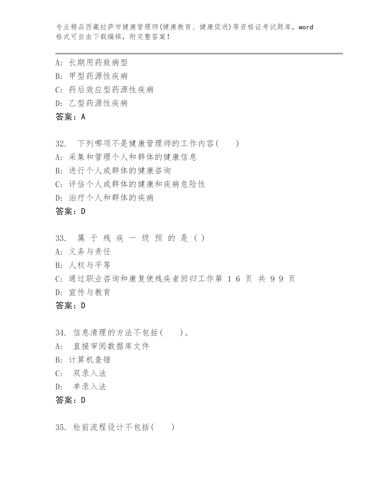 优选西藏拉萨市健康管理师(健康教育、健康促进)等资格证考试精品题库精品(全优)