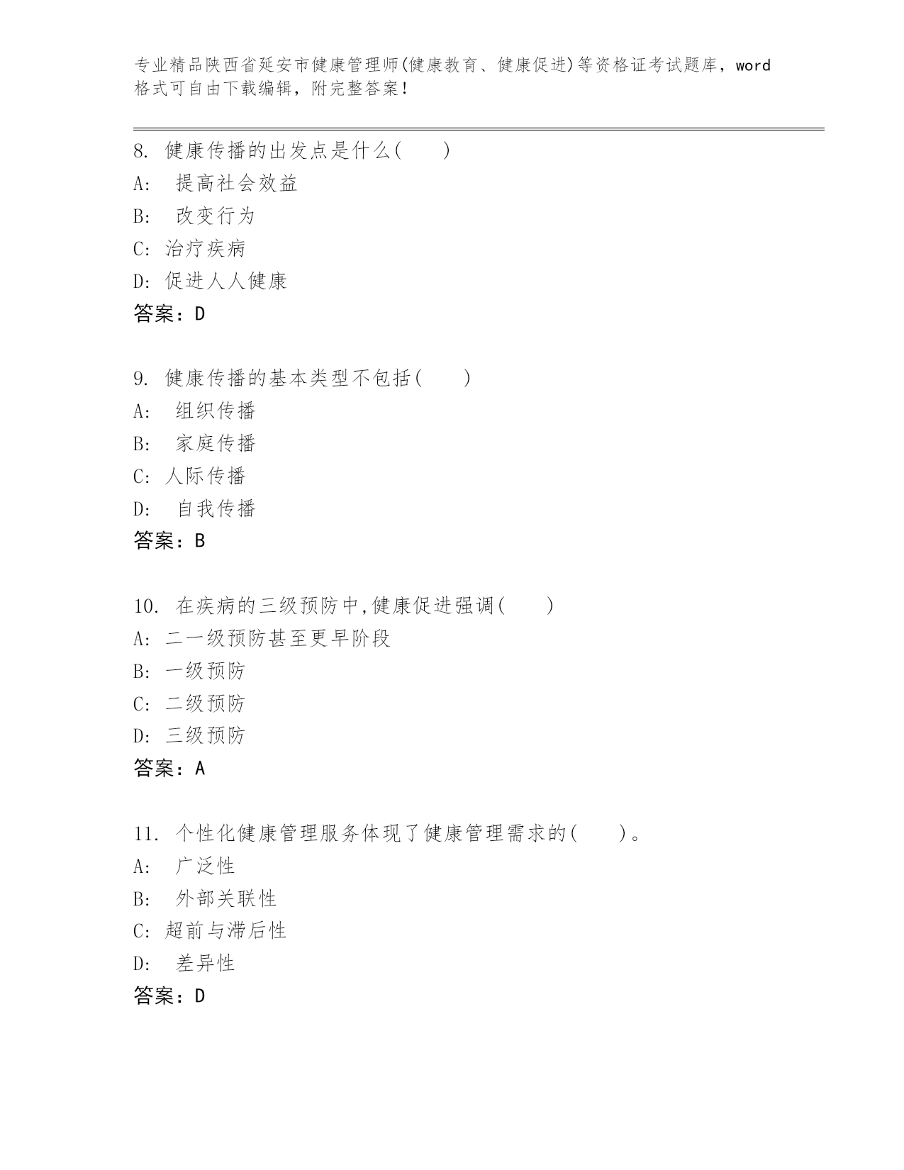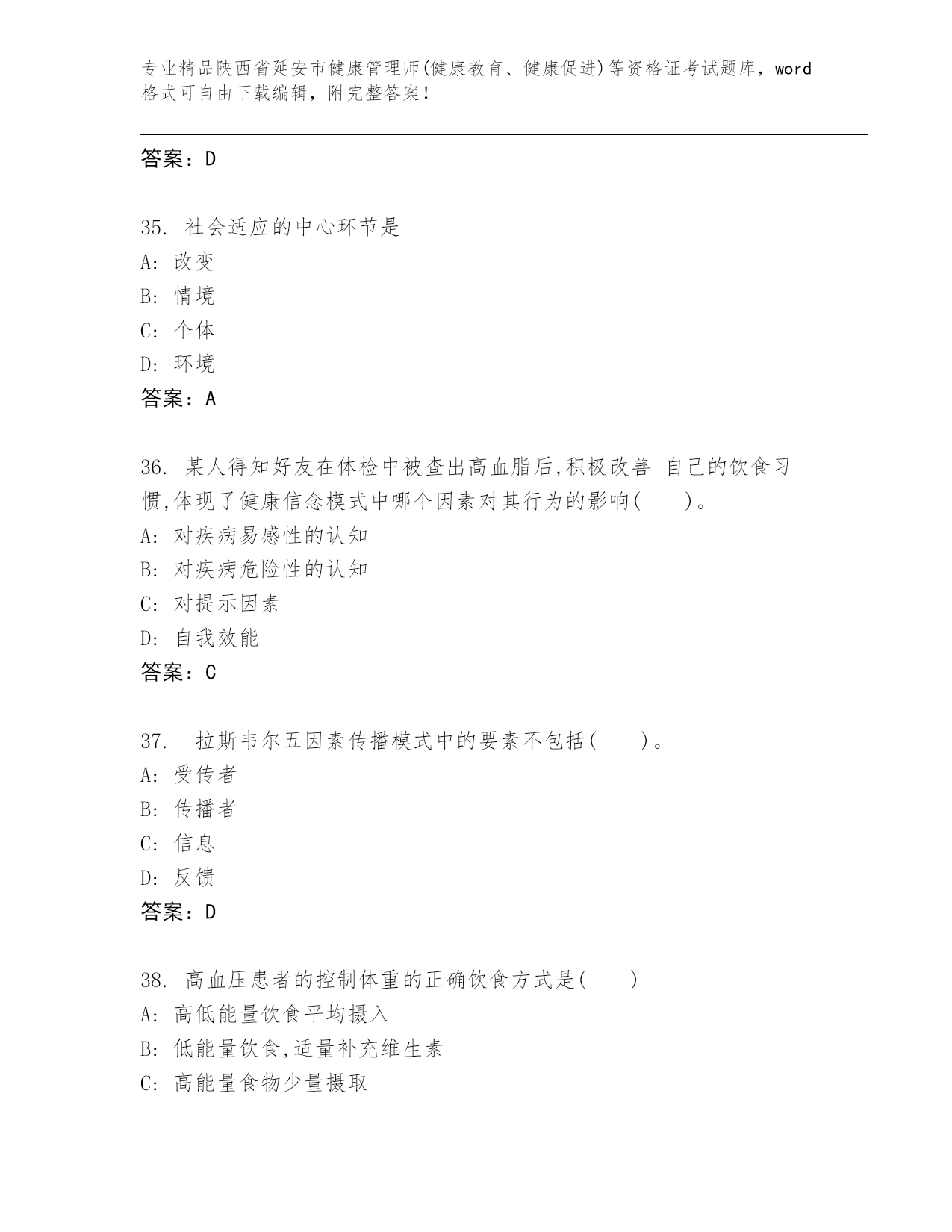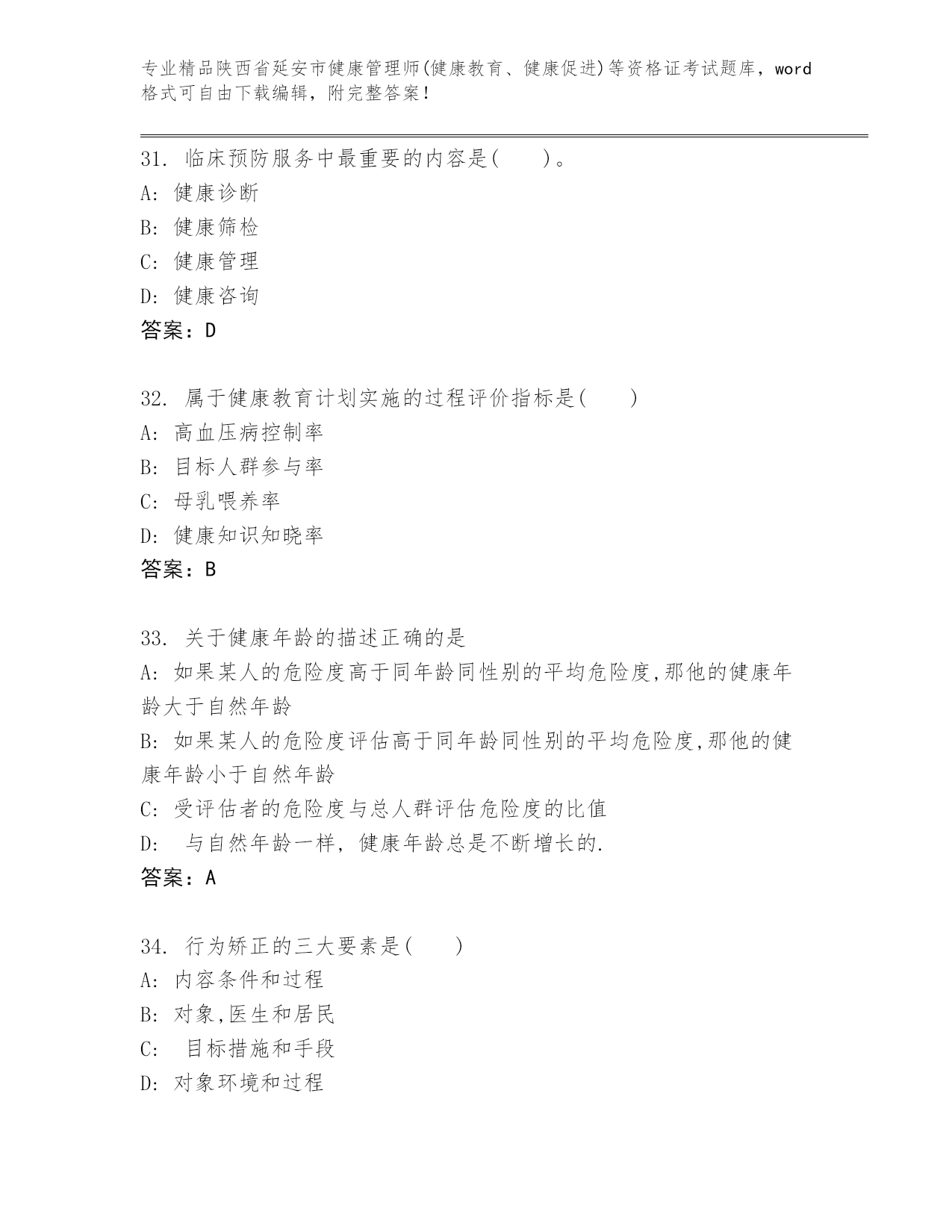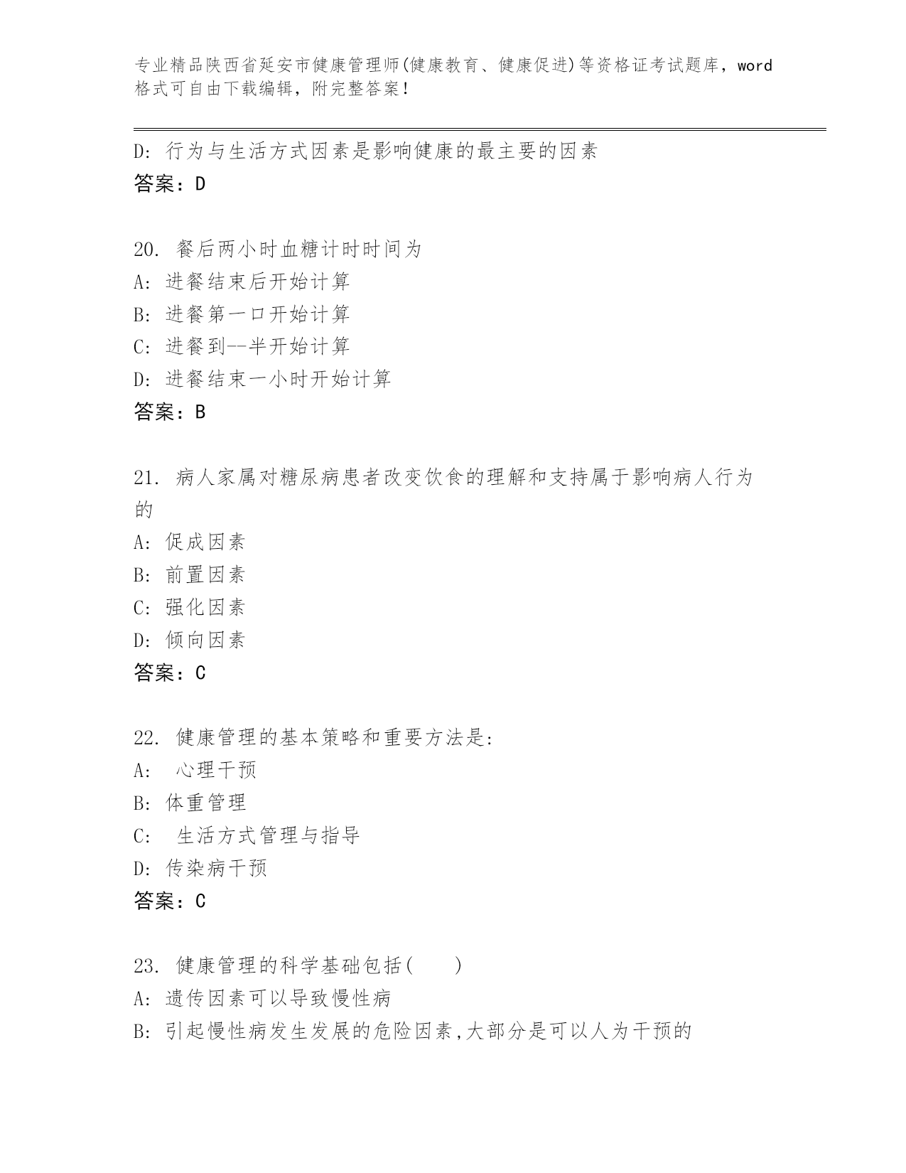 精品陕西省延安市健康管理师(健康教育、健康促进)等资格证考试内部题库【夺冠系列】