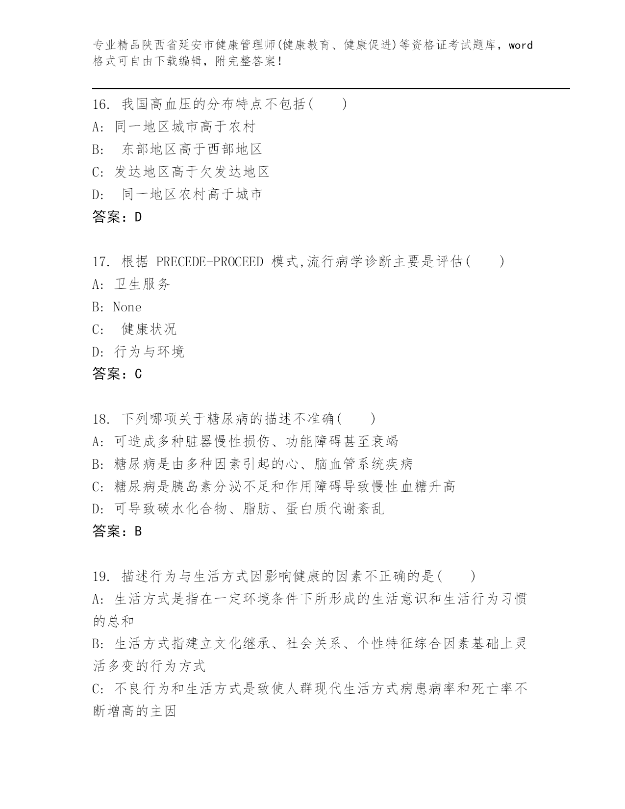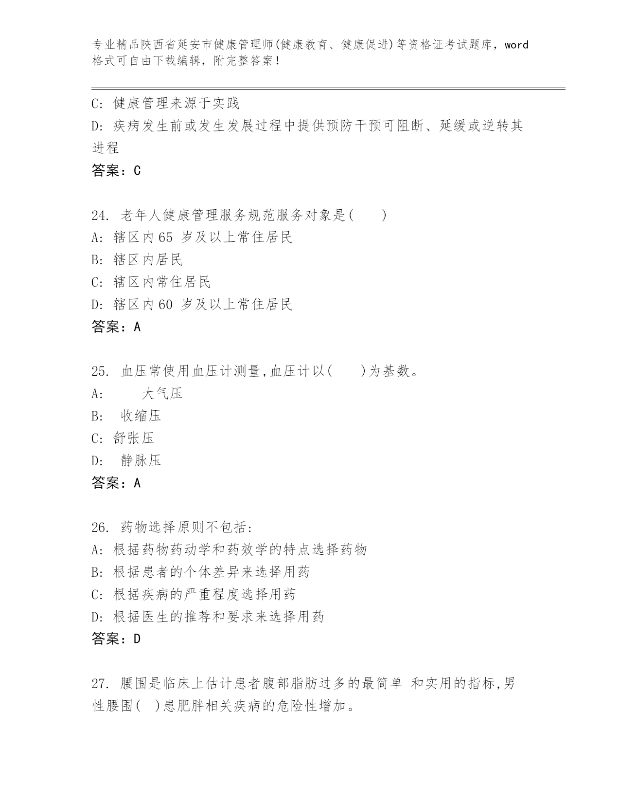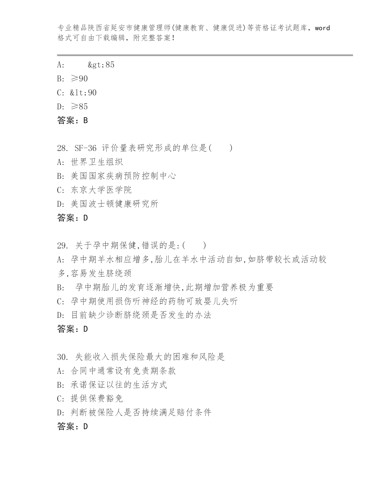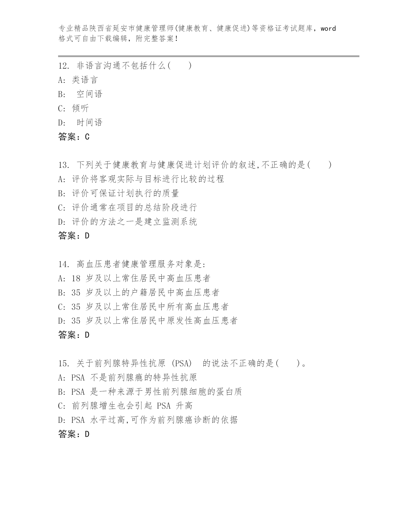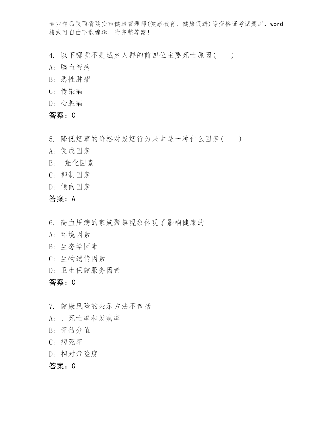 精品陕西省延安市健康管理师(健康教育、健康促进)等资格证考试内部题库【夺冠系列】
