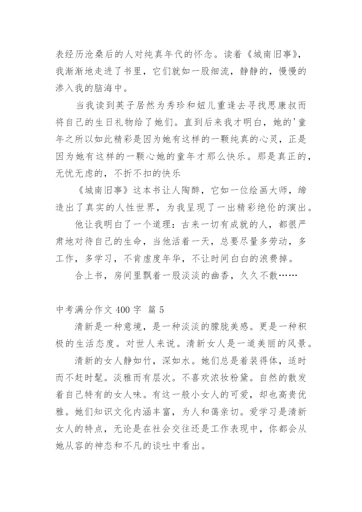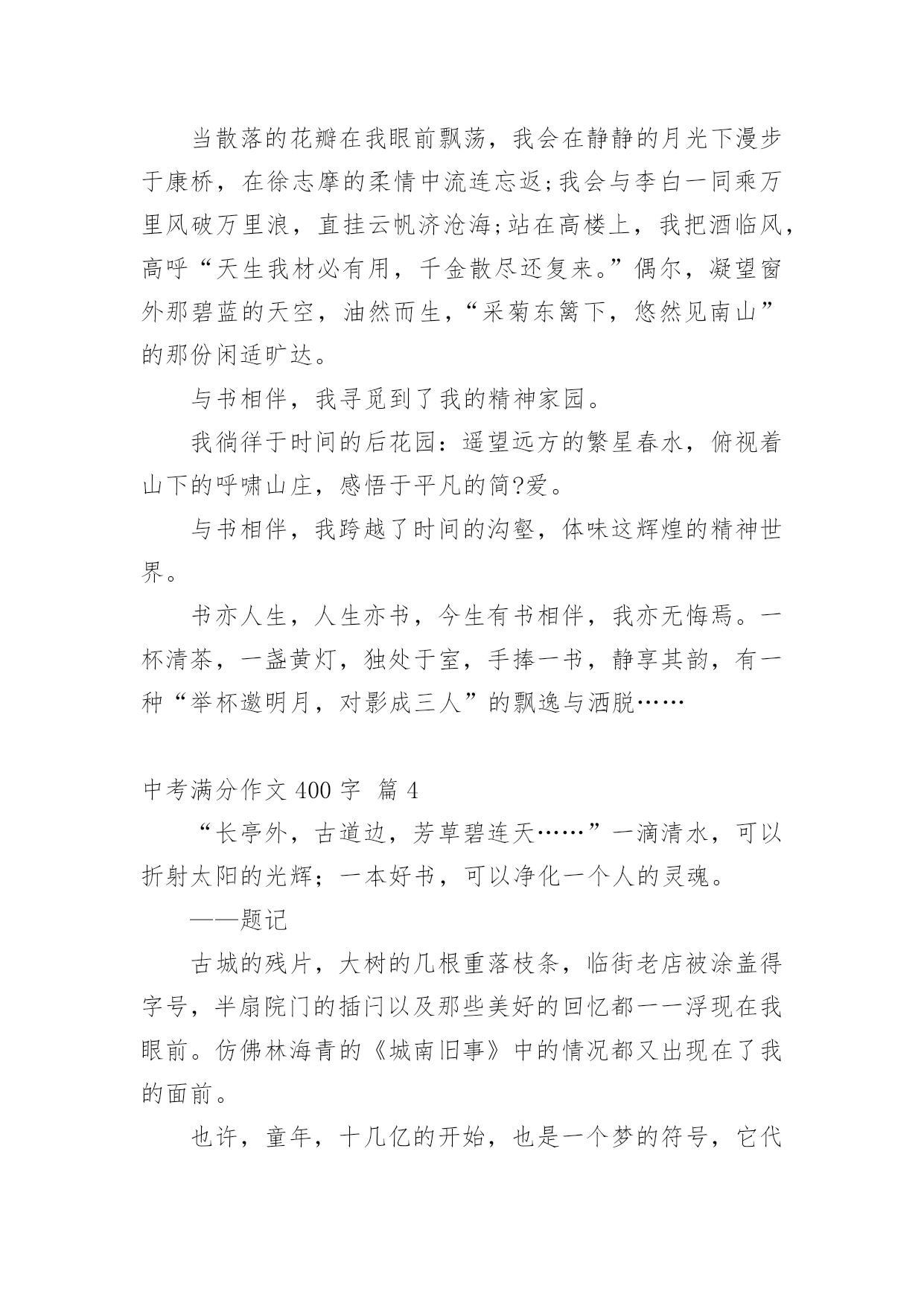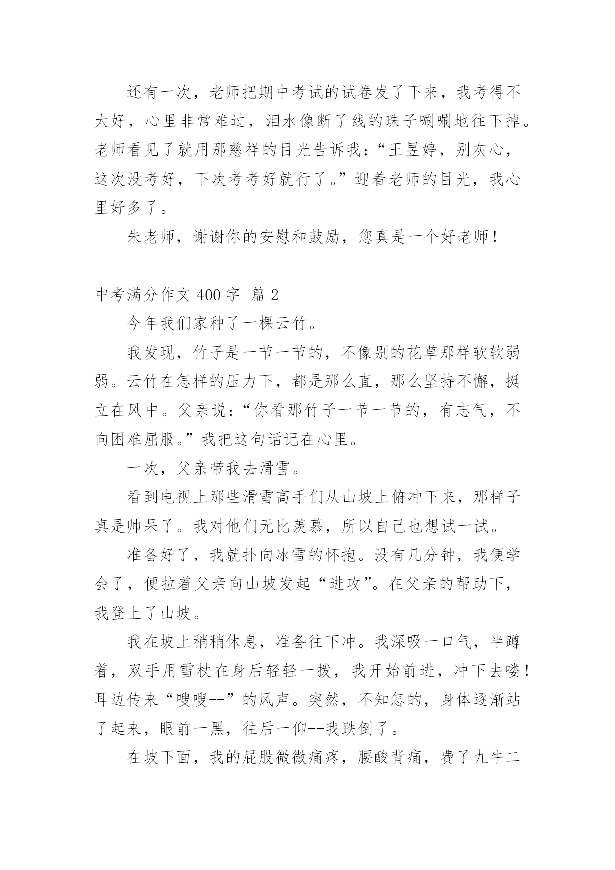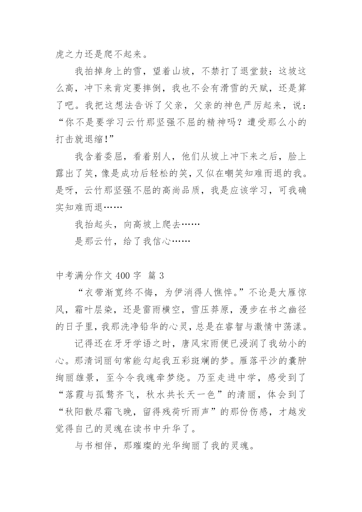 中考满分作文400字实用的中考满分作文400字汇编九篇在生活、工作和学习中,许多人都有过写作文的经历,对作文都不陌生吧,作文是通过文字来表达一个主题意义的记叙方法。怎么写作文才能避免踩雷呢?下面是小编为大家收集的中考满分作文400字10篇,欢迎大家分享。中考满分作文400字篇1在一年级到五年级的学习中,我遇到过许多老师,其中让我印象最深的是三年级的朱老师。朱老师三十多岁,有着一头秀发,加上那炯炯有神的眼睛给人一种和蔼可亲的感觉。每当我失去信心的时候,老师就会用那慈祥的目光鼓励我。有一次上公开课,老师问了一个问题,比较难,我思考了一会儿,想出了答案,刚准备举手,一看周围没有一人举手,又把举到半空的手给放下了。我一直用目光巡视着周围,看看有没有哪位同学举手,我也好跟着举手。可是,还是没有一个同学举手。这时老师似乎看出了我的心思,便叫我起来回答。我回答的声音小得像蚊子哼,就怕答错了,老师同学们笑我。老师用那慈祥的目光看着我,好像在说:“再大声一点儿,你回答错了我们不会笑你的。”老师的鼓励给了我勇气,我大声流利地回答了问题。回答了问题后,老师和同学给了我热烈的掌声,我心里像吃了蜜那样甜。还有一次,老师把期中考试的试卷发了下来,我考得不太好,心里非常难过,泪水像断了线的珠子唰唰地往下掉。老师看见了就用那慈祥的目光告诉我:“王昱婷,别灰心,这次没考好,下次考考好就行了。”迎着老师的目光,我心里好多了。朱老师,谢谢你的安慰和鼓励,您真是一个好老师!中考满分作文400字篇2今年我们家种了一棵云竹。我发现,竹子是一节一节的,不像别的花草那样软软弱弱。云竹在怎样的压力下,都是那么直,那么坚持不懈,挺立在风中。父亲说:“你看那竹子一节一节的,有志气,不向困难屈服。”我把这句话记在心里。一次,父亲带我去滑雪。看到电视上那些滑雪高手们从山坡上俯冲下来,那样子真是帅呆了。我对他们无比羡慕,所以自己也想试一试。准备好了,我就扑向冰雪的怀抱。没有几分钟,我便学会了,便拉着父亲向山坡发起“进攻”。在父亲的帮助下,我登上了山坡。我在坡上稍稍休息,准备往下冲。我深吸一口气,半蹲着,双手用雪杖在身后轻轻一拨,我开始前进,冲下去喽!耳边传来“嗖嗖--”的风声。突然,不知怎的,身体逐渐站了起来,眼前一黑,往后一仰--我跌倒了。在坡下面,我的屁股微微痛疼,腰酸背痛,费了九牛二虎之力还是爬不起来。我拍掉身上的雪,望着山坡,不禁打了退堂鼓:这坡这么高,冲下来肯定要摔倒,我也不会有滑雪的天赋,还是算了吧。我把这想法告诉了父亲,父亲的神色严厉起来,说:“你不是要学习云竹那坚强不屈的精神吗?遭受那么小的打击就退缩!”我含着委屈,看着别人,他们从坡上冲下来之后,脸上露出了笑,像是成功后轻松的笑,又似在嘲笑知难而退的我。是呀,云竹那坚强不屈的高尚品质,我是应该学习,可我确实知难而退……我抬起头,向高坡上爬去……是那云竹,给了我信心……中考满分作文400字篇3“衣带渐宽终不悔,为伊消得人憔悴。”不论是大雁惊风,霜叶层染,还是雷雨横空,雪压莽原,漫步在书之幽径的日子里,我那洗净铅华的心灵,总是在睿智与激情中荡漾。记得还在牙牙学语之时,唐风宋雨便已浸润了我幼小的心。那清词丽句常能勾起我五彩斑斓的梦。雁落平沙的囊肿绚丽雄景,至今令我魂牵梦绕。乃至走进中学,感受到了“落霞与孤鹜齐飞,秋水共长天一色”的清丽,体会到了“秋阳散尽霜飞晚,留得残荷听雨声”的那份伤感,才越发觉得自己的灵魂在读书中升华了。与书相伴,那璀璨的光华绚丽了我的灵魂。当散落的花瓣在我眼前飘荡,我会在静静的月光下漫步于康桥,在徐志摩的柔情中流连忘返;我会与李白一同乘万里风破万里浪,直挂云帆济沧海;站在高楼上,我把酒临风,高呼“天生我材必有用,千金散尽还复来。”偶尔,凝望窗外那碧蓝的天空,油然而生,“采菊东篱下,悠然见南山”的那份闲适旷达。与书相伴,我寻觅到了我的精神家园。我徜徉于时间的后花园:遥望远方的繁星春水,俯视着山下的呼啸山庄,感悟于平凡的简?爱。与书相伴,我跨越了时间的沟壑,体味这辉煌的精神世界。书亦人生,人生亦书,今生有书相伴,我亦无悔焉。一杯清茶,一盏黄灯,独处于室,手捧一书,静享其韵,有一种“举杯邀明月,对影成三人”的飘逸与洒脱……中考满分作文400字篇4“长亭外,古道边,芳草碧连天……”一滴清水,可以折射太阳的光辉;一本好书,可以净化一个人的灵魂。——题记古城的残片,大树的几根重落枝条,临街老店被涂盖得字号,半扇院门的插闩以及那些美好的回忆都一一浮现在我眼前。仿佛林海青的《城南旧事》中的情况都又出现在了我的面前。也许,童年,十几亿的开始,也是一个梦的符号,它代表经历沧桑后的人对纯真年代的怀念。读着《城南旧事》,我渐渐地走进了书里,它们就如一股细流,静静的,慢慢的渗入我的脑海中。当我读到英子居然为秀珍和妞儿重逢去寻
