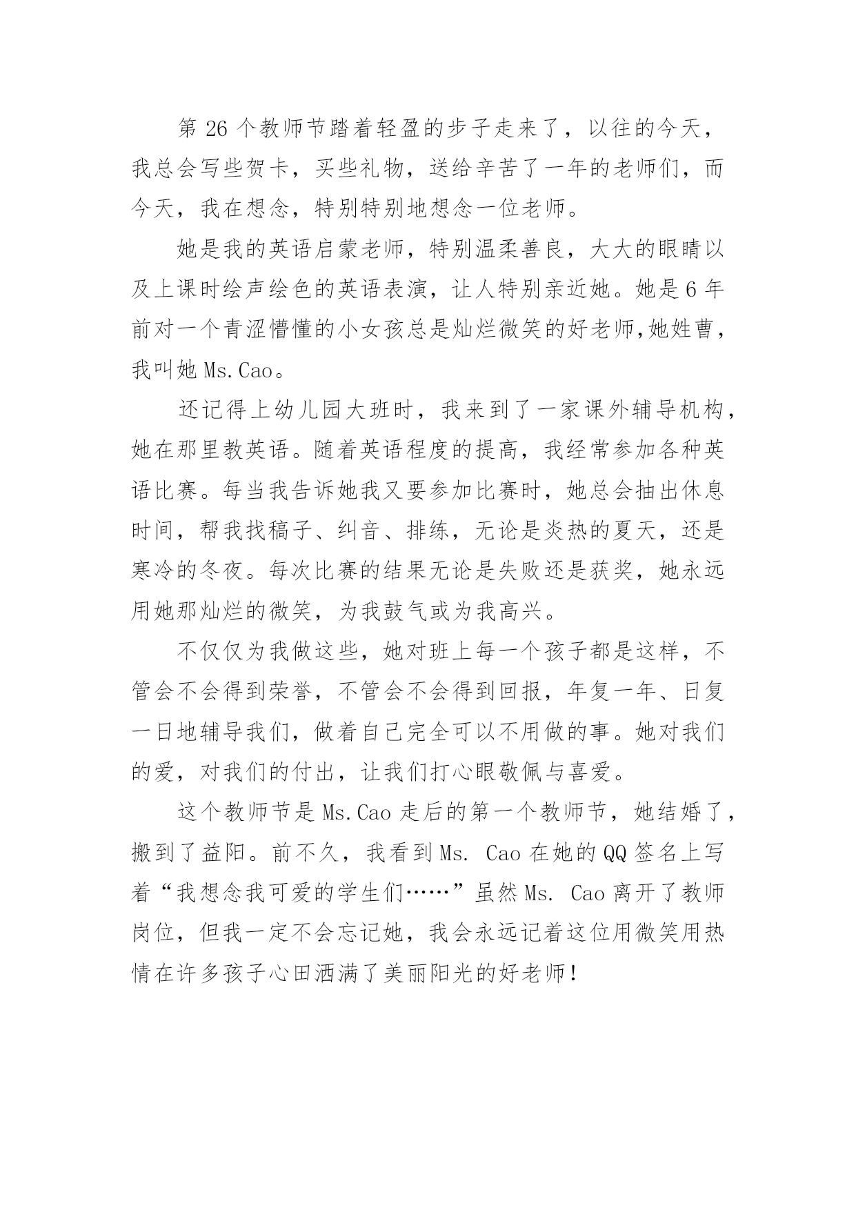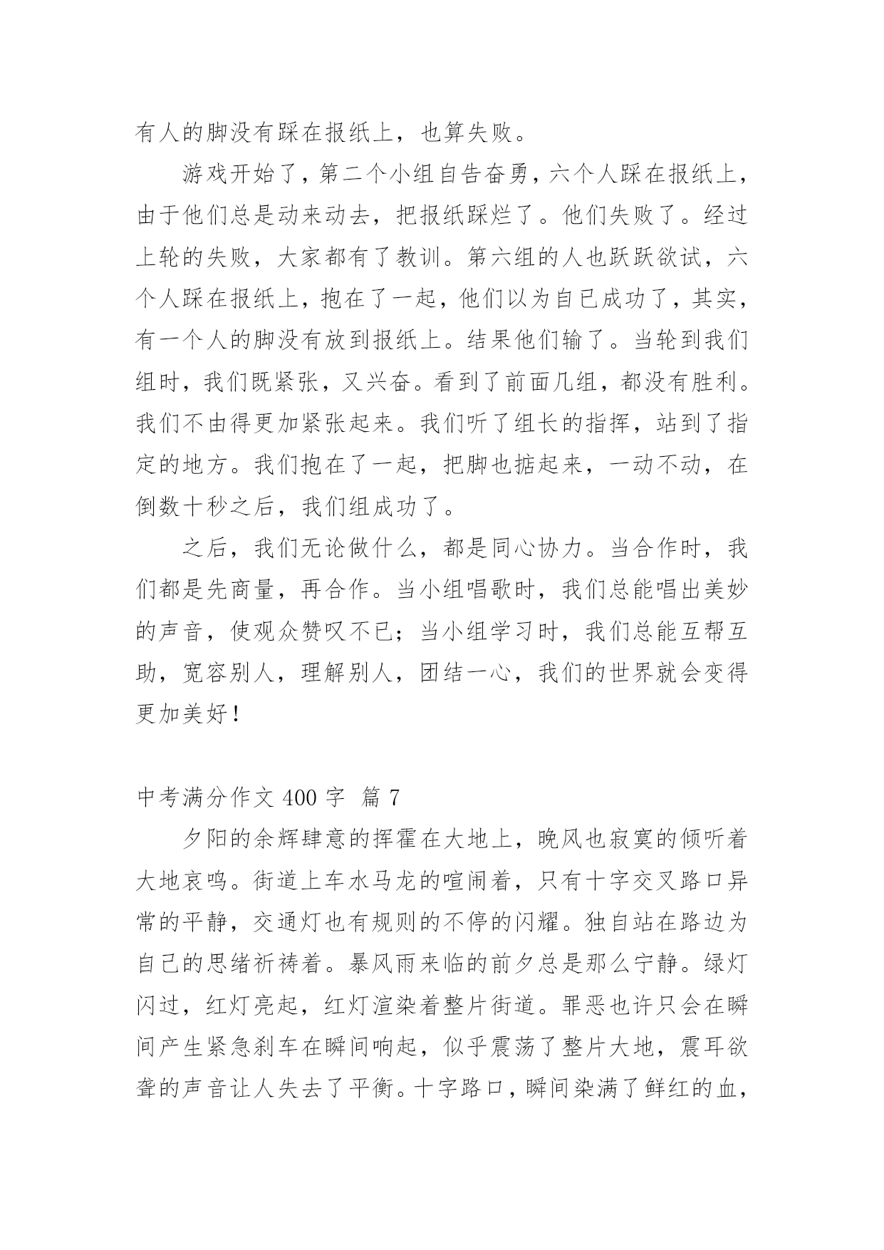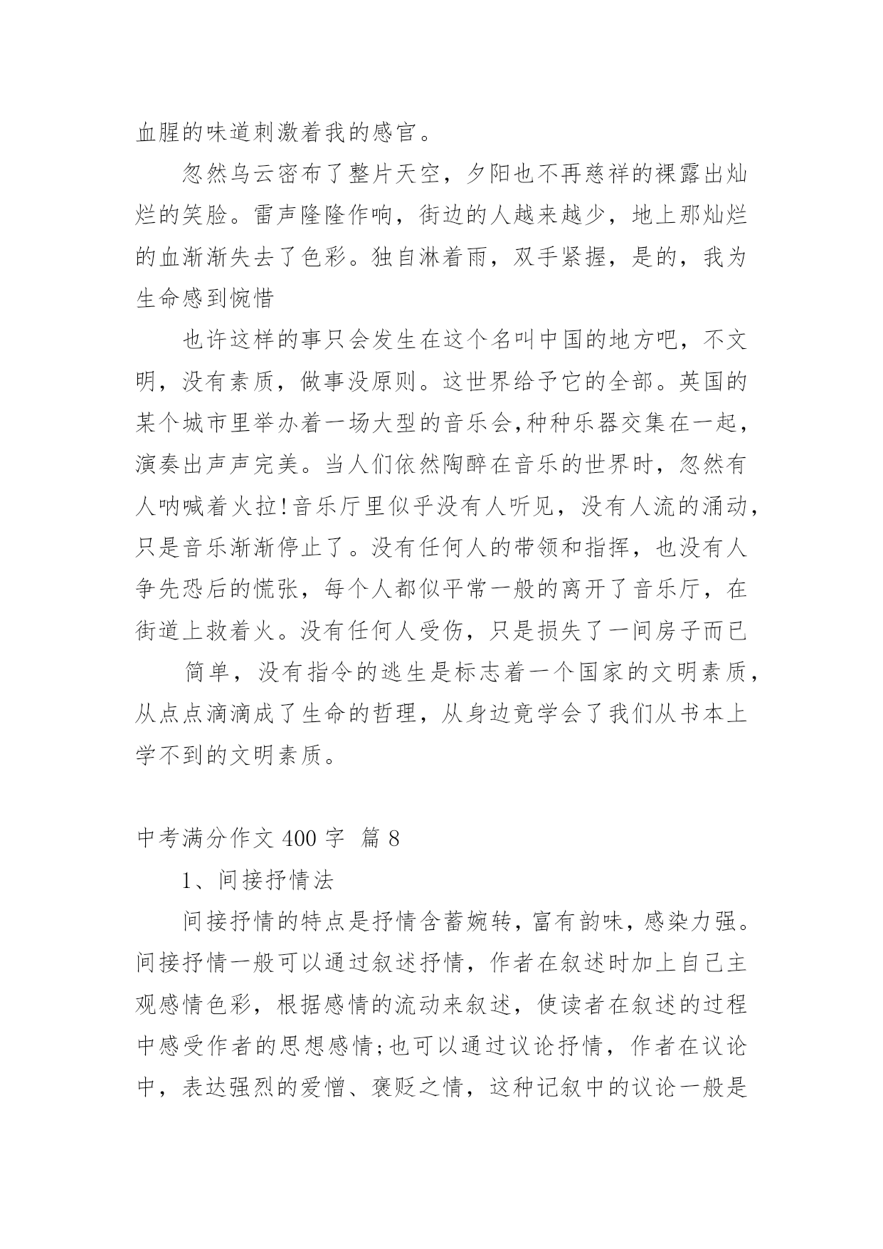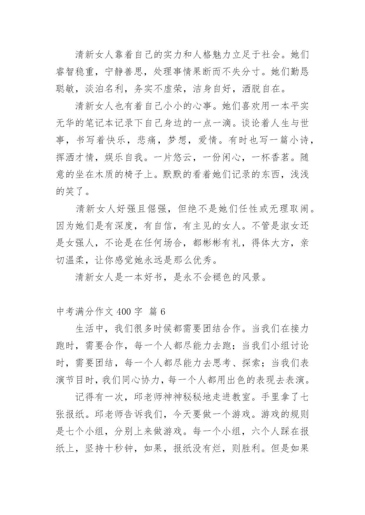 中考满分作文400字实用的中考满分作文400字汇编九篇在生活、工作和学习中,许多人都有过写作文的经历,对作文都不陌生吧,作文是通过文字来表达一个主题意义的记叙方法。怎么写作文才能避免踩雷呢?下面是小编为大家收集的中考满分作文400字10篇,欢迎大家分享。中考满分作文400字篇1在一年级到五年级的学习中,我遇到过许多老师,其中让我印象最深的是三年级的朱老师。朱老师三十多岁,有着一头秀发,加上那炯炯有神的眼睛给人一种和蔼可亲的感觉。每当我失去信心的时候,老师就会用那慈祥的目光鼓励我。有一次上公开课,老师问了一个问题,比较难,我思考了一会儿,想出了答案,刚准备举手,一看周围没有一人举手,又把举到半空的手给放下了。我一直用目光巡视着周围,看看有没有哪位同学举手,我也好跟着举手。可是,还是没有一个同学举手。这时老师似乎看出了我的心思,便叫我起来回答。我回答的声音小得像蚊子哼,就怕答错了,老师同学们笑我。老师用那慈祥的目光看着我,好像在说:“再大声一点儿,你回答错了我们不会笑你的。”老师的鼓励给了我勇气,我大声流利地回答了问题。回答了问题后,老师和同学给了我热烈的掌声,我心里像吃了蜜那样甜。还有一次,老师把期中考试的试卷发了下来,我考得不太好,心里非常难过,泪水像断了线的珠子唰唰地往下掉。老师看见了就用那慈祥的目光告诉我:“王昱婷,别灰心,这次没考好,下次考考好就行了。”迎着老师的目光,我心里好多了。朱老师,谢谢你的安慰和鼓励,您真是一个好老师!中考满分作文400字篇2今年我们家种了一棵云竹。我发现,竹子是一节一节的,不像别的花草那样软软弱弱。云竹在怎样的压力下,都是那么直,那么坚持不懈,挺立在风中。父亲说:“你看那竹子一节一节的,有志气,不向困难屈服。”我把这句话记在心里。一次,父亲带我去滑雪。看到电视上那些滑雪高手们从山坡上俯冲下来,那样子真是帅呆了。我对他们无比羡慕,所以自己也想试一试。准备好了,我就扑向冰雪的怀抱。没有几分钟,我便学会了,便拉着父亲向山坡发起“进攻”。在父亲的帮助下,我登上了山坡。我在坡上稍稍休息,准备往下冲。我深吸一口气,半蹲着,双手用雪杖在身后轻轻一拨,我开始前进,冲下去喽!耳边传来“嗖嗖--”的风声。突然,不知怎的,身体逐渐站了起来,眼前一黑,往后一仰--我跌倒了。在坡下面,我的屁股微微痛疼,腰酸背痛,费了九牛二虎之力还是爬不起来。我拍掉身上的雪,望着山坡,不禁打了退堂鼓:这坡这么高,冲下来肯定要摔倒,我也不会有滑雪的天赋,还是算了吧。我把这想法告诉了父亲,父亲的神色严厉起来,说:“你不是要学习云竹那坚强不屈的精神吗?遭受那么小的打击就退缩!”我含着委屈,看着别人,他们从坡上冲下来之后,脸上露出了笑,像是成功后轻松的笑,又似在嘲笑知难而退的我。是呀,云竹那坚强不屈的高尚品质,我是应该学习,可我确实知难而退……我抬起头,向高坡上爬去……是那云竹,给了我信心……中考满分作文400字篇3“衣带渐宽终不悔,为伊消得人憔悴。”不论是大雁惊风,霜叶层染,还是雷雨横空,雪压莽原,漫步在书之幽径的日子里,我那洗净铅华的心灵,总是在睿智与激情中荡漾。记得还在牙牙学语之时,唐风宋雨便已浸润了我幼小的心。那清词丽句常能勾起我五彩斑斓的梦。雁落平沙的囊肿绚丽雄景,至今令我魂牵梦绕。乃至走进中学,感受到了“落霞与孤鹜齐飞,秋水共长天一色”的清丽,体会到了“秋阳散尽霜飞晚,留得残荷听雨声”的那份伤感,才越发觉得自己的灵魂在读书中升华了。与书相伴,那璀璨的光华绚丽了我的灵魂。当散落的花瓣在我眼前飘荡,我会在静静的月光下漫步于康桥,在徐志摩的柔情中流连忘返;我会与李白一同乘万里风破万里浪,直挂云帆济沧海;站在高楼上,我把酒临风,高呼“天生我材必有用,千金散尽还复来。”偶尔,凝望窗外那碧蓝的天空,油然而生,“采菊东篱下,悠然见南山”的那份闲适旷达。与书相伴,我寻觅到了我的精神家园。我徜徉于时间的后花园:遥望远方的繁星春水,俯视着山下的呼啸山庄,感悟于平凡的简?爱。与书相伴,我跨越了时间的沟壑,体味这辉煌的精神世界。书亦人生,人生亦书,今生有书相伴,我亦无悔焉。一杯清茶,一盏黄灯,独处于室,手捧一书,静享其韵,有一种“举杯邀明月,对影成三人”的飘逸与洒脱……中考满分作文400字篇4“长亭外,古道边,芳草碧连天……”一滴清水,可以折射太阳的光辉;一本好书,可以净化一个人的灵魂。——题记古城的残片,大树的几根重落枝条,临街老店被涂盖得字号,半扇院门的插闩以及那些美好的回忆都一一浮现在我眼前。仿佛林海青的《城南旧事》中的情况都又出现在了我的面前。也许,童年,十几亿的开始,也是一个梦的符号,它代表经历沧桑后的人对纯真年代的怀念。读着《城南旧事》,我渐渐地走进了书里,它们就如一股细流,静静的,慢慢的渗入我的脑海中。当我读到英子居然为秀珍和妞儿重逢去寻